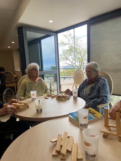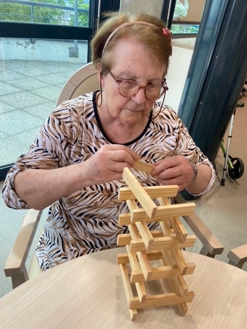 Au premier étage des activités sont aussi proposées les week-ends : balades dans le parc et activité kapla pour favoriser et développer la créativité et la motricité des résidents qui sont restés bien concentrés puis pour finir un petit jeu de cartes.