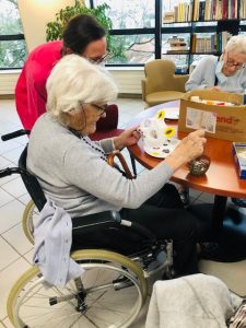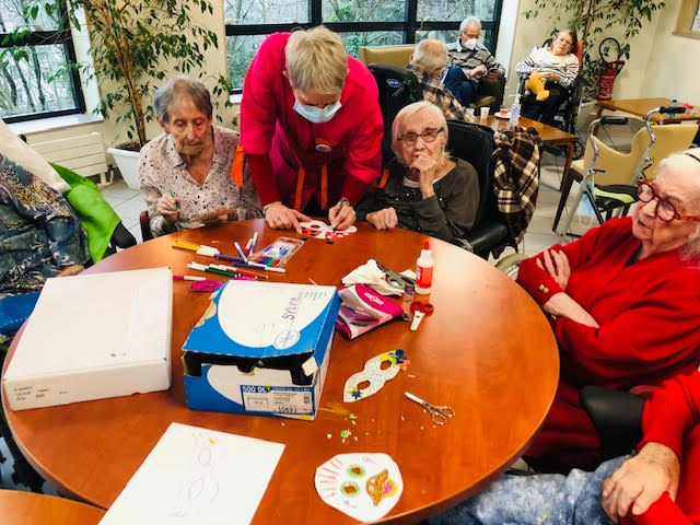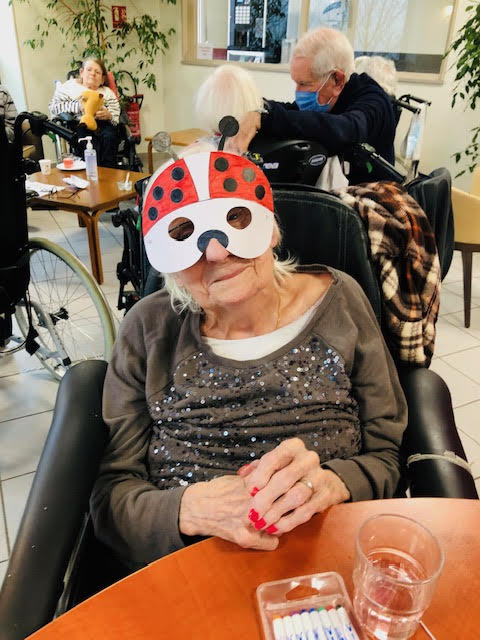Mardi, c’était création de masques de carnaval en activité manuelle avec les bénévoles des Blouses Roses. Découper, coller, peindre, colorier, beaucoup de choses à faire pour un résultat qui n’est pas si mal.