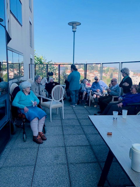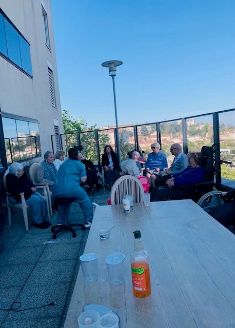 Avec les beaux jours, les soignants organisent les activités et le goûter des résidents de notre UPDP sur la belle terrasse ensoleillée avec une vue panoramique sur la ville de Lyon.
