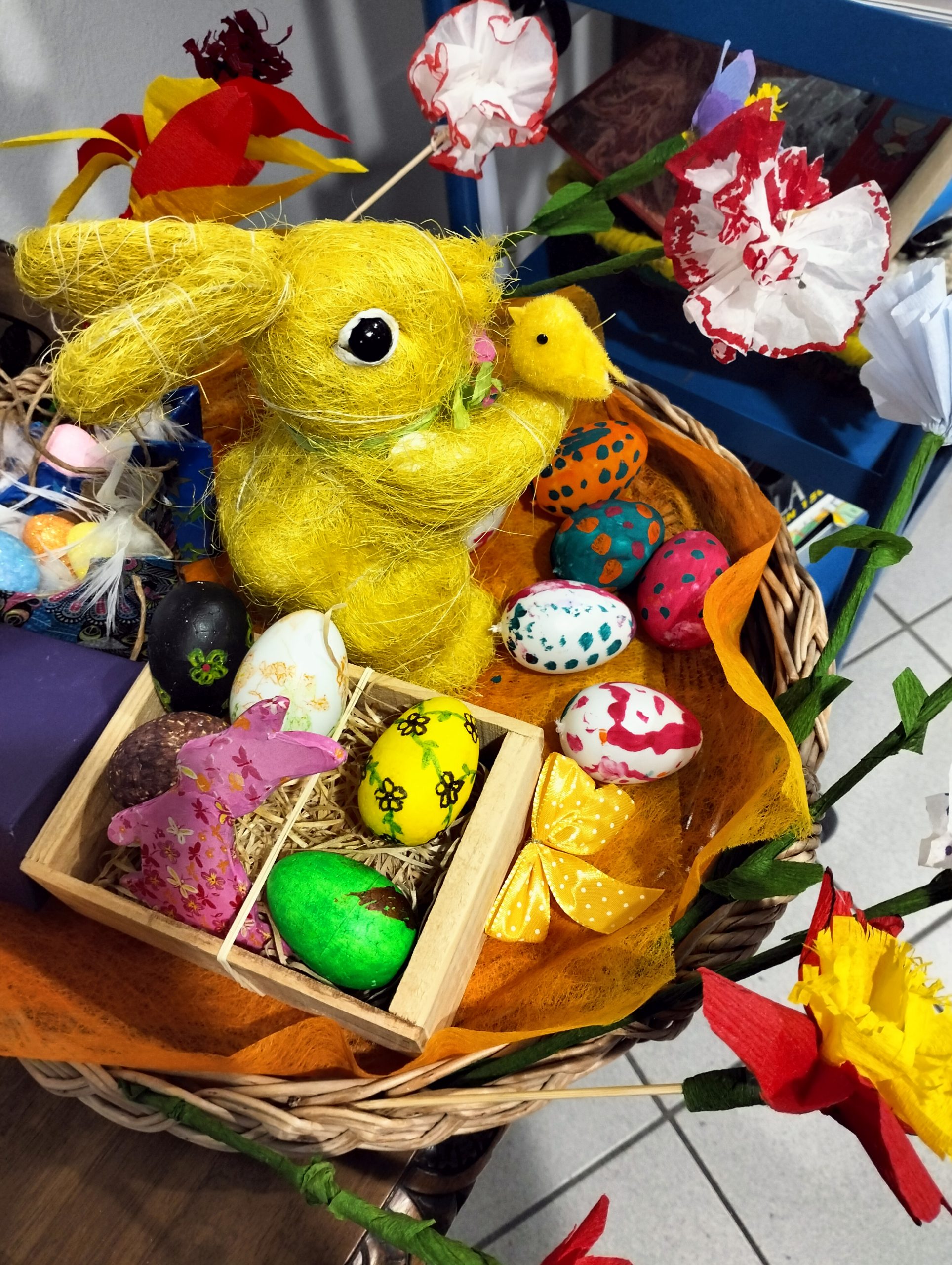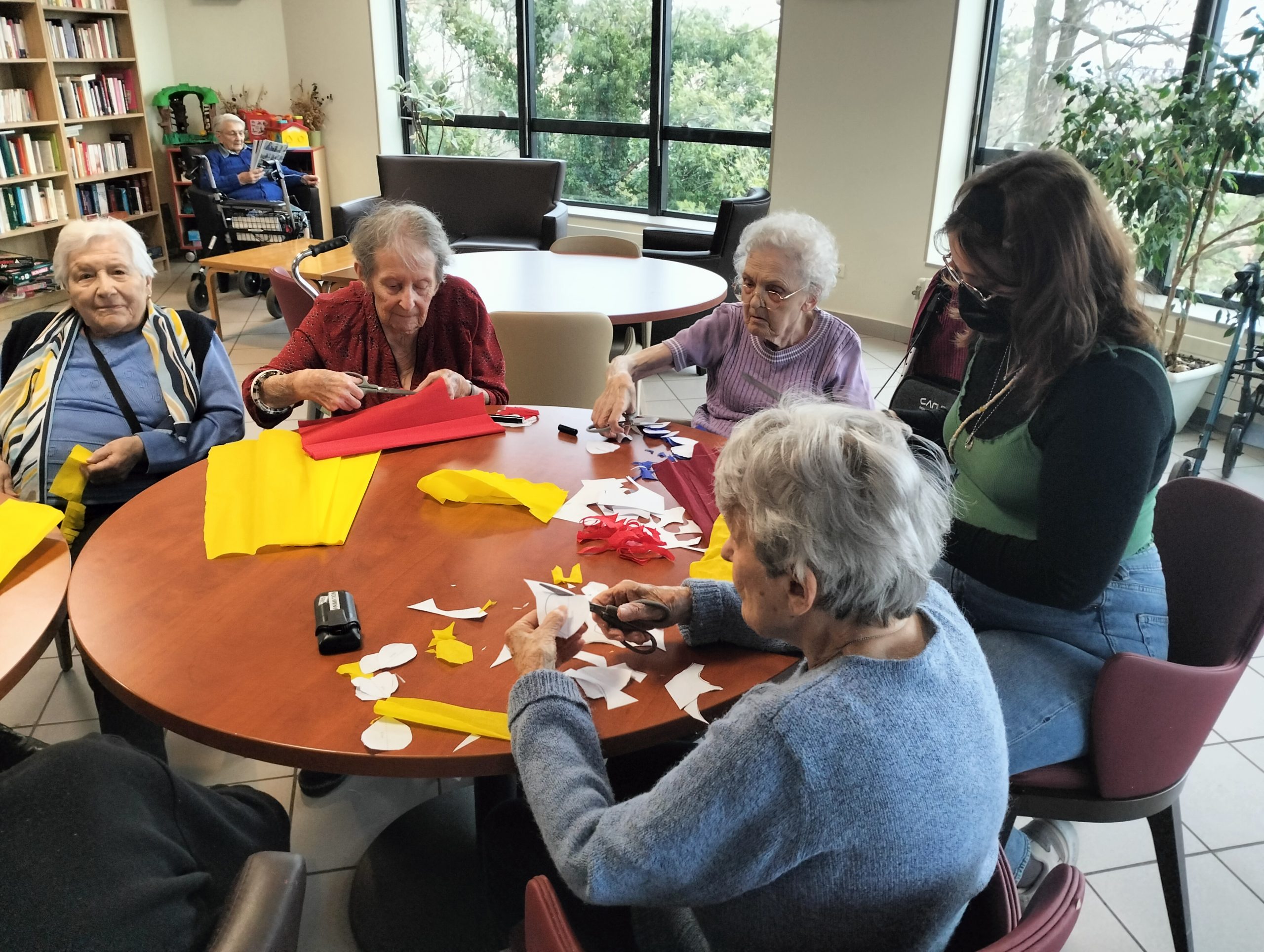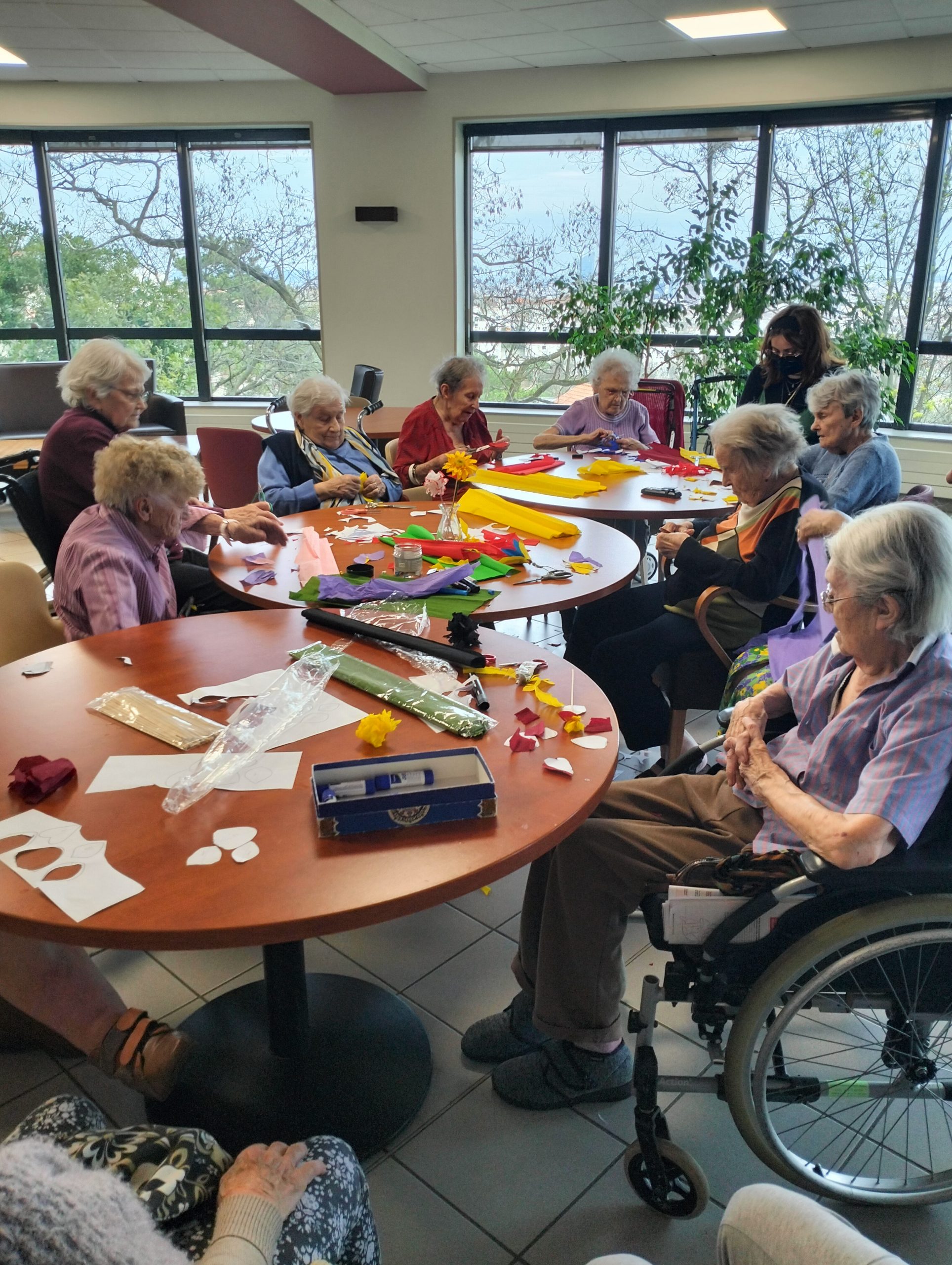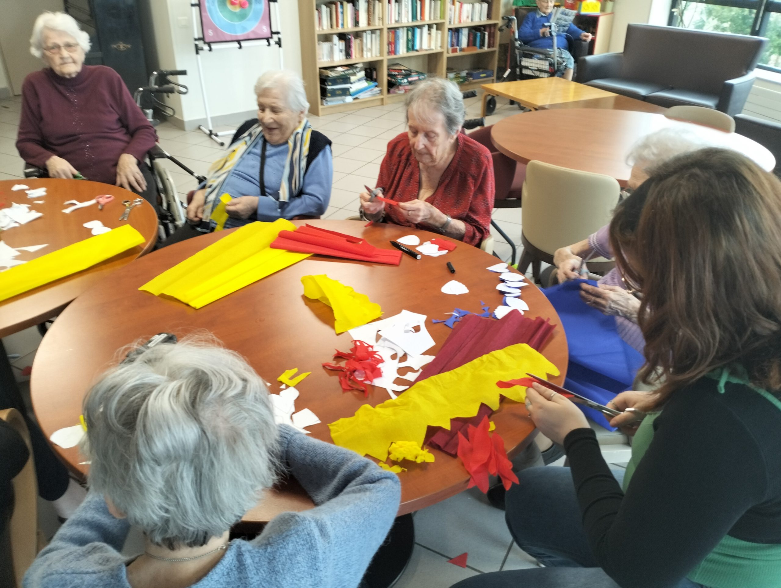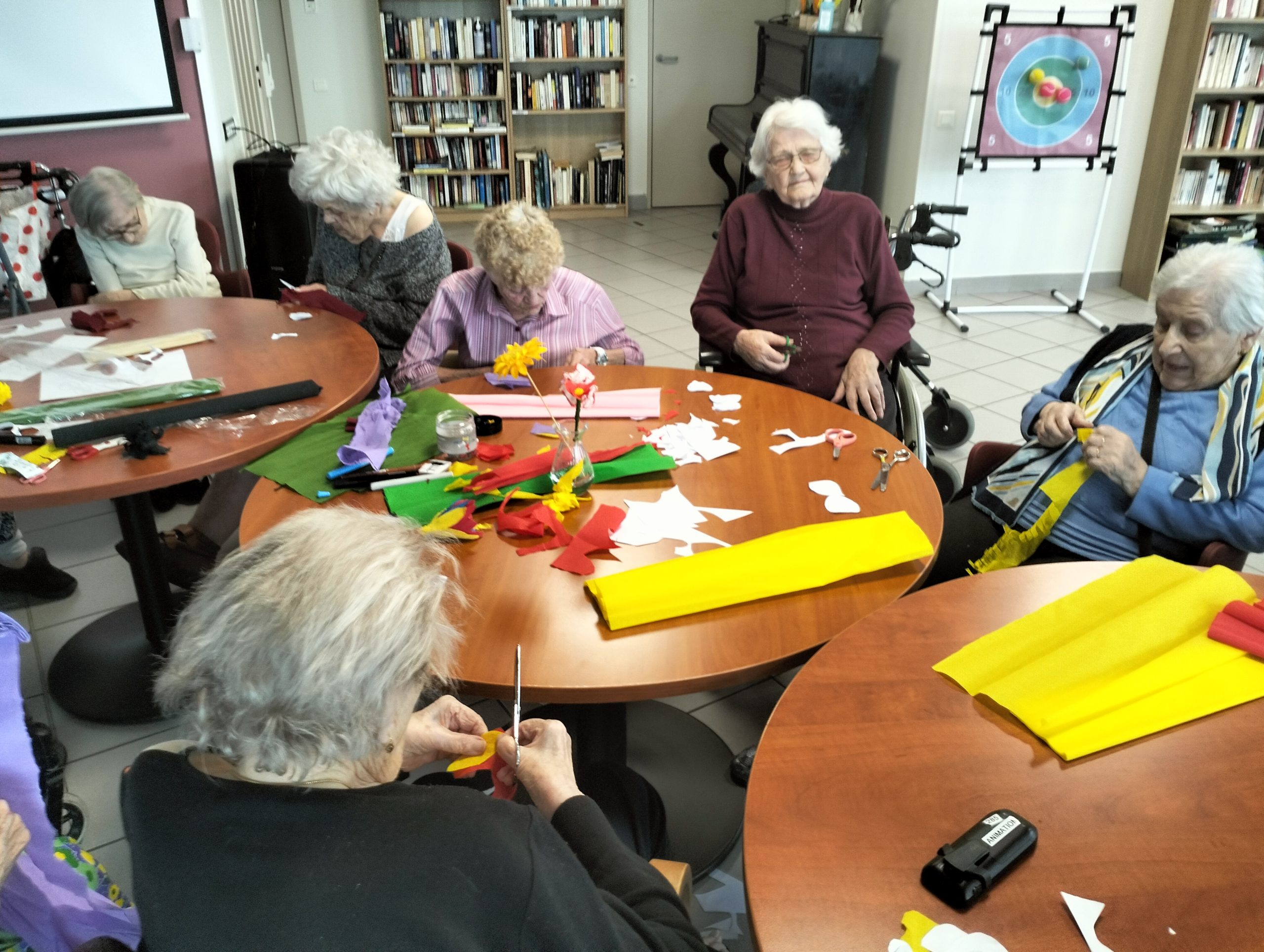 Régulièrement aux Amandines, nous réalisons des activités manuelles en thème avec la période. En ce moment, nous préparons des décorations pour Pâques et le printemps. Les résidents apprécient ces moments de bricolage où ils développent leur créativité et sont ensuite contents d’admirer leurs œuvres. Les décorations seront installées dans le hall d’entrée.