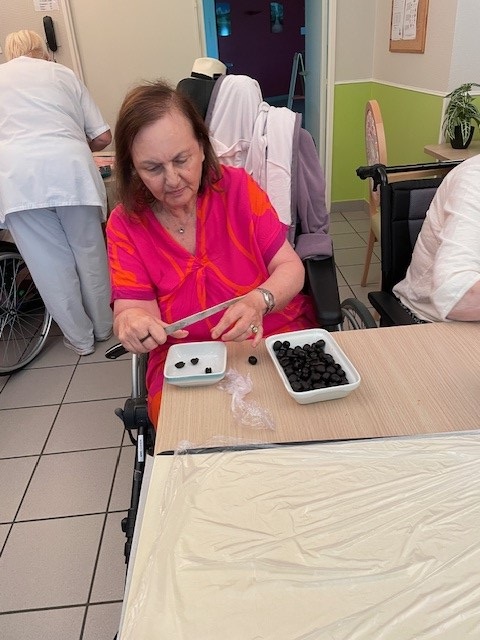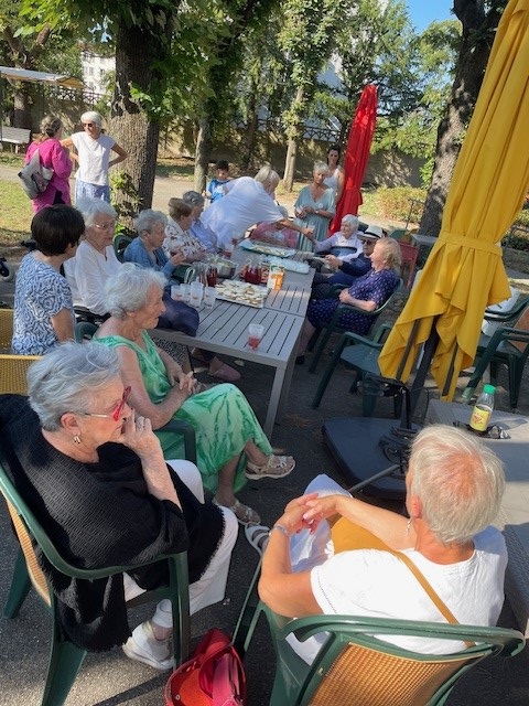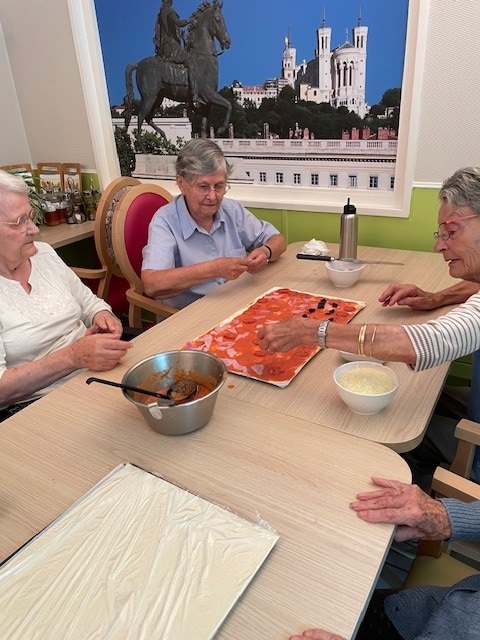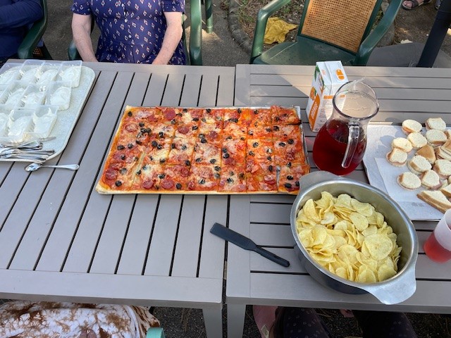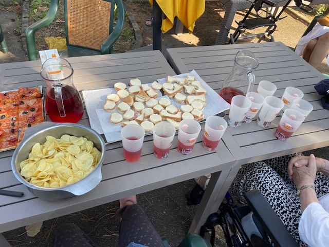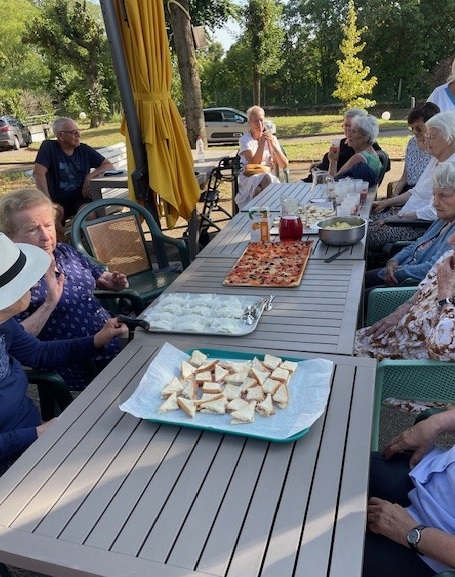 Le 27 août, Elisabeth AMP et Laurent Responsable hôtelier ont préparé avec les résidents des pizzas et des toasts pour notre apéritif mensuel. Après la préparation avec beaucoup de rigueur, place à la dégustation avec les familles dans le parc des Amandines. Un bon moment de partage.
