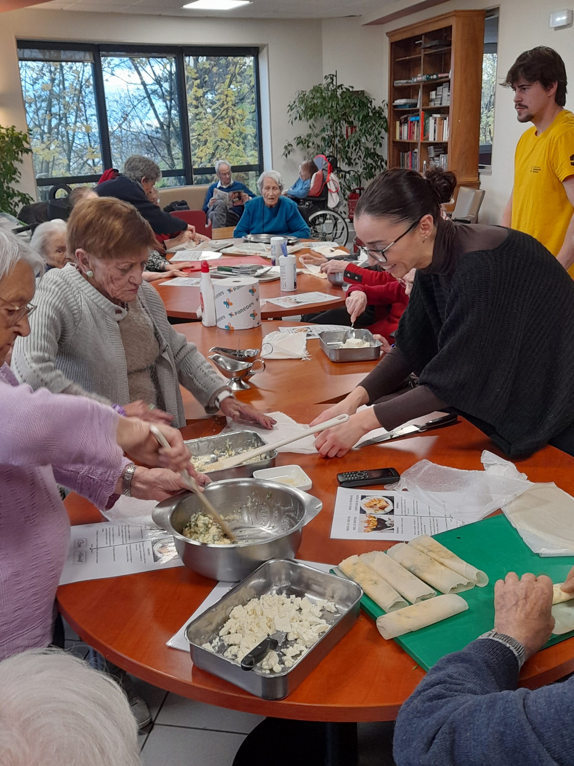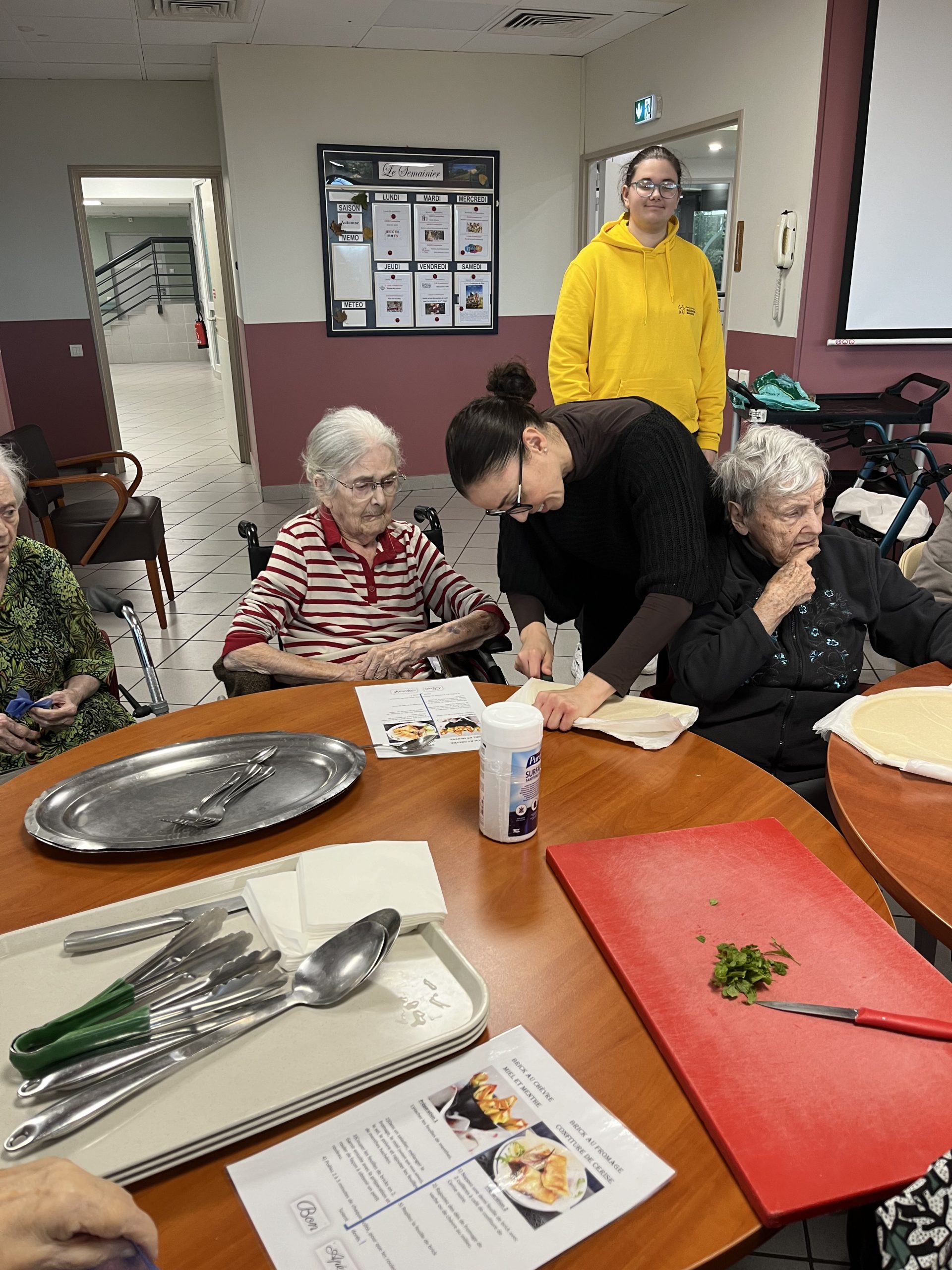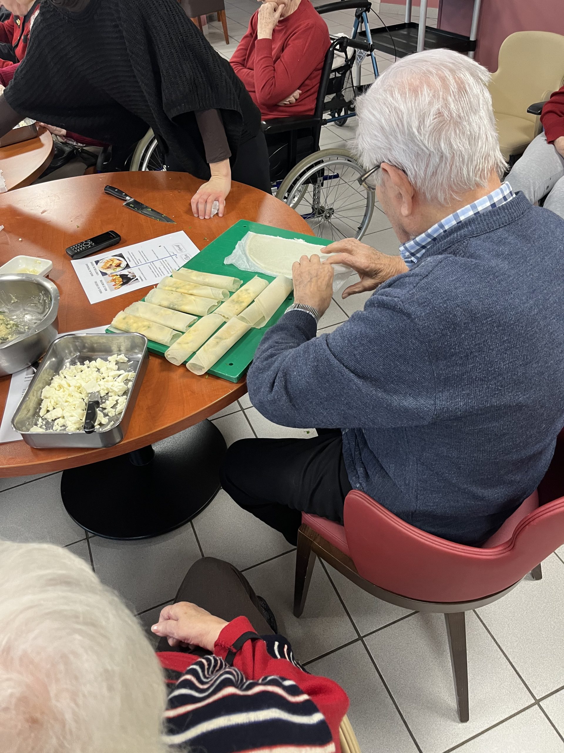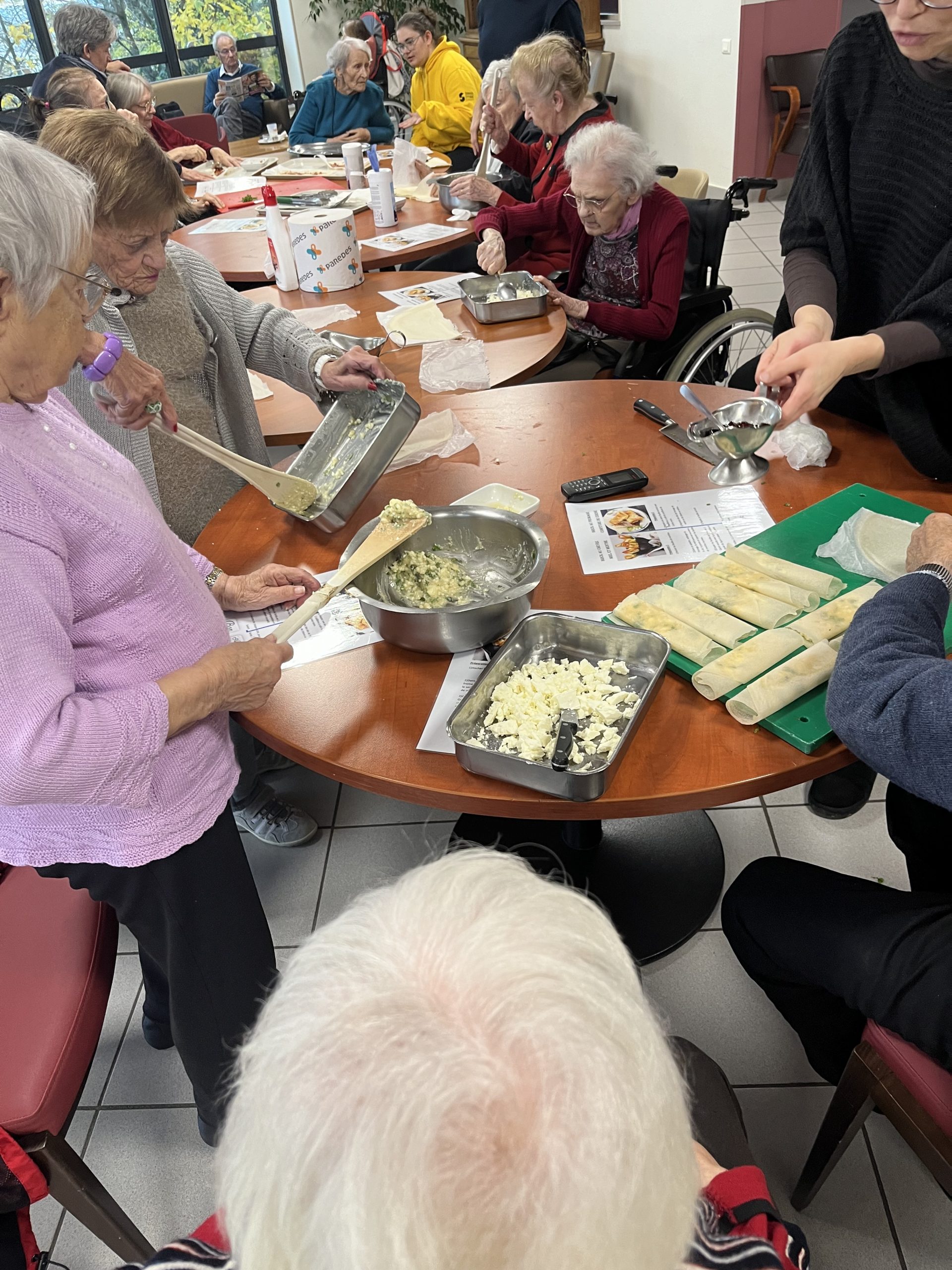 Pour notre pot d’accueil mensuel, nous confectionnons avec les résidents une partie de l’apéritif avec les idées originales et l’aide d’Anissa la responsable hôtelière. Cette fois-ci c’était des bricks de chèvre à la menthe et au miel. Les résidents aiment préparer cet apéritif. Nous nous retrouvons ensuite en fin de journée pour la dégustation avec un verre de kir ou de sangria en musique. Chacun se présente pour apprendre à connaitre les nouveaux résidents arrivés aux Amandines. Ces apéritifs de bienvenue sont très appréciés.