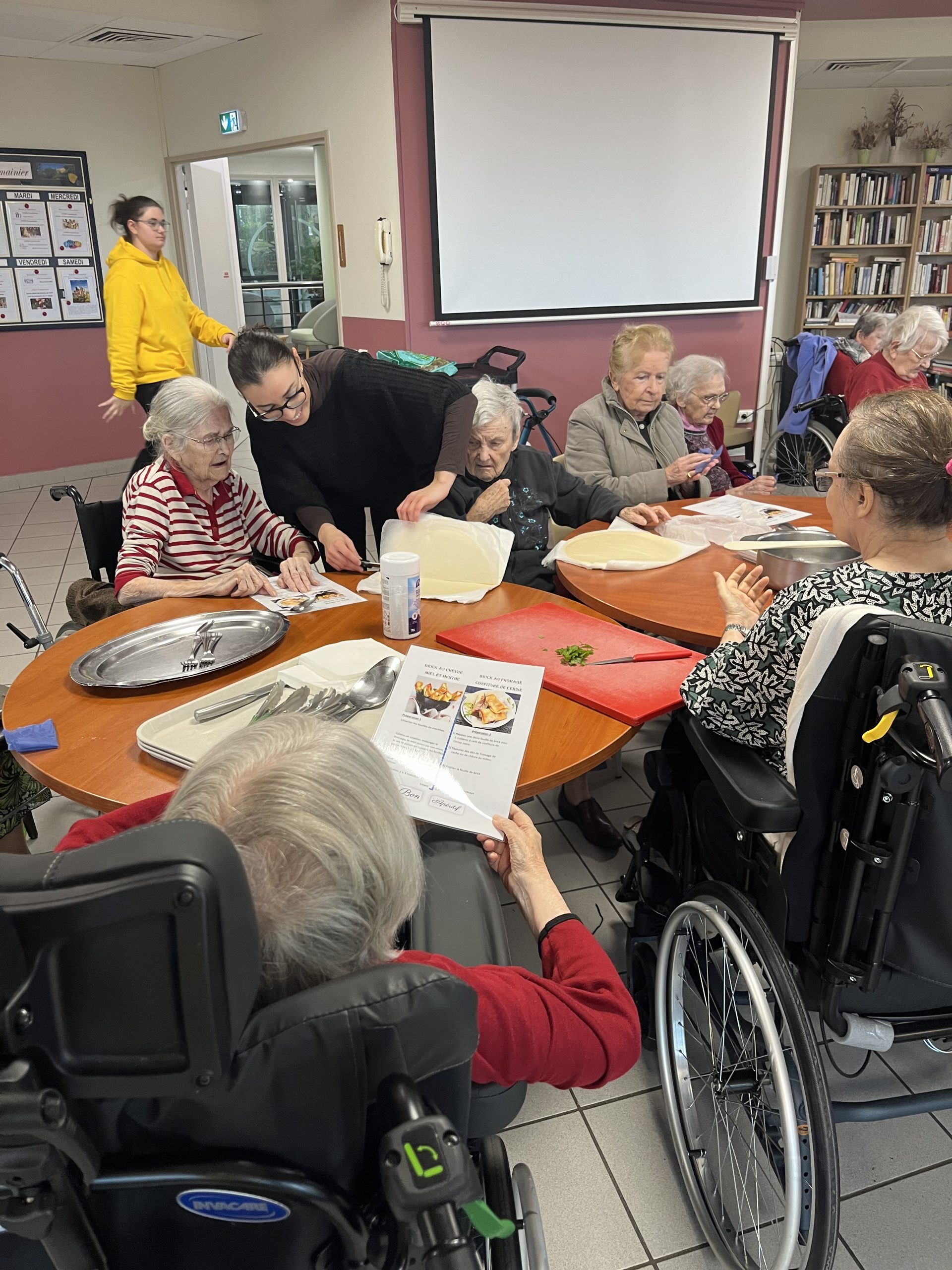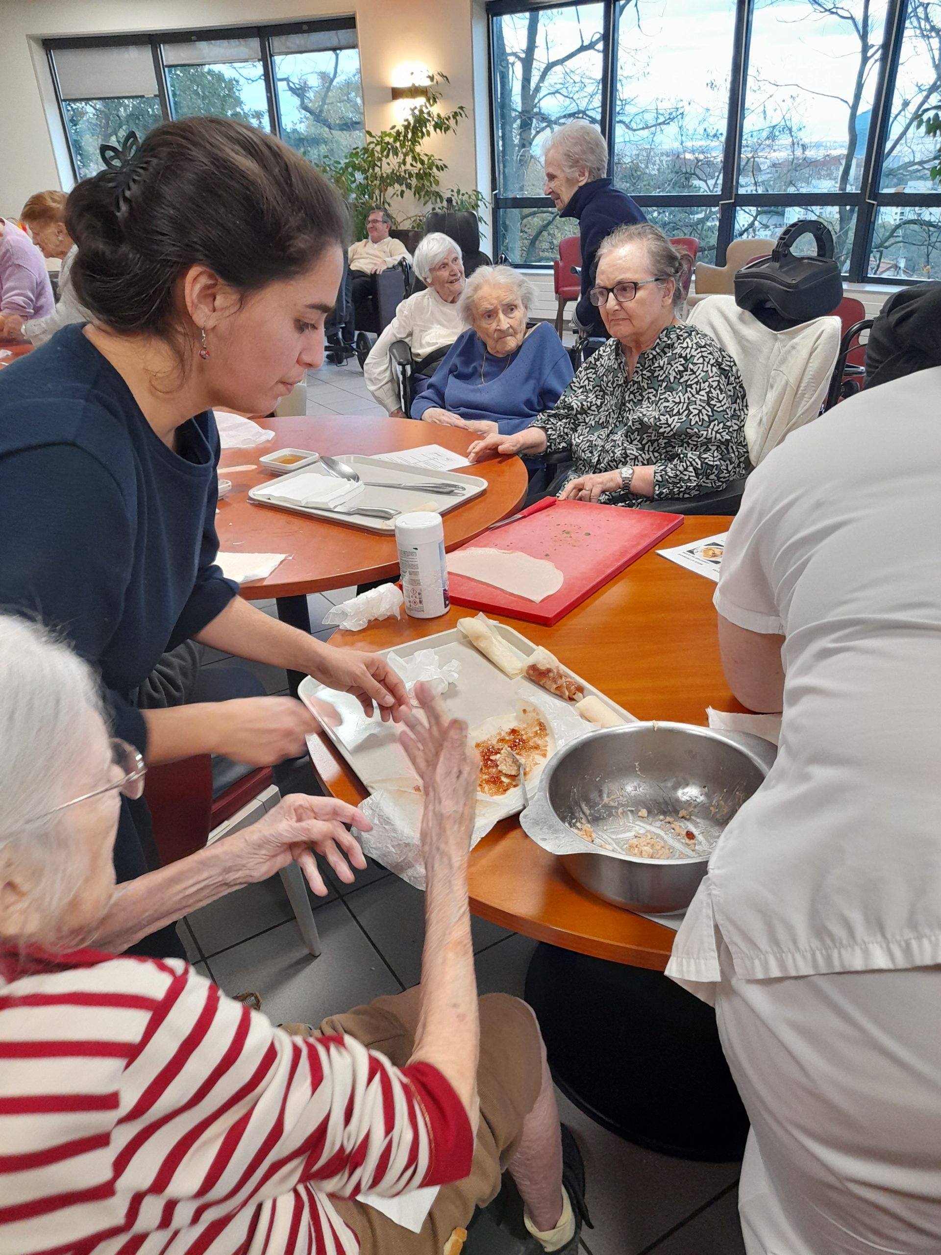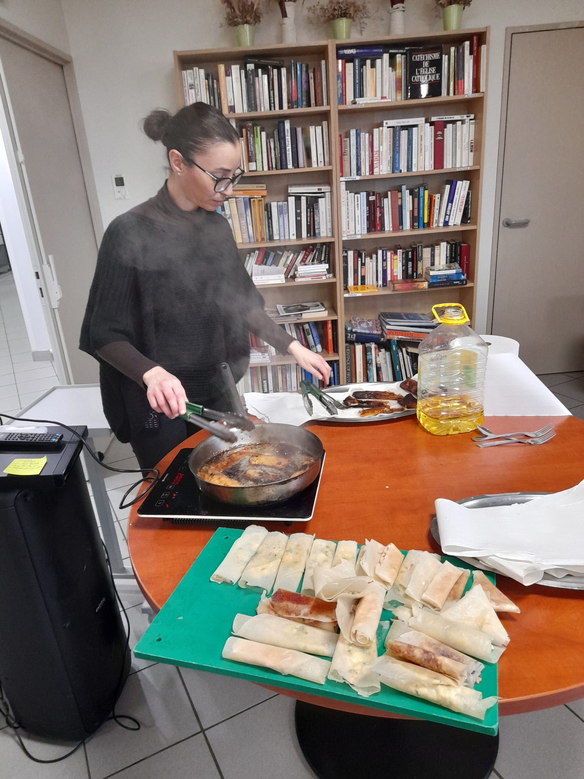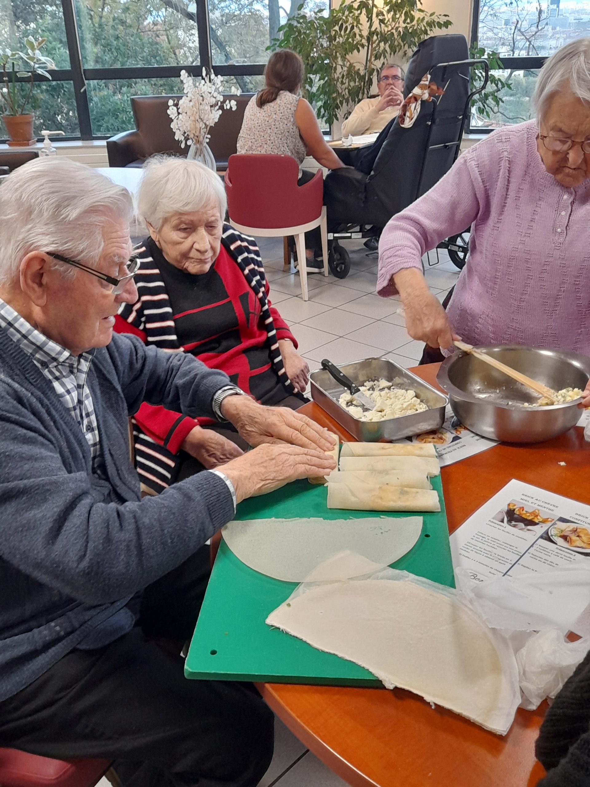 Pour notre pot d’accueil mensuel, nous confectionnons avec les résidents une partie de l’apéritif avec les idées originales et l’aide d’Anissa la responsable hôtelière. Cette fois-ci c’était des bricks de chèvre à la menthe et au miel. Les résidents aiment préparer cet apéritif. Nous nous retrouvons ensuite en fin de journée pour la dégustation avec un verre de kir ou de sangria en musique. Chacun se présente pour apprendre à connaitre les nouveaux résidents arrivés aux Amandines. Ces apéritifs de bienvenue sont très appréciés.