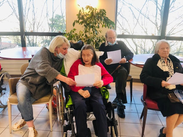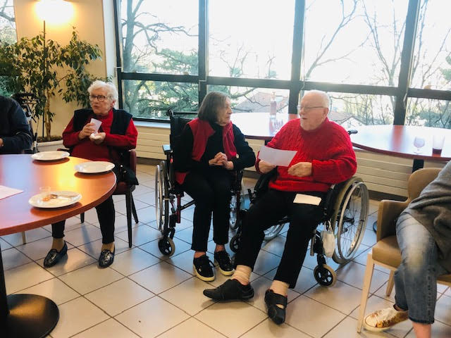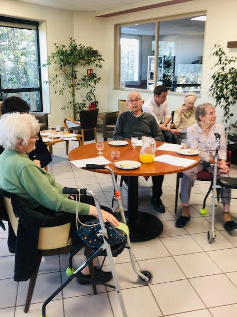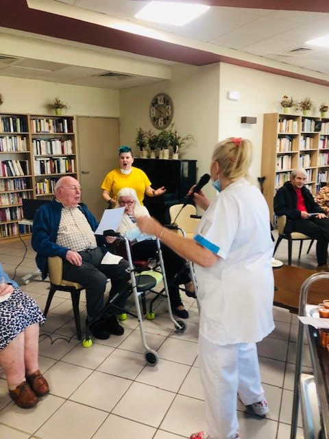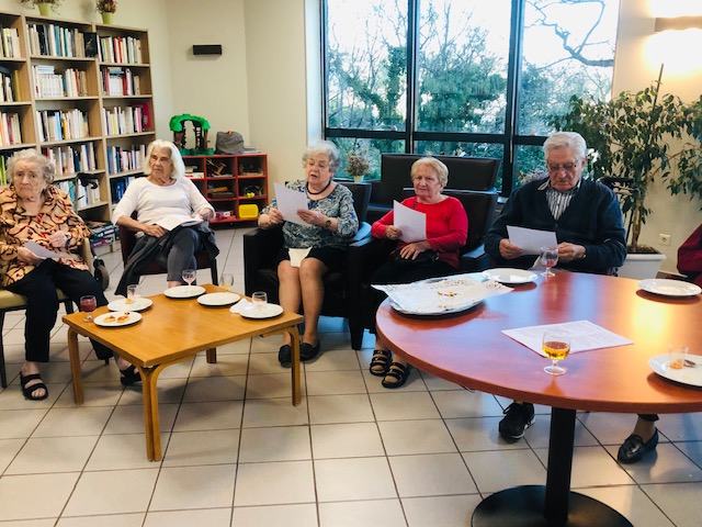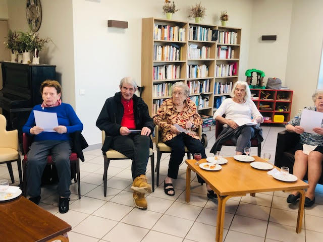 Nous nous sommes réunis mercredi avec une quarantaine de personnes comprenant résidents, familles et professionnels. Nous avons trinqué avec du Communard (une boisson à base de vin rouge et de crème de cassis) accompagnés de pizzas et chips. Pour dynamiser l’évènement, un chanteur a été choisit, interprété par Elisabeth, en étant accompagnée par la chorale des Amandines. Edith Piaf a été sélectionnée cette fois-ci. Le mois prochain, le choix se fera entre Charles Aznavour et Claude François.