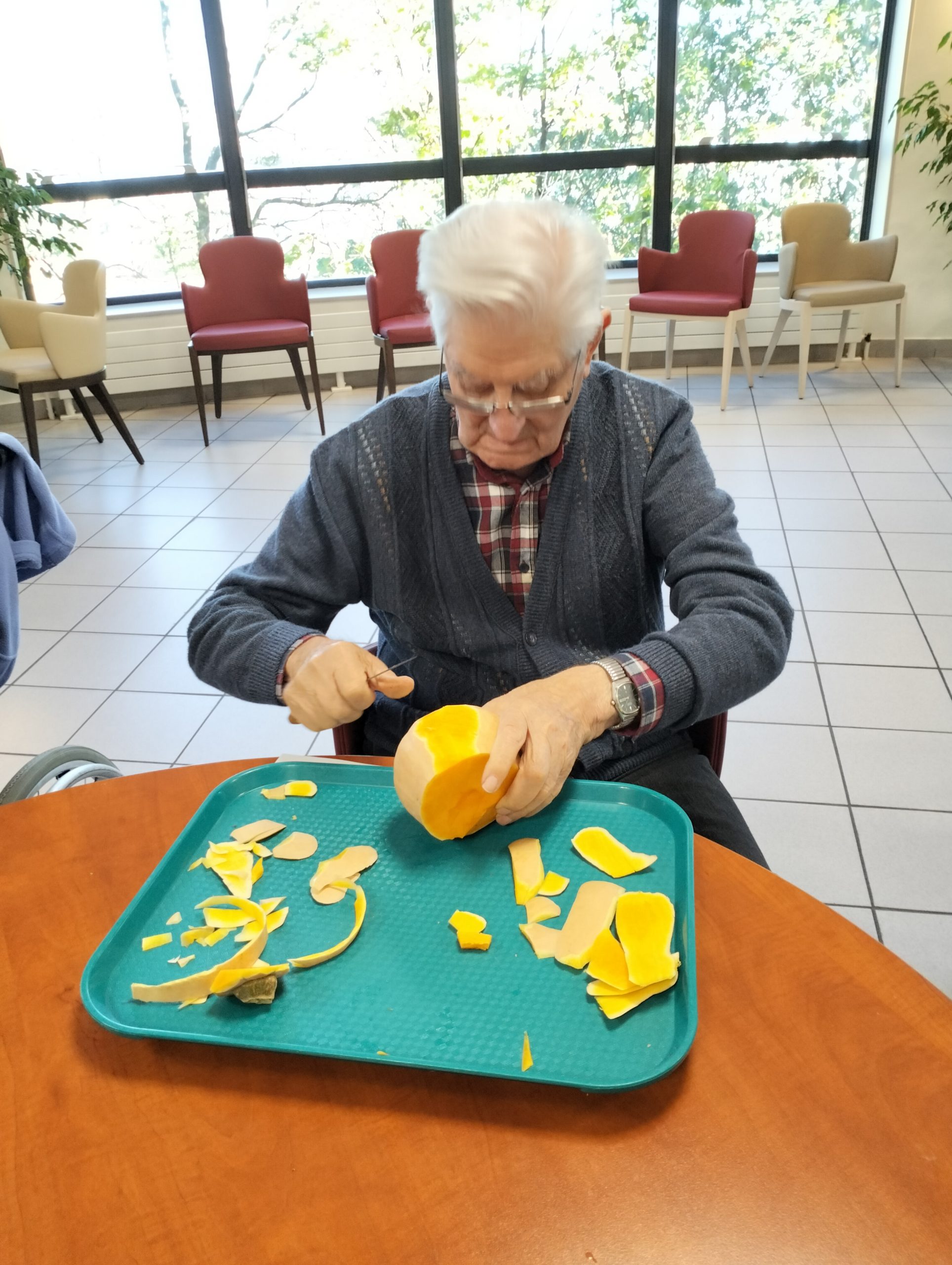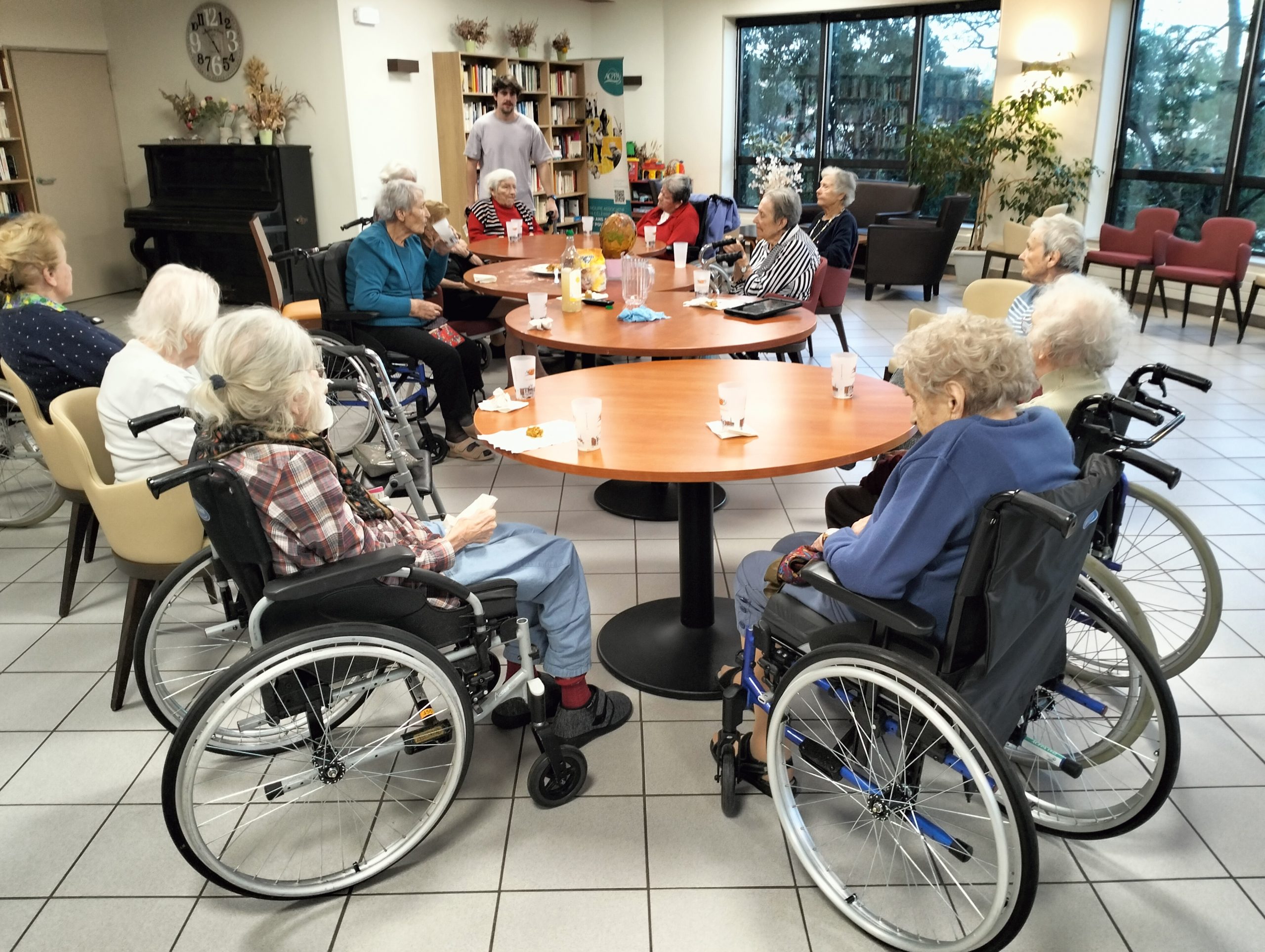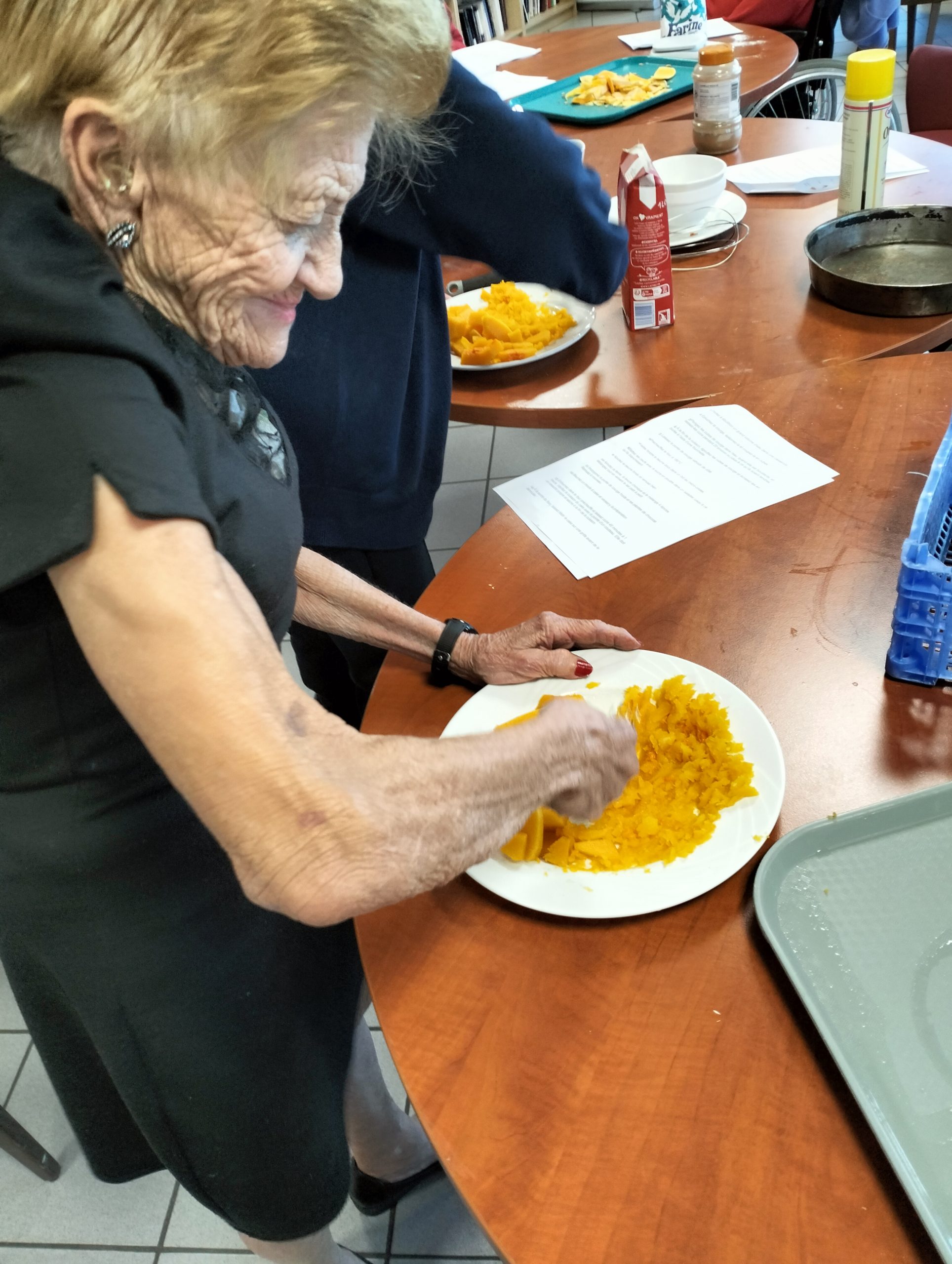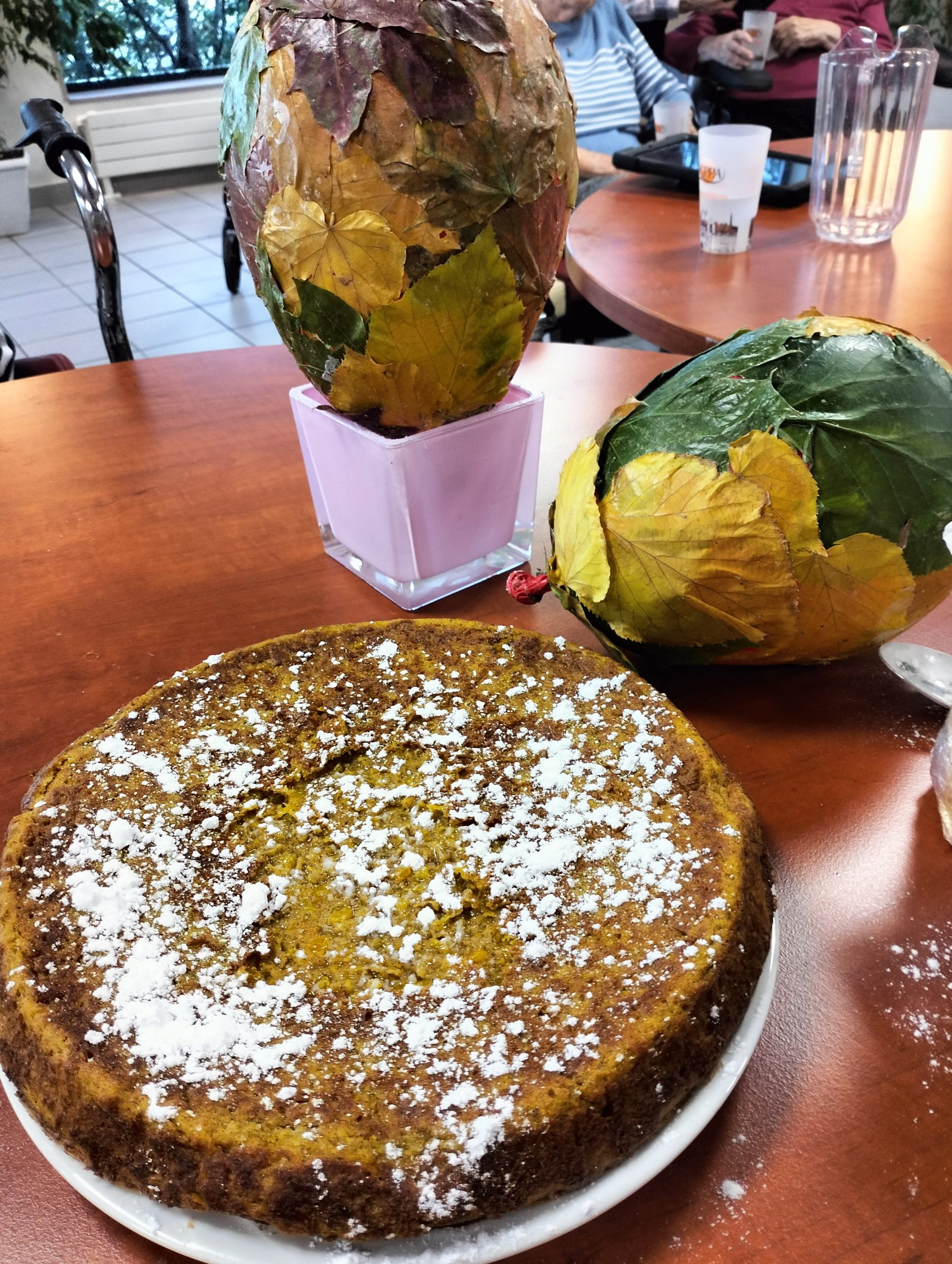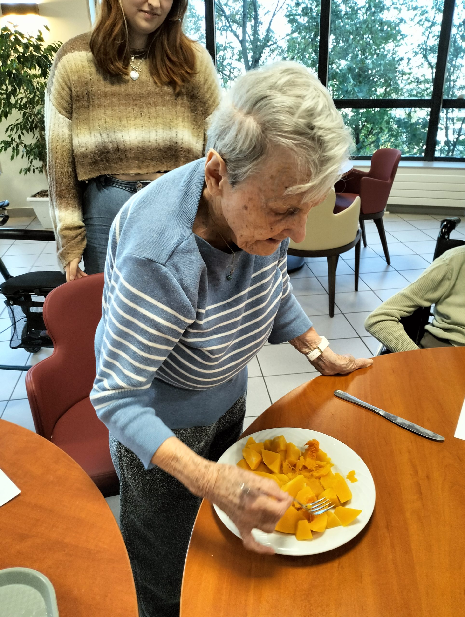 Pour rester dans la thématique de l’automne, le mercredi 8 novembre, les résidents ont confectionné des cakes à la courge. Tout le monde était un peu étonné mais le rendu était bien, accompagné de cannelle et de sucre glace. Les résidents ont apprécié la dégustation en découvrant de nouvelles saveurs. Chloé et Feyza, anciennes services civiques sont passées en surprise aux Amandines saluer les résidents et passer un moment avec eux. Les résidents étaient heureux de les revoir.