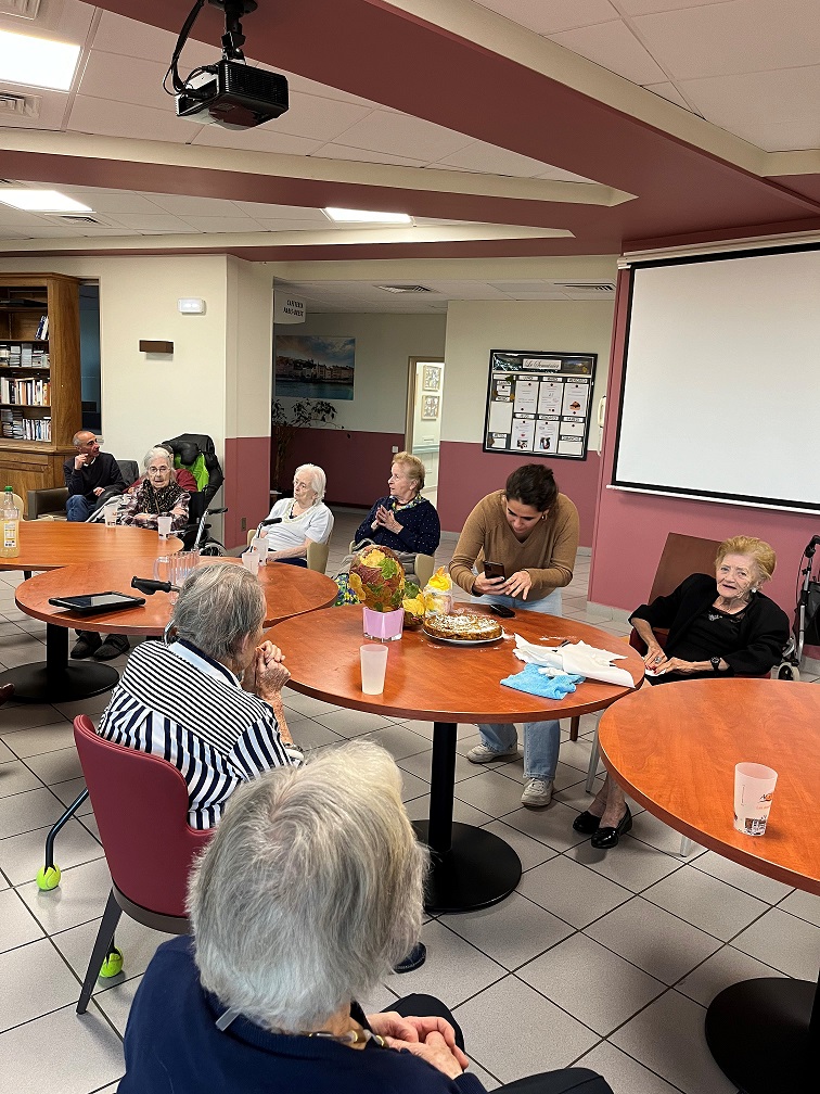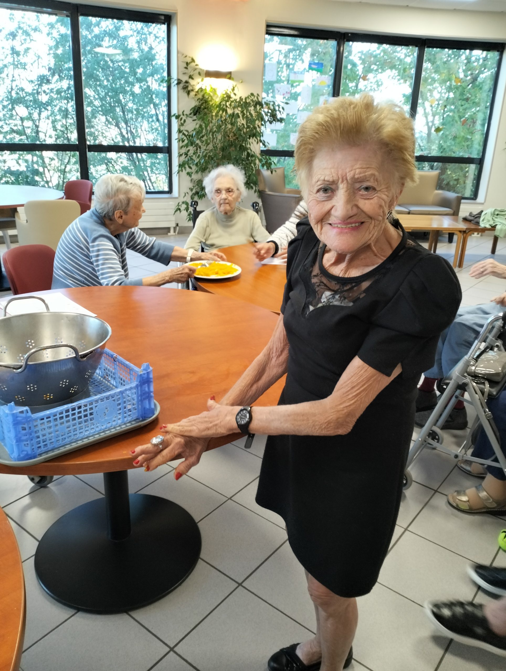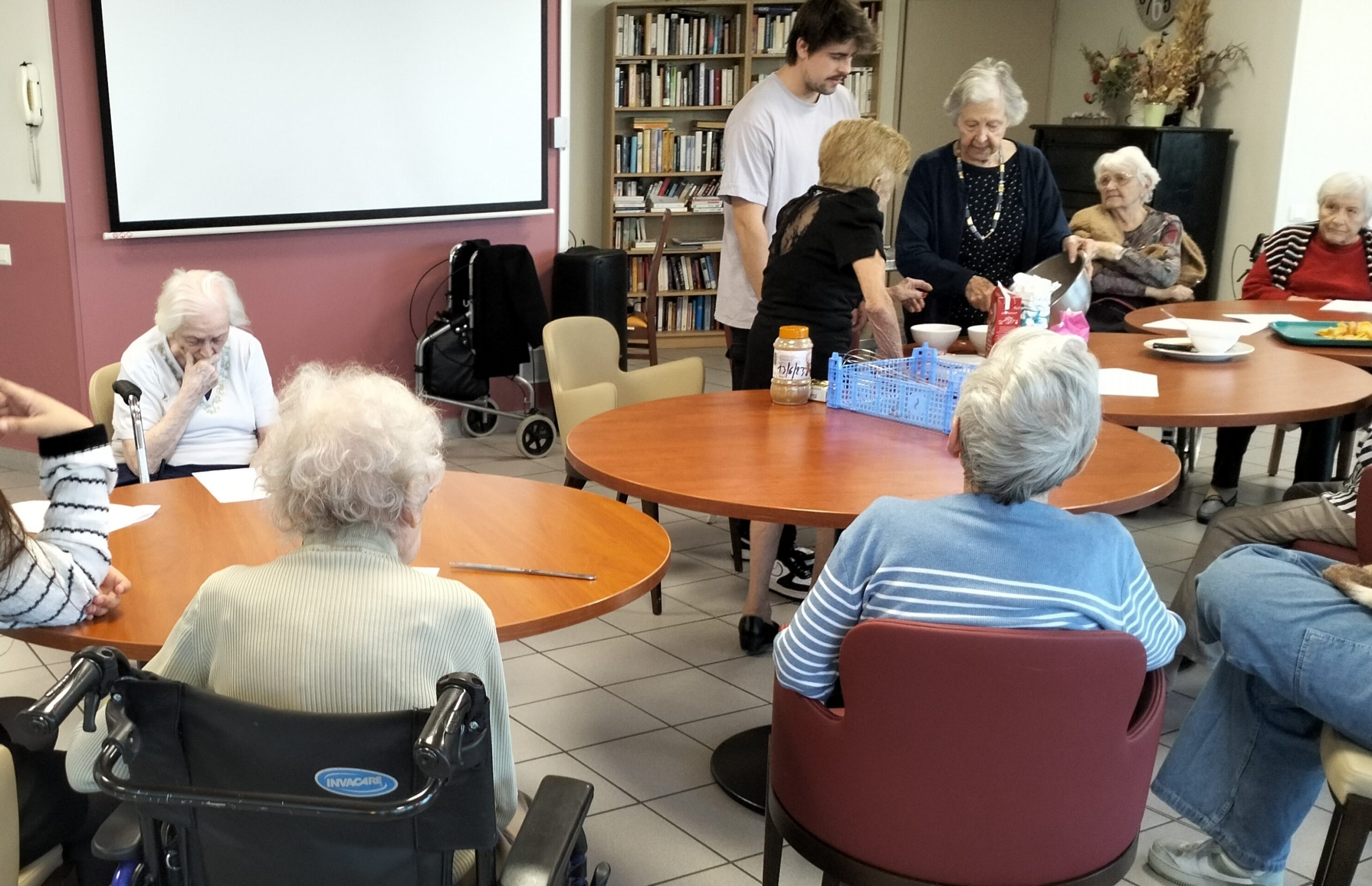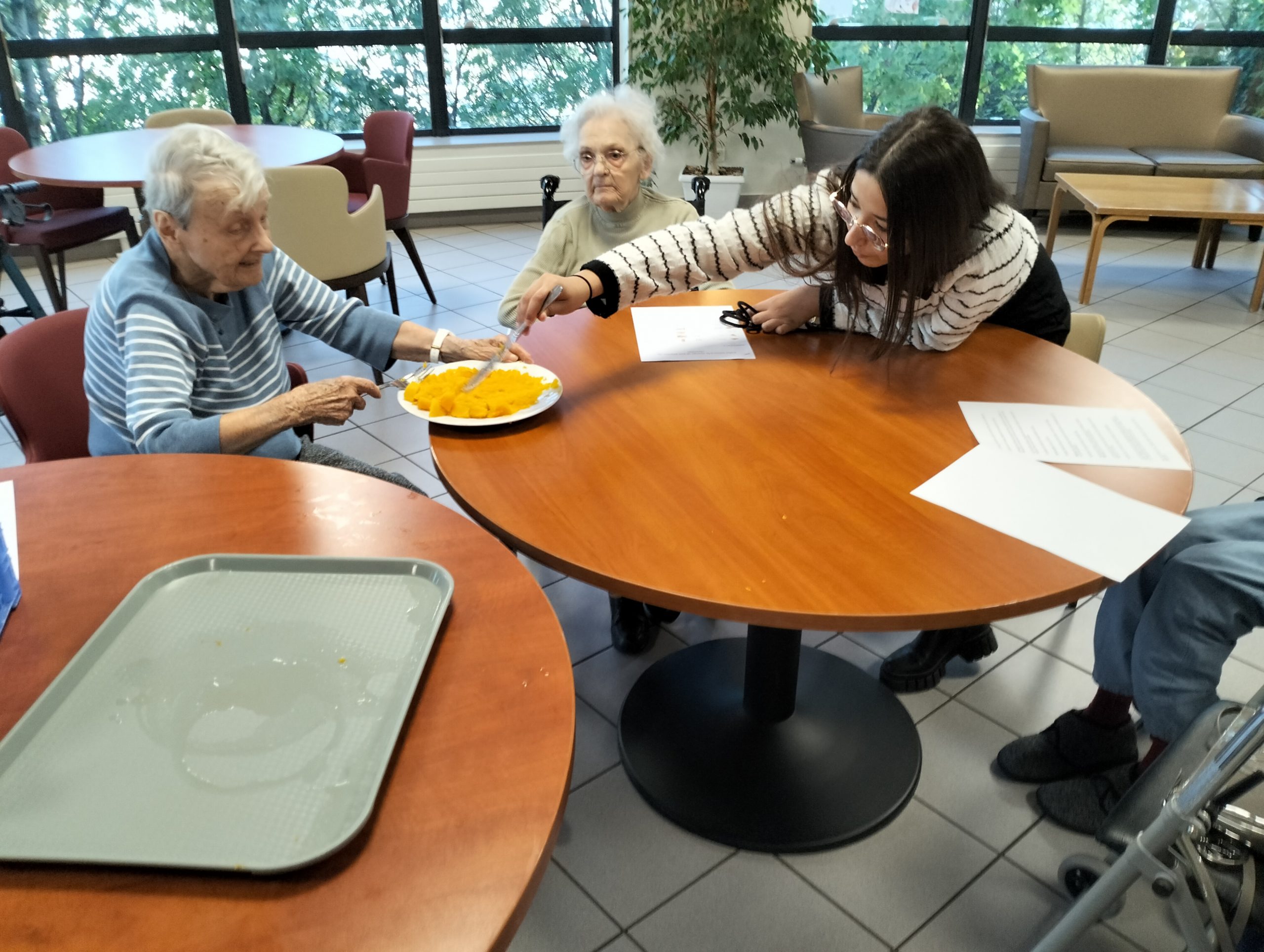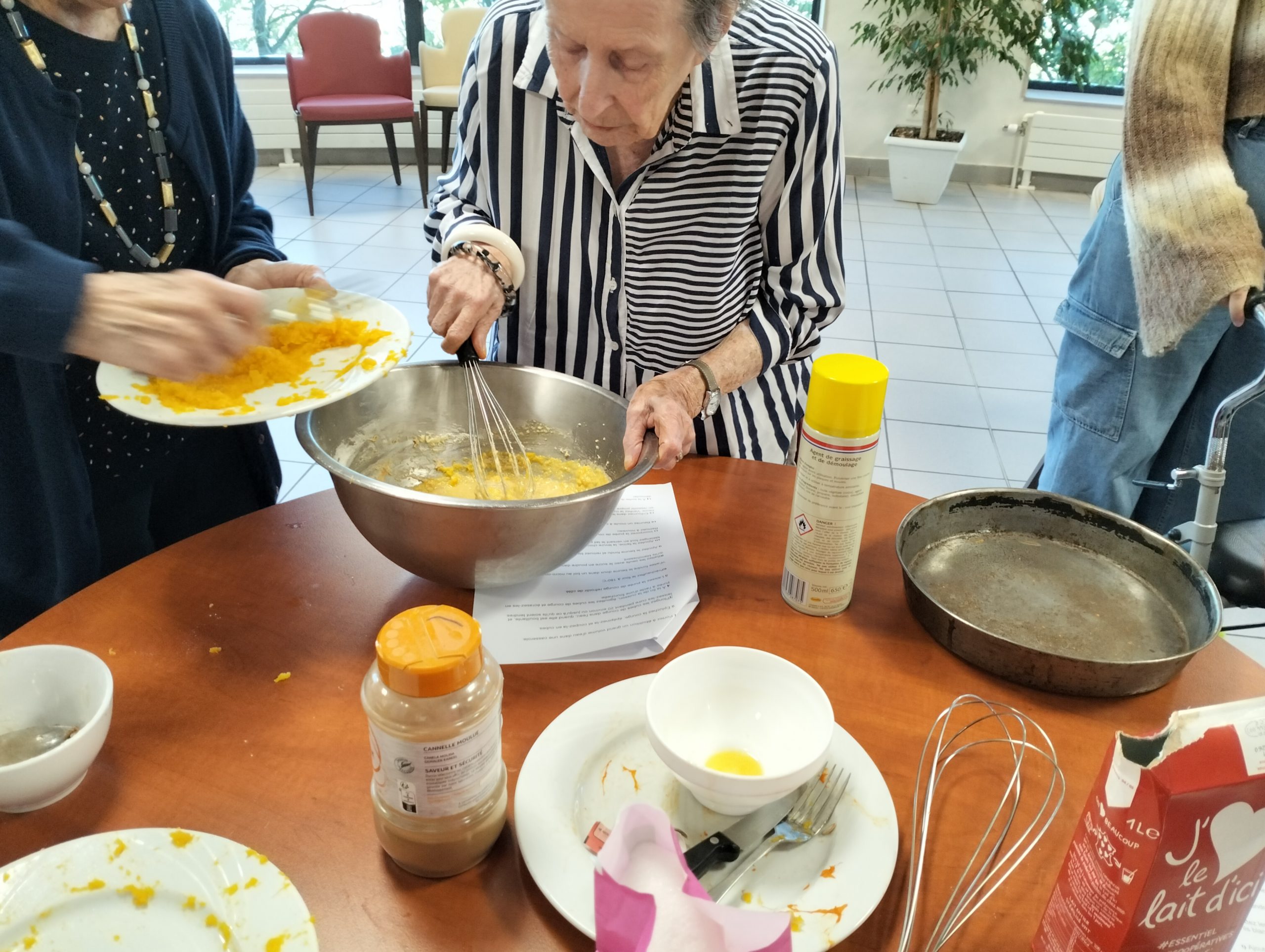 Pour rester dans la thématique de l’automne, le mercredi 8 novembre, les résidents ont confectionné des cakes à la courge. Tout le monde était un peu étonné mais le rendu était bien, accompagné de cannelle et de sucre glace. Les résidents ont apprécié la dégustation en découvrant de nouvelles saveurs. Chloé et Feyza, anciennes services civiques sont passées en surprise aux Amandines saluer les résidents et passer un moment avec eux. Les résidents étaient heureux de les revoir.