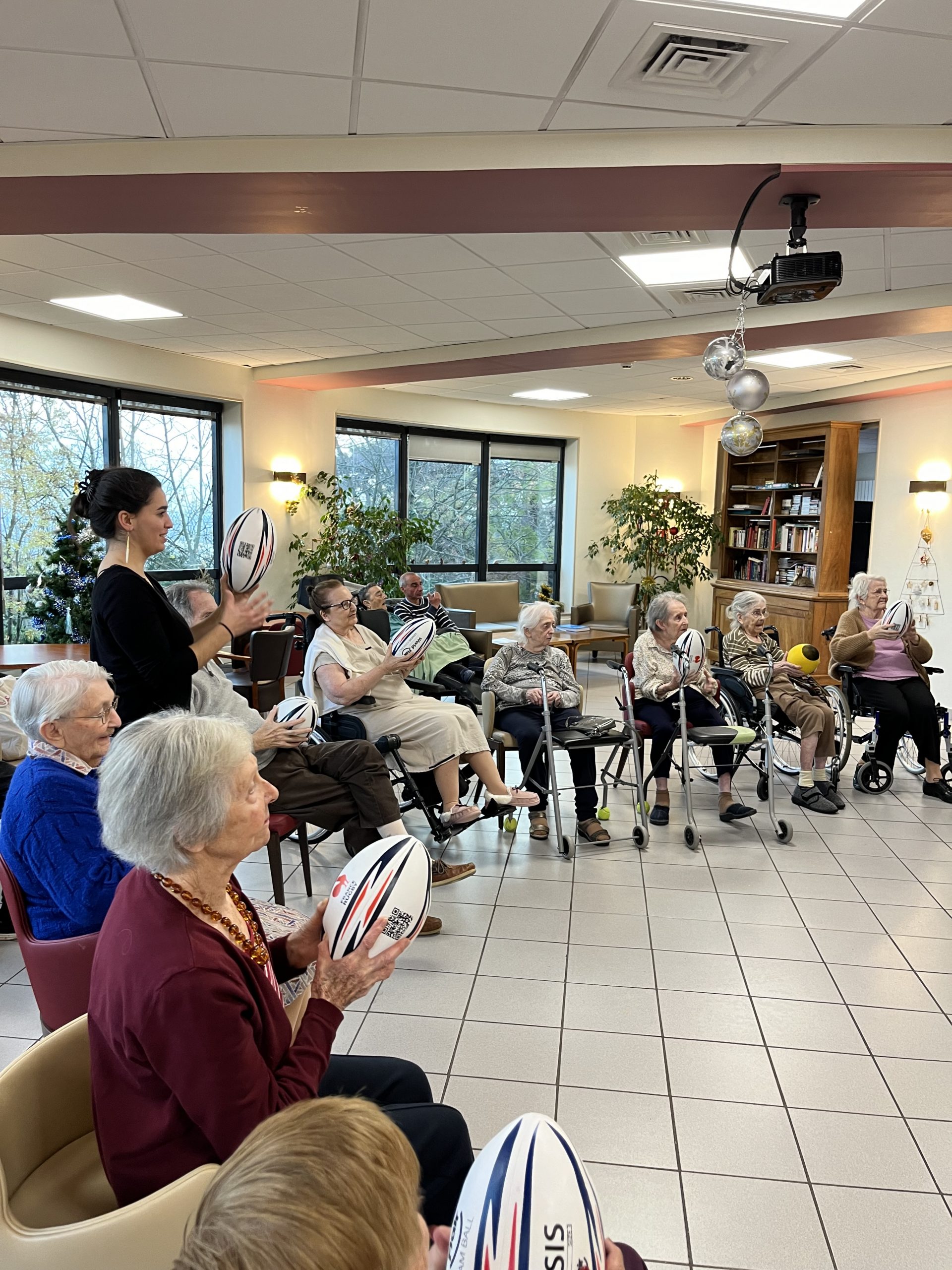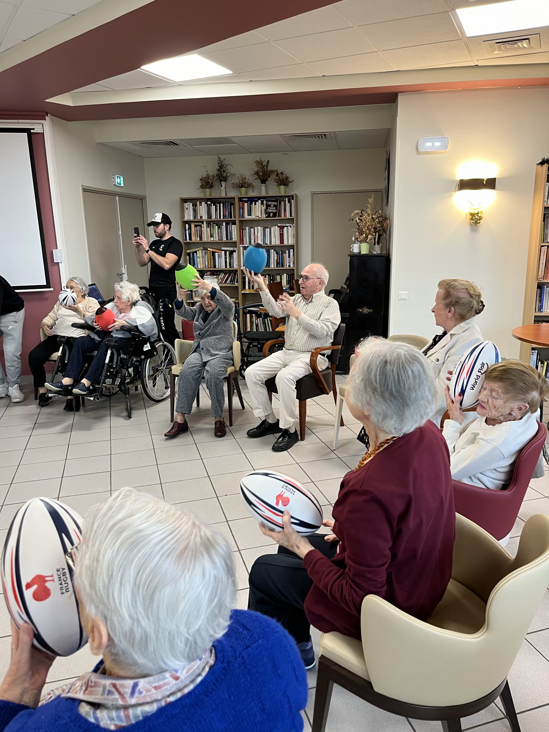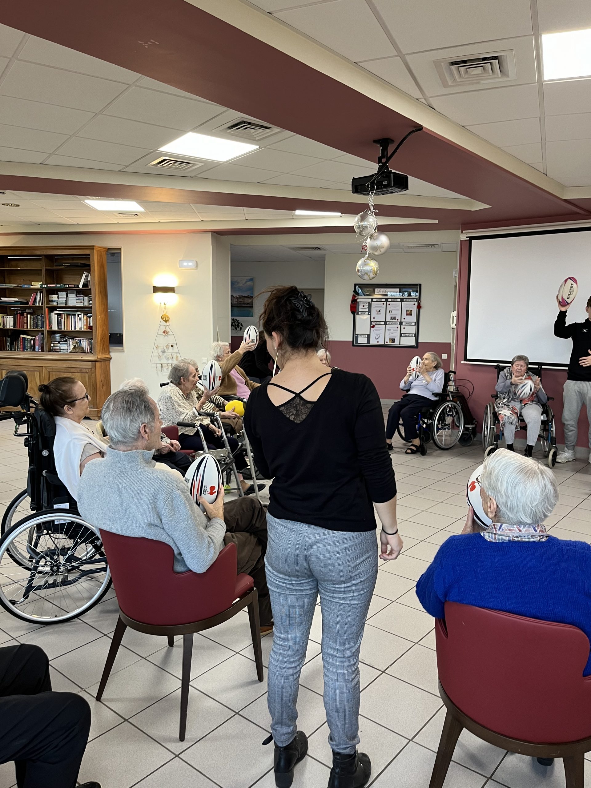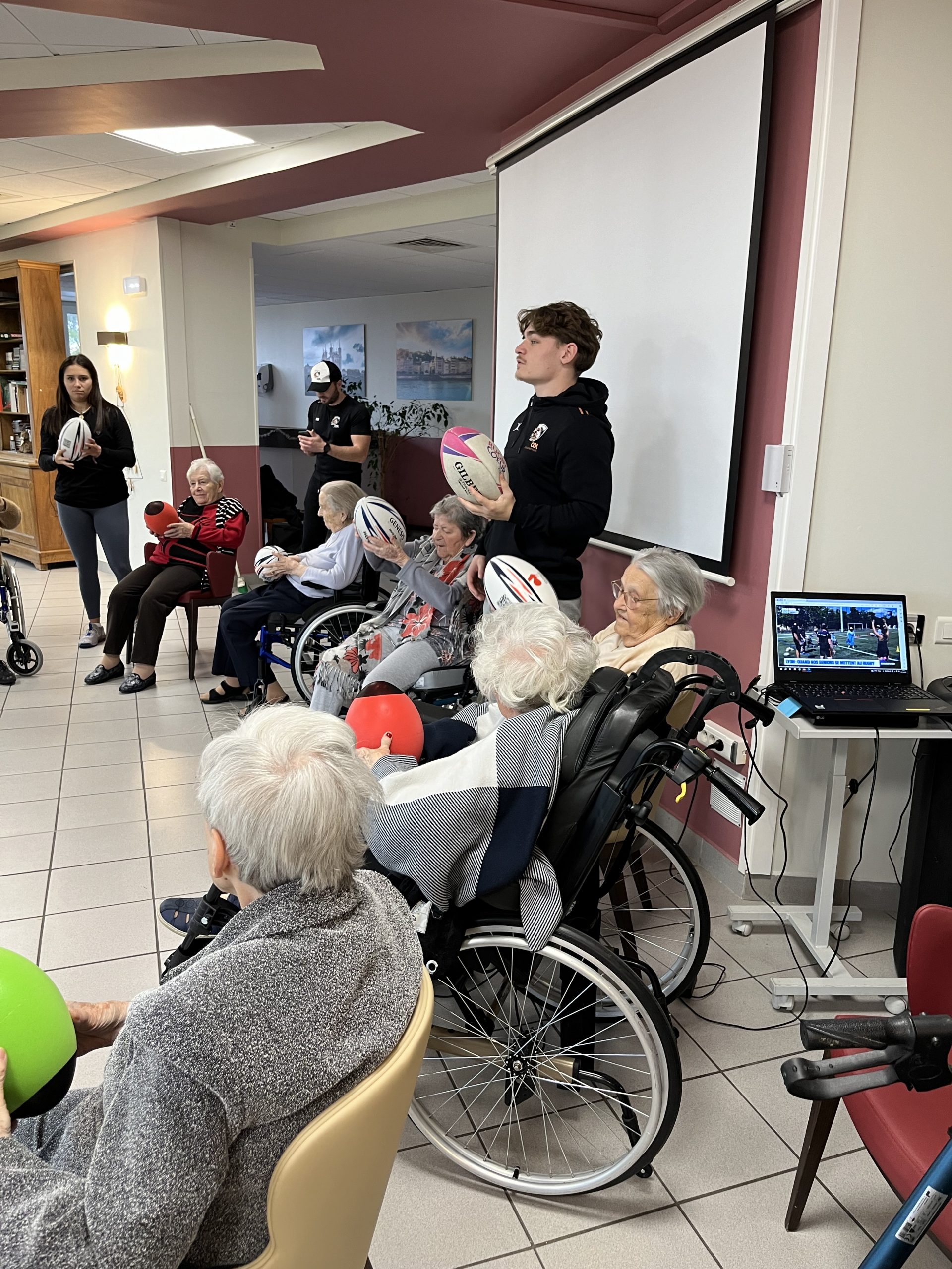 Nous avons eu le plaisir d’accueillir une nouvelle fois Nicolas du club Omnisport. Accompagné de deux nouveaux stagiaires, il est revenu aux Amandines réaliser un atelier de rugby adapté. Les résidents des Amandines étaient heureux de refaire une séance avec lui.
