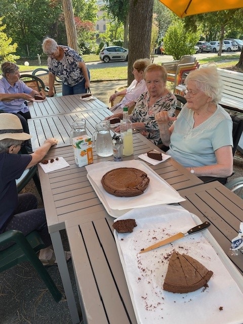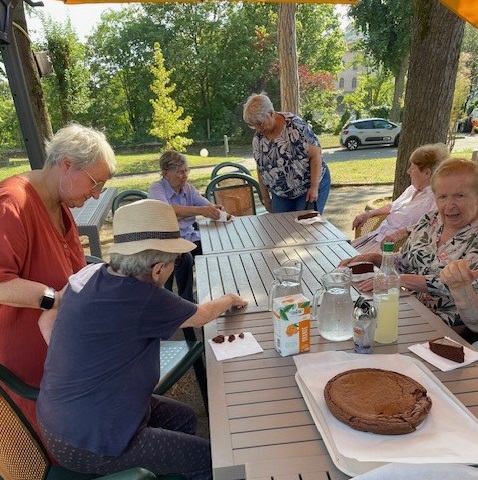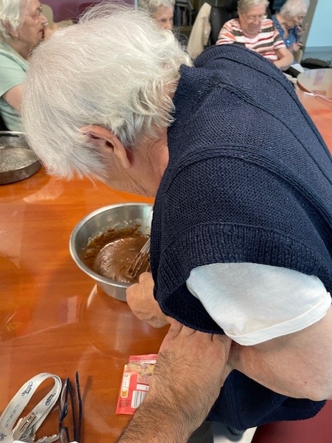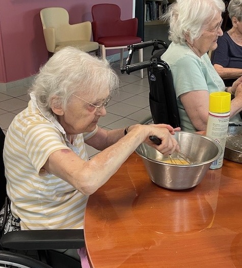 Le 28 août, Elisabeth AMP et Laurent Responsable hôtelier ont animé un atelier pâtisserie : préparation avec les résidents de gâteaux aux pépites de chocolat, poudre d’amande et amandes effilochées avec une petite décoration dessus. Un régal !