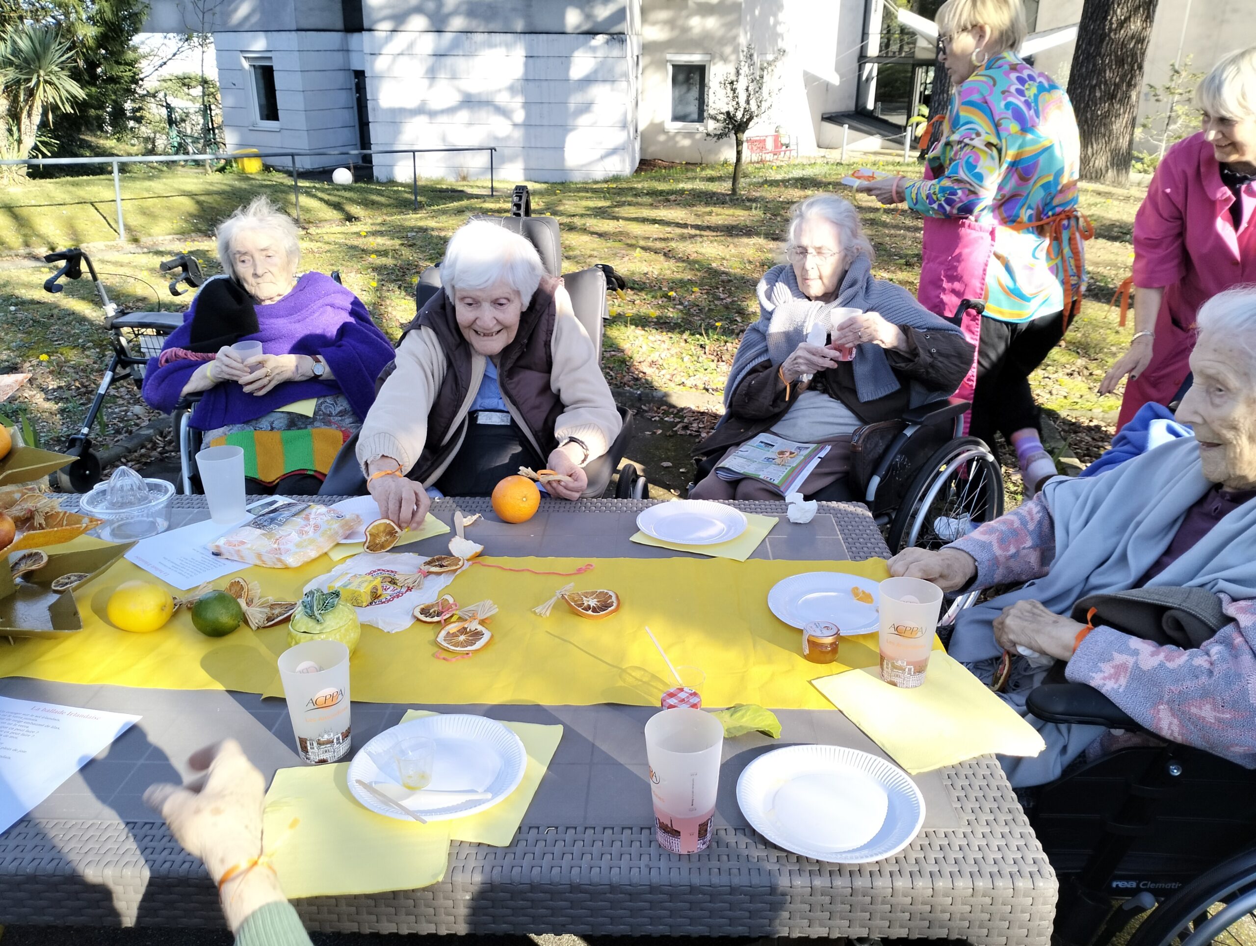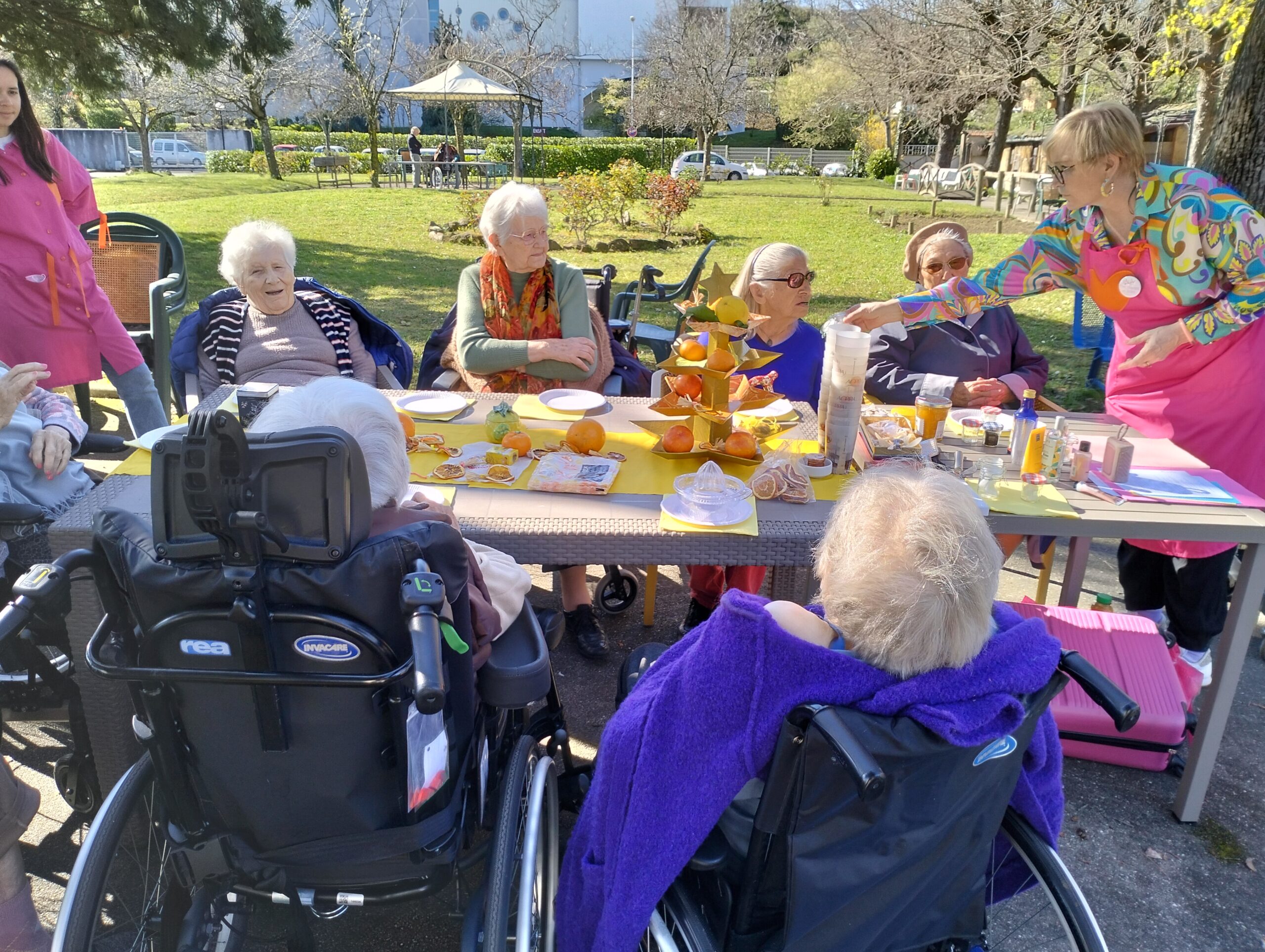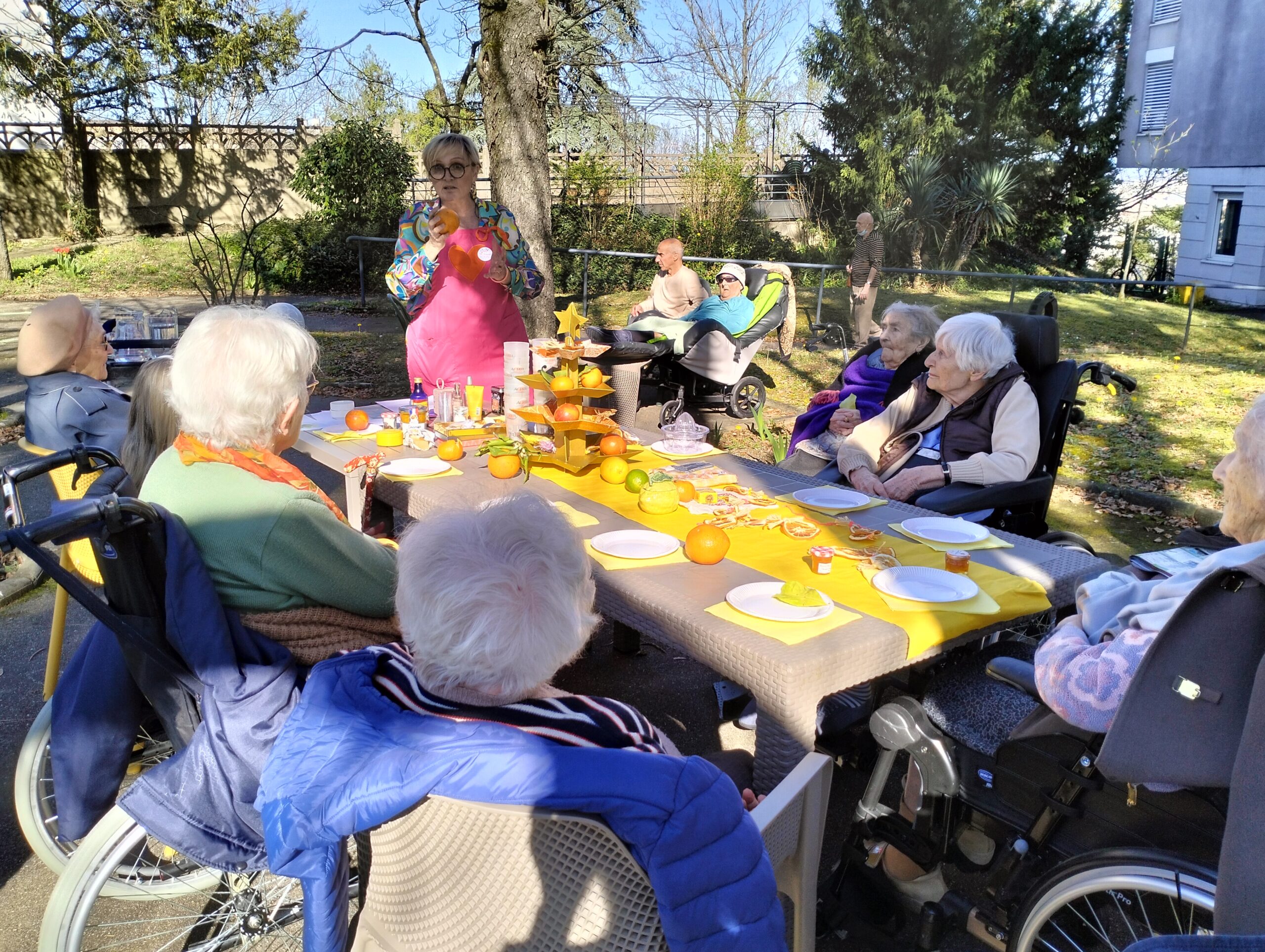 Une bénévole des Blouses Roses a fait un atelier sur les cinq sens en lien avec les agrumes. Ce moment a permis aux résidents de parler de leurs souvenirs, de déguster de bons agrumes et d’apprendre de nouvelles choses. Ils sont repartis avec une rondelle d’orange séchée pour embaumer leurs vêtements d’une odeur agréable et d’un bracelet en tissus avec de la fleur d’oranger pour apprécier cette senteur. Cet après-midi a été un moment agréable de découverte et de partage.