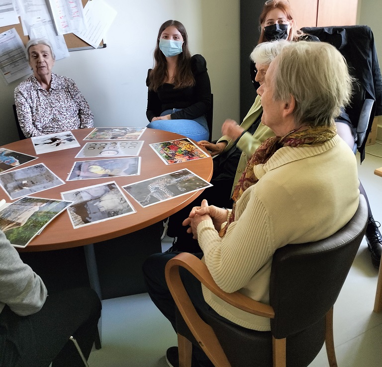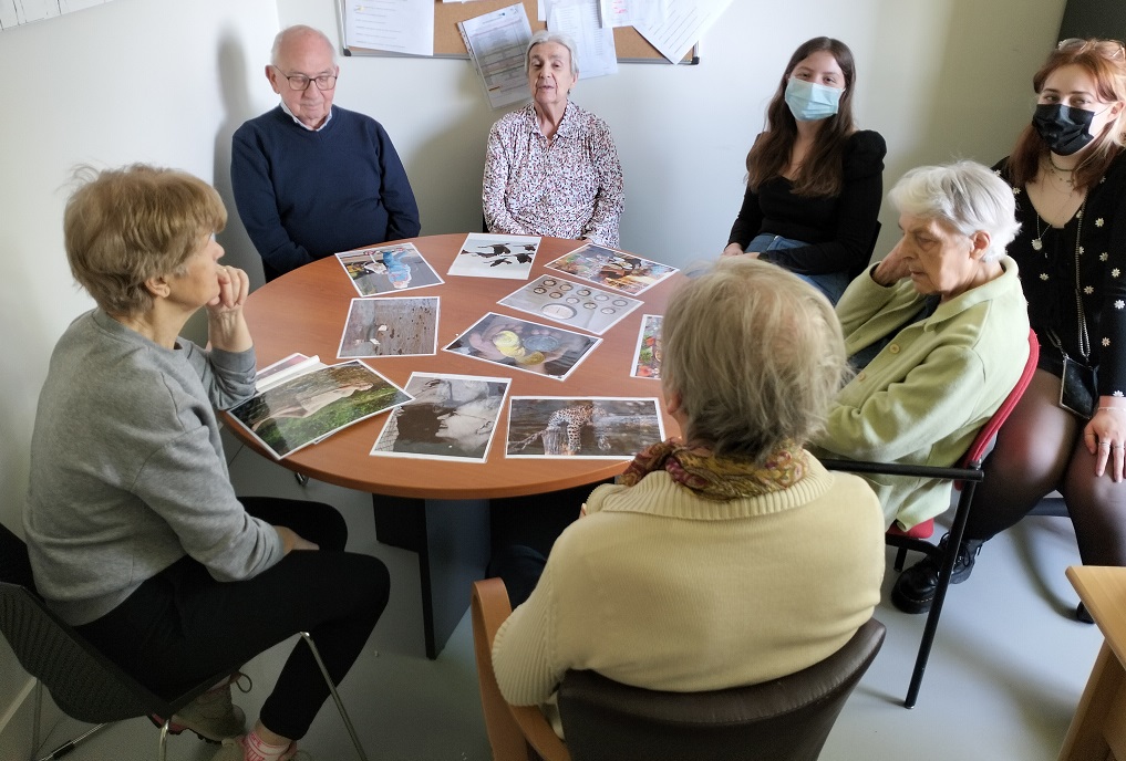 Tous les jeudis matins, Océane, psychologue stagiaire et Chloé en service civique réalisent un atelier de photolangage avec un groupe de résidents du premier étage. Encadrées par la psychologue de l’établissement, elles animent cet atelier thérapeutique à deux. Les résidents utilisent ce moment comme temps d’échanges et de discussions où la détente et le calme se font sentir.