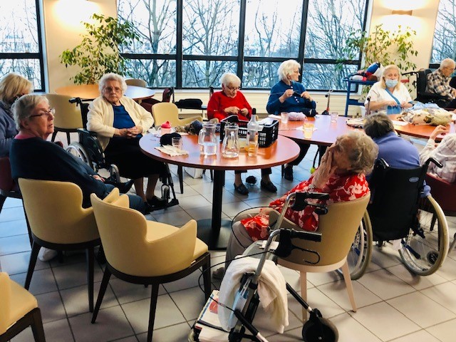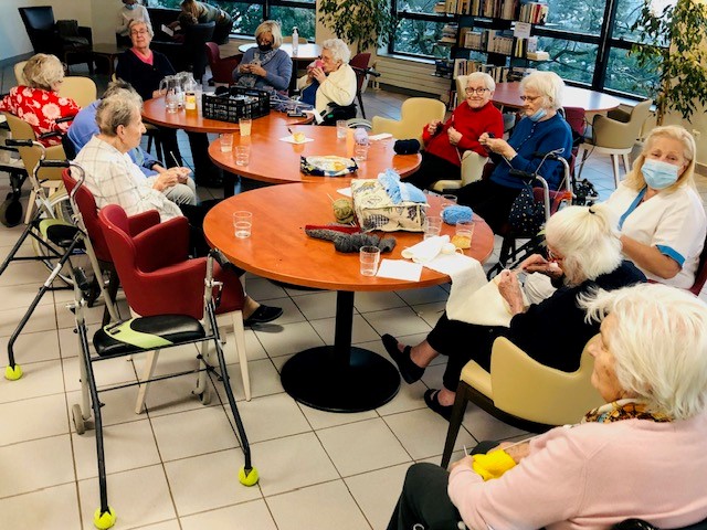 Tous les vendredis, les résidents, Elisabeth et Clara se réunissent dans le salon du Framboisier pour l’atelier Tricot. En musique avec les paroles projetées sur l’écran du vidéoprojecteur, les résidents tricotent en rythme.