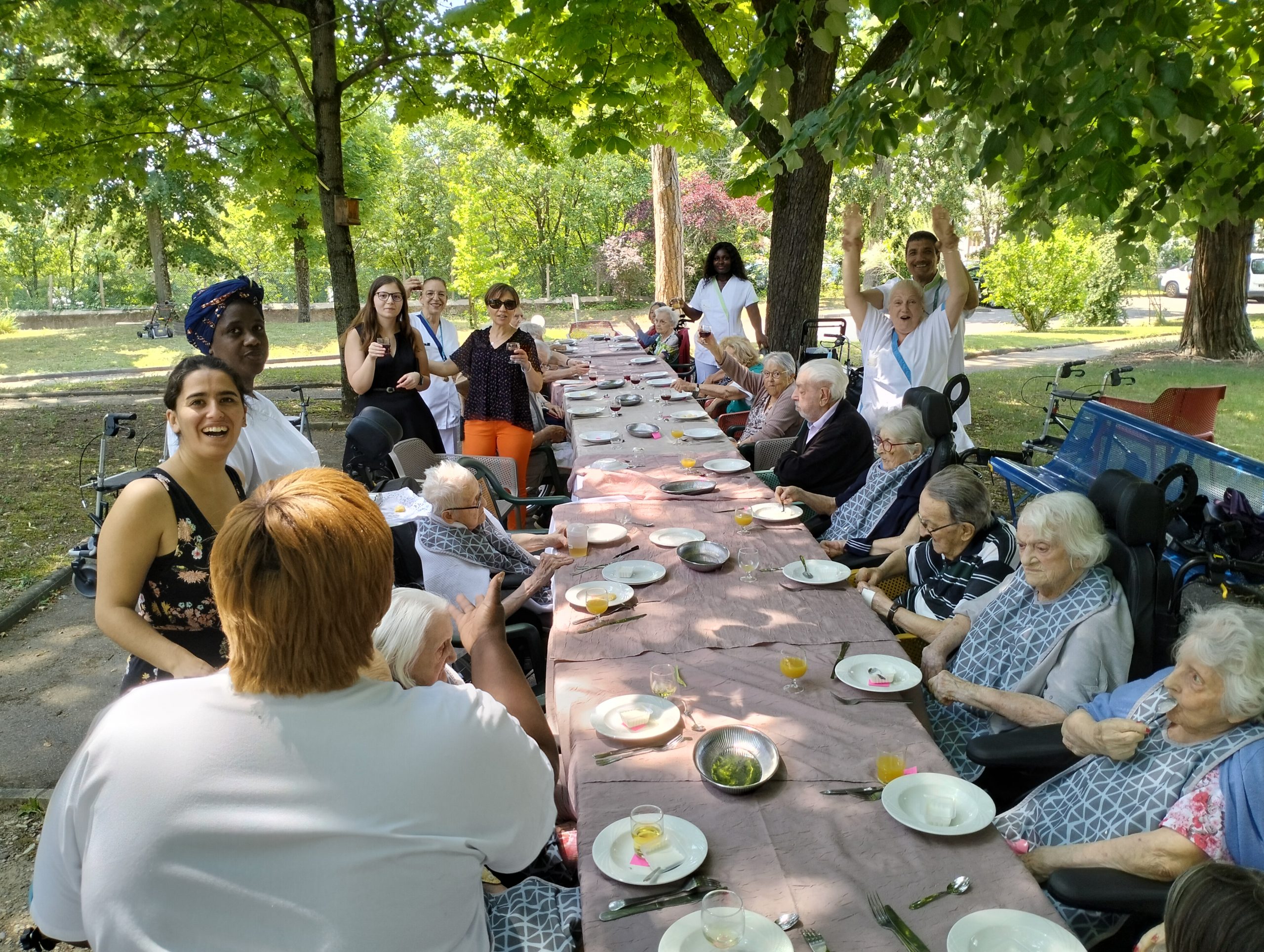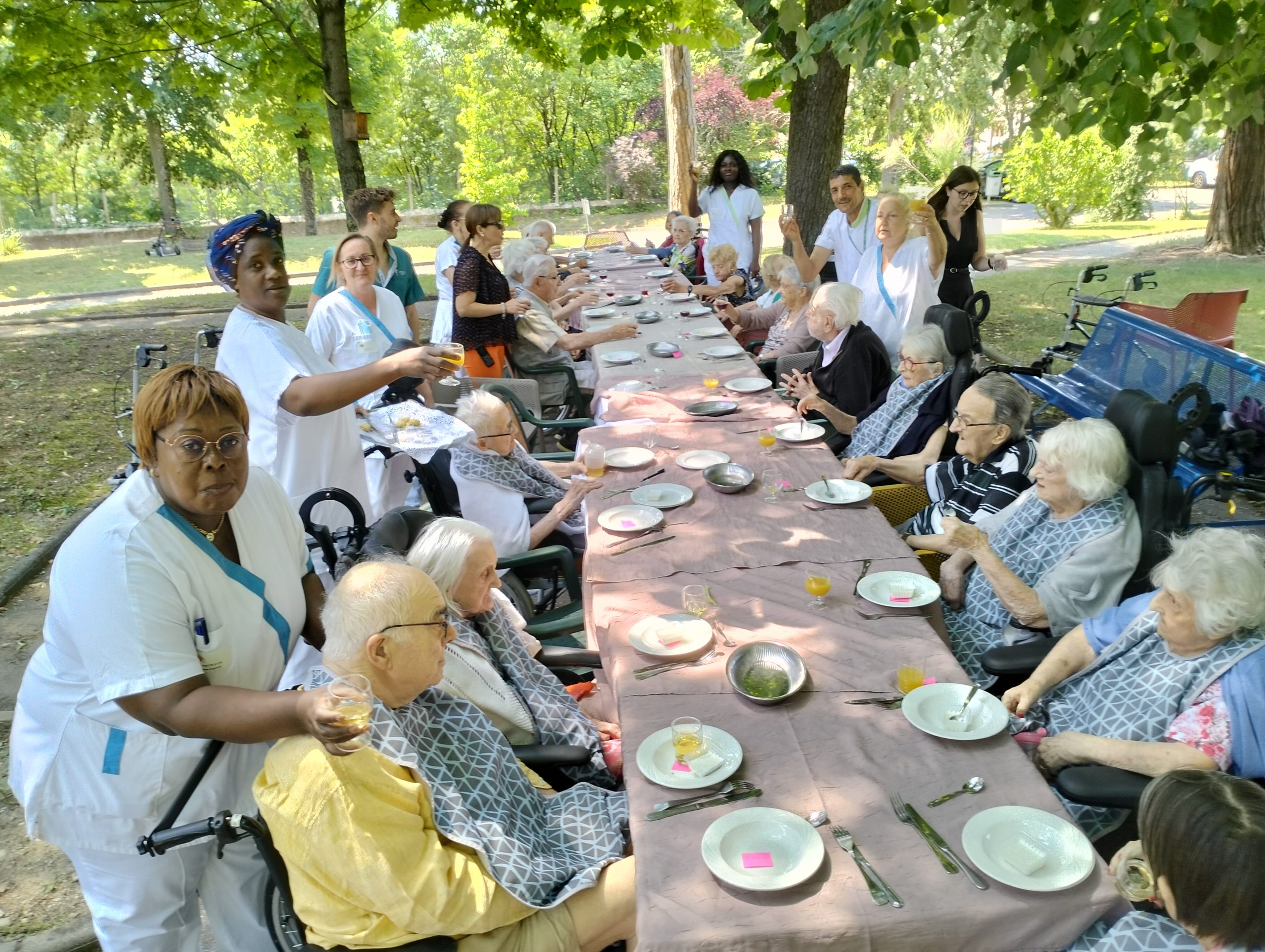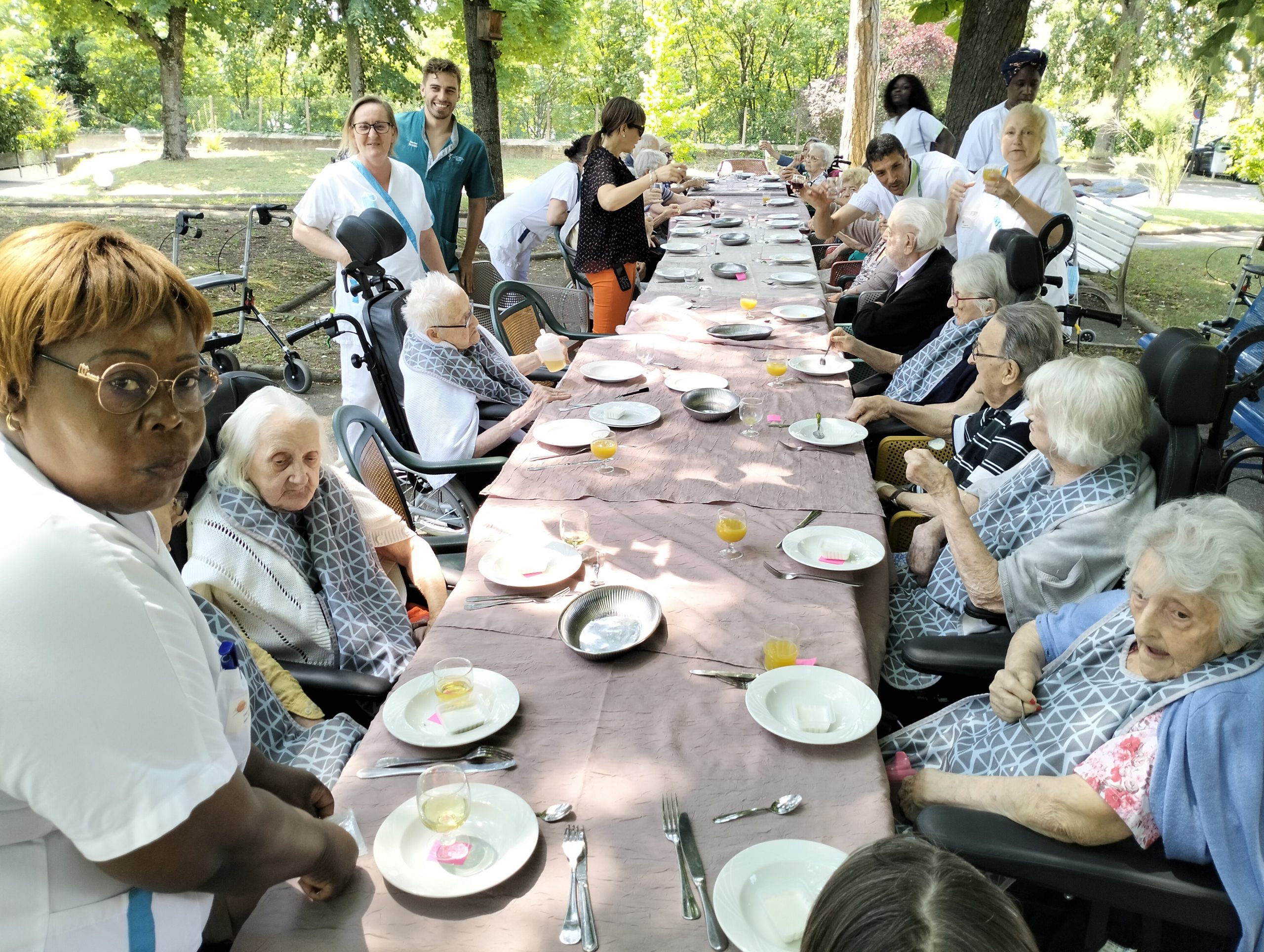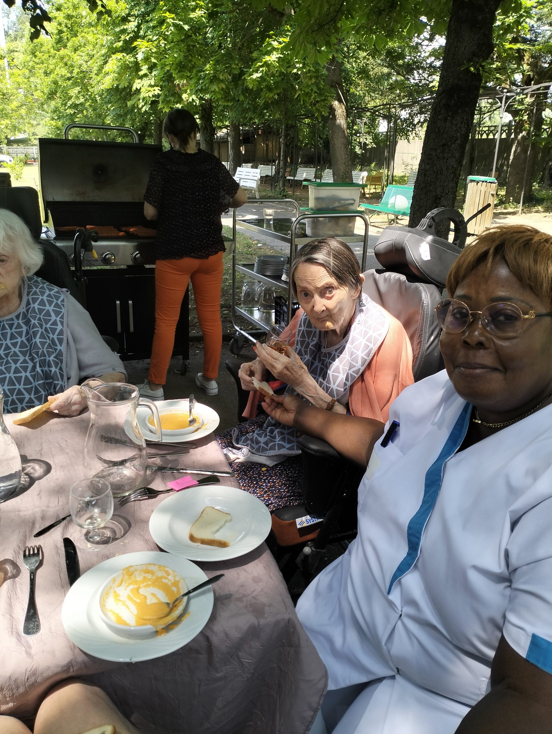Vendredi 16 juin, les résidents du 4ème étage avec les professionnels ont profité tous ensemble d’un barbecue extérieur dans le parc des Amandines. Au menu : melon et charcuterie, merguez et chipolatas, ratatouille et pommes de terre sautées, fromage ou yaourt et glaces en dessert. Le repas s’est terminé avec un café en chansons. Tous les résidents et les professionnels apprécient ces moments conviviaux.