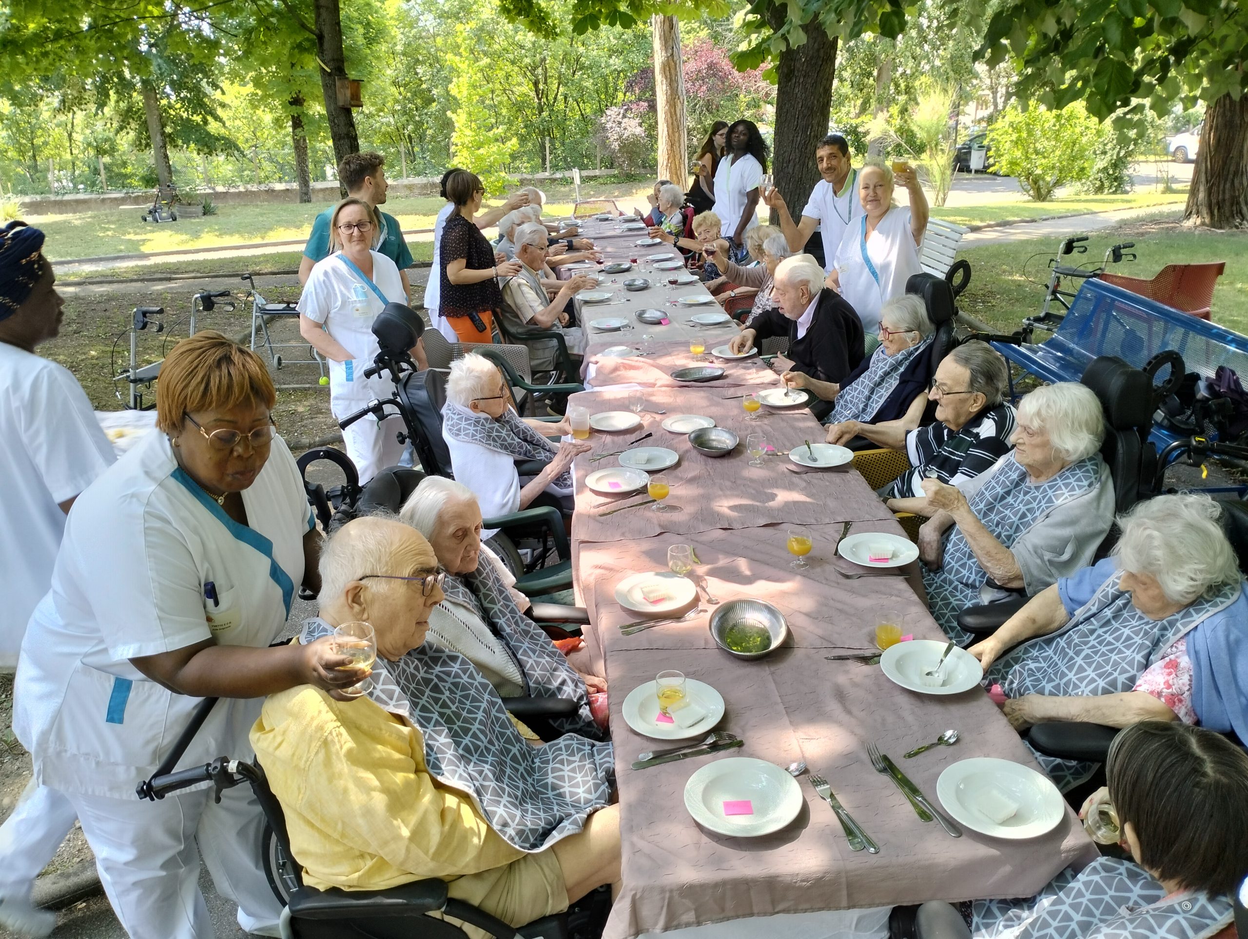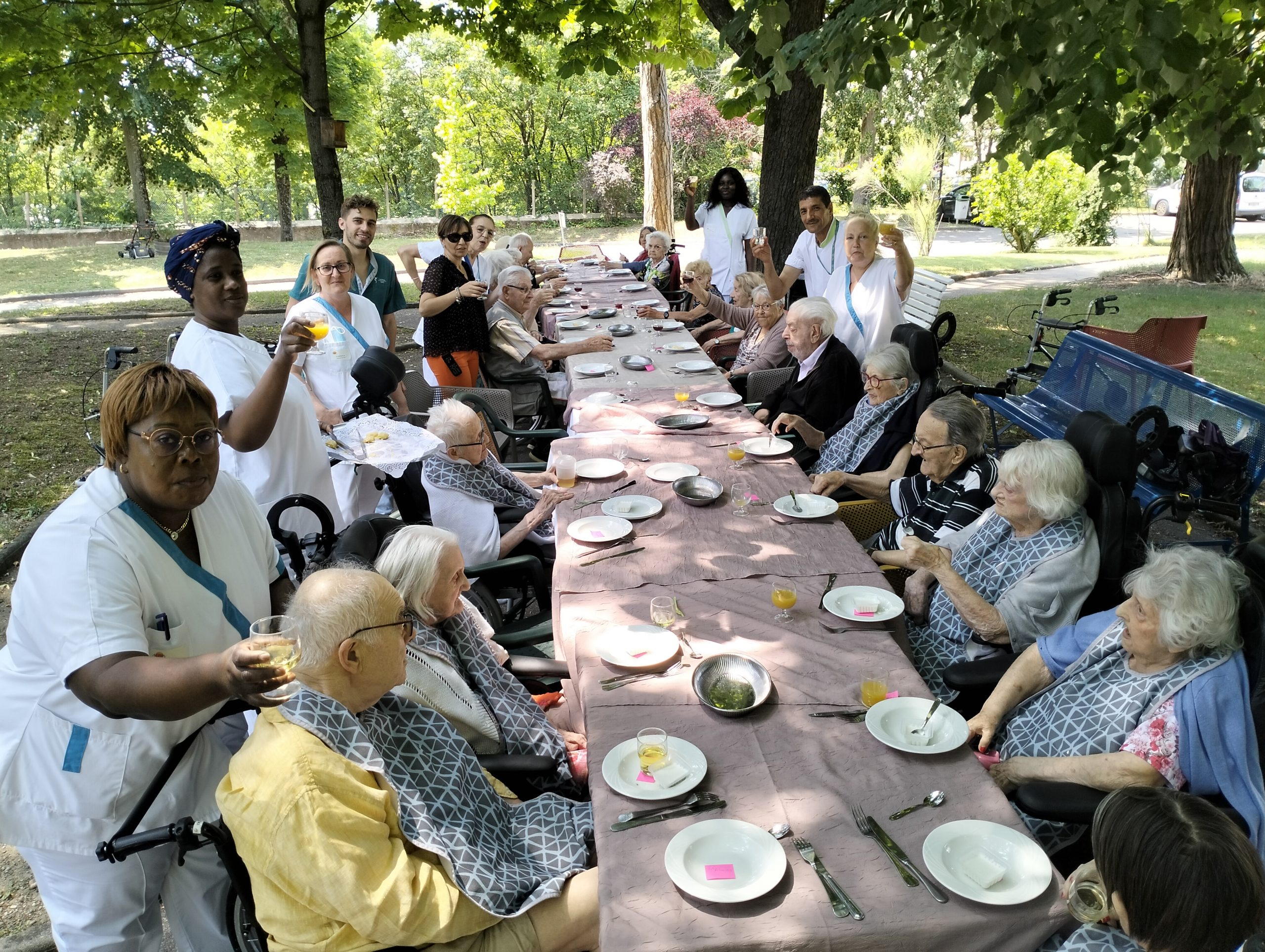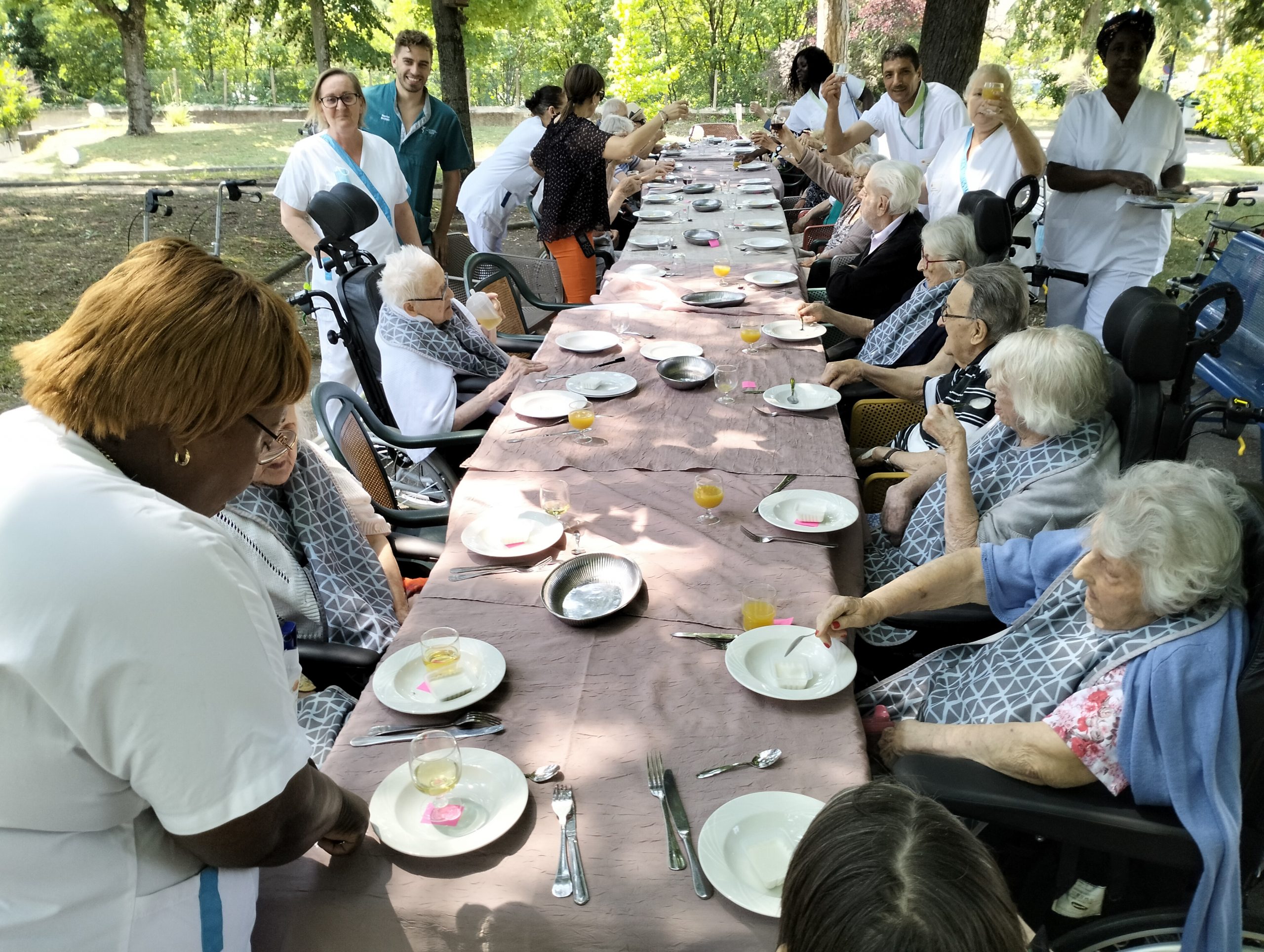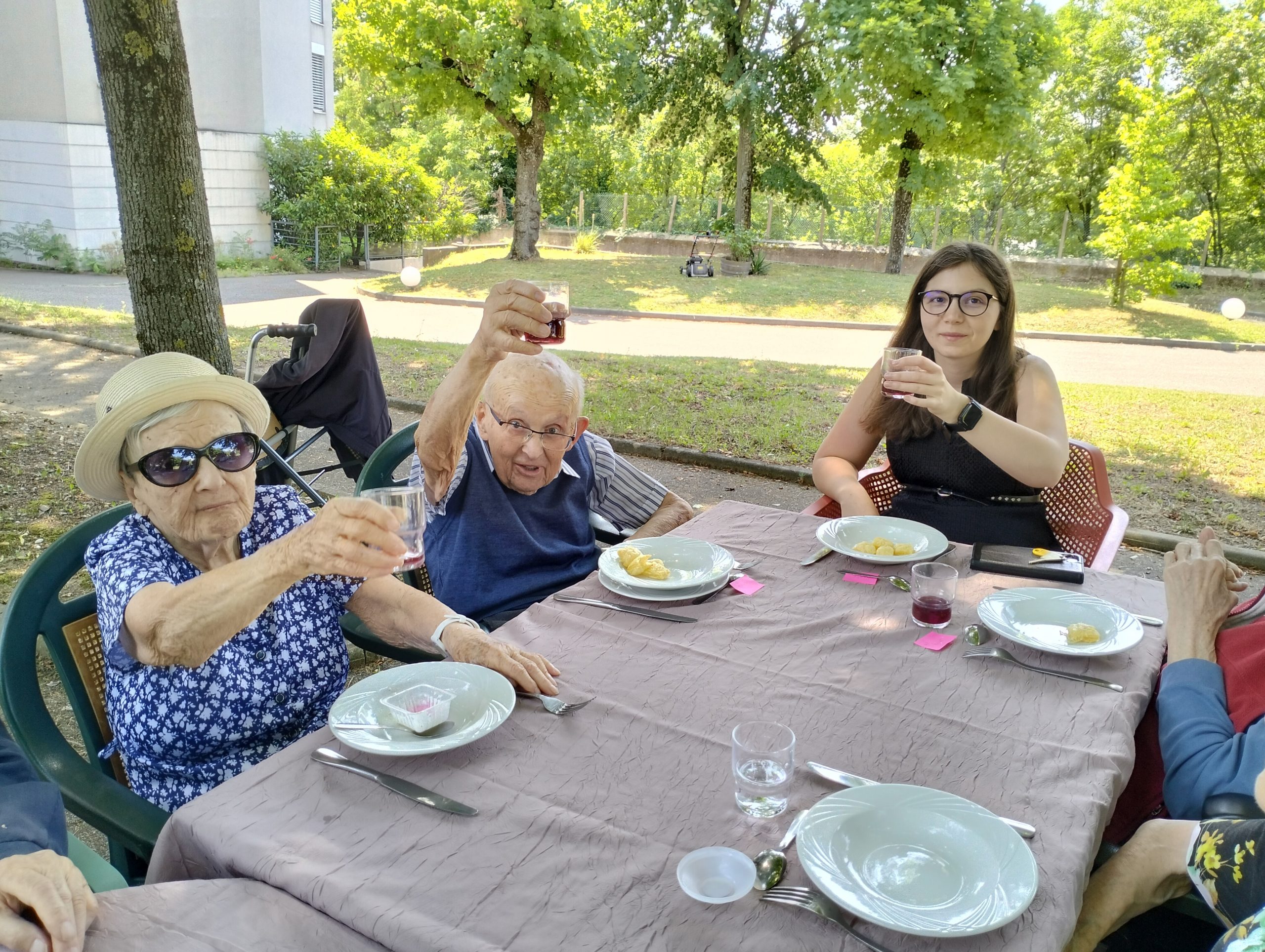 Vendredi 16 juin, les résidents du 4ème étage avec les professionnels ont profité tous ensemble d’un barbecue extérieur dans le parc des Amandines. Au menu : melon et charcuterie, merguez et chipolatas, ratatouille et pommes de terre sautées, fromage ou yaourt et glaces en dessert. Le repas s’est terminé avec un café en chansons. Tous les résidents et les professionnels apprécient ces moments conviviaux.