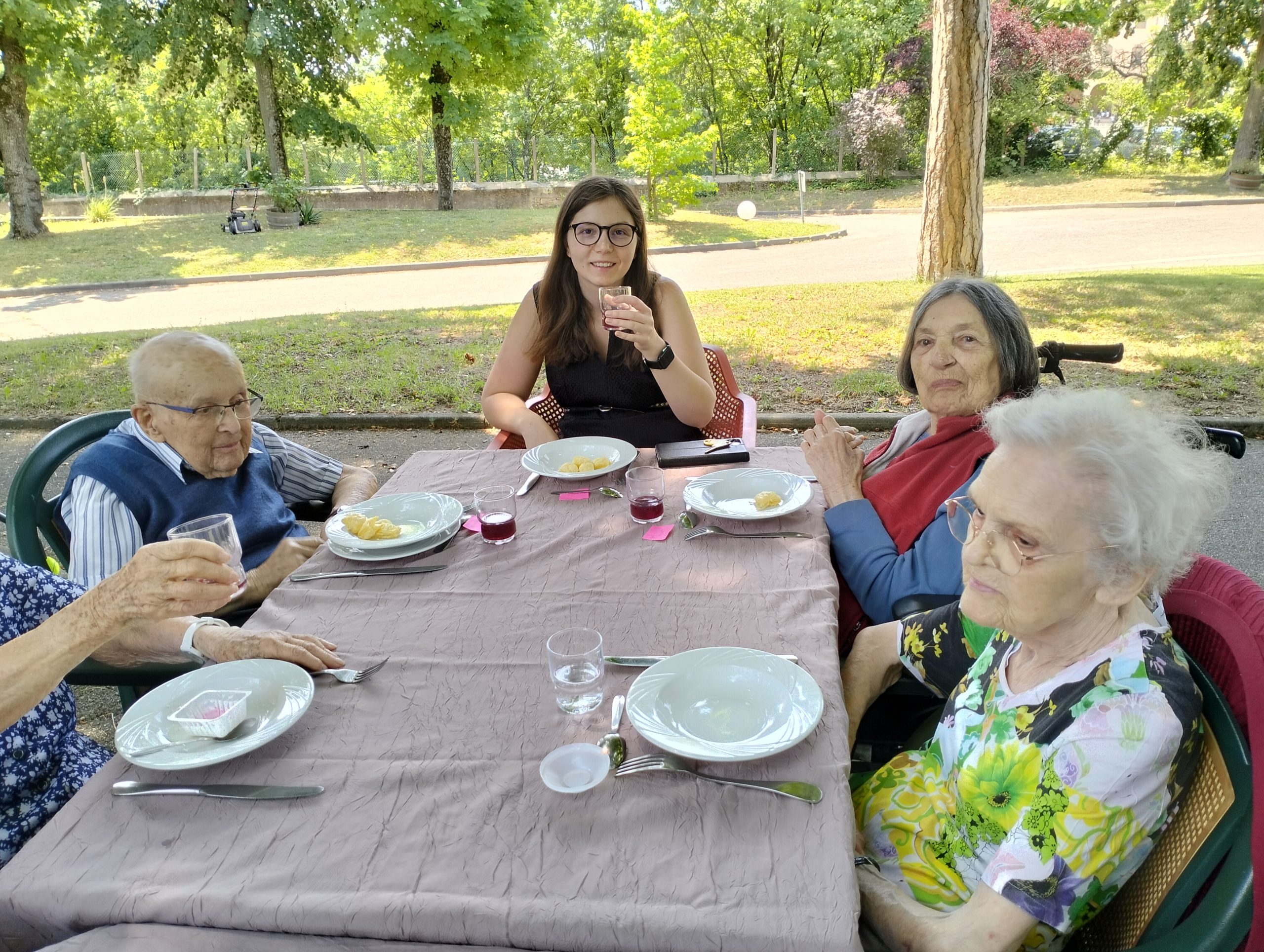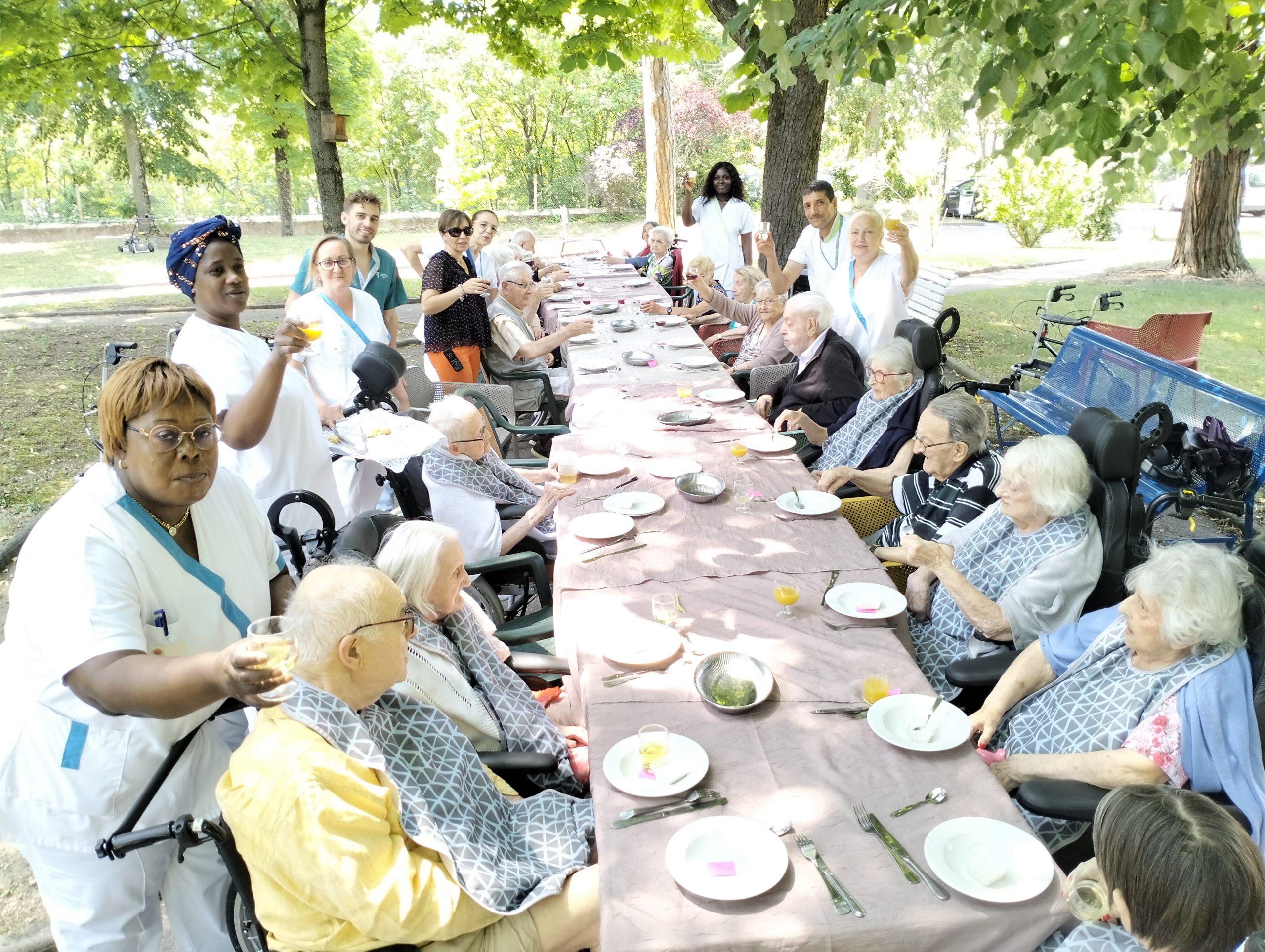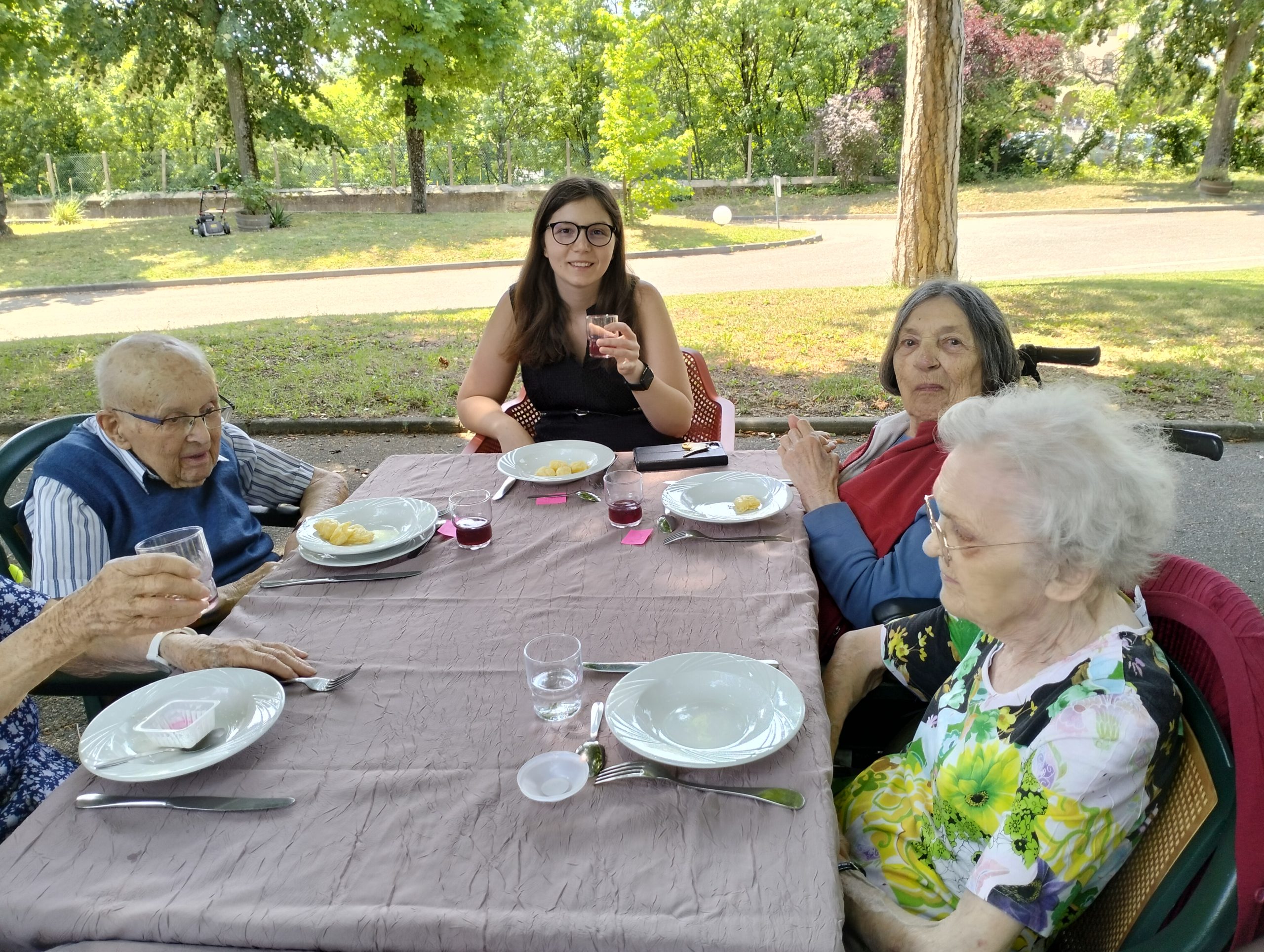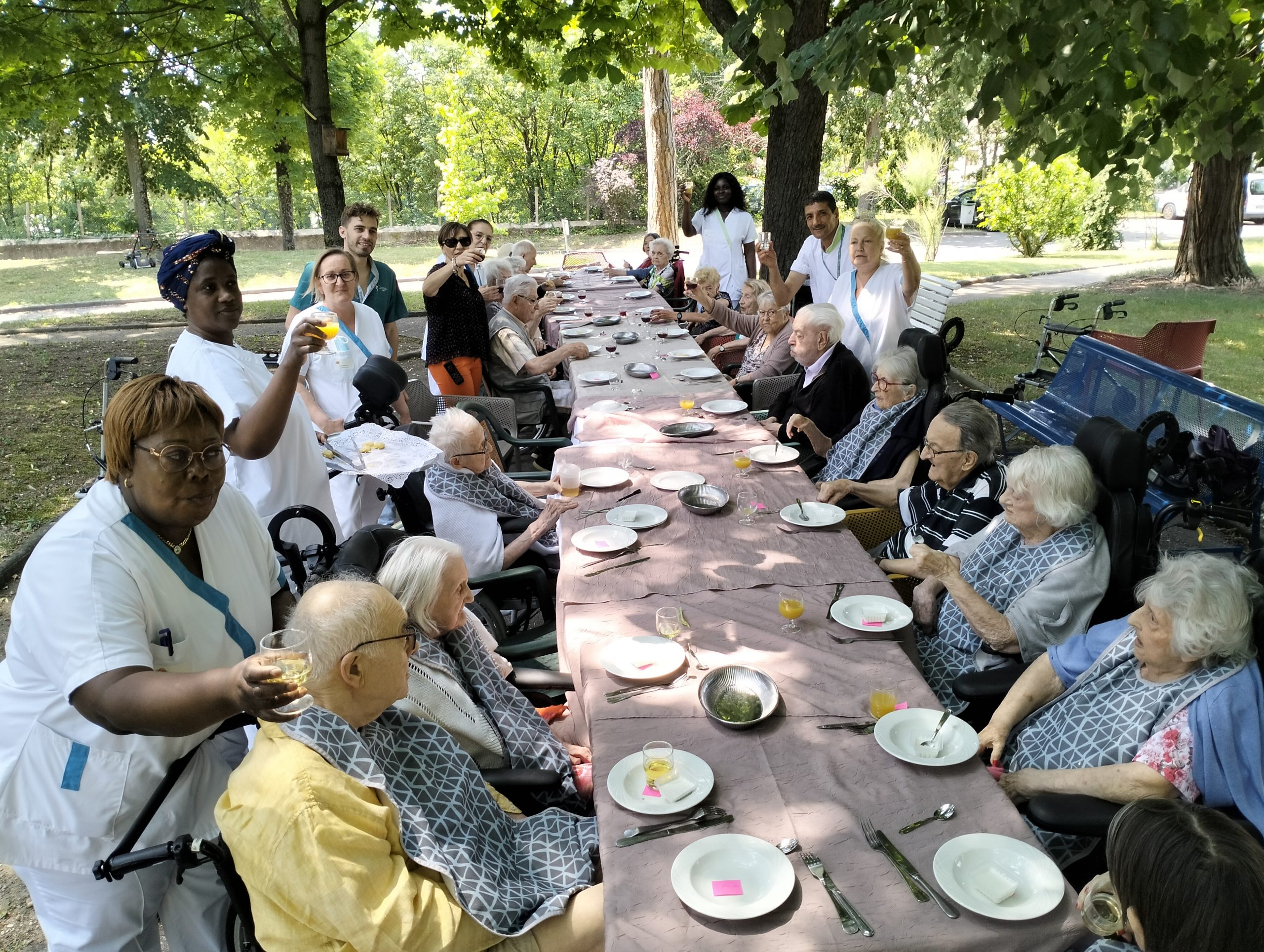 Vendredi 16 juin, les résidents du 4ème étage avec les professionnels ont profité tous ensemble d’un barbecue extérieur dans le parc des Amandines. Au menu : melon et charcuterie, merguez et chipolatas, ratatouille et pommes de terre sautées, fromage ou yaourt et glaces en dessert. Le repas s’est terminé avec un café en chansons. Tous les résidents et les professionnels apprécient ces moments conviviaux.