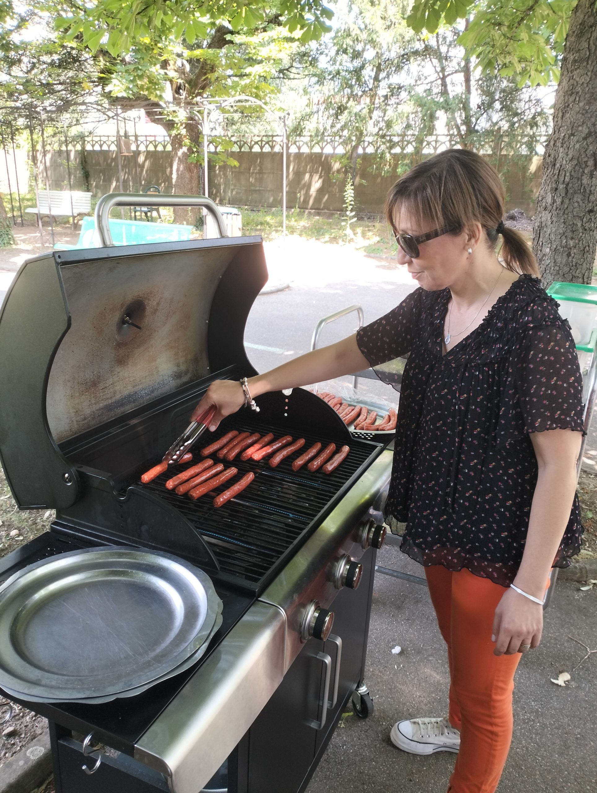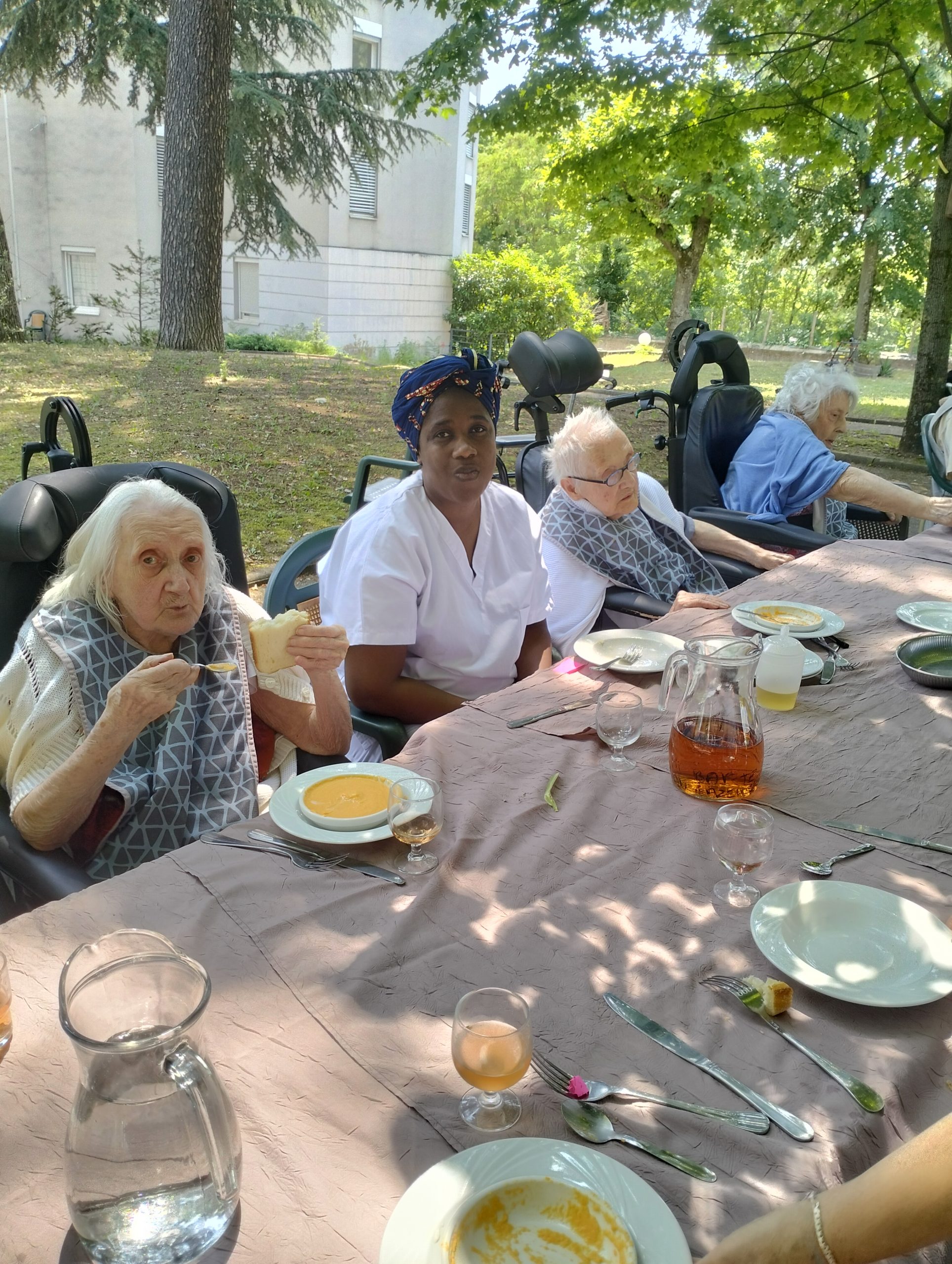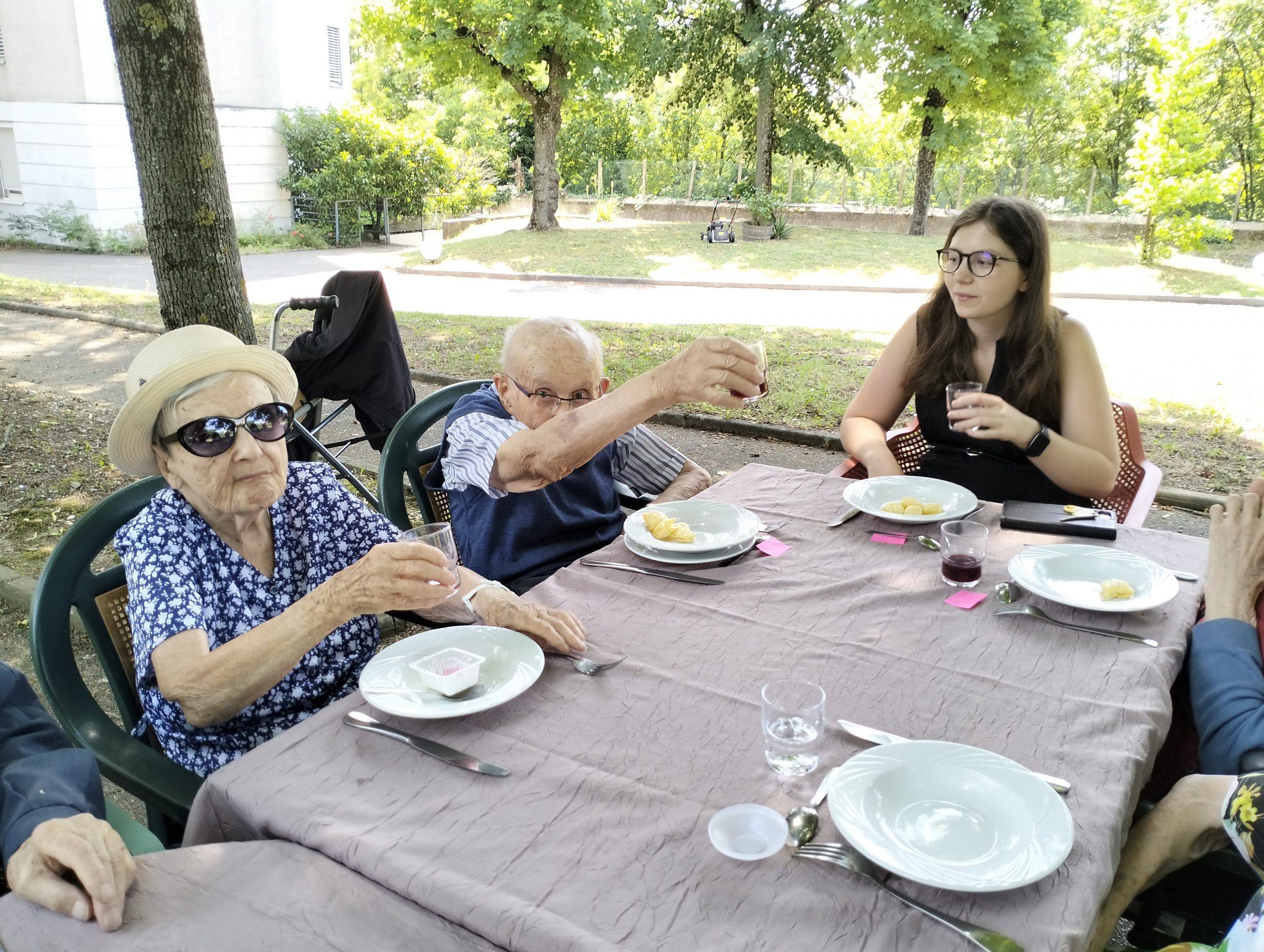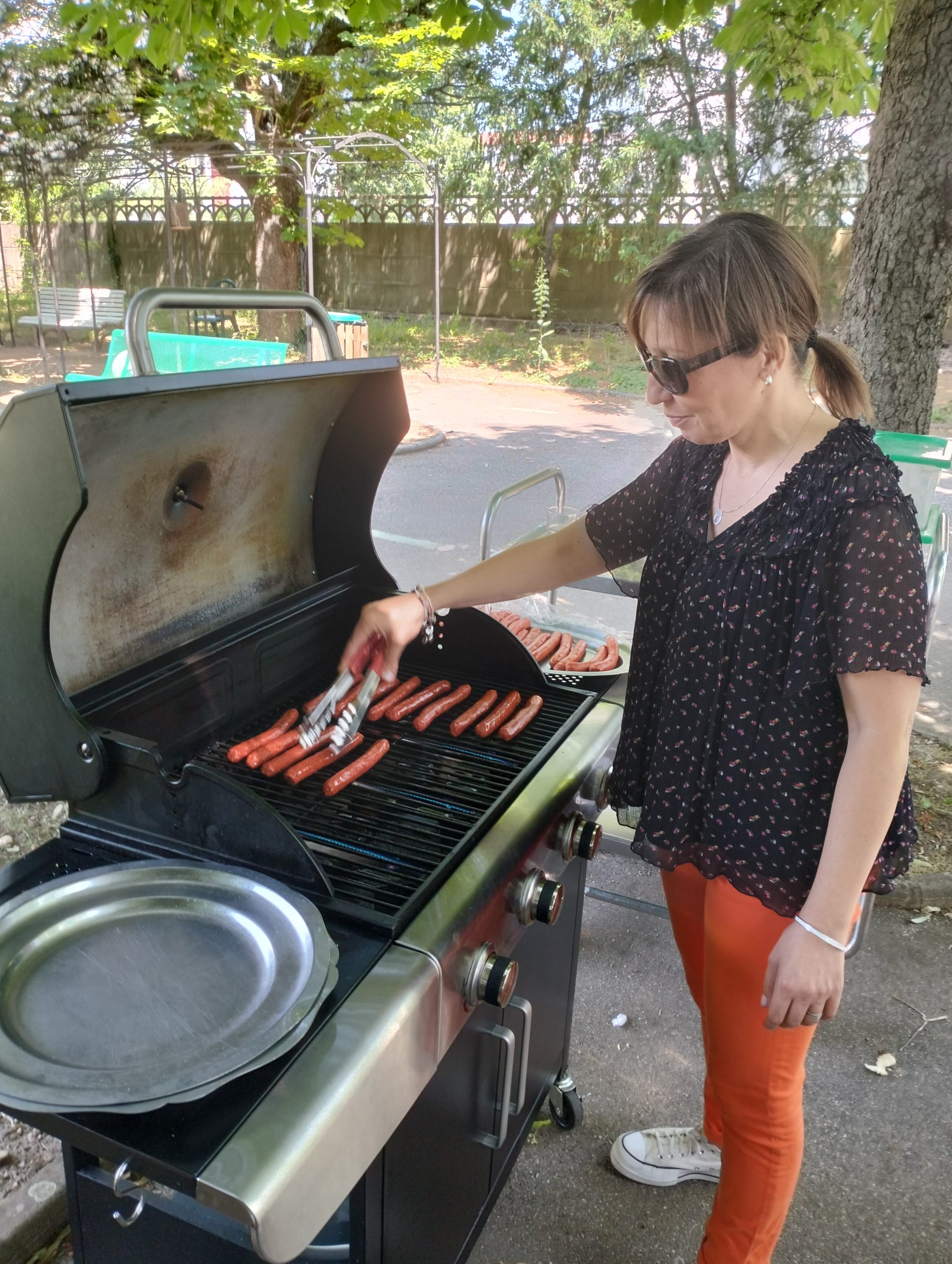 Vendredi 16 juin, les résidents du 4ème étage avec les professionnels ont profité tous ensemble d’un barbecue extérieur dans le parc des Amandines. Au menu : melon et charcuterie, merguez et chipolatas, ratatouille et pommes de terre sautées, fromage ou yaourt et glaces en dessert. Le repas s’est terminé avec un café en chansons. Tous les résidents et les professionnels apprécient ces moments conviviaux.