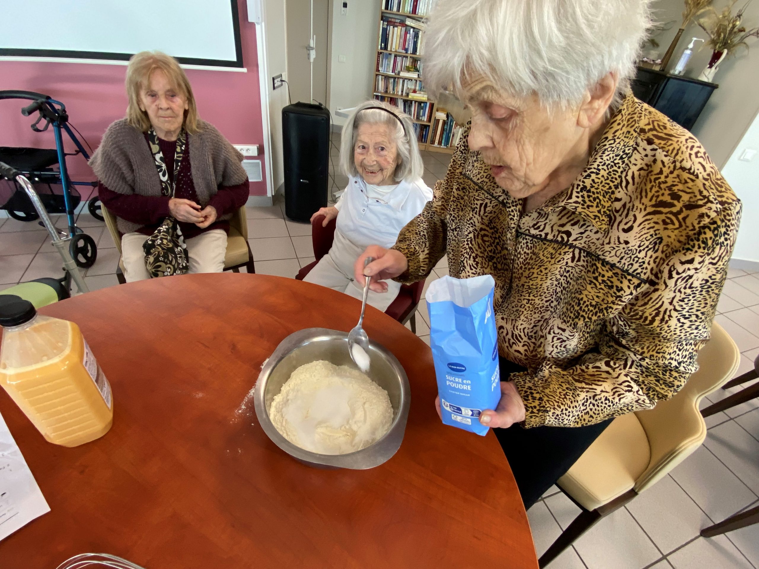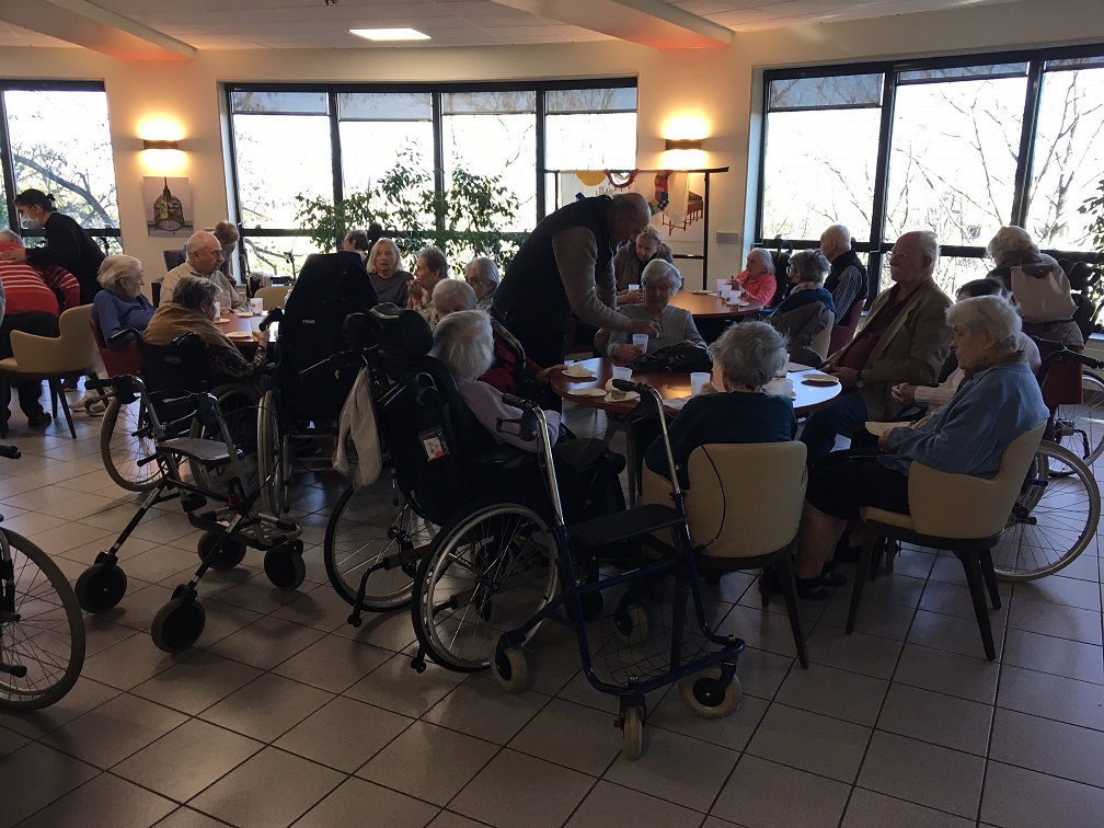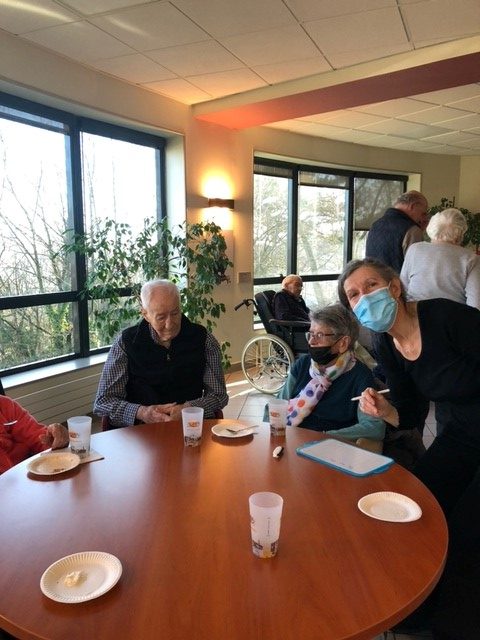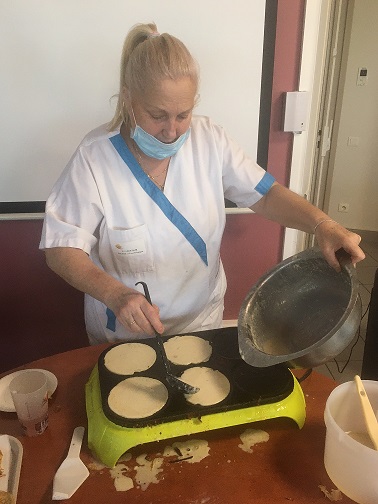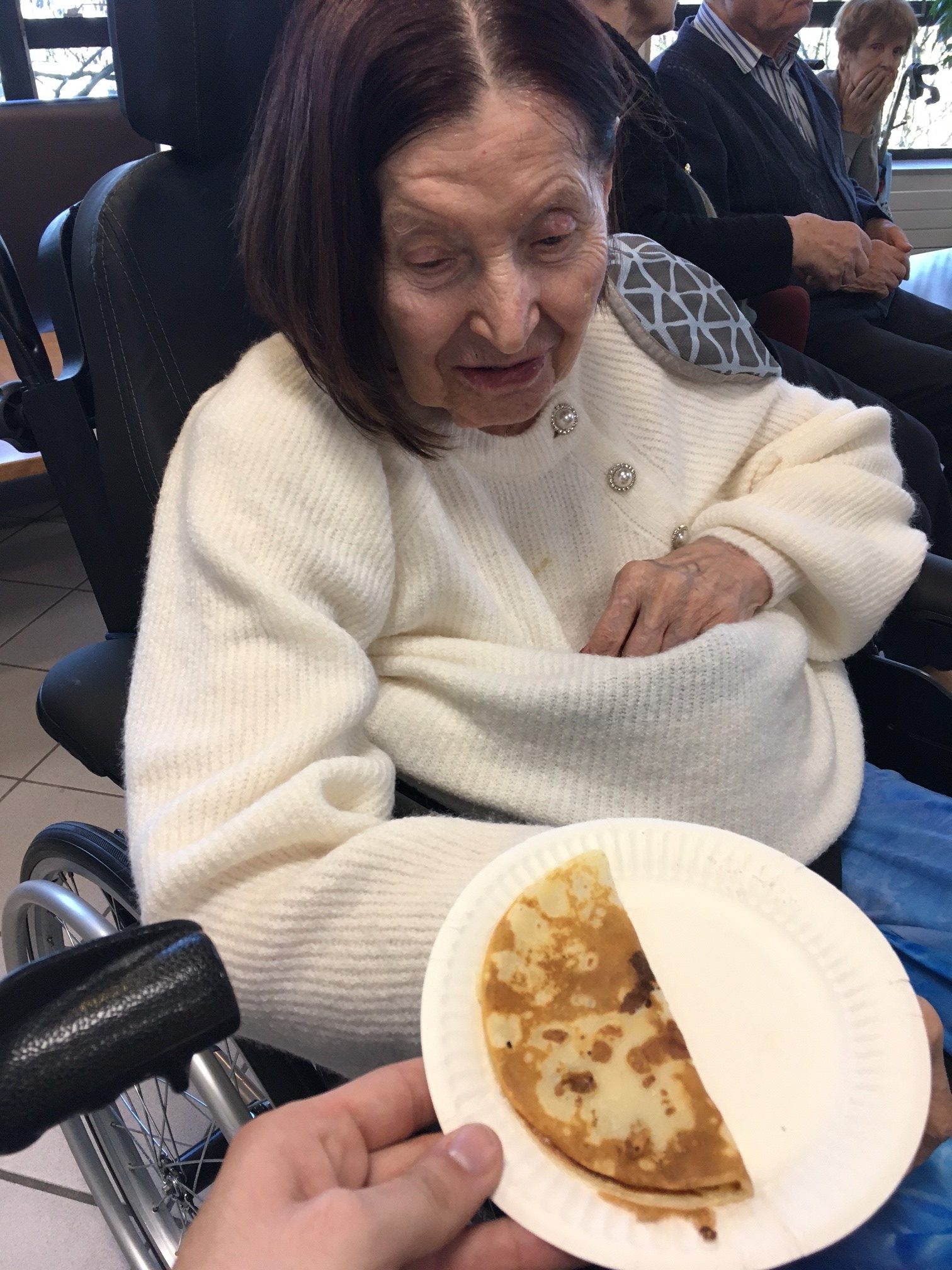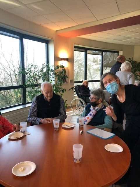 Nous nous sommes réunis vendredi 3 février pour fêter la chandeleur. Très nombreux dans le salon du Framboisier, l’ambiance était au rendez-vous avec de la musique française en fond sonore. Les crêpes ont été cuites par Elisabeth qui en a fait une centaine en chantant et en dansant. Le service a été réalisé par Chloé et Feyza, les deux jeunes filles en service civique. La pâte avait été préparée le matin pour un groupe de résidents. Un moment convivial qui a réuni salariés, familles et résidents pour trinquer au cidre.