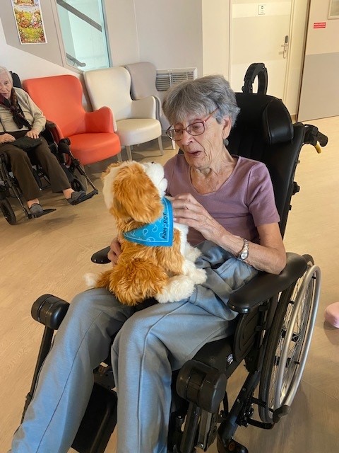 L’association Les Blouses Roses nous a offert des chats et chiens connectés pour le plus grand bonheur de plusieurs résidents.