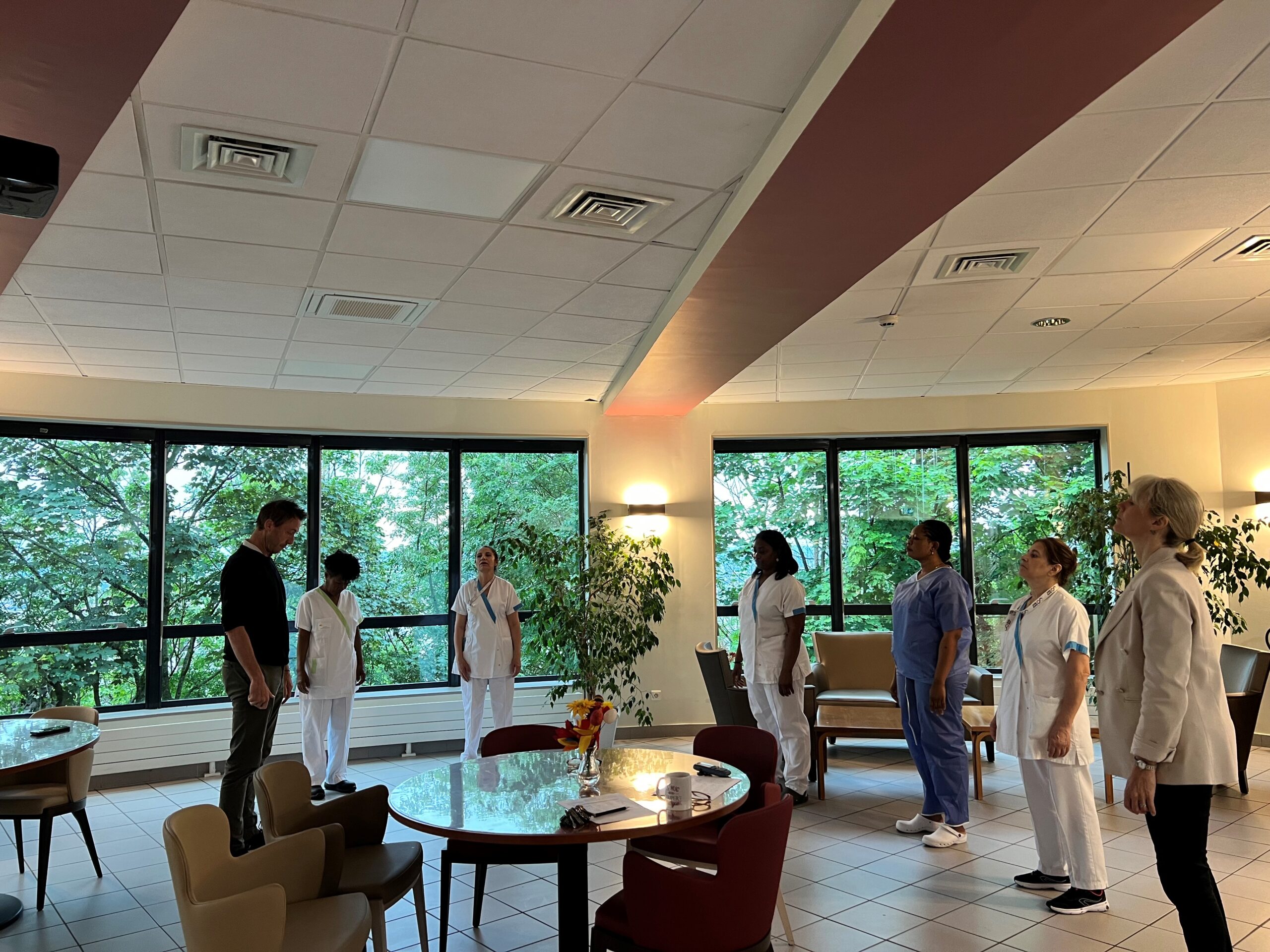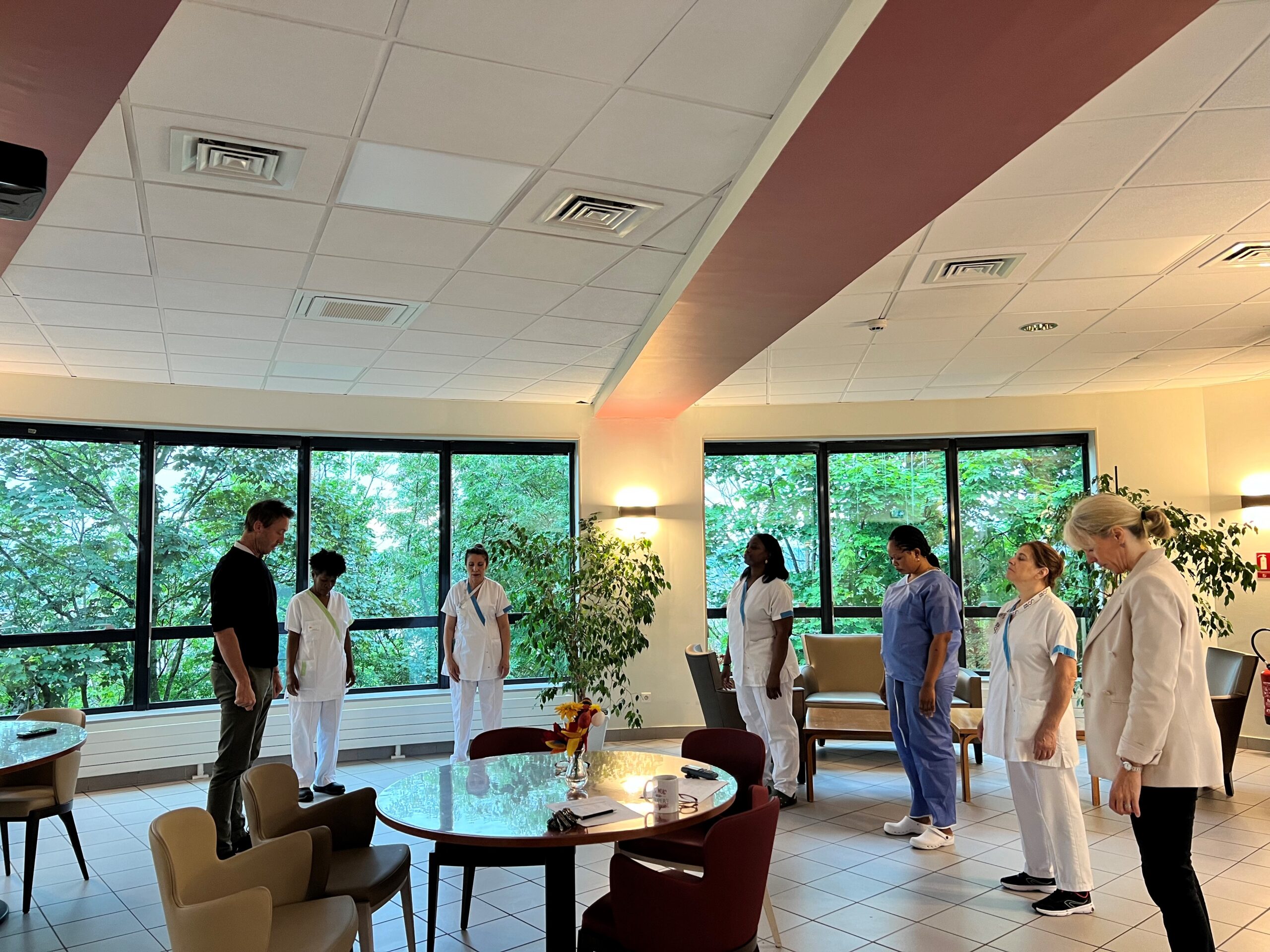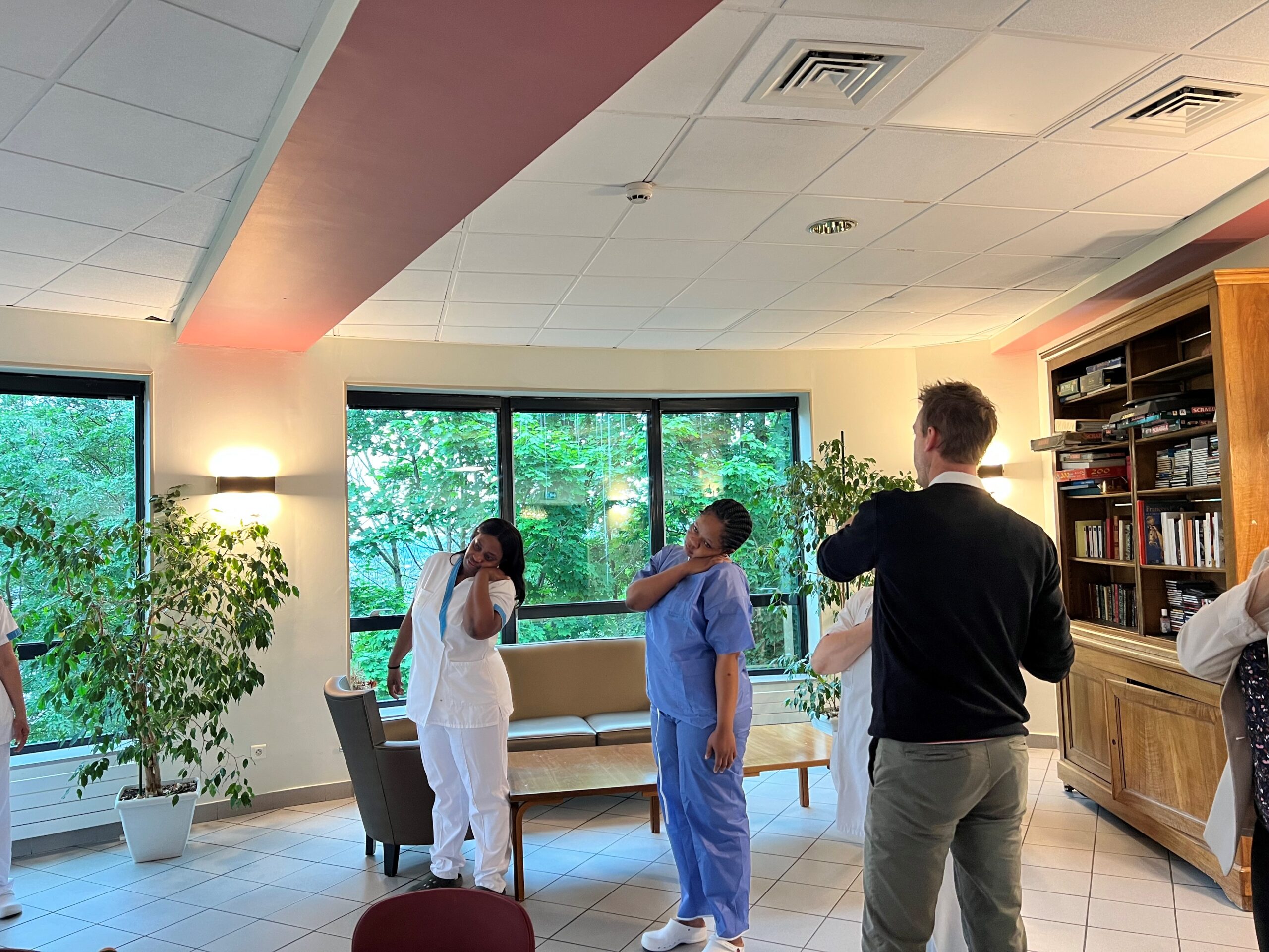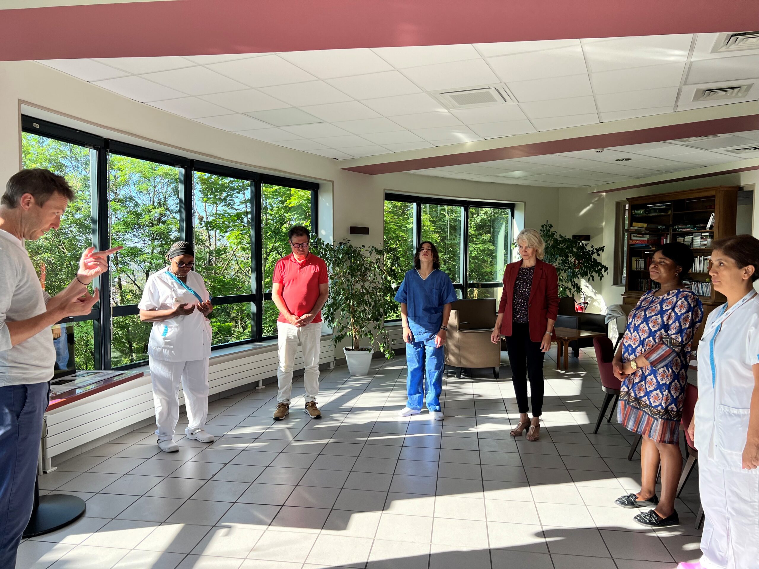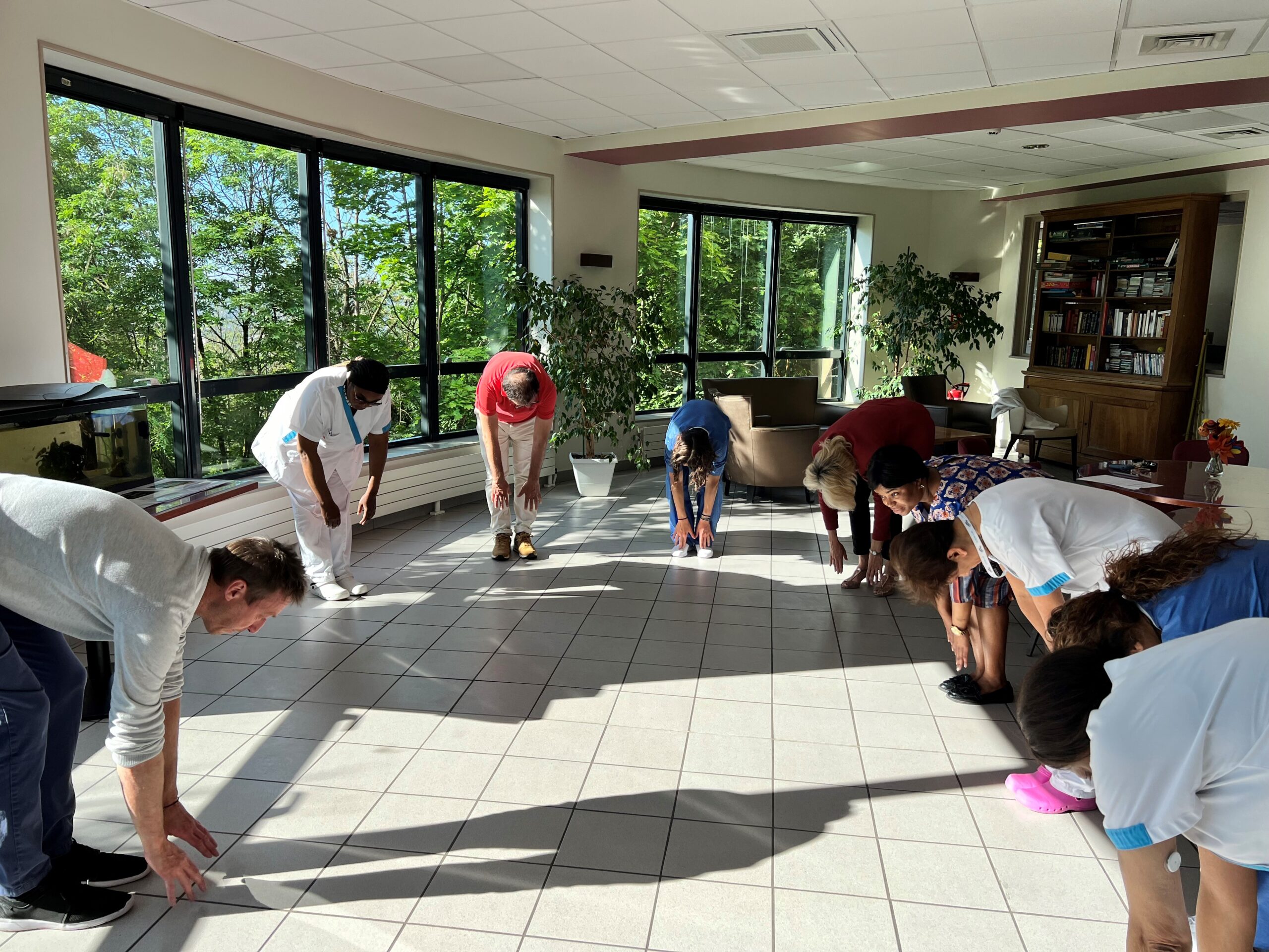 Dans le cadre de la QVCT (Qualité de Vie et des Conditions de Travail), les salariés des Amandines ont profité de cours d’étirements musculaires dispensés par M. CHAPOTTON, un des trois kinésithérapeutes intervenant dans l’établissement. L’adoption d’une position statique au travail, le stress, les tâches répétées, les manutentions manuelles de charges… toutes ces tâches pèsent sur le corps, créent des tensions, des raideurs et des douleurs qui peuvent être à l’origine de troubles musculosquelettiques. Les séances d’étirement permettent d’augmenter le flux sanguin qui nourrit les muscles et élimine les déchets musculaires, de diminuer les tensions musculaires, l’anxiété, le stress et la fatigue. Plus qu’apaiser le corps, s’accorder du temps pour s’étirer permet de stimuler le cerveau et d’optimiser la concentration au travail. Des cours d’étirements appréciés de tous !