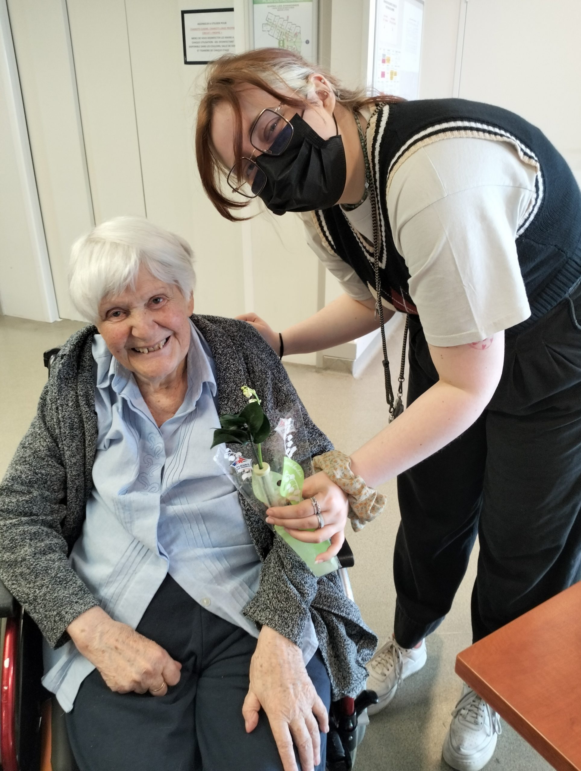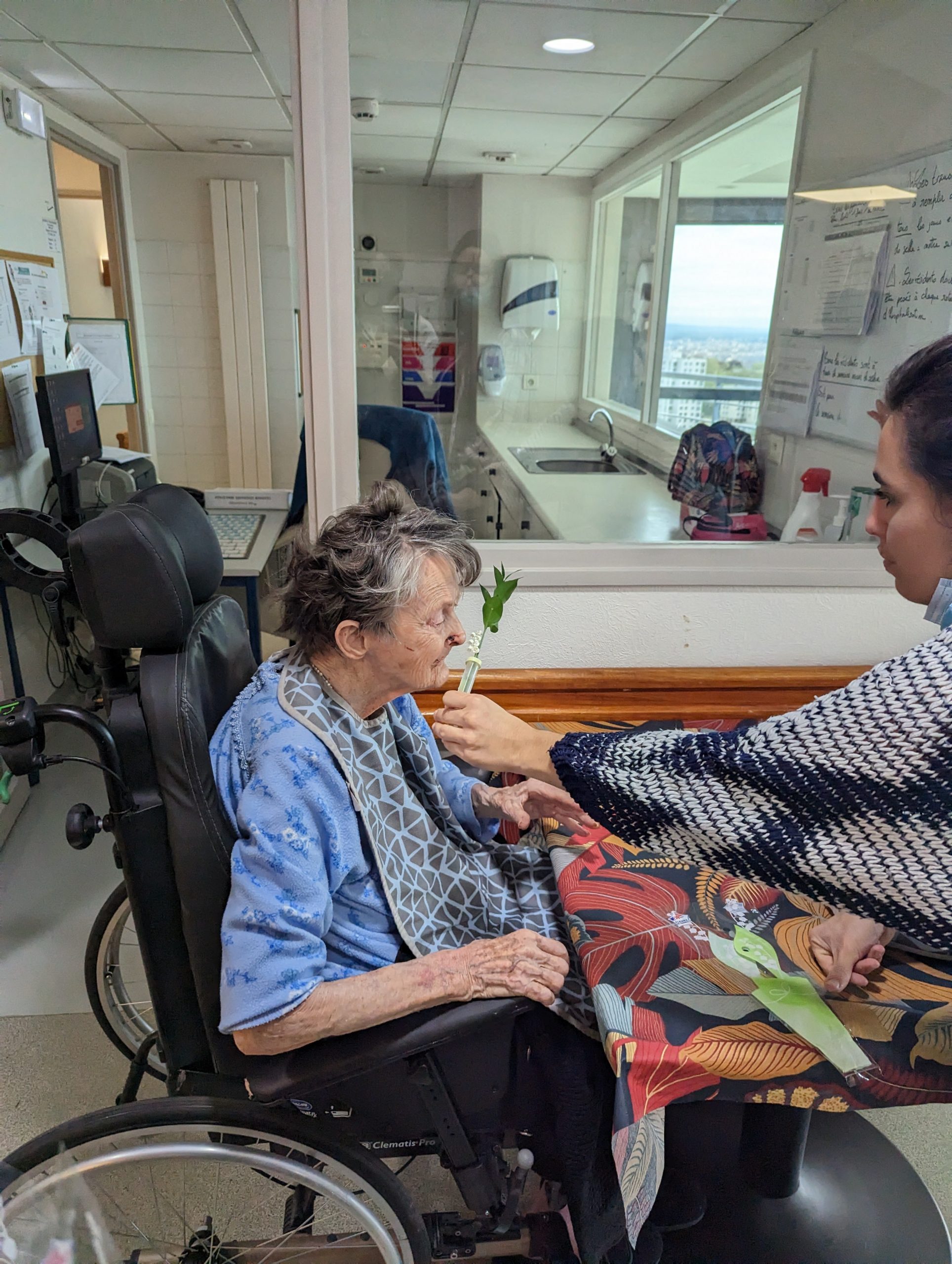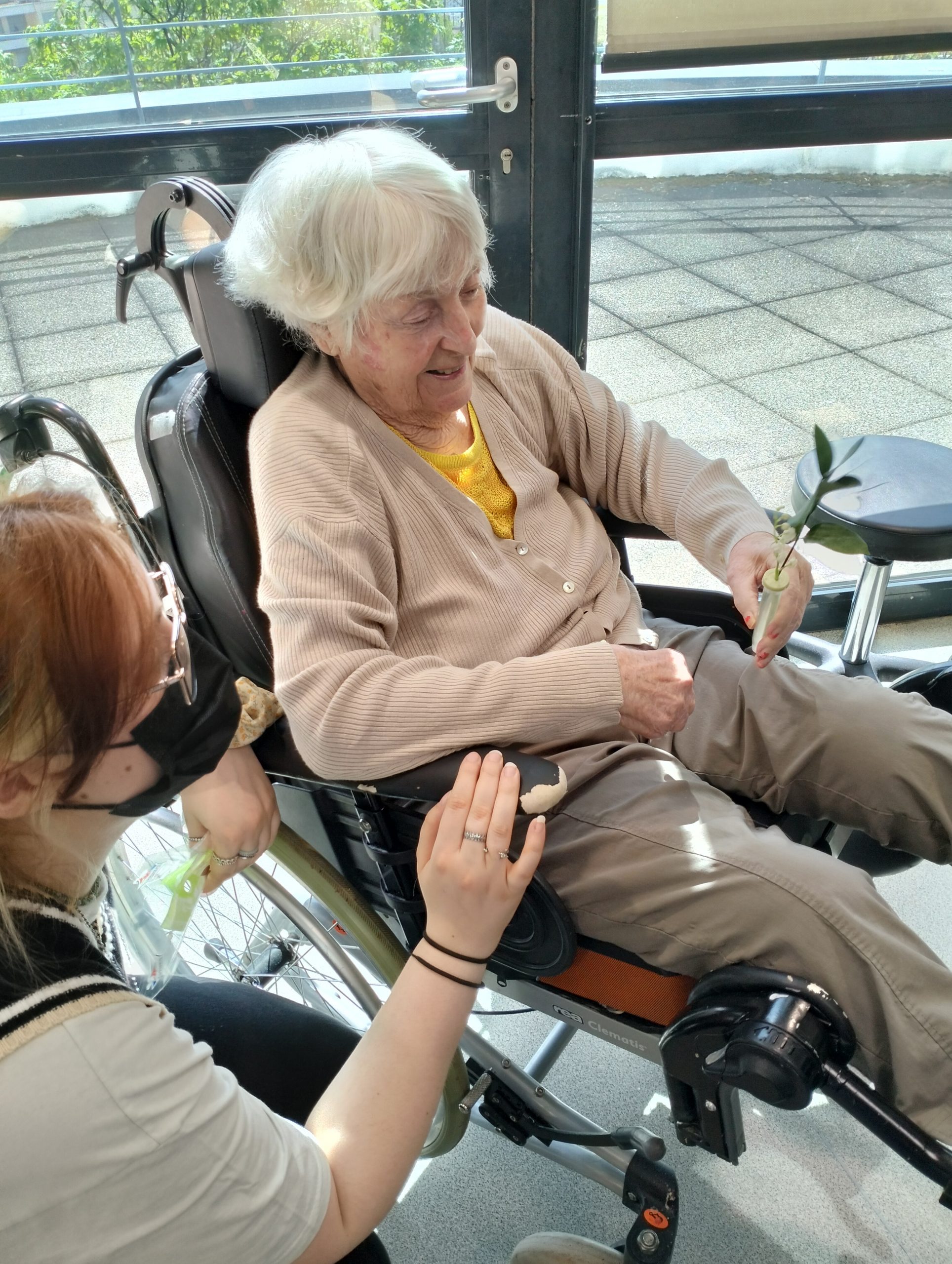 Vendredi 28 avril, une distribution de brins de muguet a été réalisée auprès des résidents par les deux services civiques Chloé et Feyza et Clara. Les douces odeurs du muguet ont égayé les résidents pour fêter le 1er mai en avance. Un moment de discussion et de convivialité dans la maison qui a ravi les résidents.