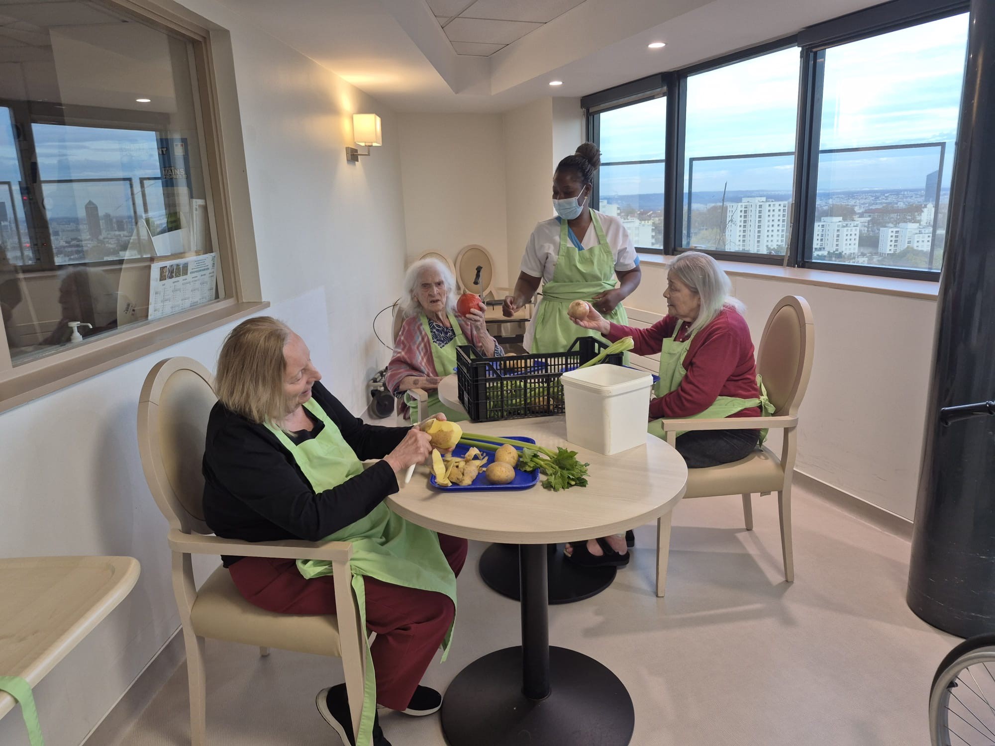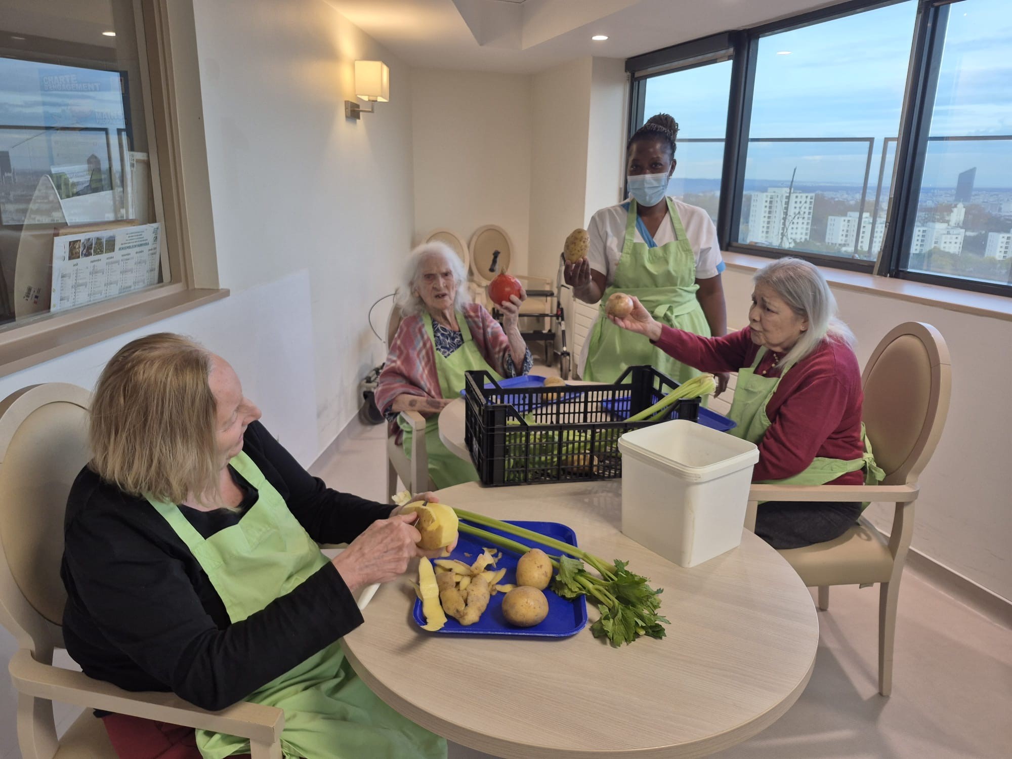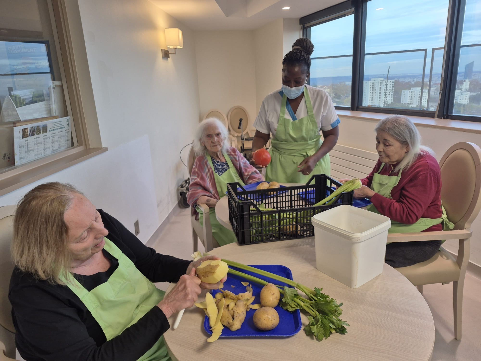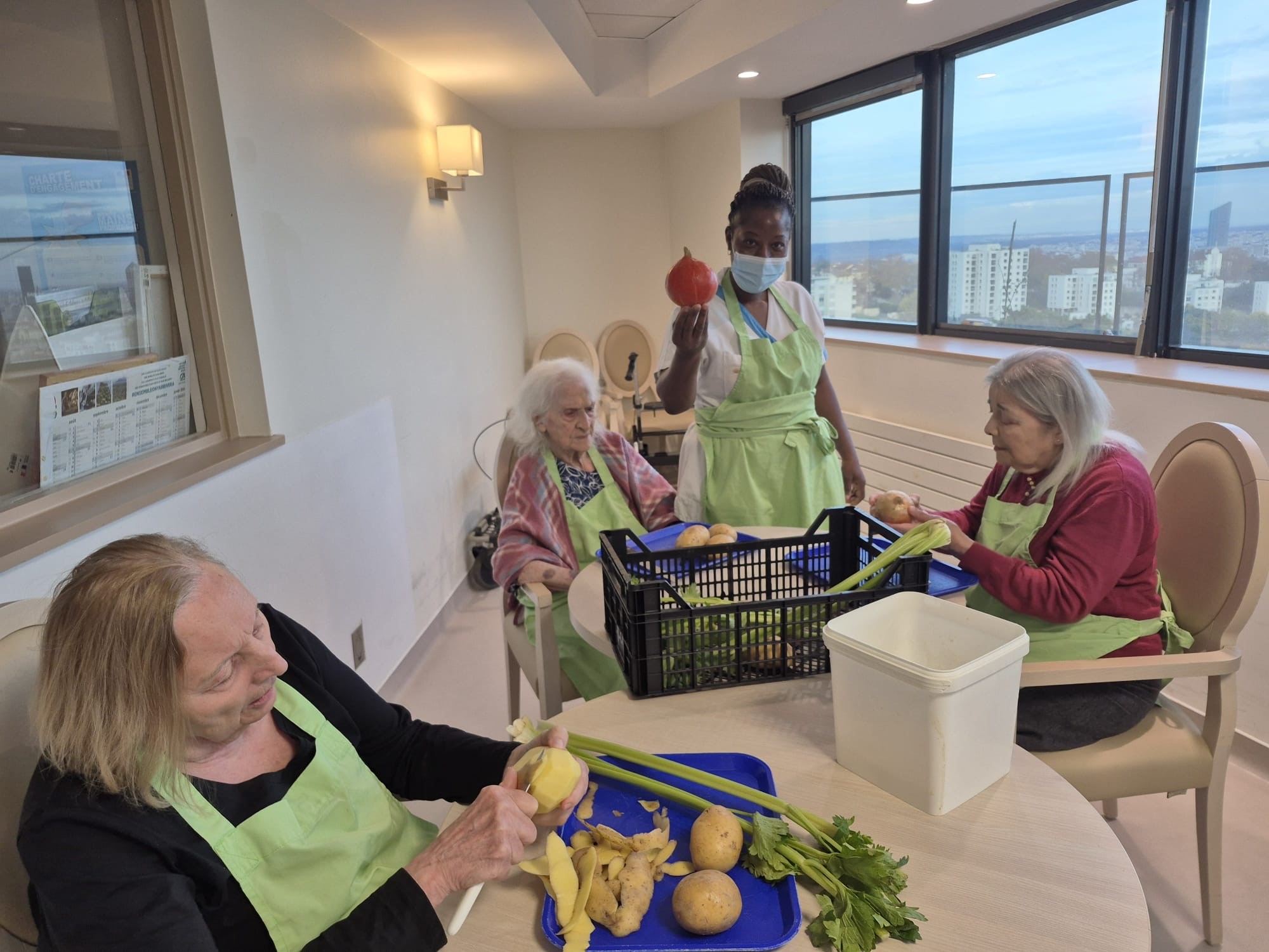 Eplucher, laver, couper, mélanger… chacun participe selon ses capacités, accompagnés par les soignants de l’étage. Ces gestes du quotidien, familiers pour beaucoup, permettent de raviver des souvenirs et de redonner une place active aux résidents dans la vie collective. L’odeur des légumes, le bruit des ustensiles et l’ambiance de la cuisine contribuent à créer une atmosphère chaleureuse et rassurante.