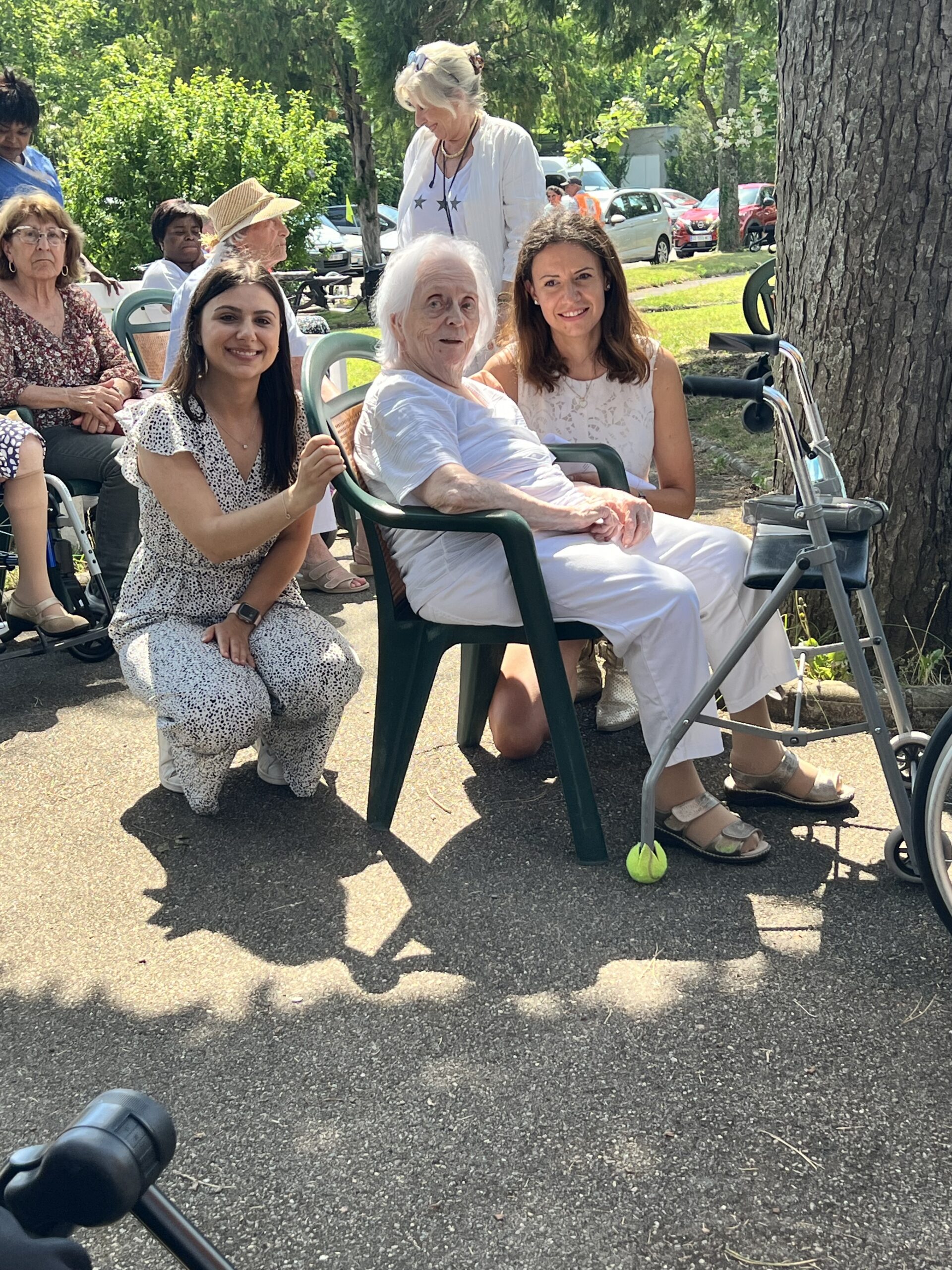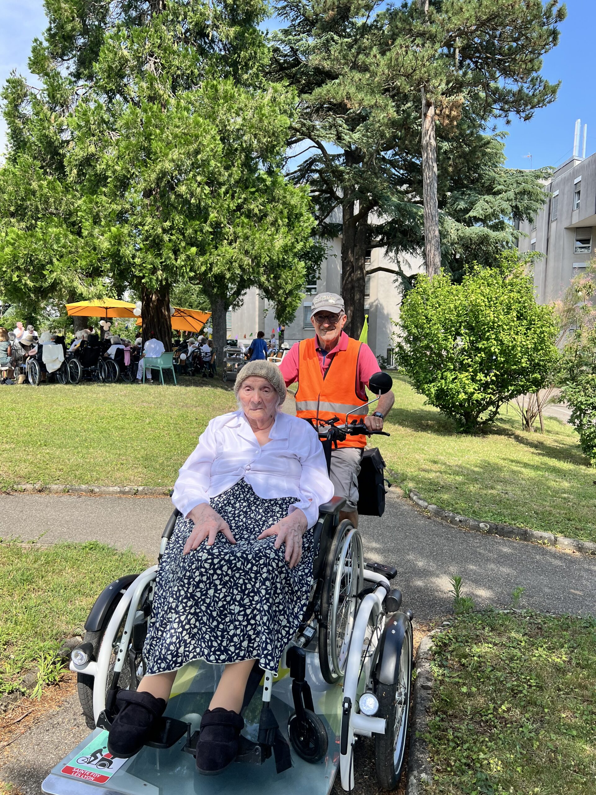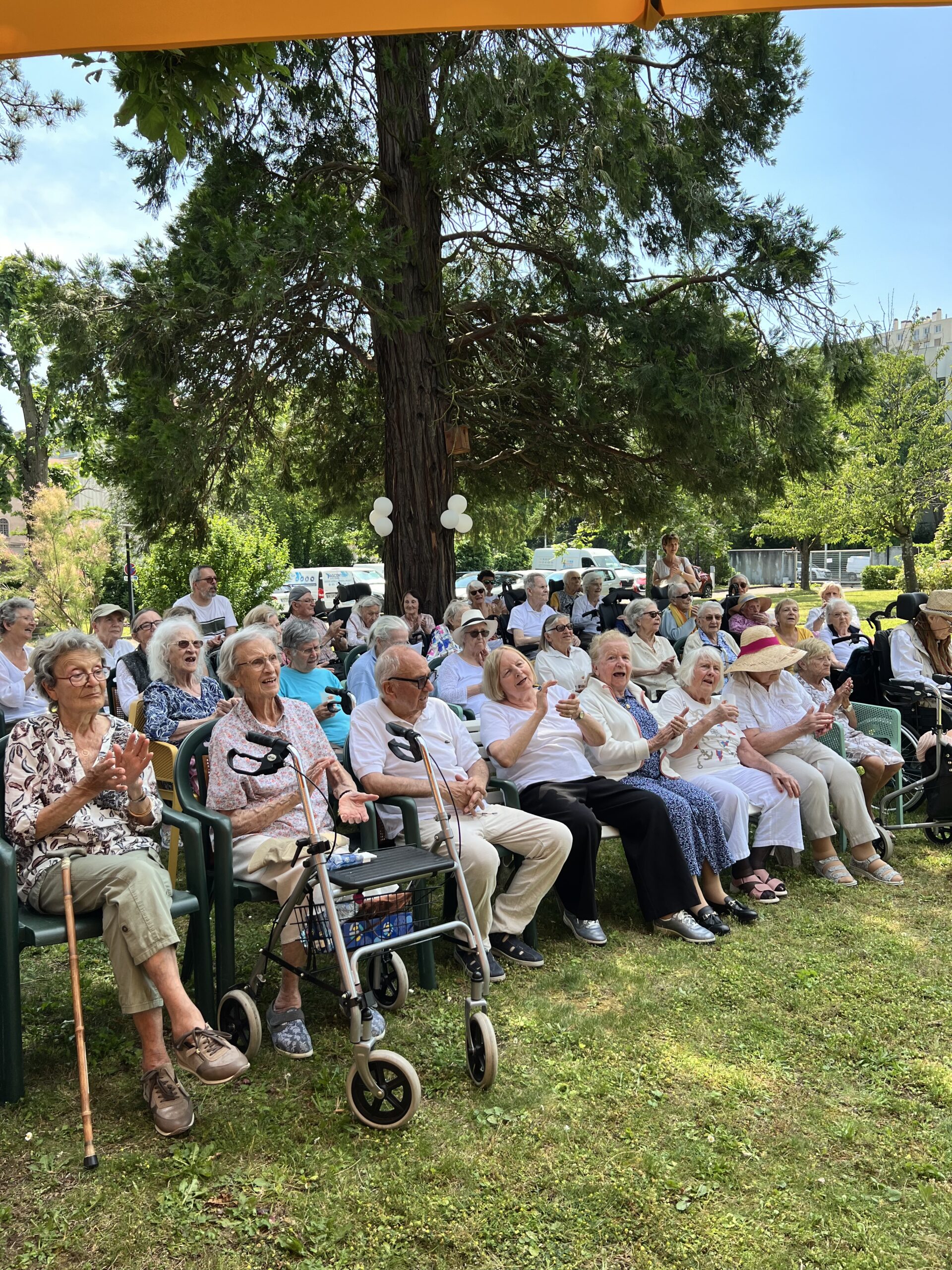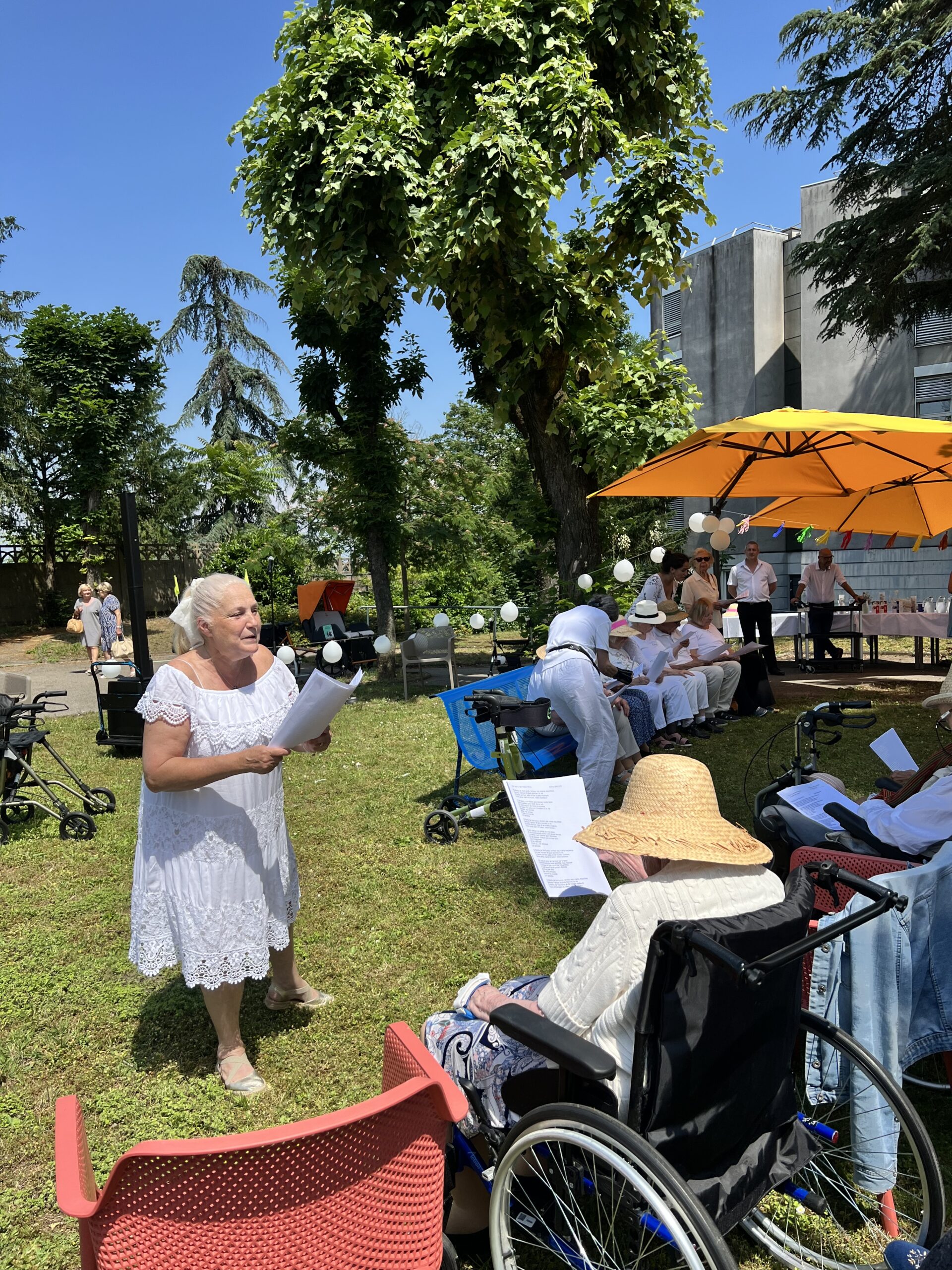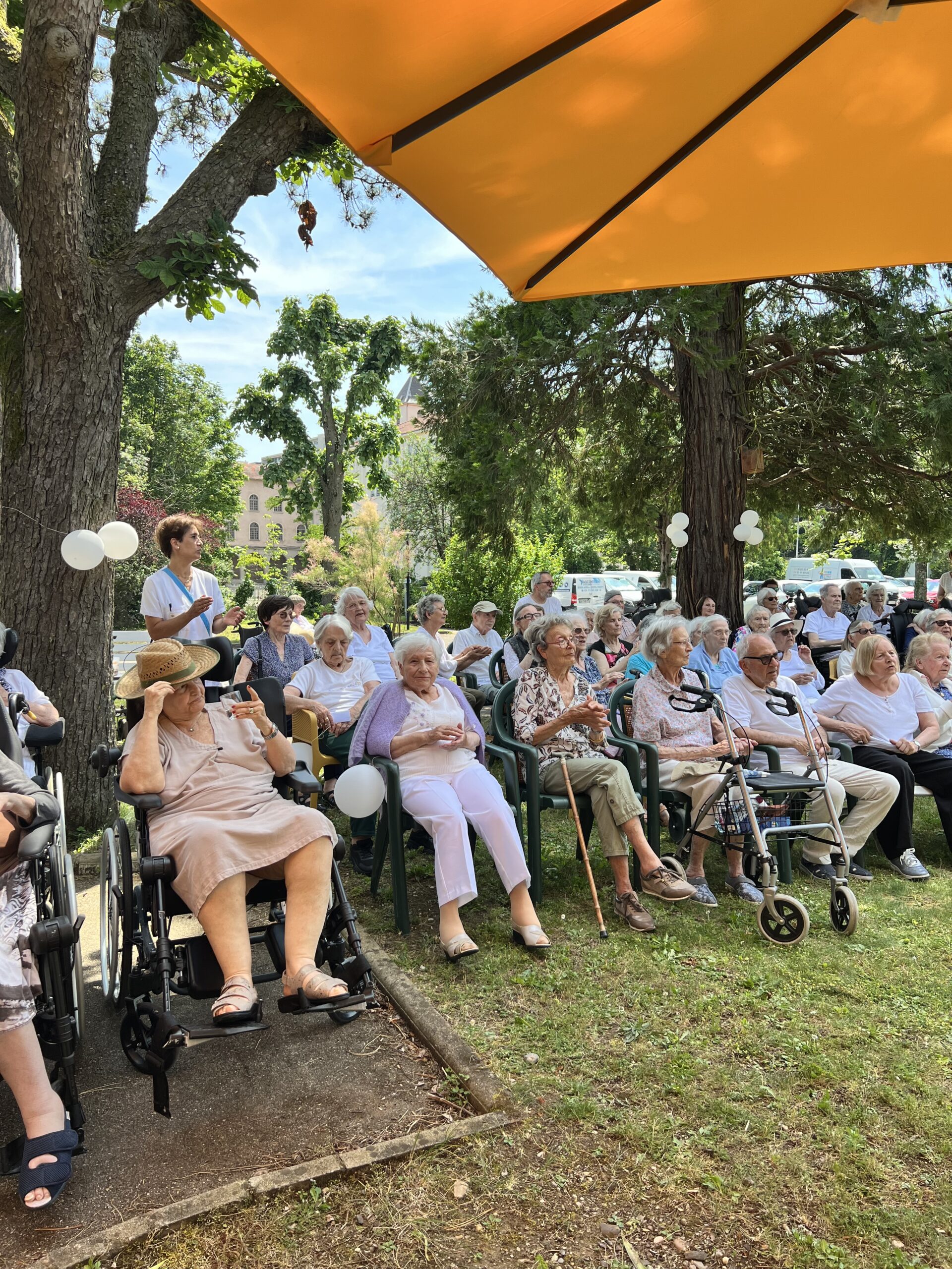 Pour notre fête de l’été, un chanteur apprécié des résidents Nicolas Reyno est venu animer l’après-midi avec des medleys de chansons françaises des années 60-80. Code couleur blanc cette année. Les familles, résidents et salariés ont joué le jeu ce qui a donné un rendu très sympa. Nous avons invité à cette fête, les bénévoles de l’association A vélo sans âge pour proposer des balades à vélo dans le parc sur l’après-midi aux résidents et familles. Pour le goûter, salades de fruits et glaces proposées à tout le monde, ce qui a ravi les gourmands.
