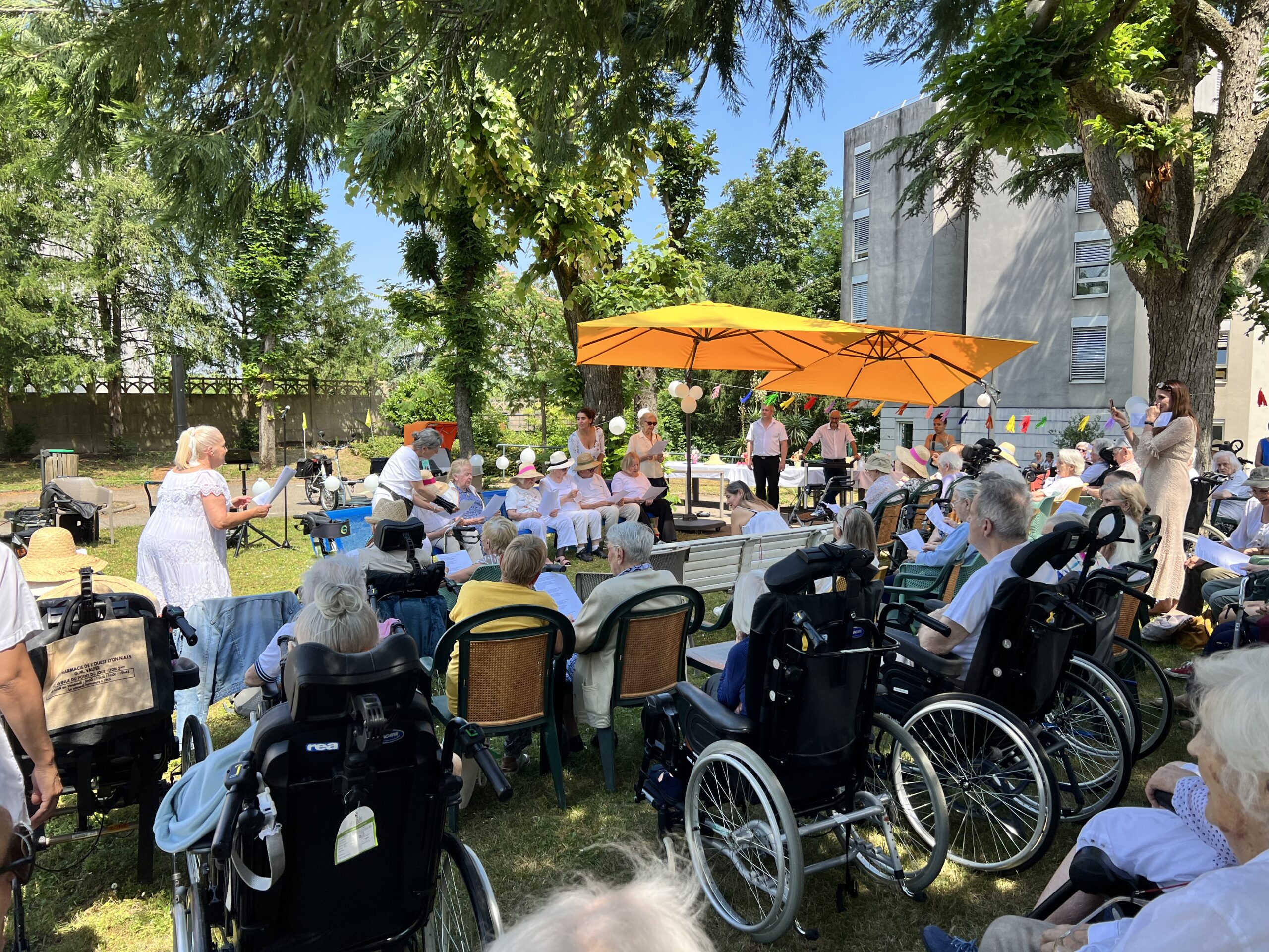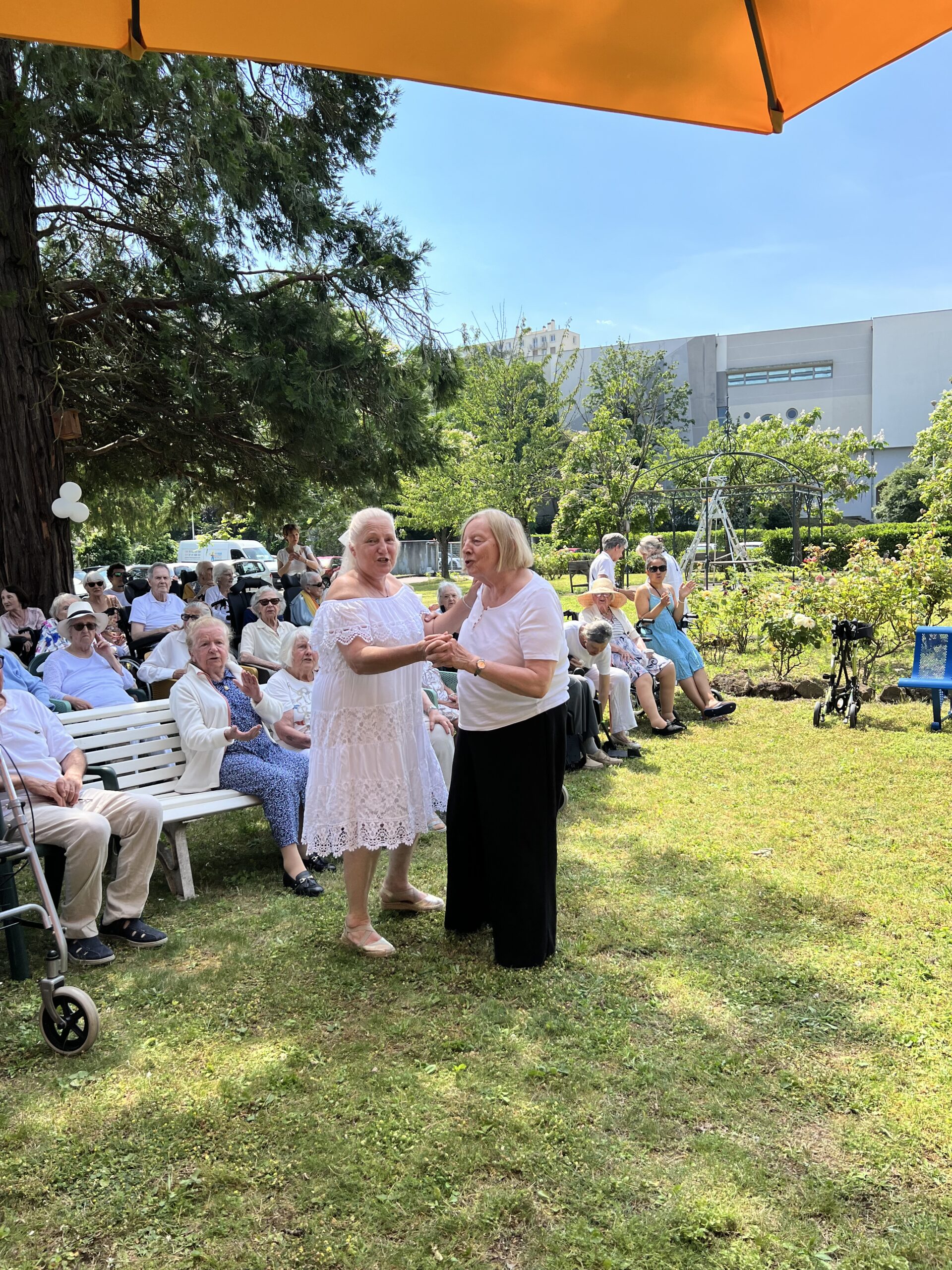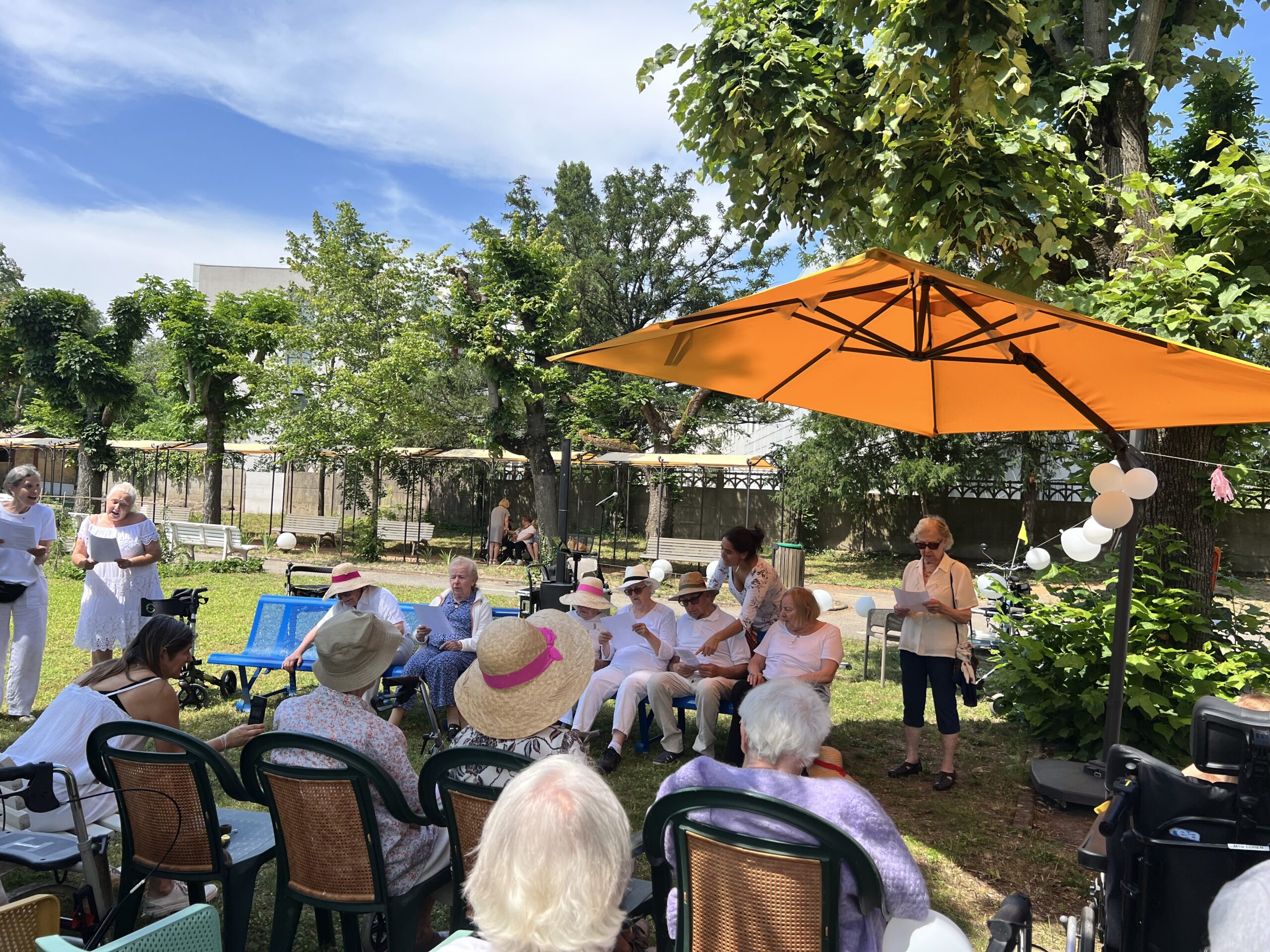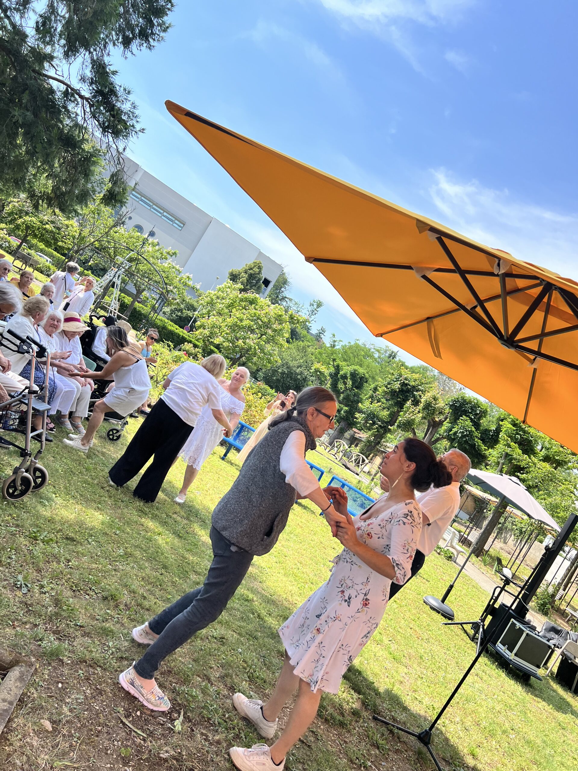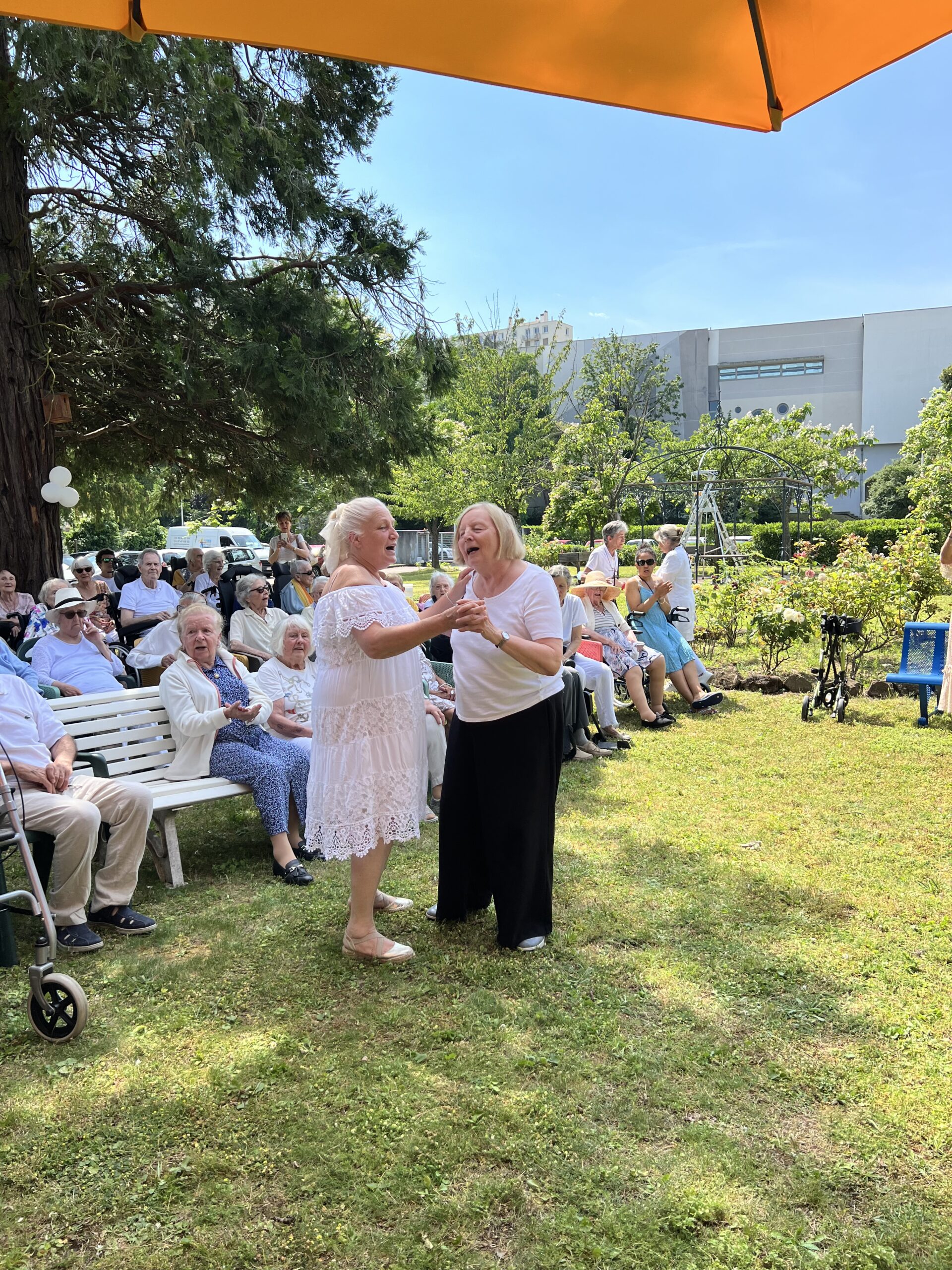 Pour notre fête de l’été, un chanteur apprécié des résidents Nicolas Reyno est venu animer l’après-midi avec des medleys de chansons françaises des années 60-80. Code couleur blanc cette année. Les familles, résidents et salariés ont joué le jeu ce qui a donné un rendu très sympa. Nous avons invité à cette fête, les bénévoles de l’association A vélo sans âge pour proposer des balades à vélo dans le parc sur l’après-midi aux résidents et familles. Pour le goûter, salades de fruits et glaces proposées à tout le monde, ce qui a ravi les gourmands.
