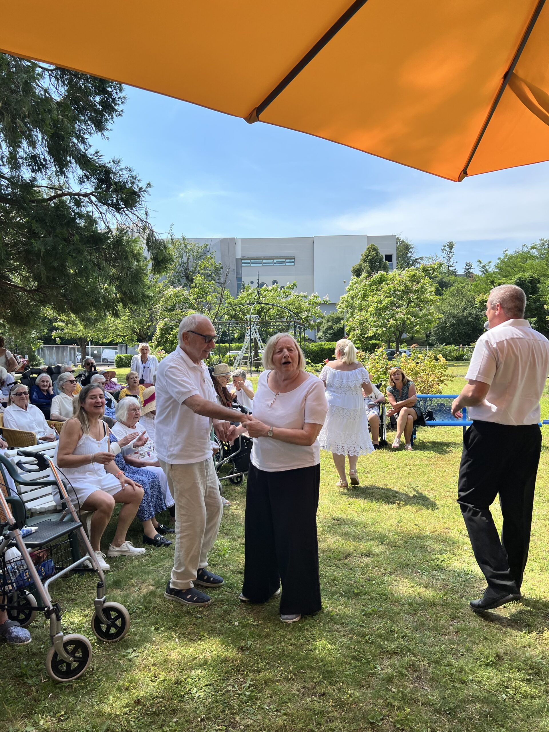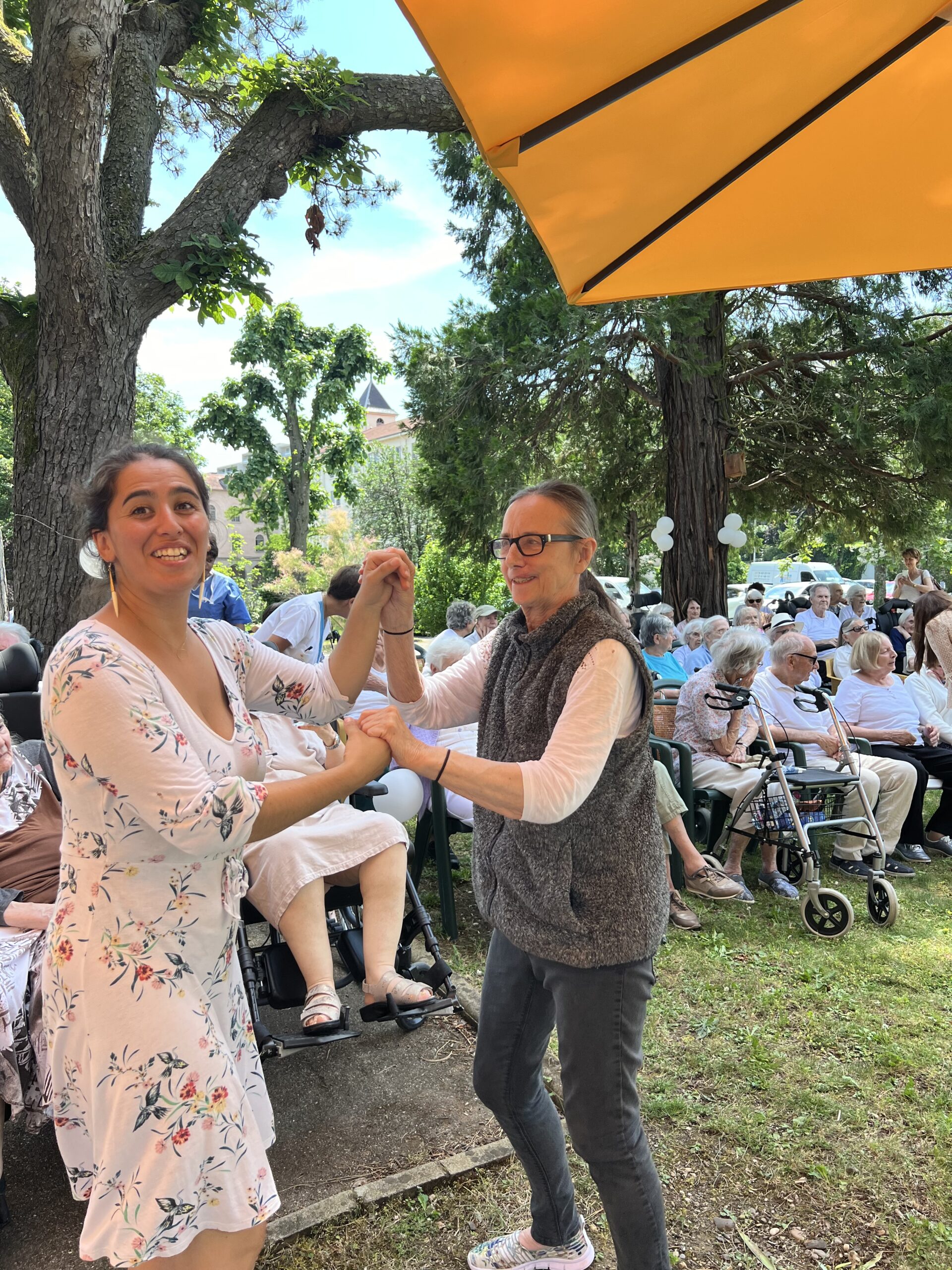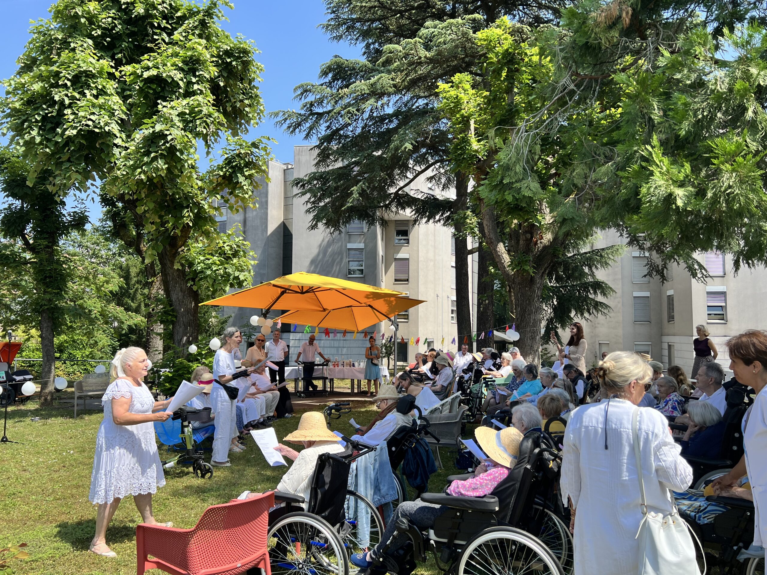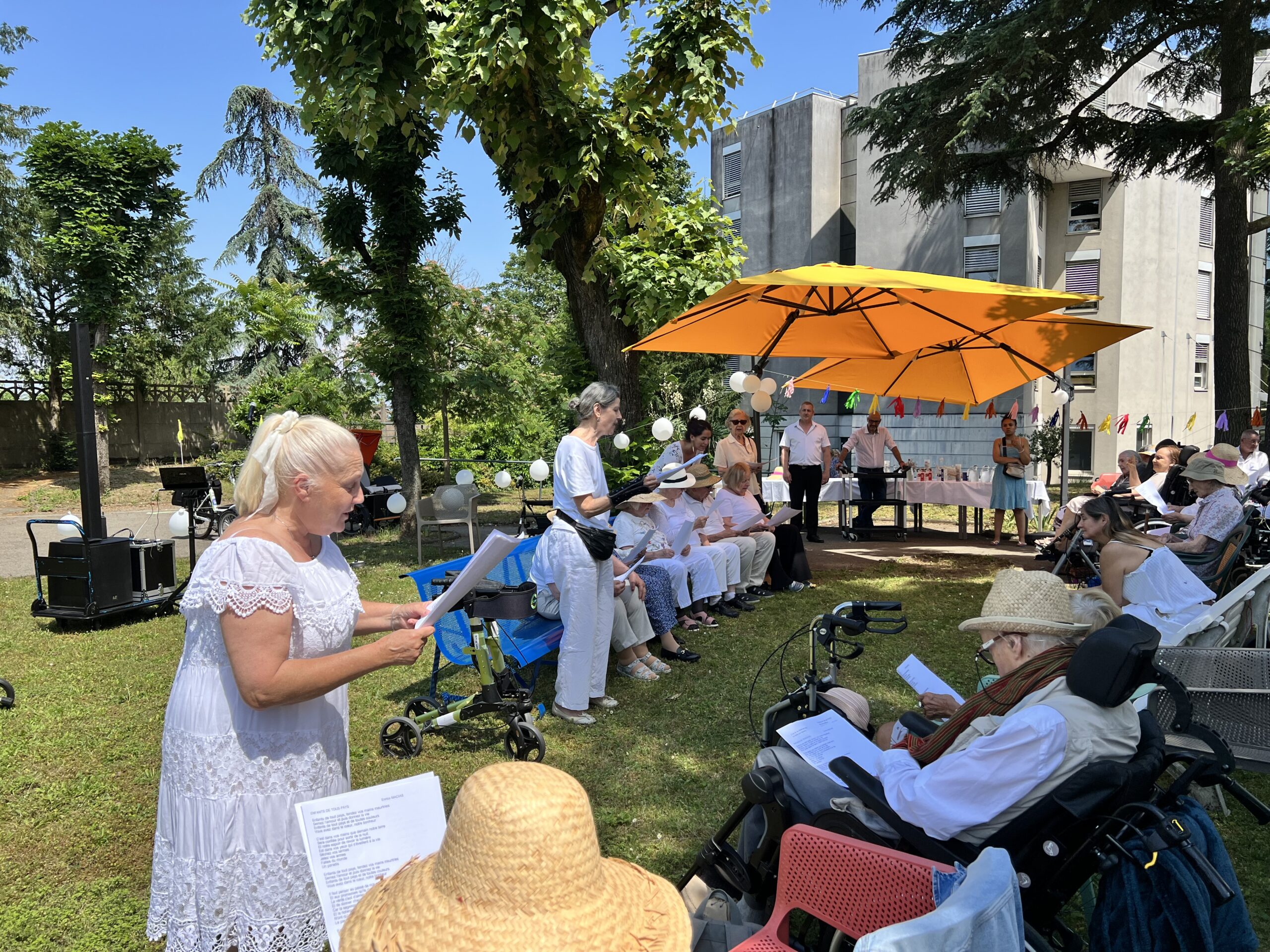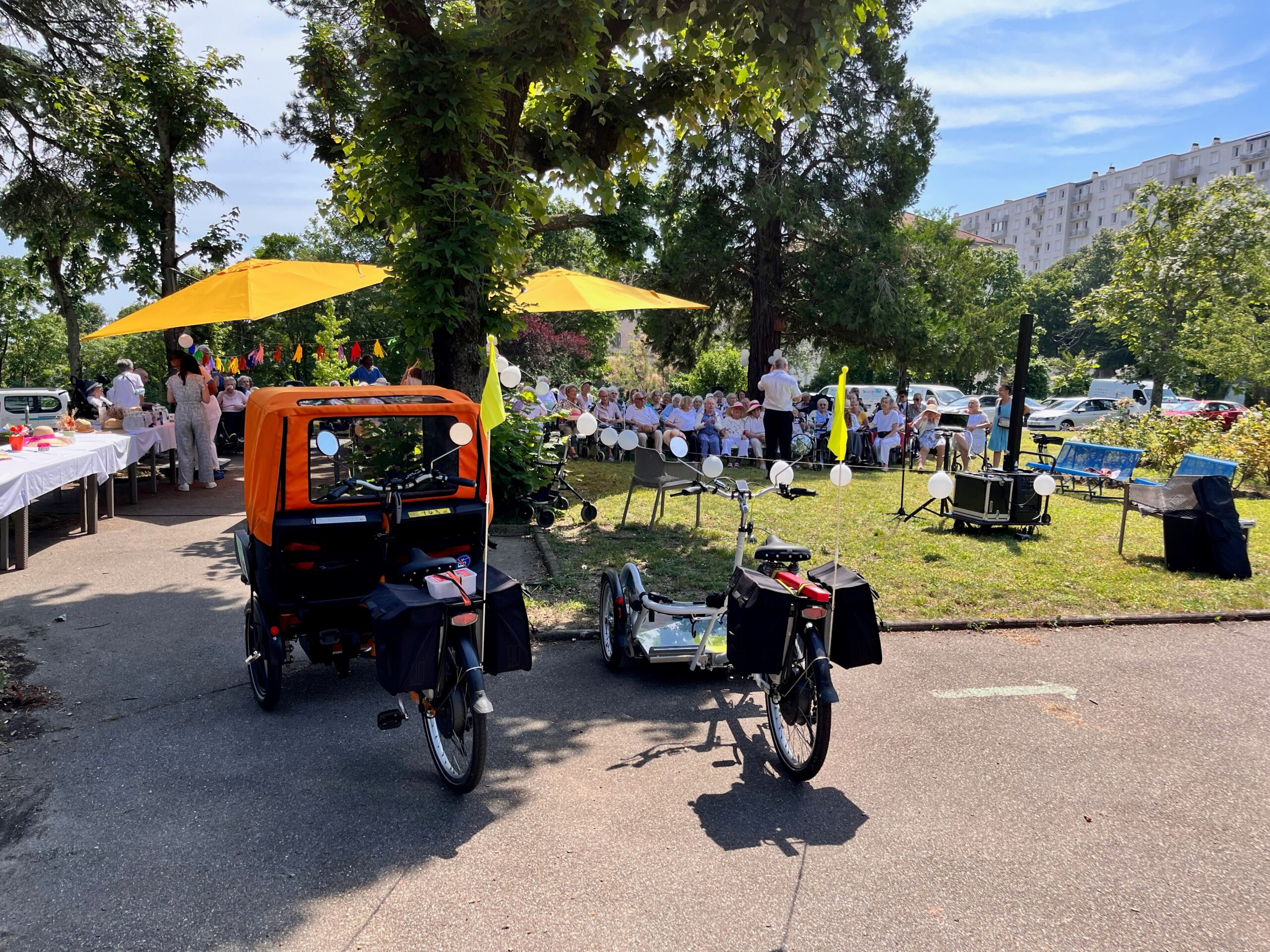 Pour notre fête de l’été, un chanteur apprécié des résidents Nicolas Reyno est venu animer l’après-midi avec des medleys de chansons françaises des années 60-80. Code couleur blanc cette année. Les familles, résidents et salariés ont joué le jeu ce qui a donné un rendu très sympa. Nous avons invité à cette fête, les bénévoles de l’association A vélo sans âge pour proposer des balades à vélo dans le parc sur l’après-midi aux résidents et familles. Pour le goûter, salades de fruits et glaces proposées à tout le monde, ce qui a ravi les gourmands.