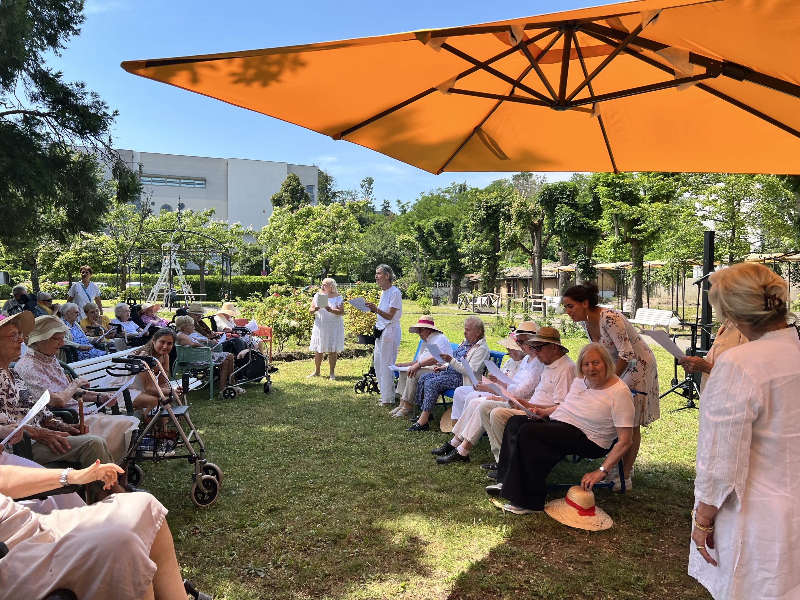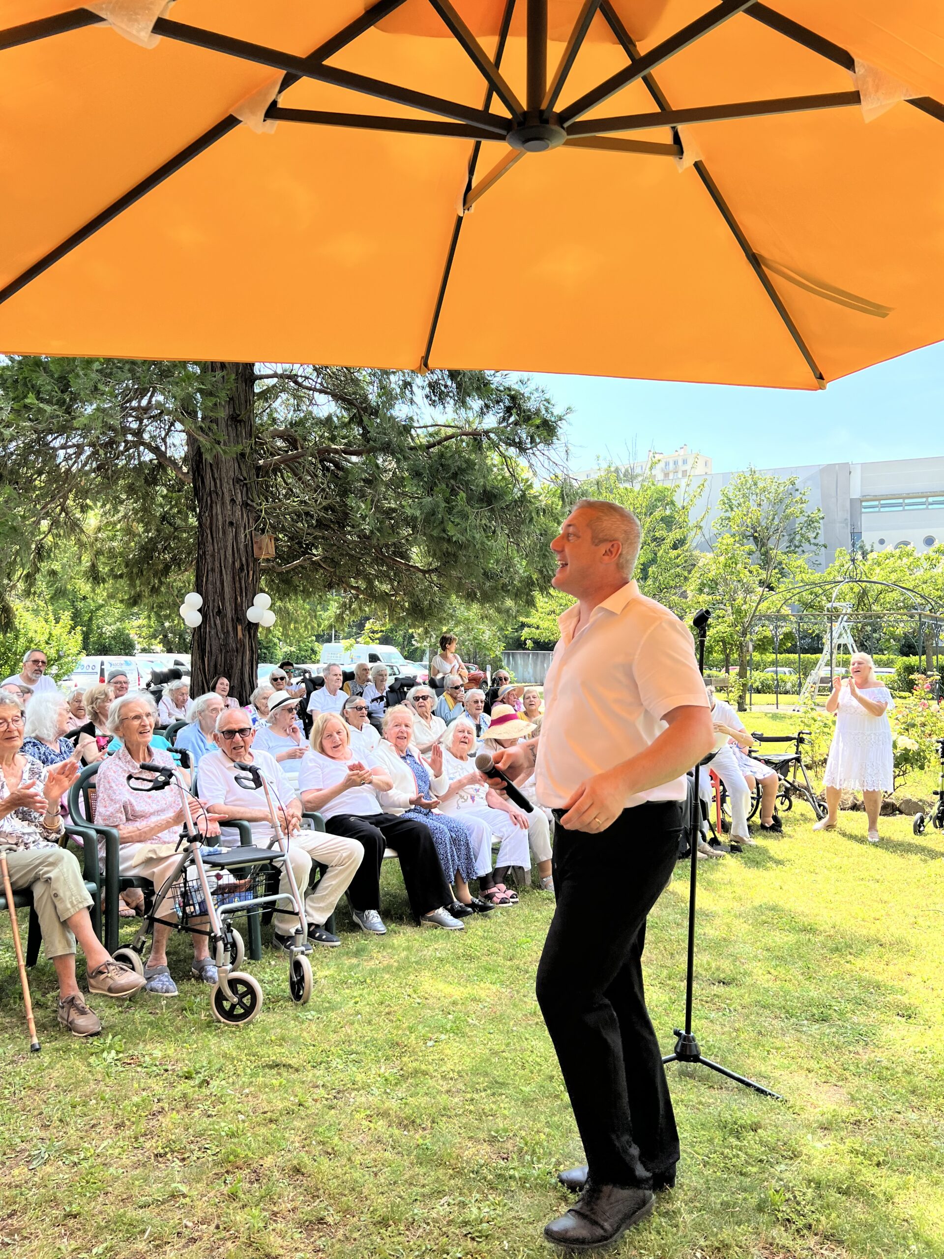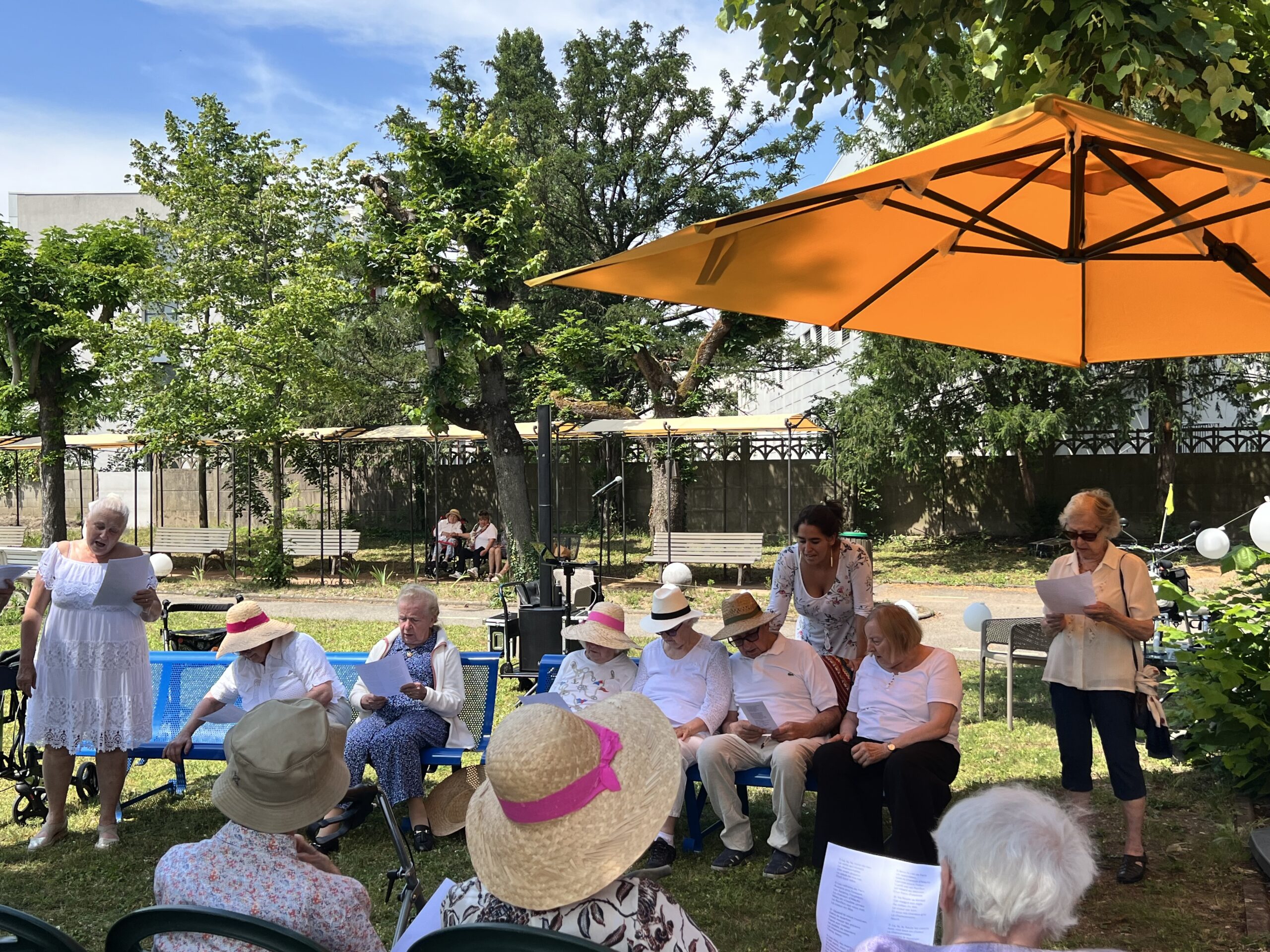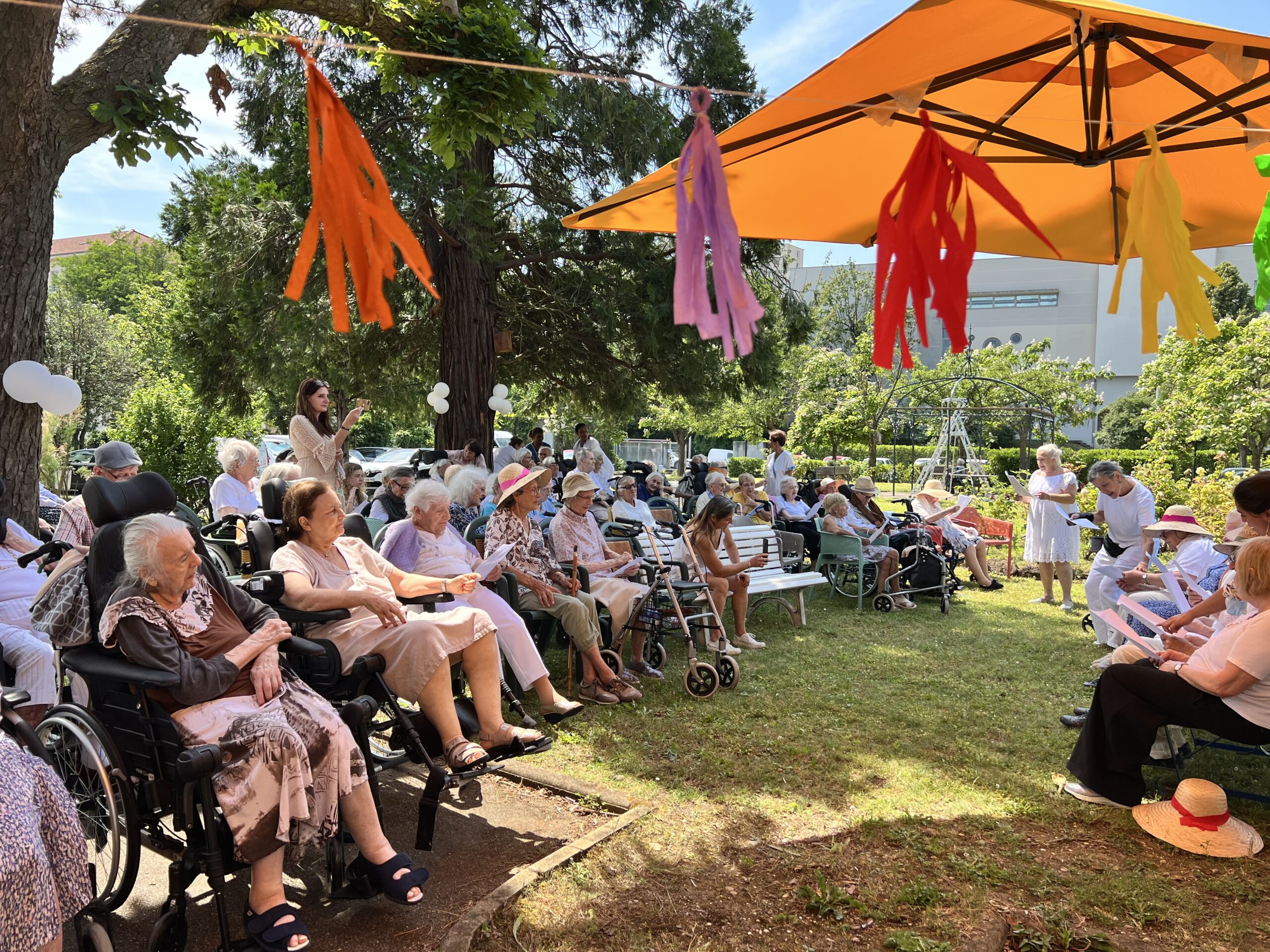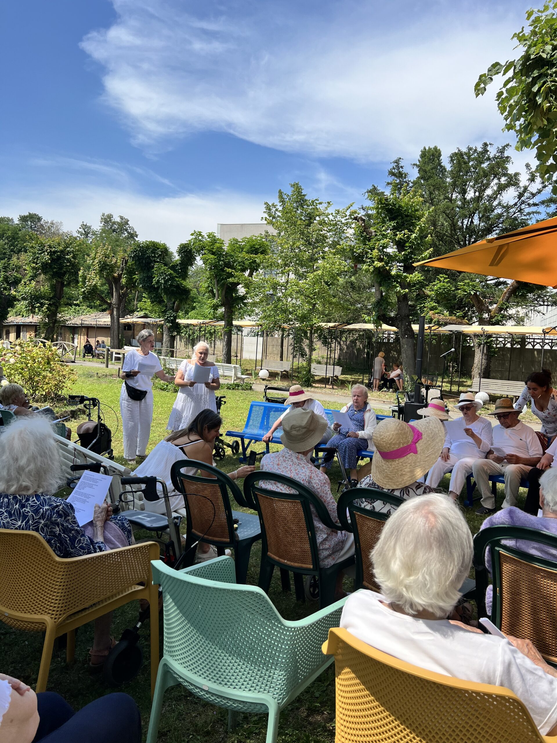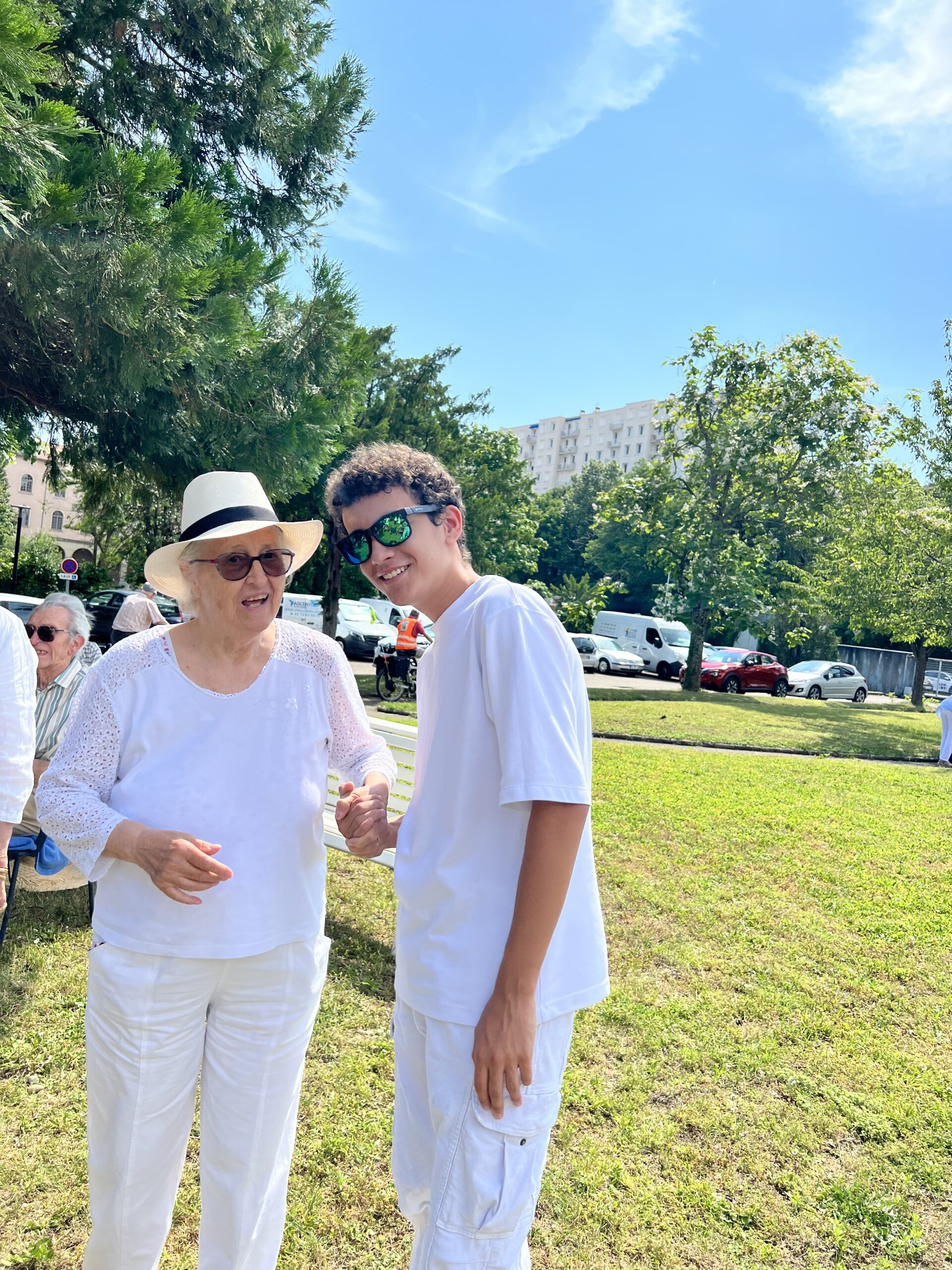 Pour notre fête de l’été, un chanteur apprécié des résidents Nicolas Reyno est venu animer l’après-midi avec des medleys de chansons françaises des années 60-80. Code couleur blanc cette année. Les familles, résidents et salariés ont joué le jeu ce qui a donné un rendu très sympa. Nous avons invité à cette fête, les bénévoles de l’association A vélo sans âge pour proposer des balades à vélo dans le parc sur l’après-midi aux résidents et familles. Pour le goûter, salades de fruits et glaces proposées à tout le monde, ce qui a ravi les gourmands.
