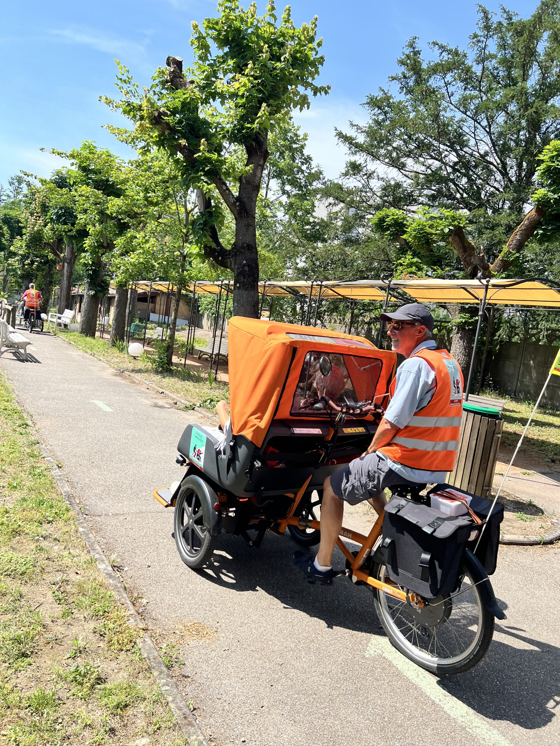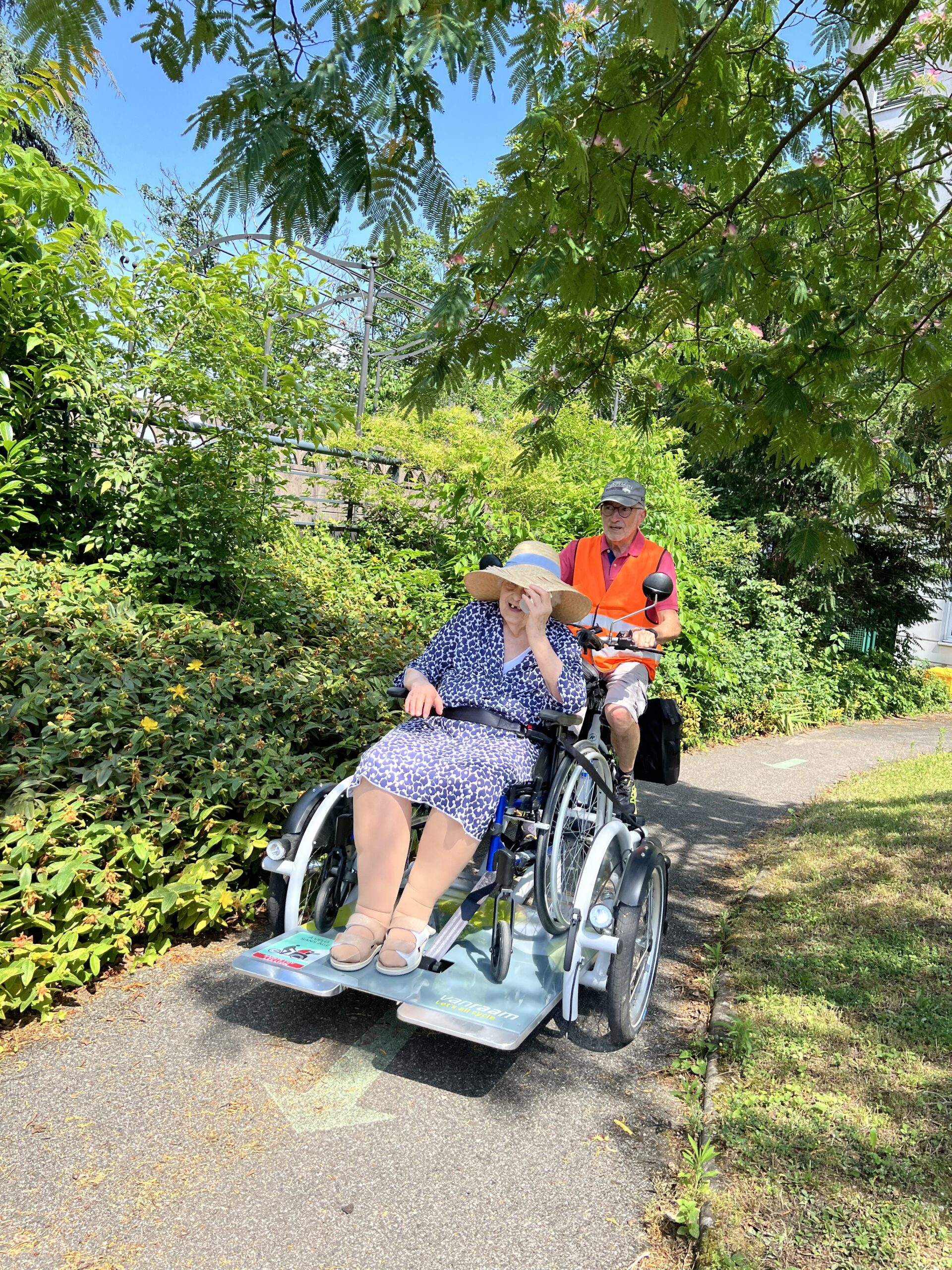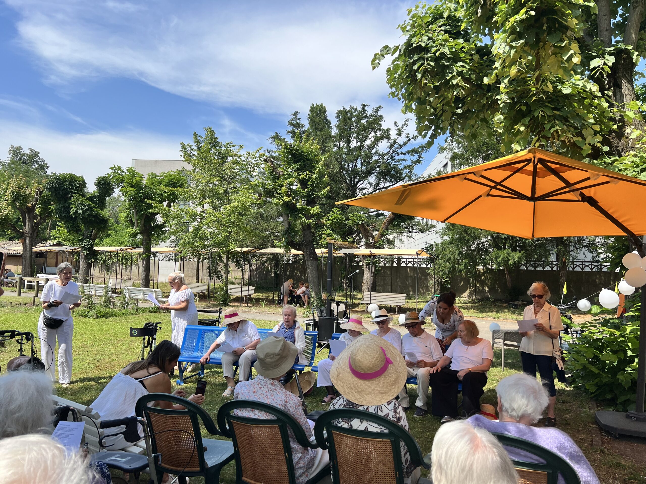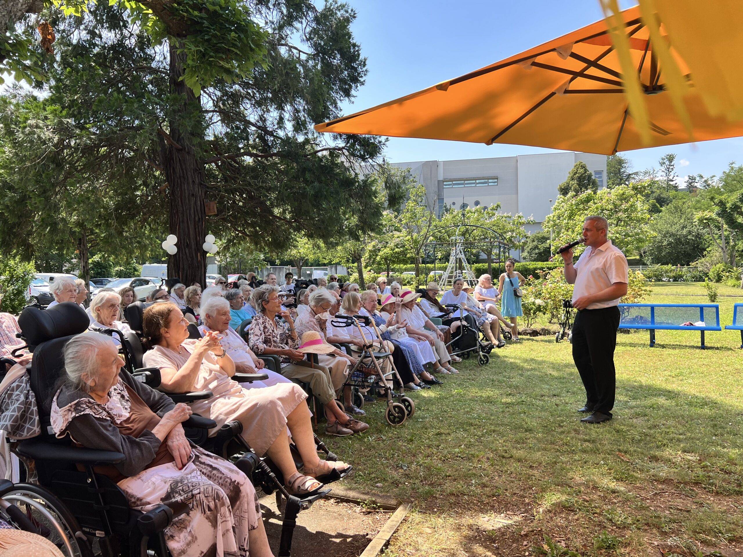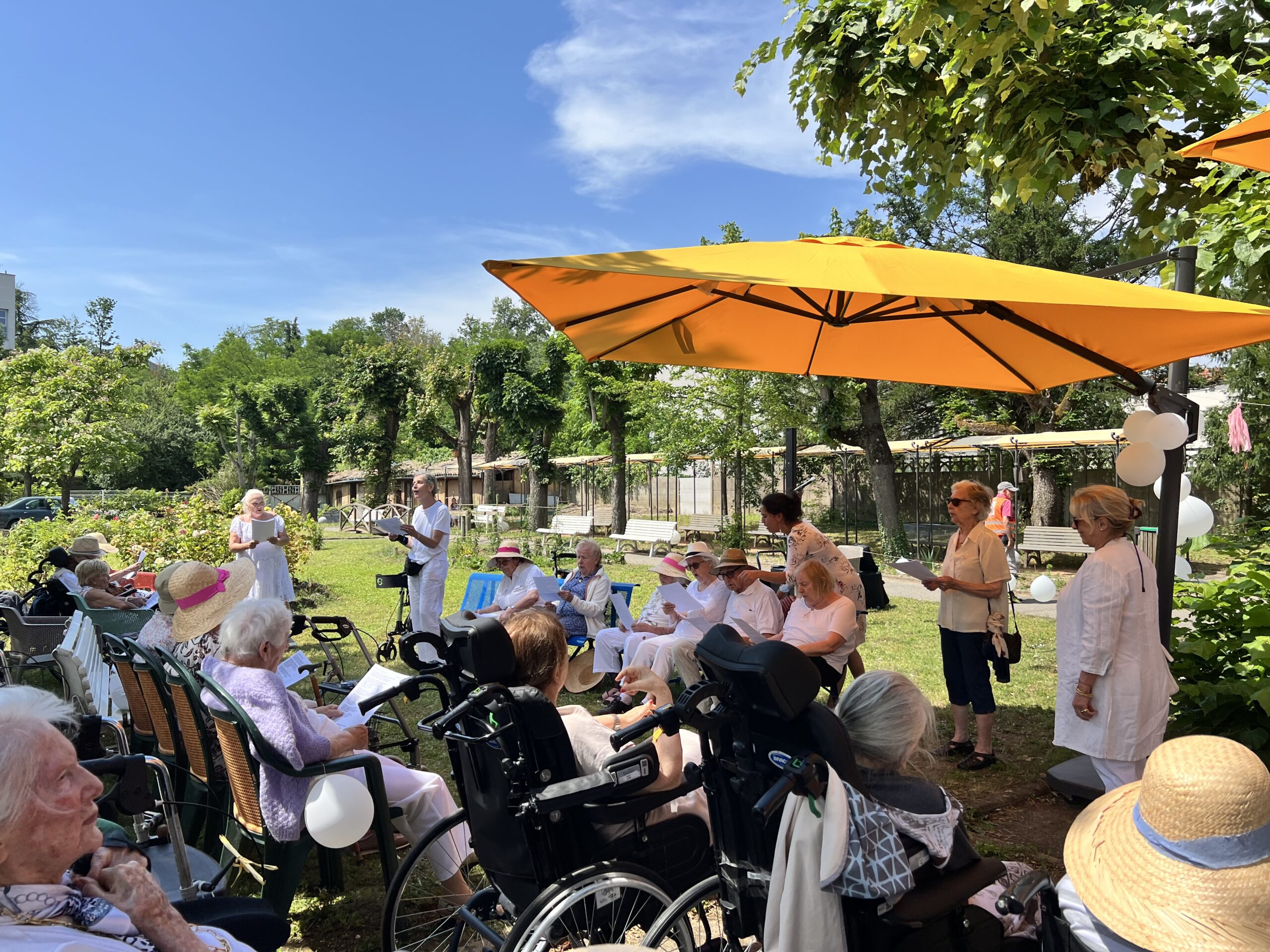 Pour notre fête de l’été, un chanteur apprécié des résidents Nicolas Reyno est venu animer l’après-midi avec des medleys de chansons françaises des années 60-80. Code couleur blanc cette année. Les familles, résidents et salariés ont joué le jeu ce qui a donné un rendu très sympa. Nous avons invité à cette fête, les bénévoles de l’association A vélo sans âge pour proposer des balades à vélo dans le parc sur l’après-midi aux résidents et familles. Pour le goûter, salades de fruits et glaces proposées à tout le monde, ce qui a ravi les gourmands.