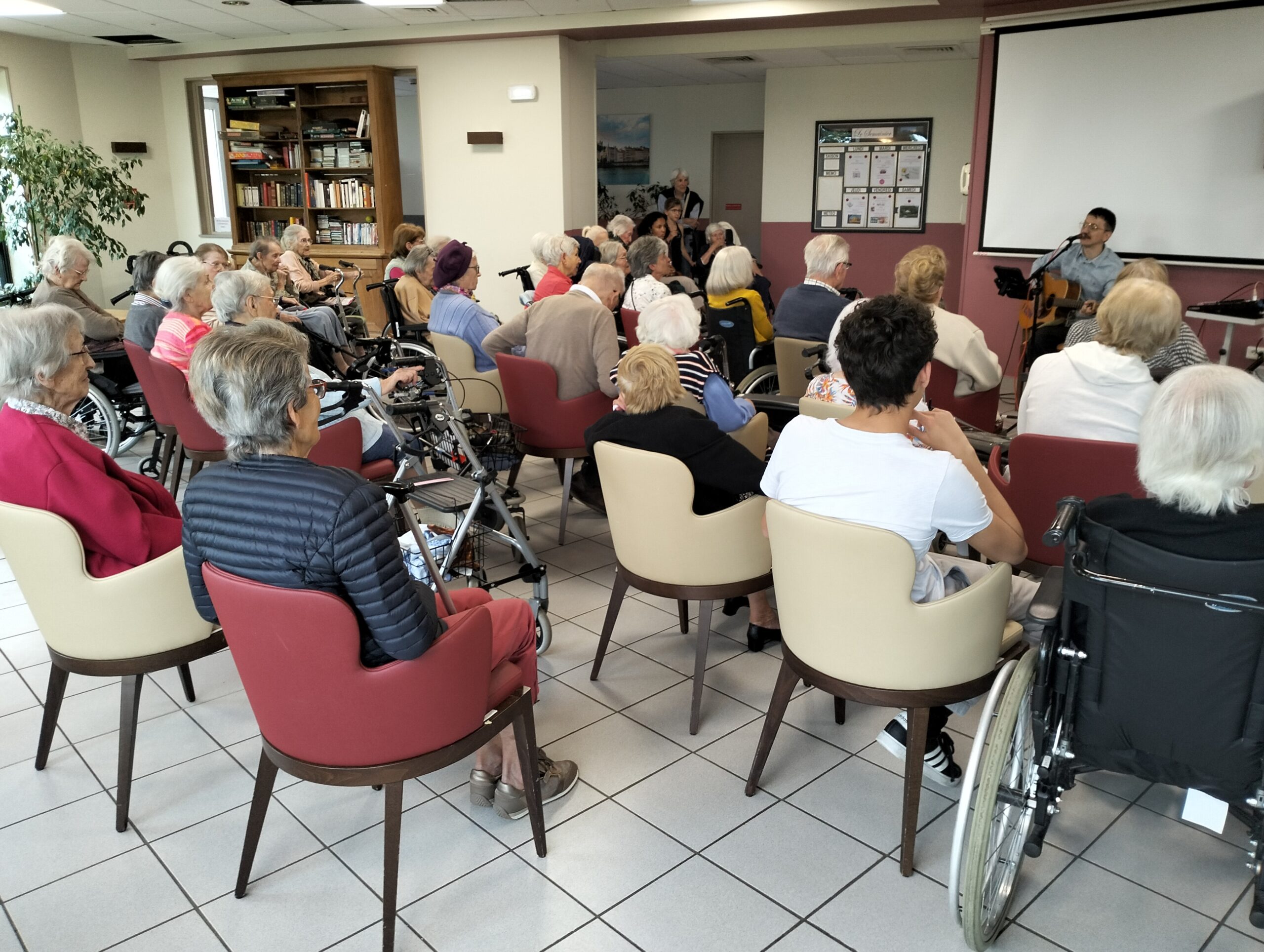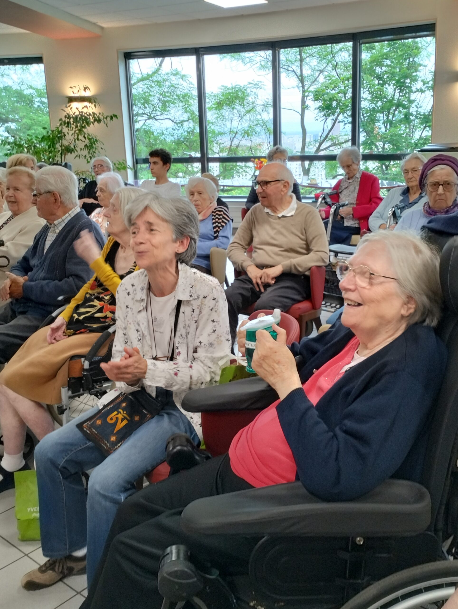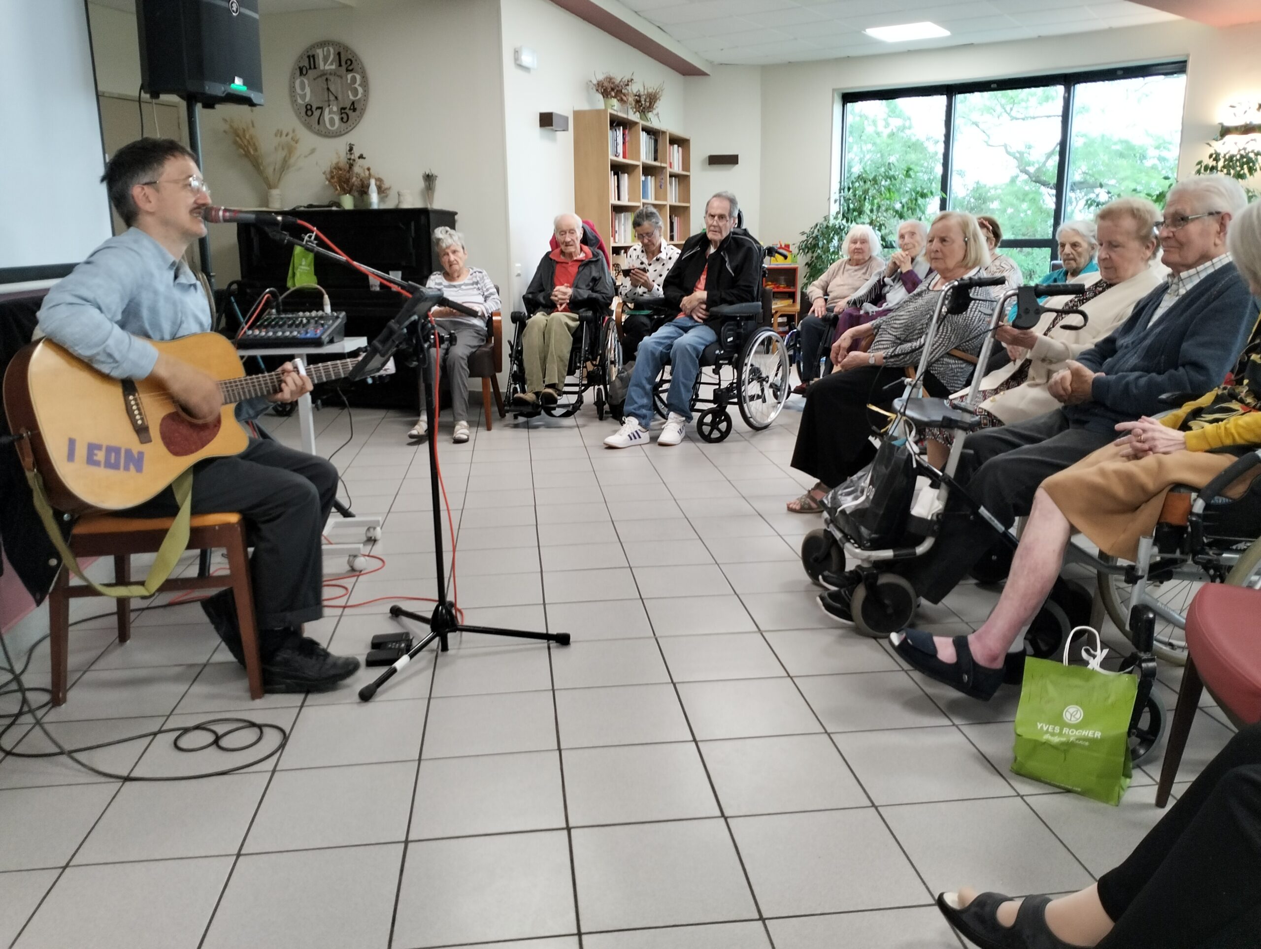 Pour les anniversaires du mois de mai, chants et guitare au programme. Résidents, familles et salariés sont heureux de se retrouver pour les fêtes des anniversaires. Merci aux cuisiniers des Amandines pour la préparation des gâteaux appréciés de tous.