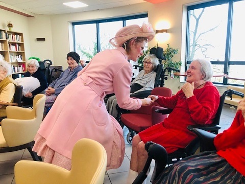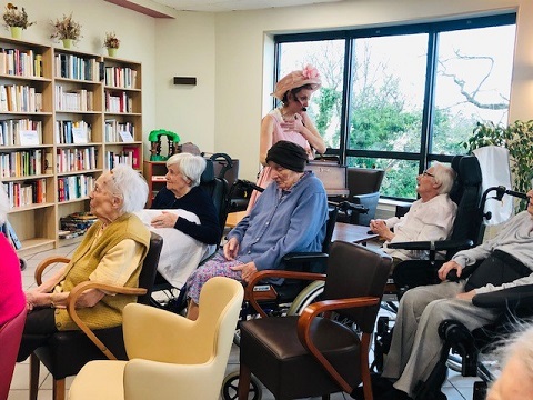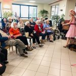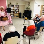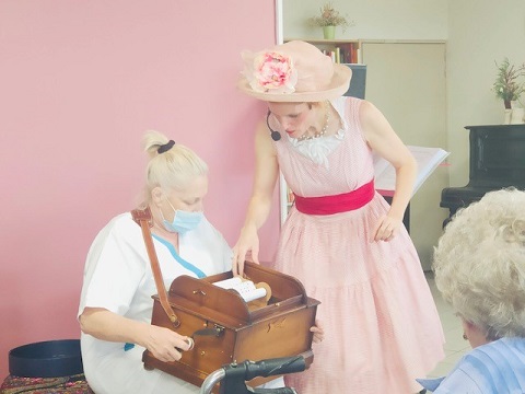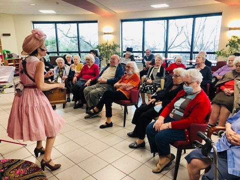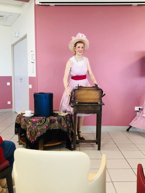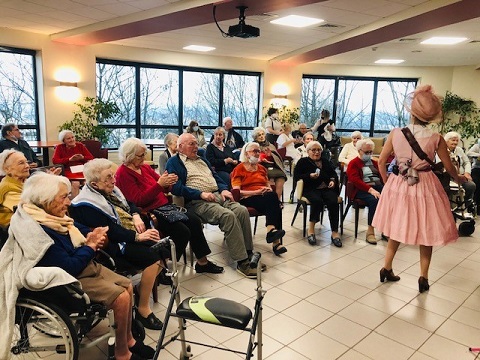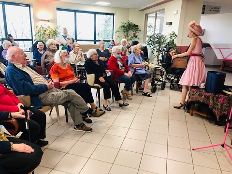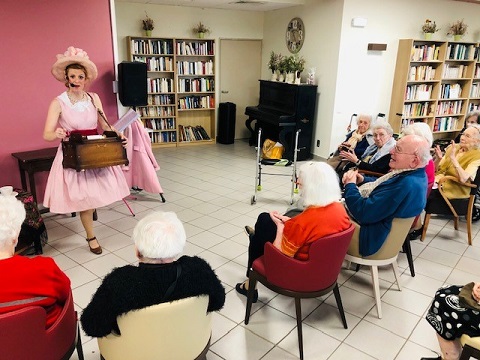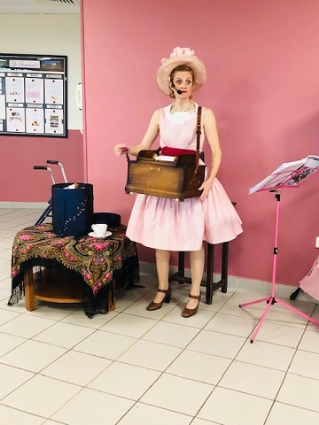 Pour la fête des anniversaires du mois de février, l’après-midi a été animée par une chanteuse dynamique. Accompagnée par son orgue de barbarie, elle a chanté des airs communs. Nous avons tous participé, Elisabeth a même joué de l’instrument. La chanteuse nous a amusé par son air de clown et sa tenue fantaisie. C’était un après-midi bien réussi !