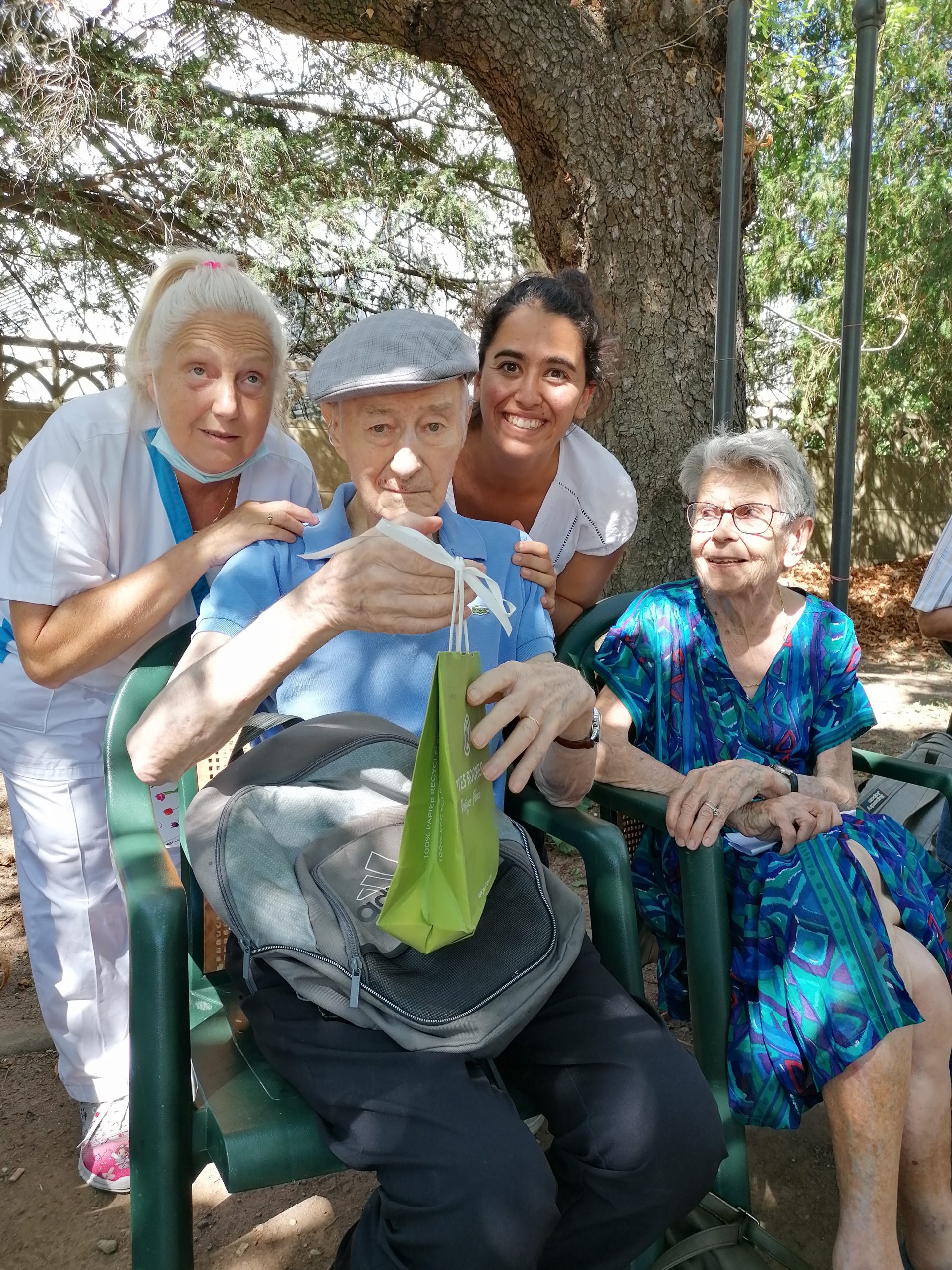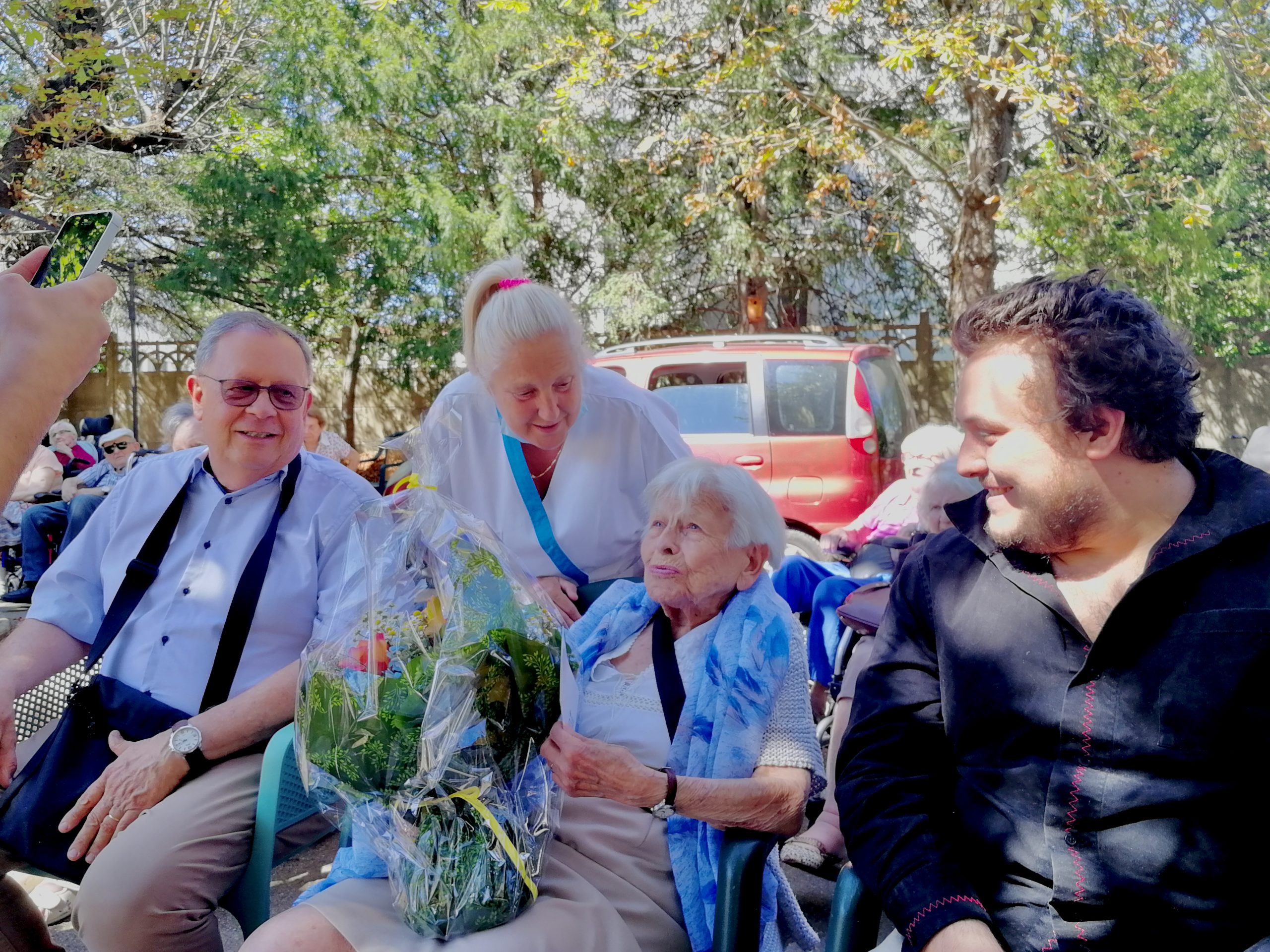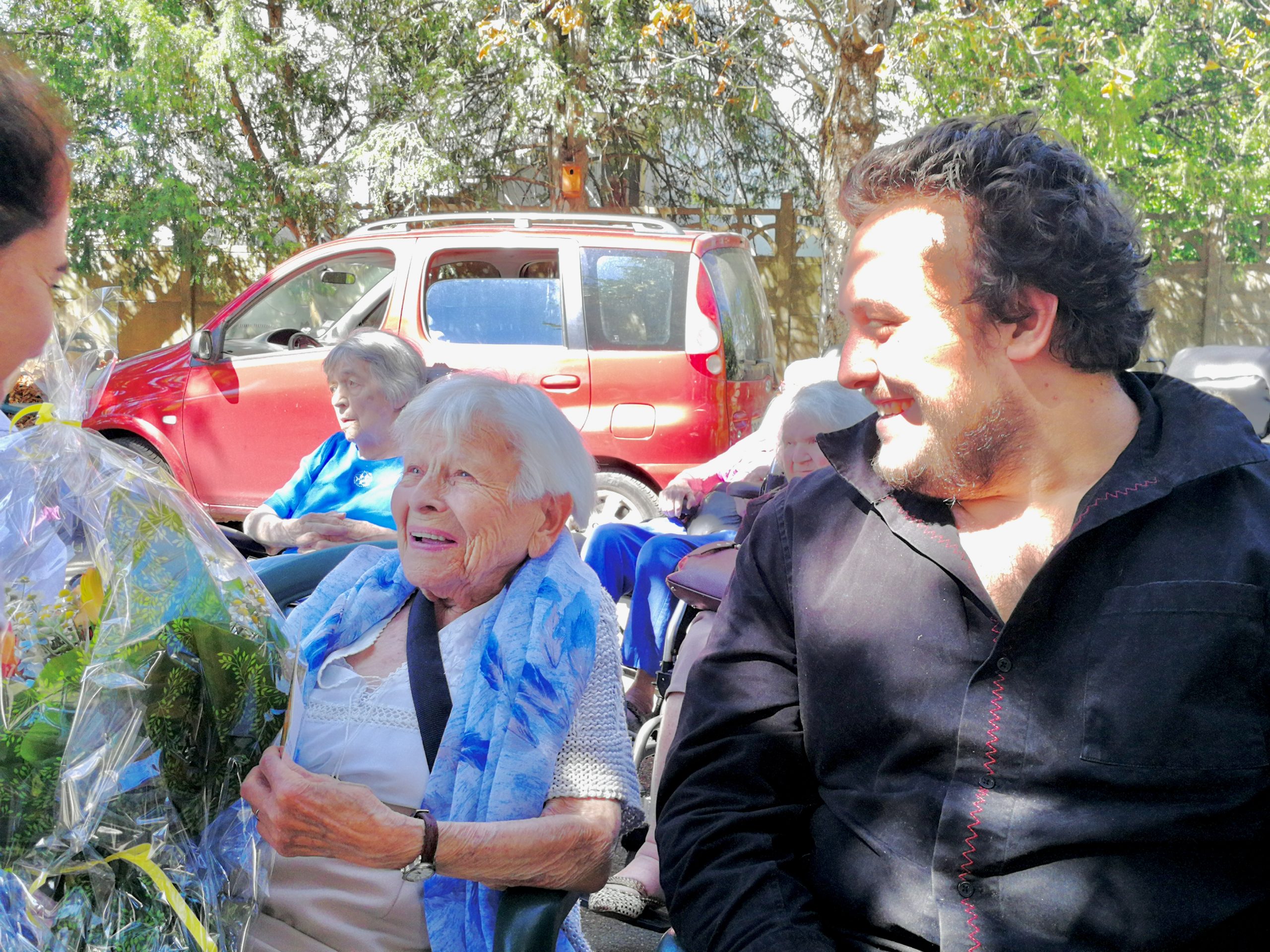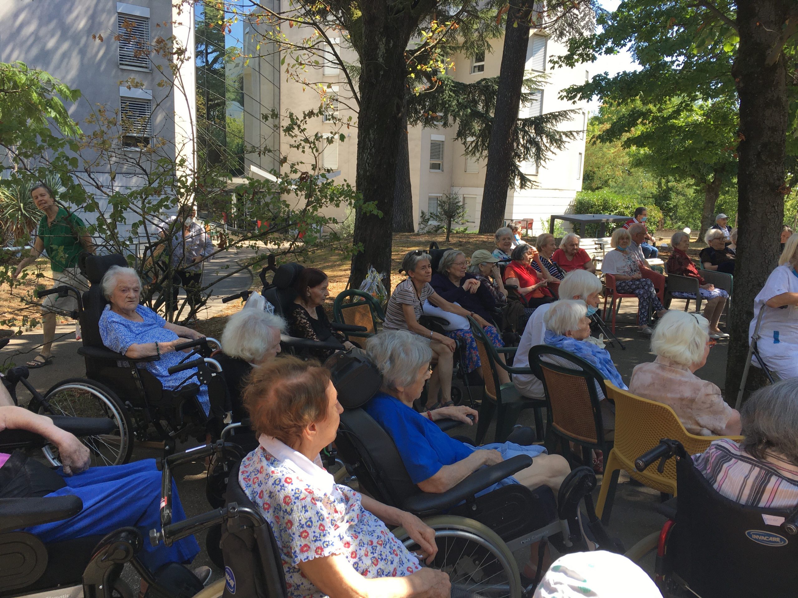 Mercredi 27 juillet, pour fêter les anniversaires du mois de juillet, nous avons profité du parc en compagnie d’un duo de chanteurs Léandre un jeune homme de 15 ans et de Suzanne. Belle performance des chanteurs qui nous ont animé l’après-midi. Beaucoup de cadeaux à distribuer ce jour car de nombreux résidents sont nés en juillet. Cette journée est tombée le jour des 100 ans d’une résidente. Nous en avons profité pour lui porter une attention particulière avec un beau bouquet de fleurs. La cuisine nous a gâté avec de belles mini tartelettes aux fruits. Merci aux familles présentes qui nous ont aidé. Encore un bon moment partagé tous ensemble !