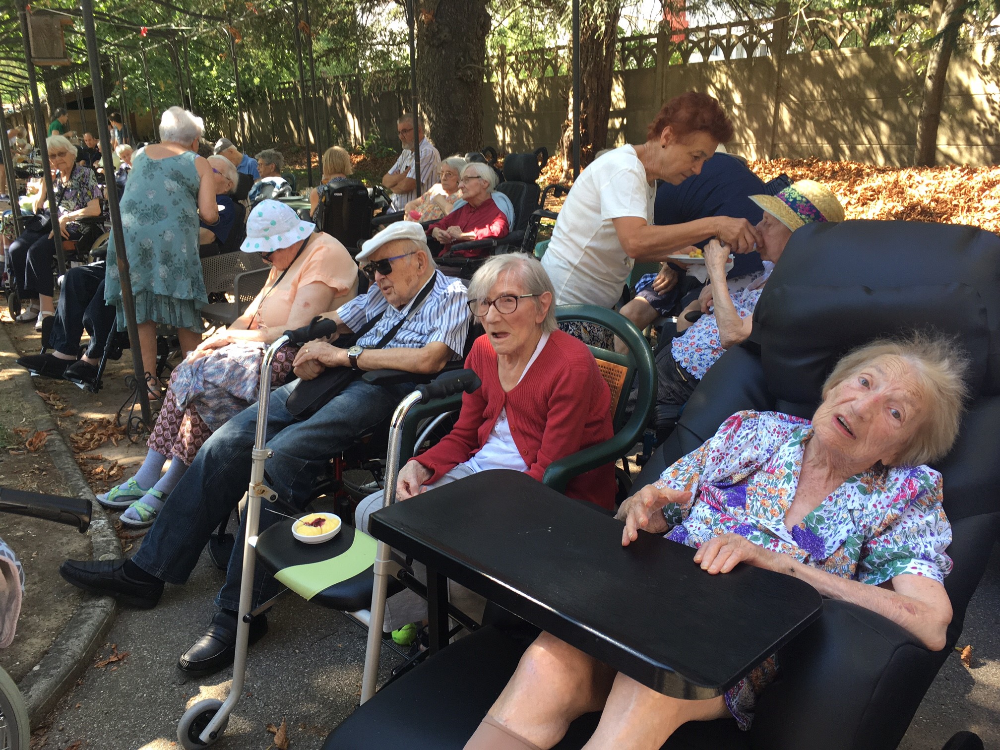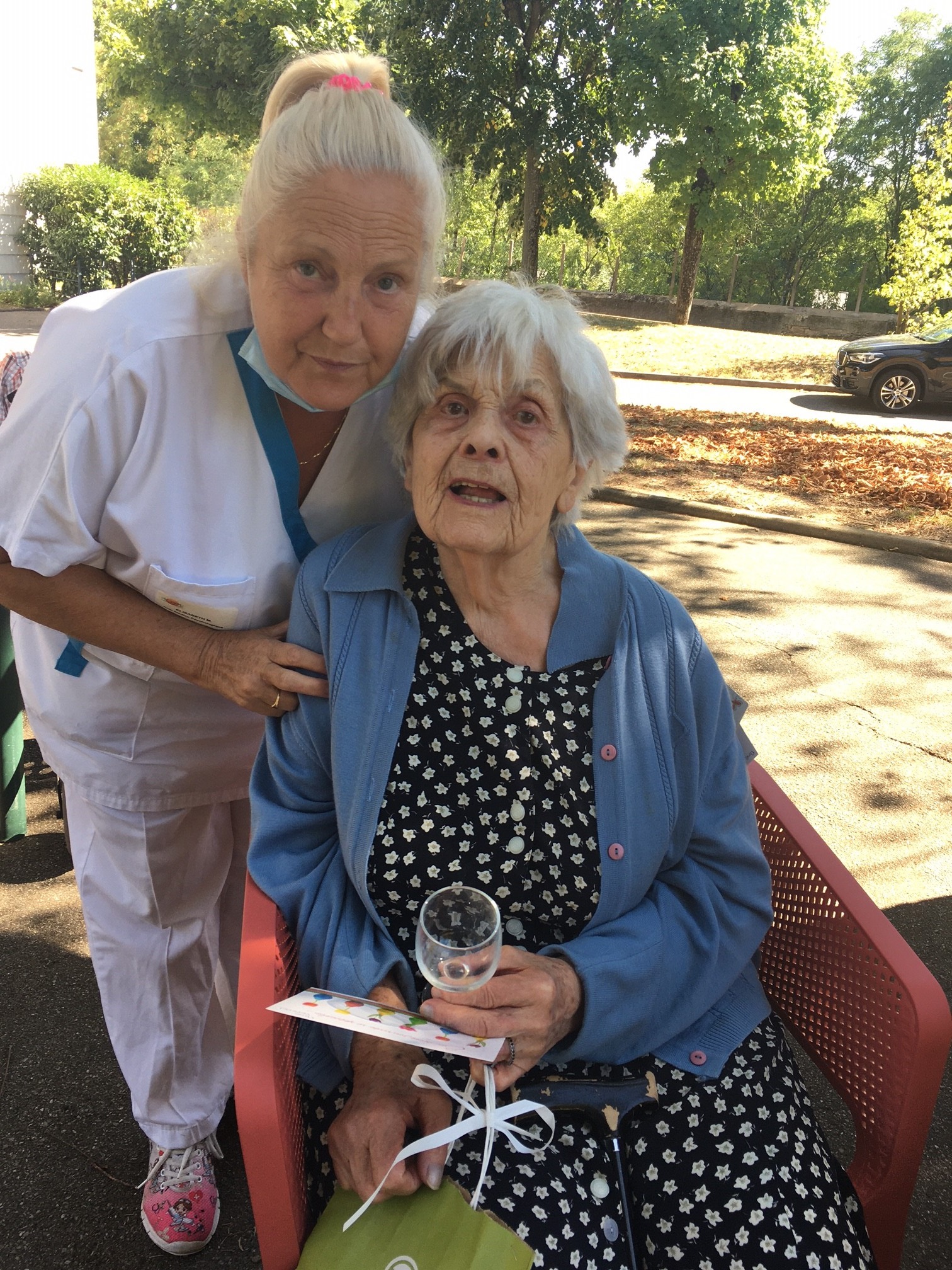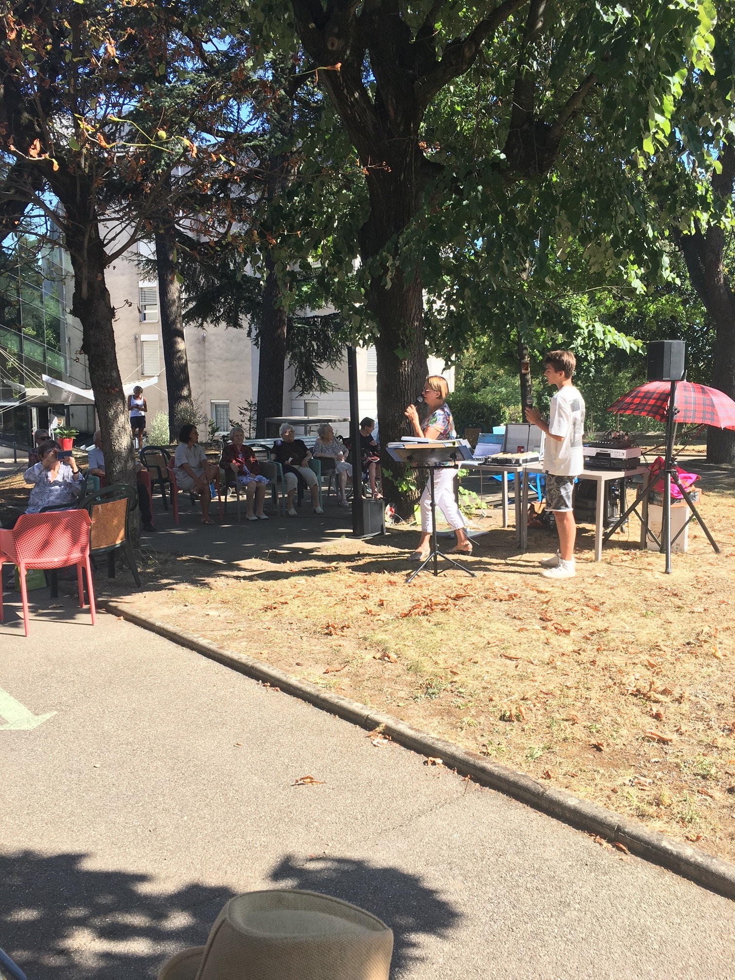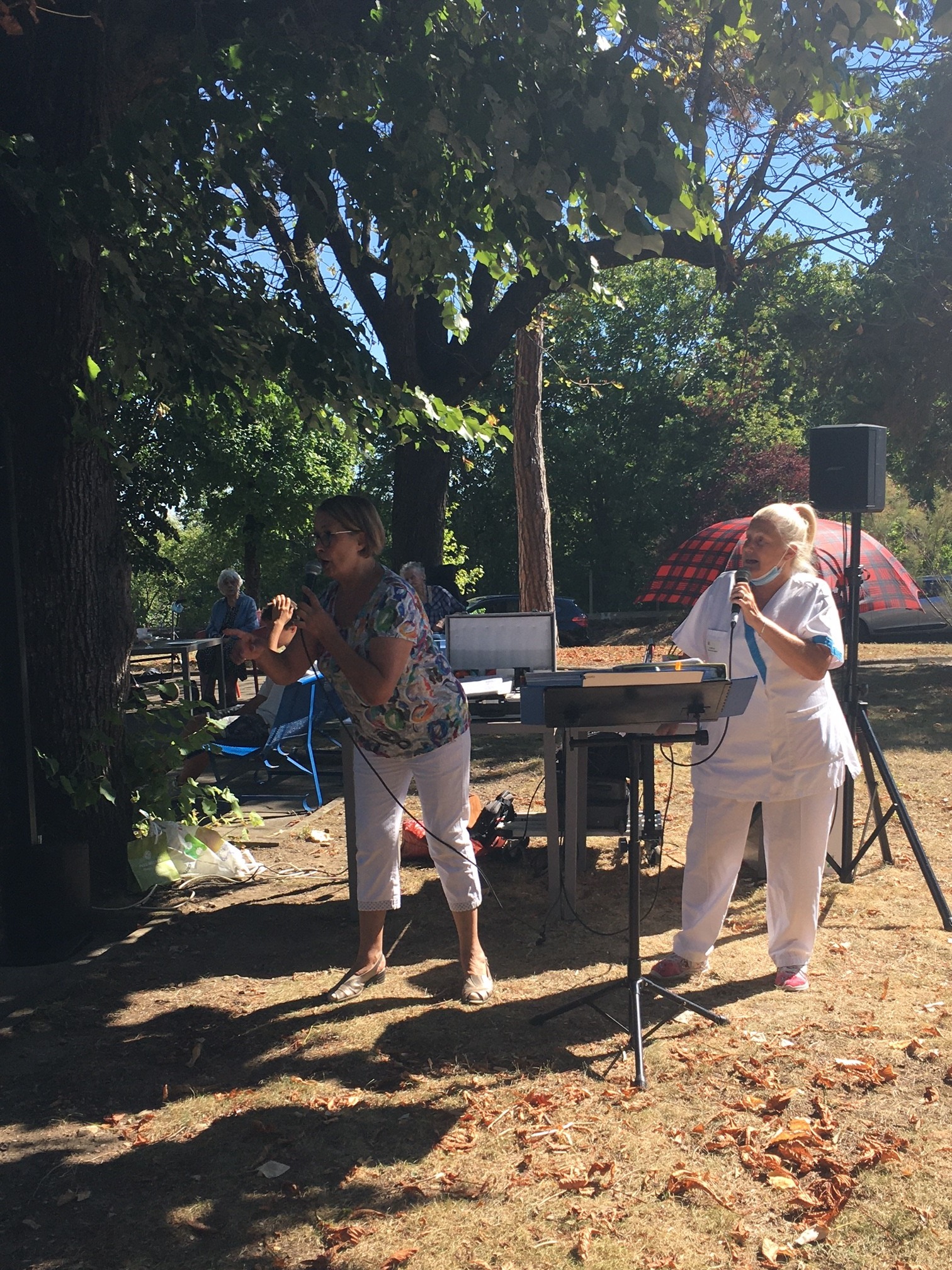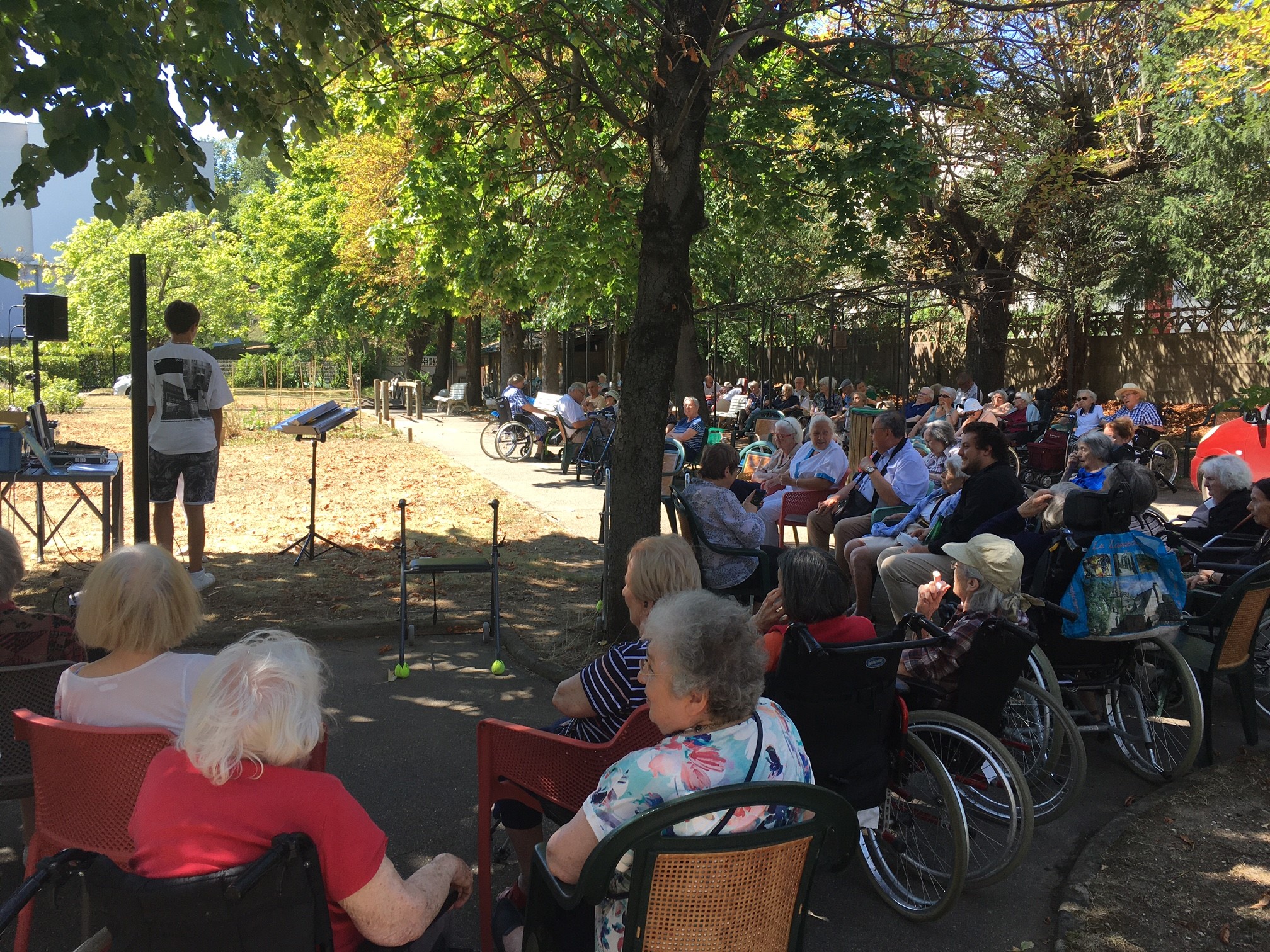 Mercredi 27 juillet, pour fêter les anniversaires du mois de juillet, nous avons profité du parc en compagnie d’un duo de chanteurs Léandre un jeune homme de 15 ans et de Suzanne. Belle performance des chanteurs qui nous ont animé l’après-midi. Beaucoup de cadeaux à distribuer ce jour car de nombreux résidents sont nés en juillet. Cette journée est tombée le jour des 100 ans d’une résidente. Nous en avons profité pour lui porter une attention particulière avec un beau bouquet de fleurs. La cuisine nous a gâté avec de belles mini tartelettes aux fruits. Merci aux familles présentes qui nous ont aidé. Encore un bon moment partagé tous ensemble !