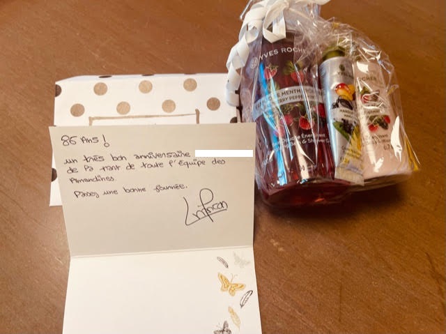 La directrice est venue annoncer au micro les anniversaires du mois et remettre à chacun une carte d’anniversaire et un coffret Yves Rocher de la part de la maison, de toute l’équipe des Amandines.