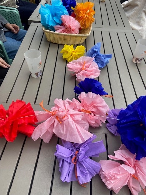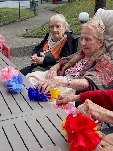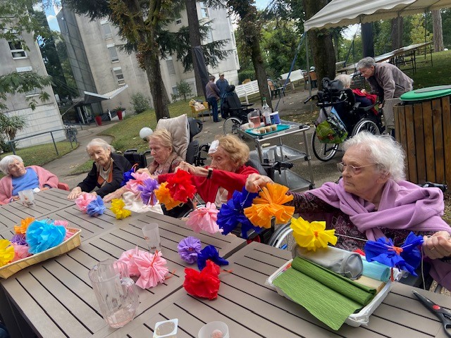 Le lundi 23 septembre, les résidents ont fini d’assembler les guirlandes décoratives pour les 30 ans des Amandines. Une activité manuelle bien investie par les résidents.
