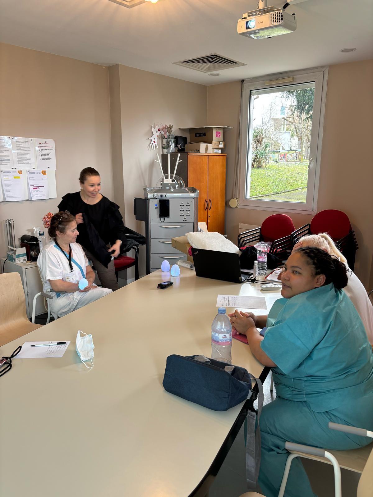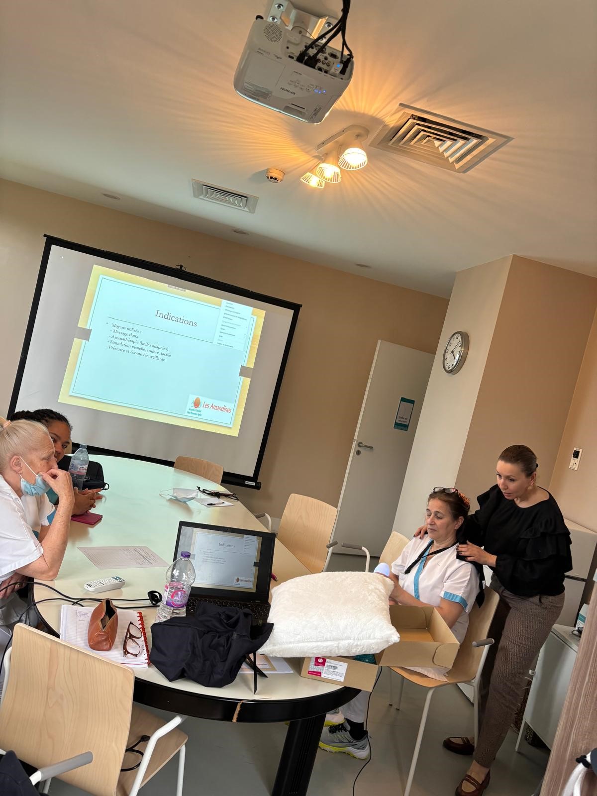 Awatef LAVALLE, Psychologue aux Amandines est en train de réaliser une formation interne auprès des soignants sur la méthode Snoezelen. L’objectif est que le chariot Snoezelen soit utilisé sur les quatre étages par tous les soignants en fonction des besoins.