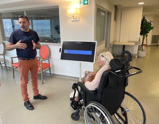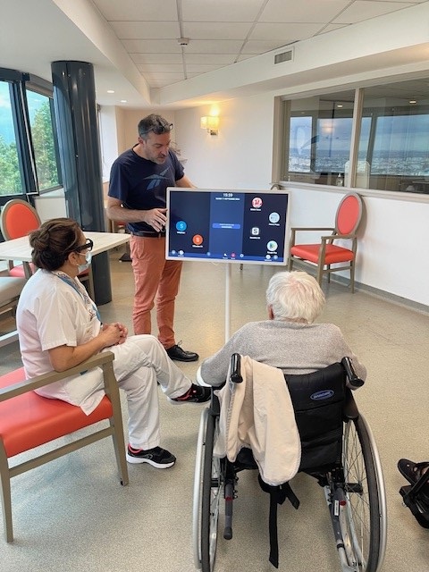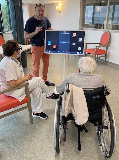 Mardi 17 septembre, M. Sébastien COHAS de la SAS Audice Digital basée à Saint-Etienne nous a apporté une grande tablette numérique aux Amandines, en test pendant un mois dans notre établissement. Au moment de l’installation, un temps de formation a été réalisé auprès de plusieurs soignants, l’animatrice et la directrice. Ayant plein de professionnels moteurs, cette grande tablette sera bien utilisée dans notre maison.