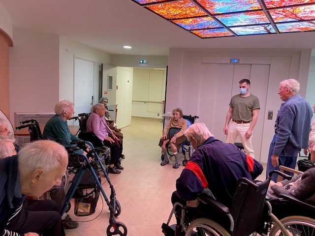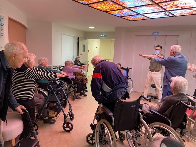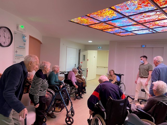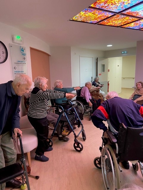 Les kinésithérapeutes qui interviennent aux Amandines proposent des ateliers collectifs de gymnastique, de prévention des chutes dans les salons des étages. Beaucoup de résidents participent à ces ateliers.