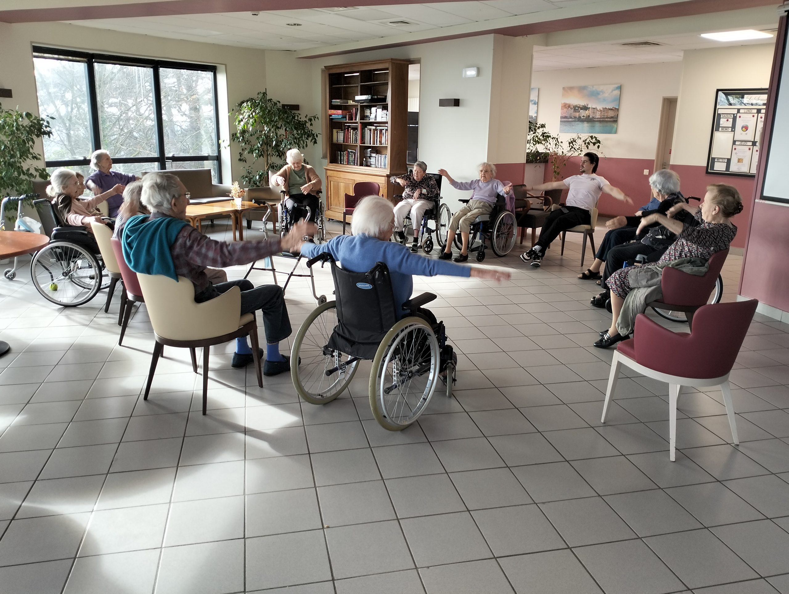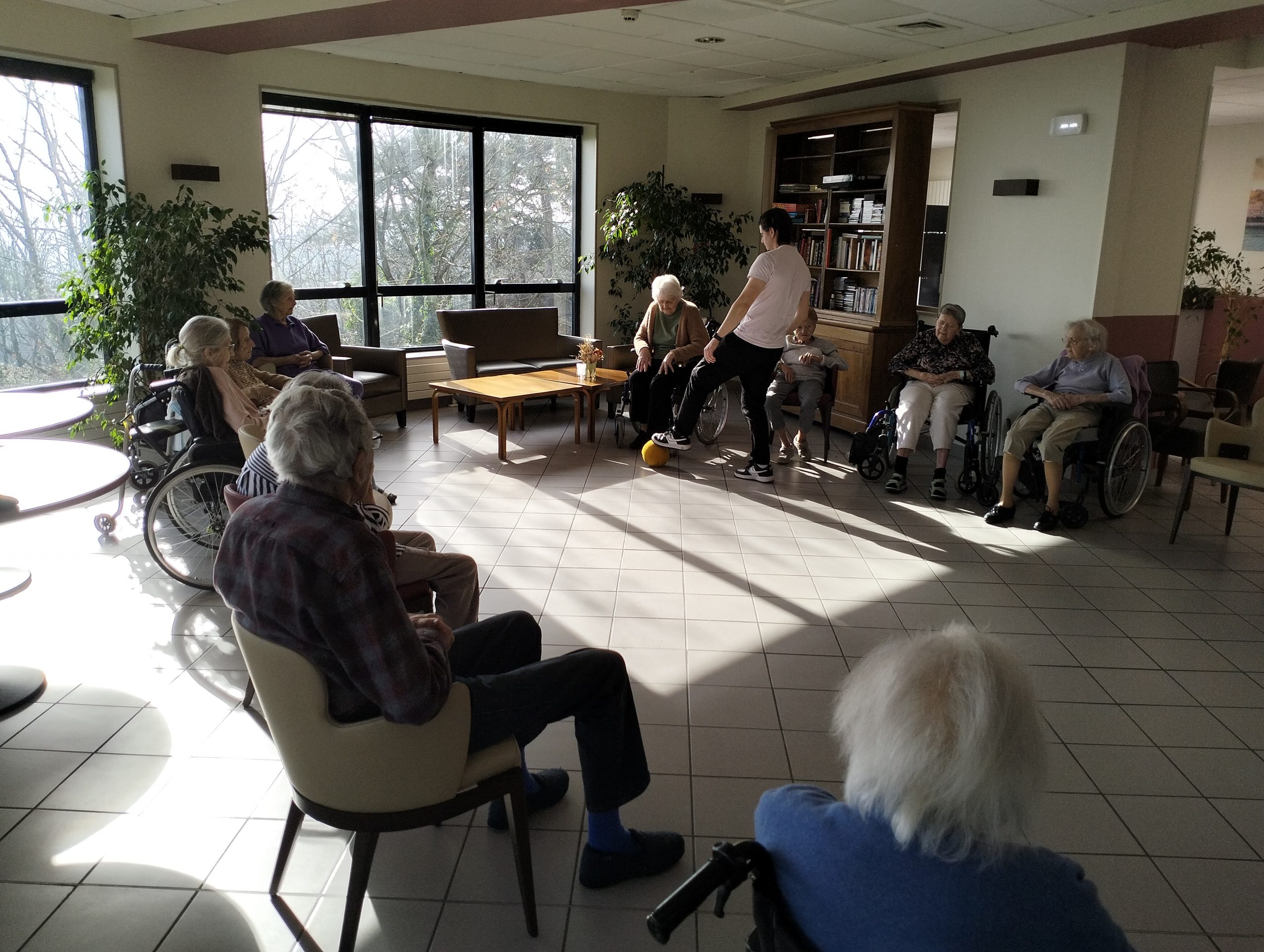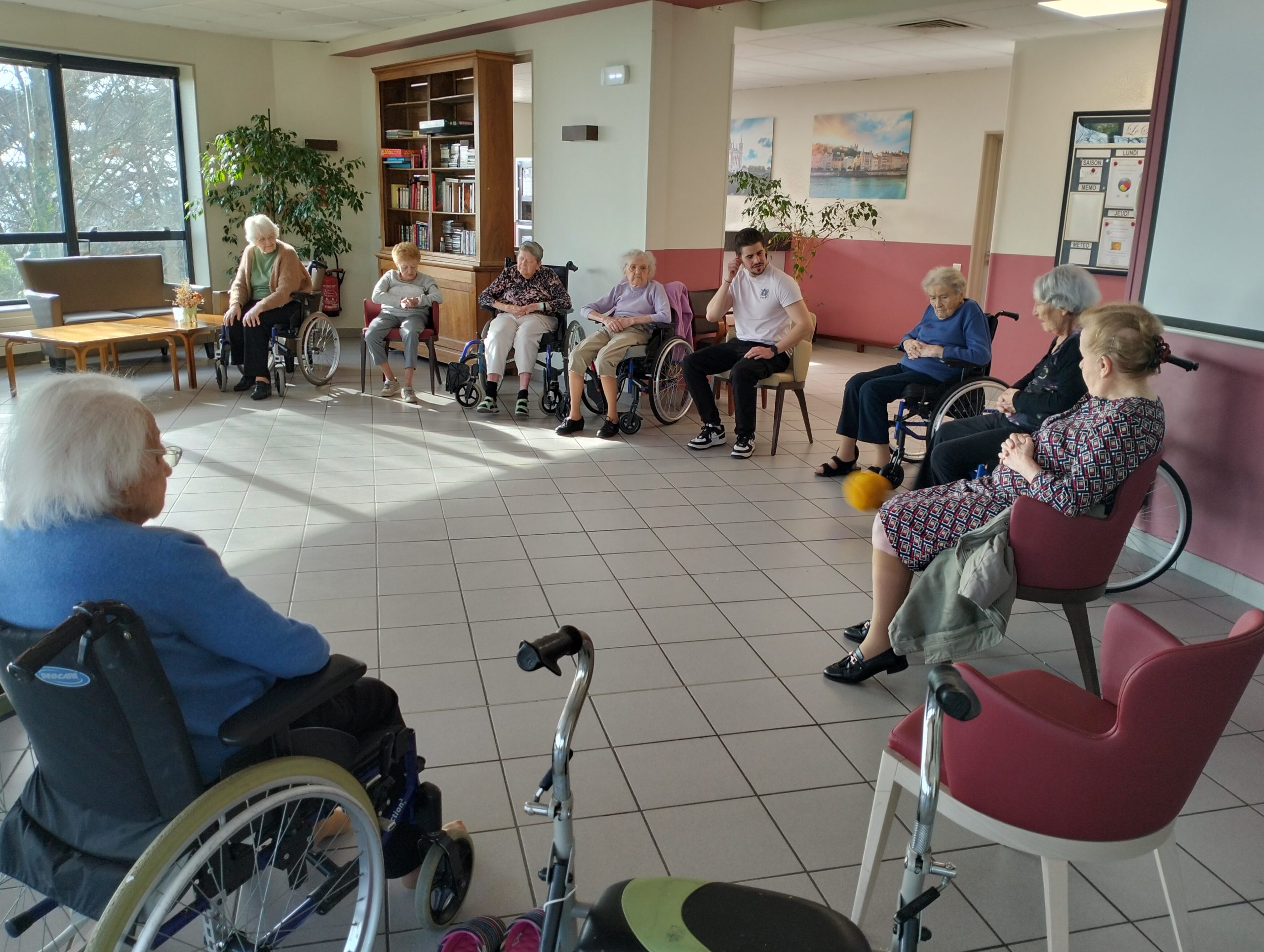 Alexandre en service civique apprécie d’animer la gymnastique douce les mardis matins. Les résidents sont très investis et réalisent les mouvements avec précisions. Cette semaine, c’était travail du corps assis et jeux de balles aux pieds.