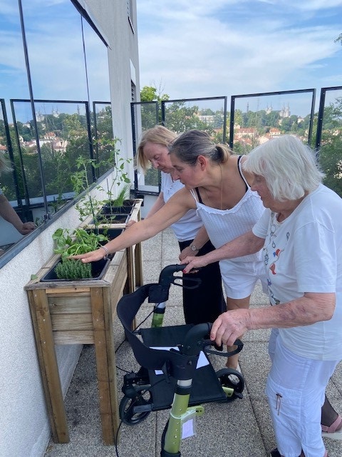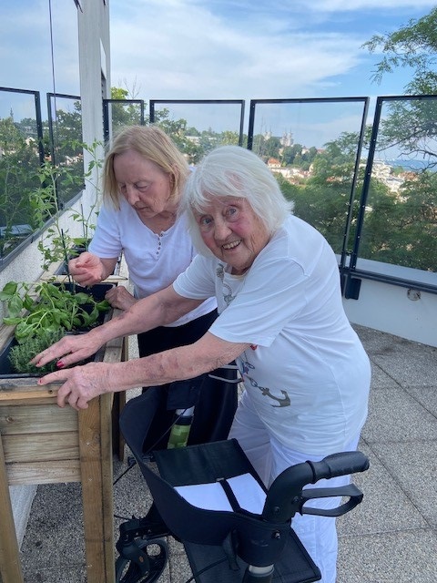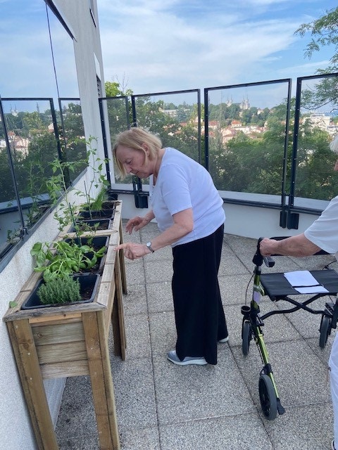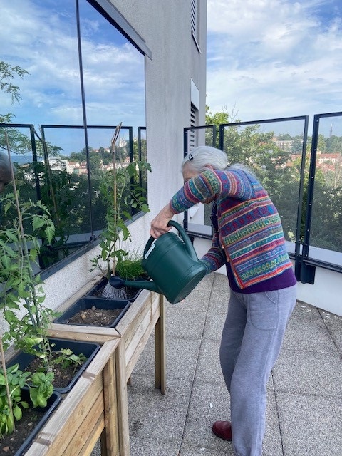 Suite à l’installation d’un nouveau garde-corps plus haut sur la terrasse de notre UPDP permettant d’assurer la sécurité de nos résidents, nous avons commencé à aménager cette terrasse avec plusieurs bacs de jardinage. Les résidents ont très vite investi cette terrasse en plantant des pieds de tomates et des herbes aromatiques. Nous avons poursuivre l’aménagement en installant une table et des bancs. Cette terrasse est très belle avec une vue panoramique sur la ville de Lyon. Un bol d’air frais pour les résidents et les professionnels de l’UPDP !