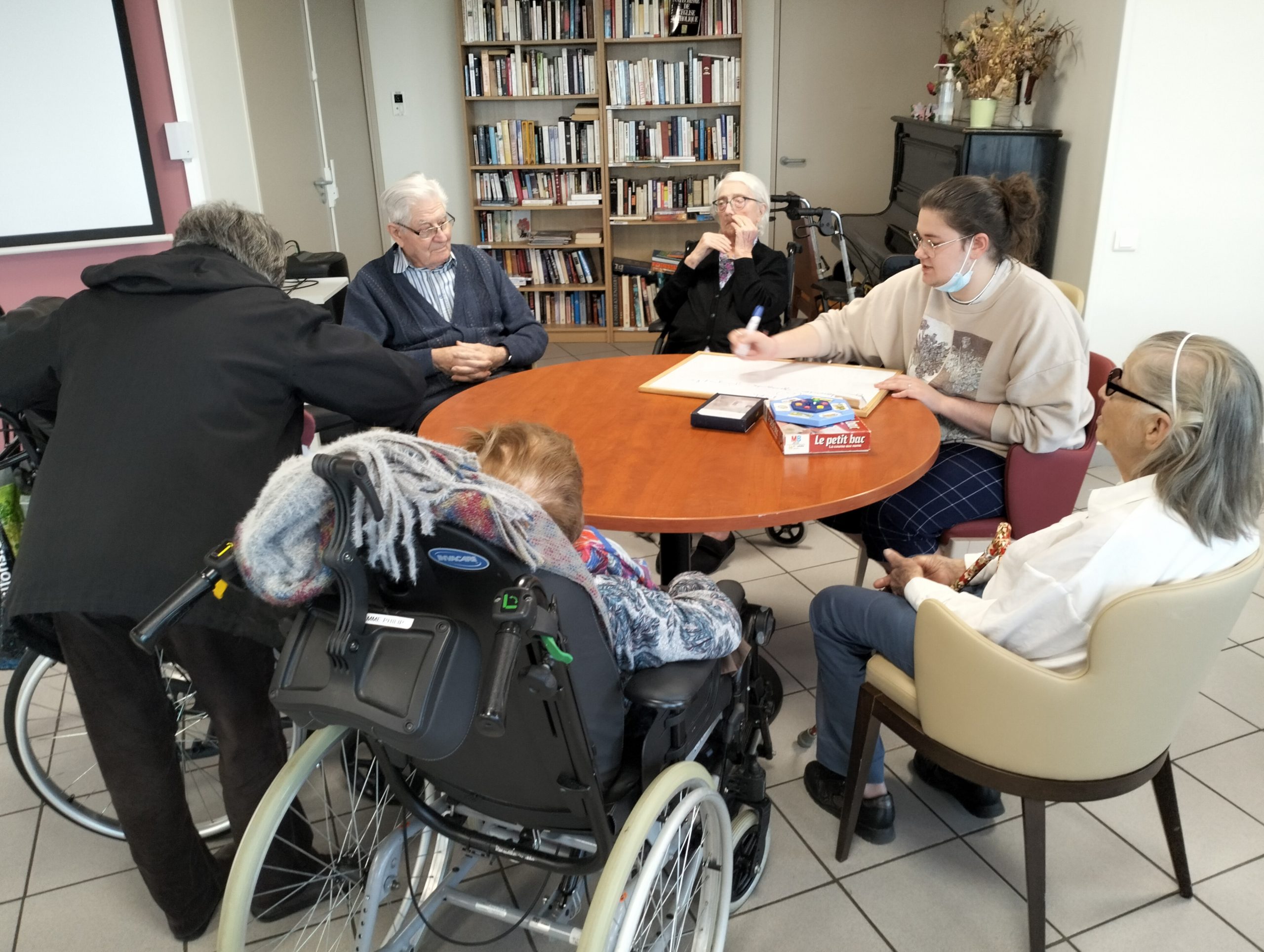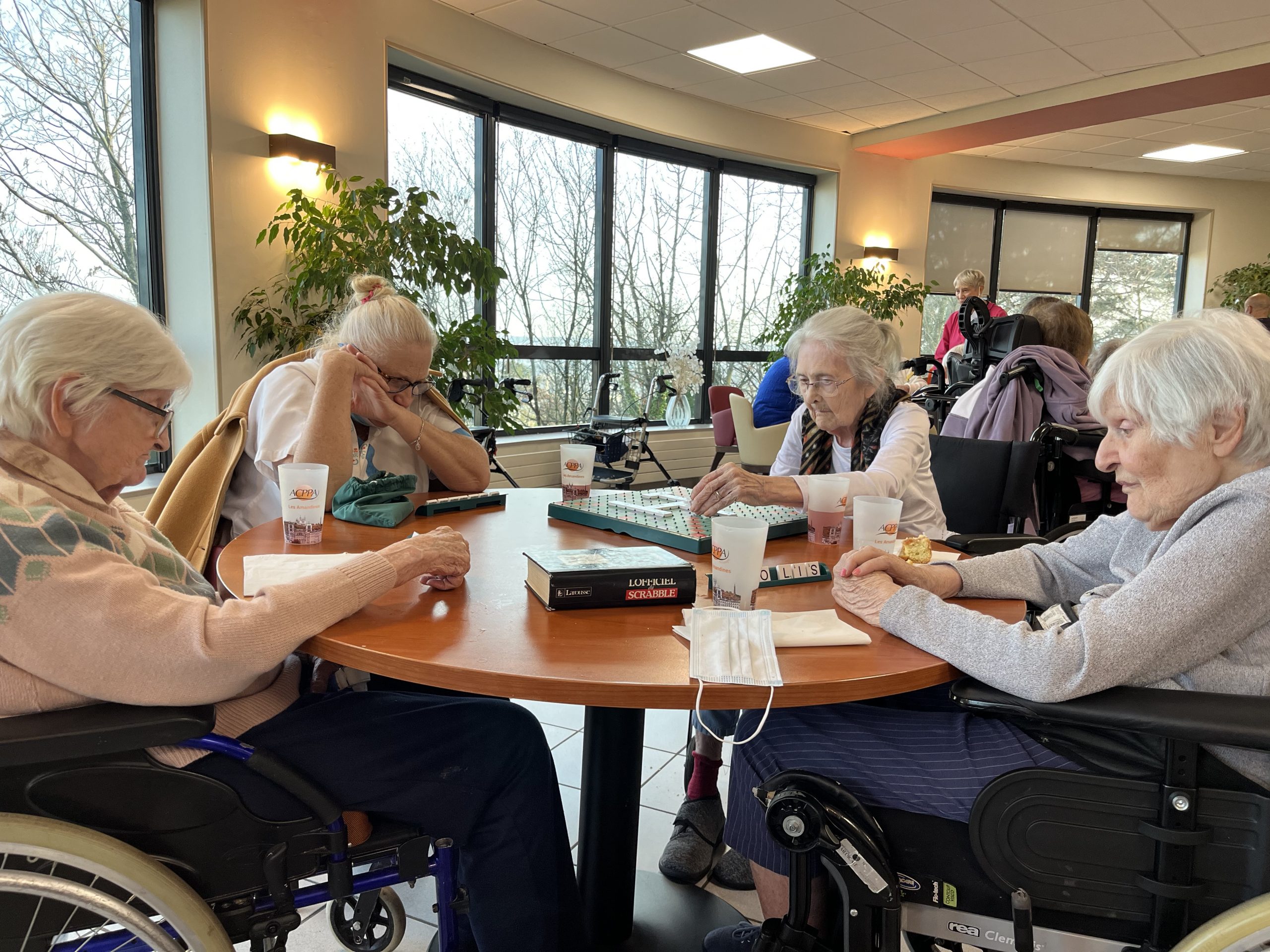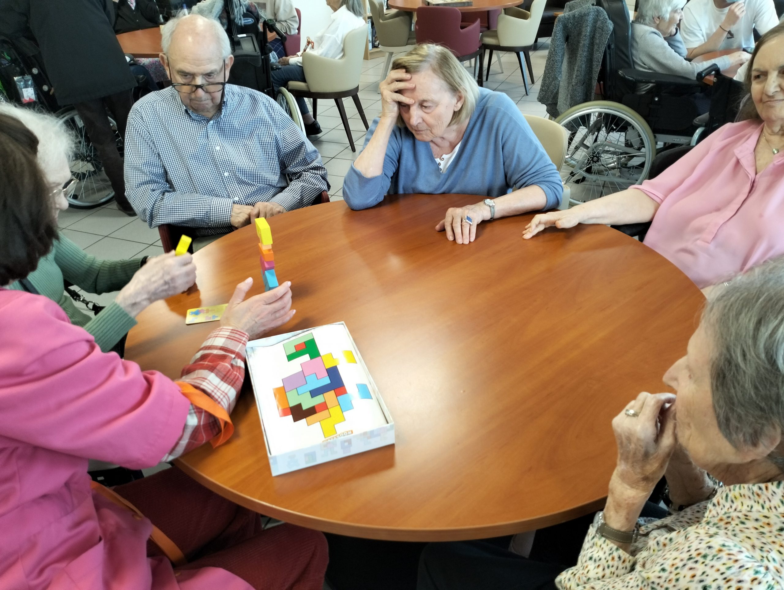 Tous les mardis après-midi, trois bénévoles des Blouses Roses viennent aux Amandines. Cette semaine, c’était avec elles jeux de société avec quatre tables pour satisfaire les envies de chacun : jeux de mots à l’oral, Triomino, jeux de logique et scrabble. Ces moments avec les Blouses Roses nous permettent de proposer plus de possibilités de jeux et des temps plus calmes en étant plus nombreux pour encadrer chaque jeu.