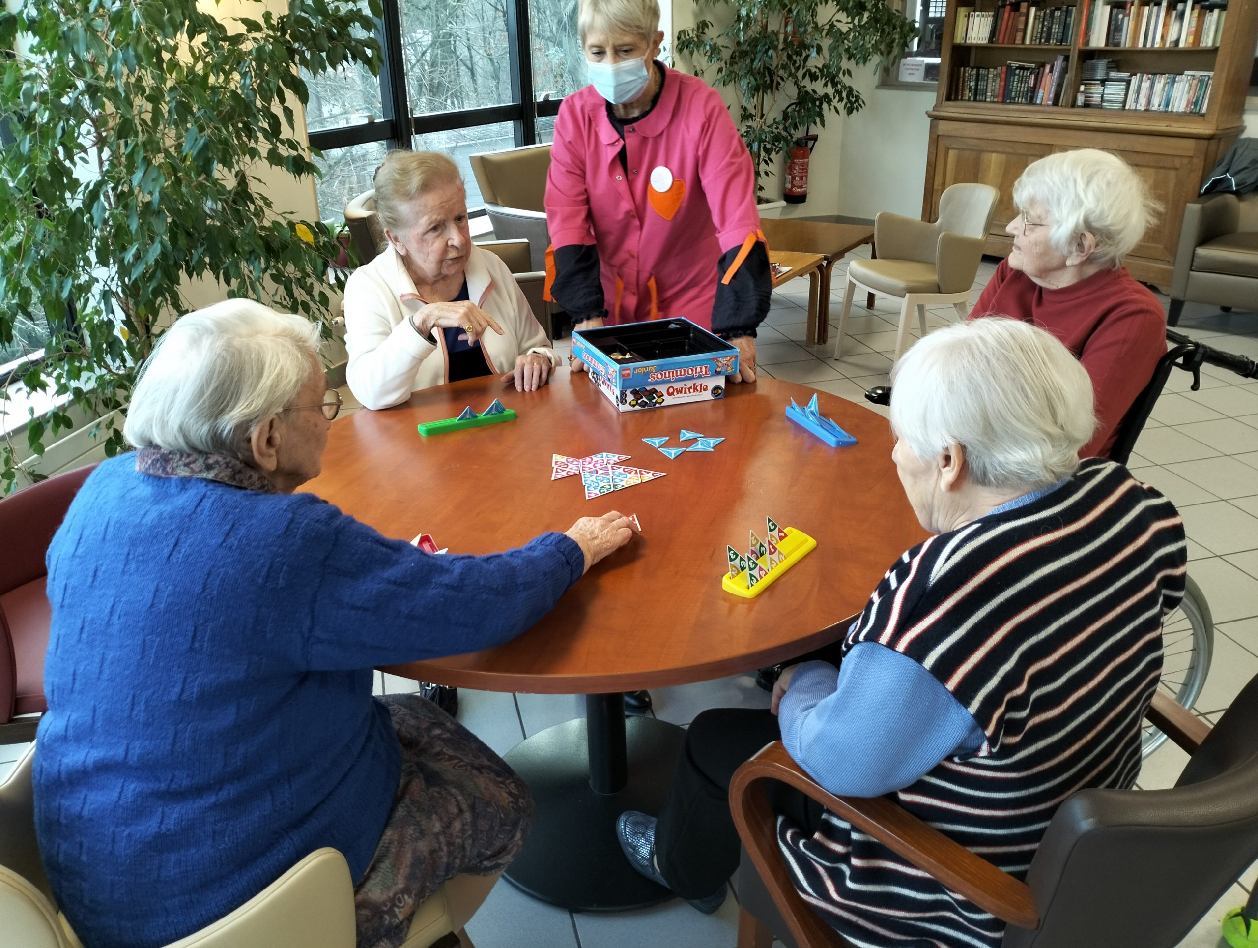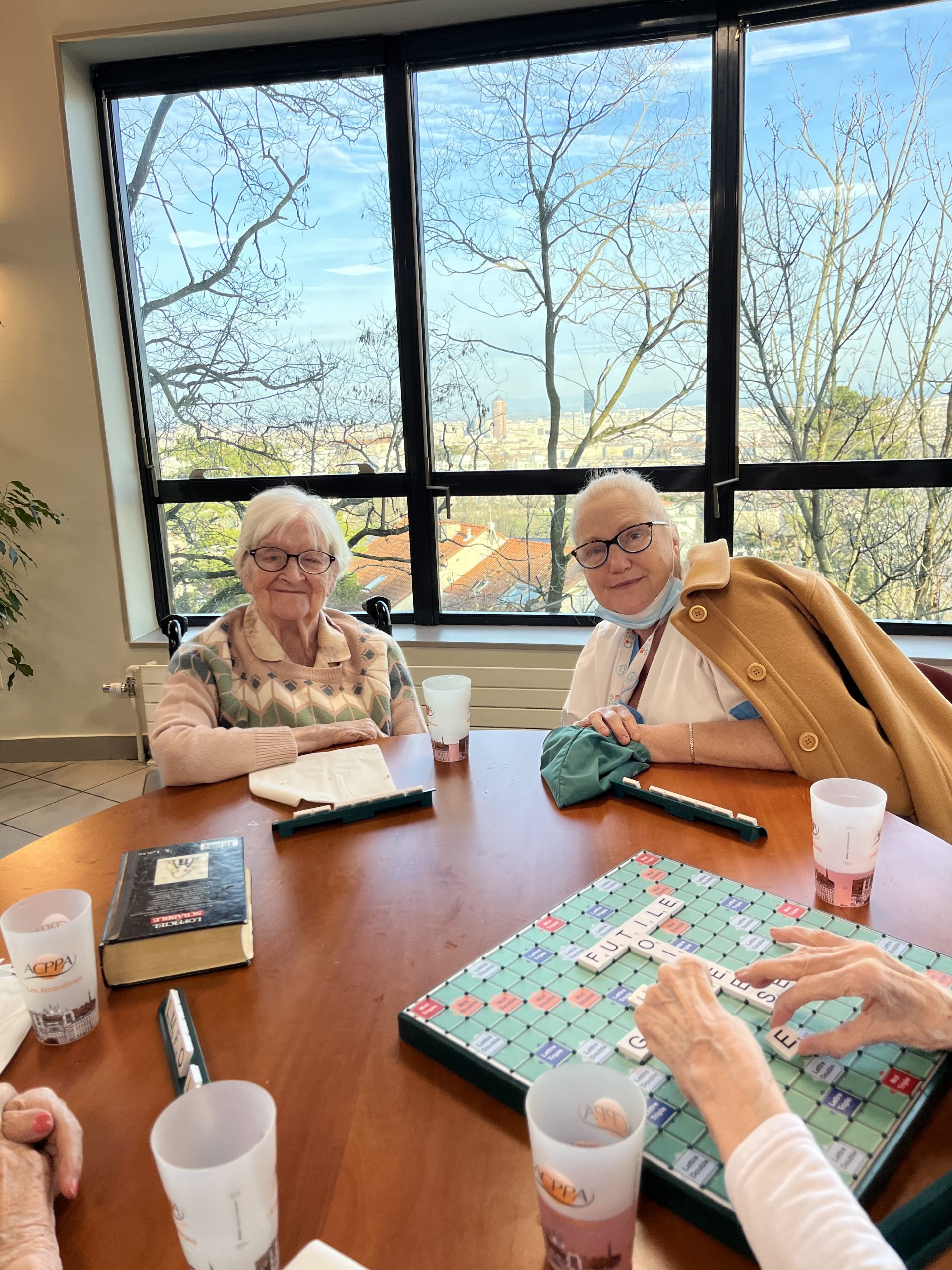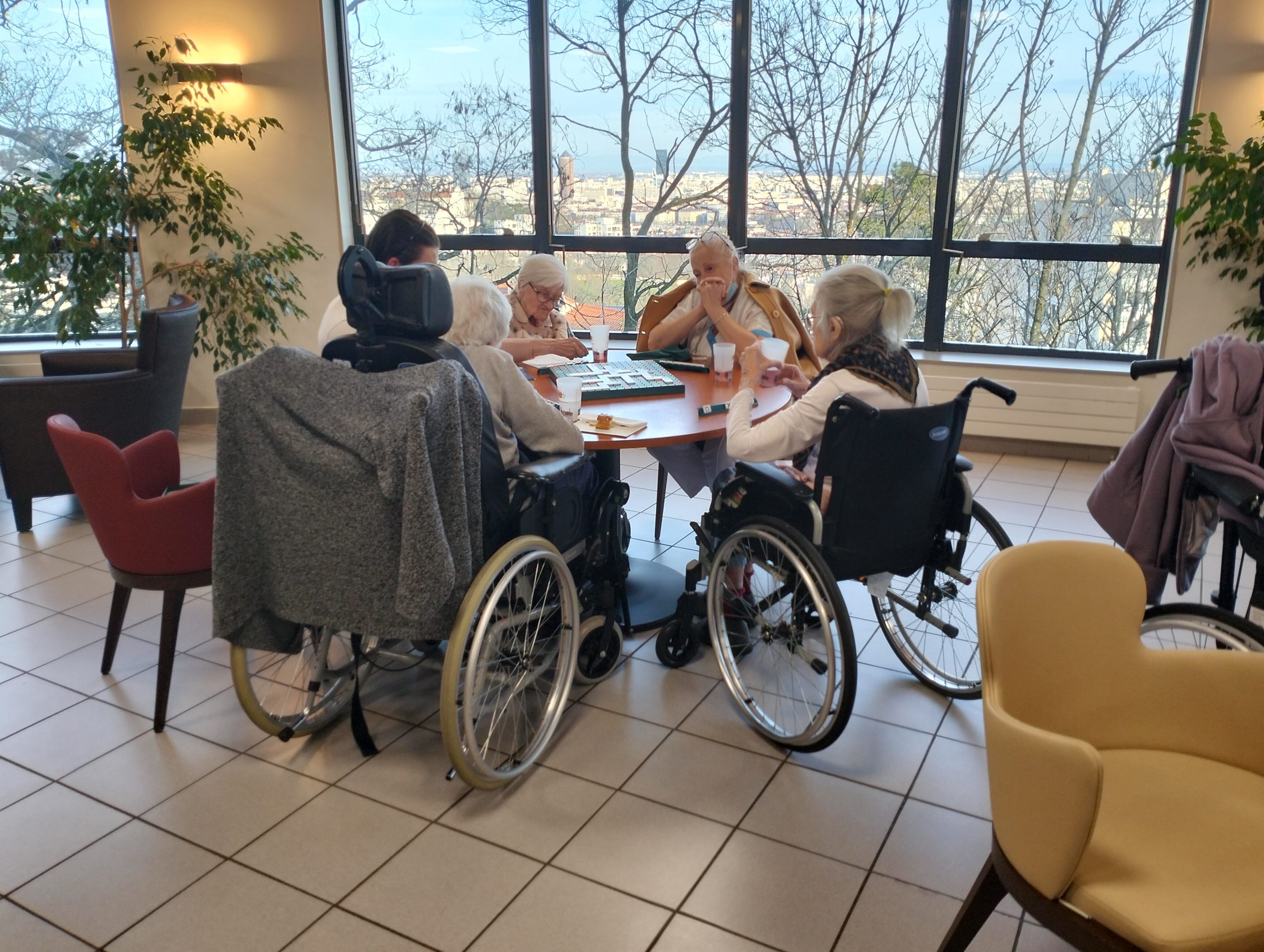 Tous les mardis après-midi, trois bénévoles des Blouses Roses viennent aux Amandines. Cette semaine, c’était avec elles jeux de société avec quatre tables pour satisfaire les envies de chacun : jeux de mots à l’oral, Triomino, jeux de logique et scrabble. Ces moments avec les Blouses Roses nous permettent de proposer plus de possibilités de jeux et des temps plus calmes en étant plus nombreux pour encadrer chaque jeu.