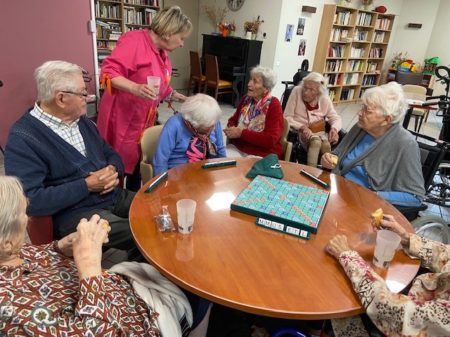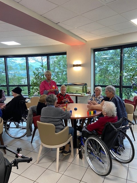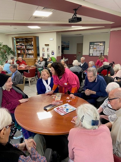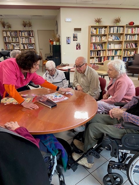 Tous les mardis après-midi, trois bénévoles de l’association Les Blouses Roses viennent aux Amandines proposer aux résidents de nombreux jeux de société : grand loto, scrabble, mots mêlés, triomino, kataboom… Ces temps de jeux sont très appréciés.