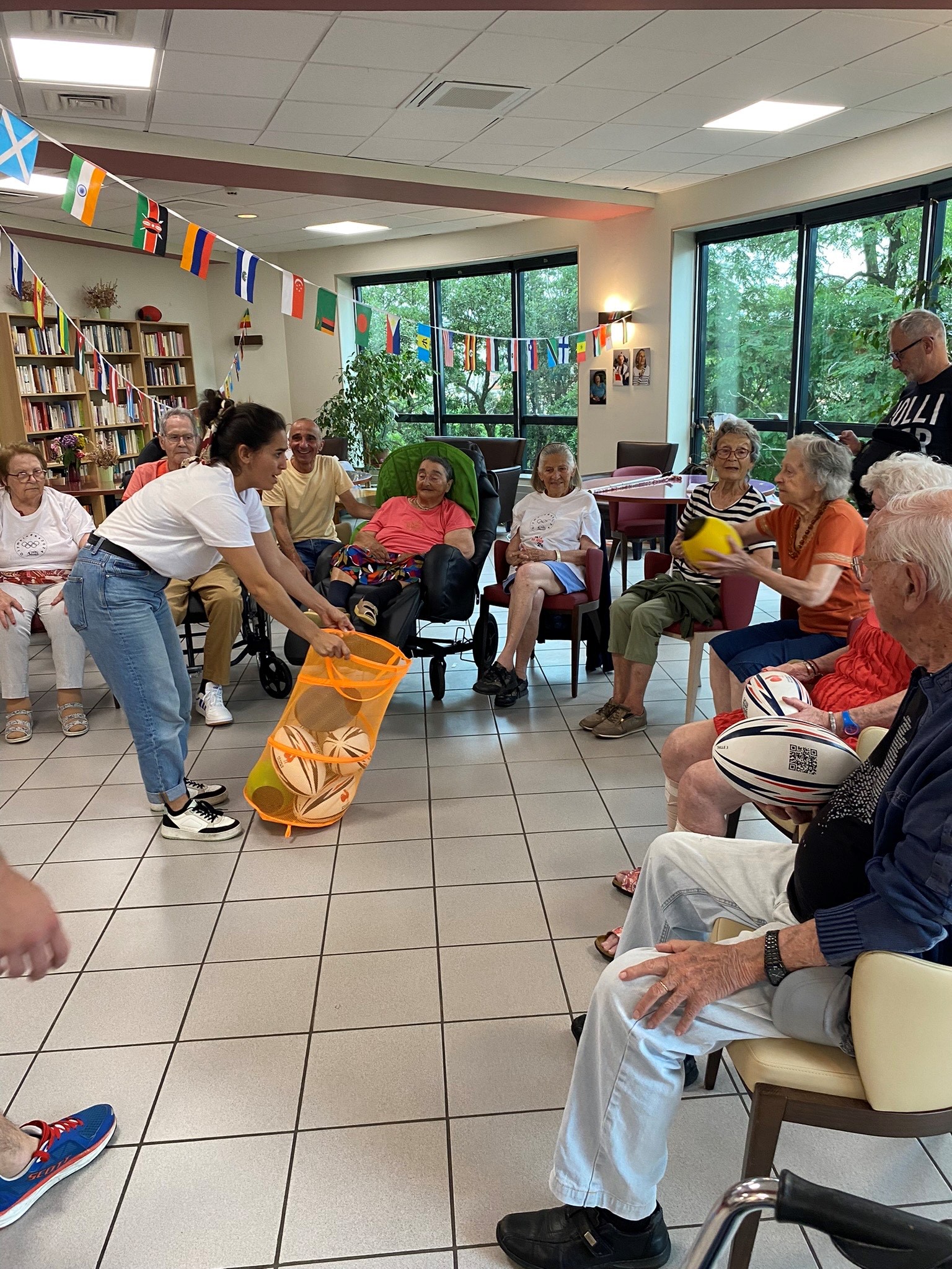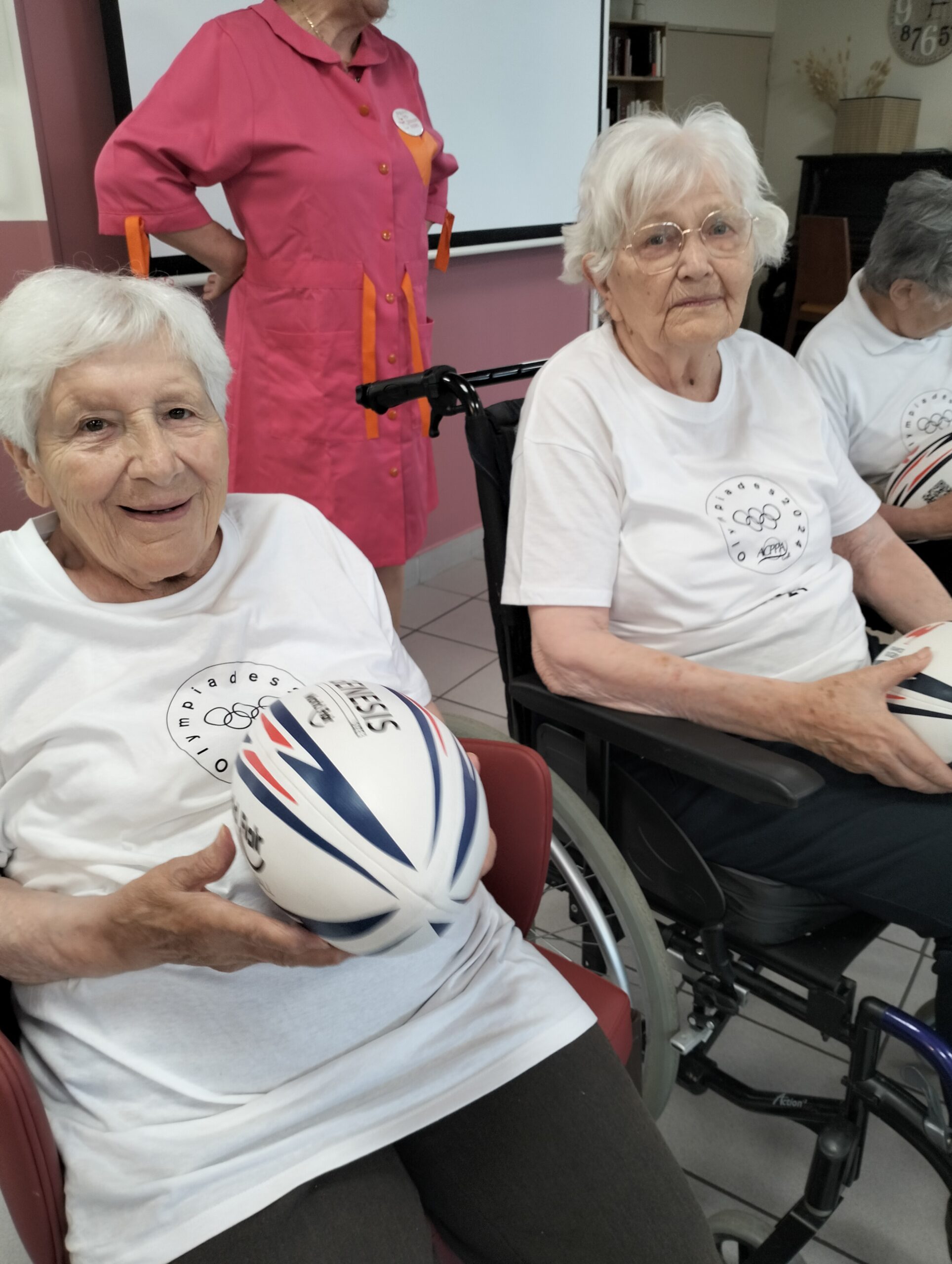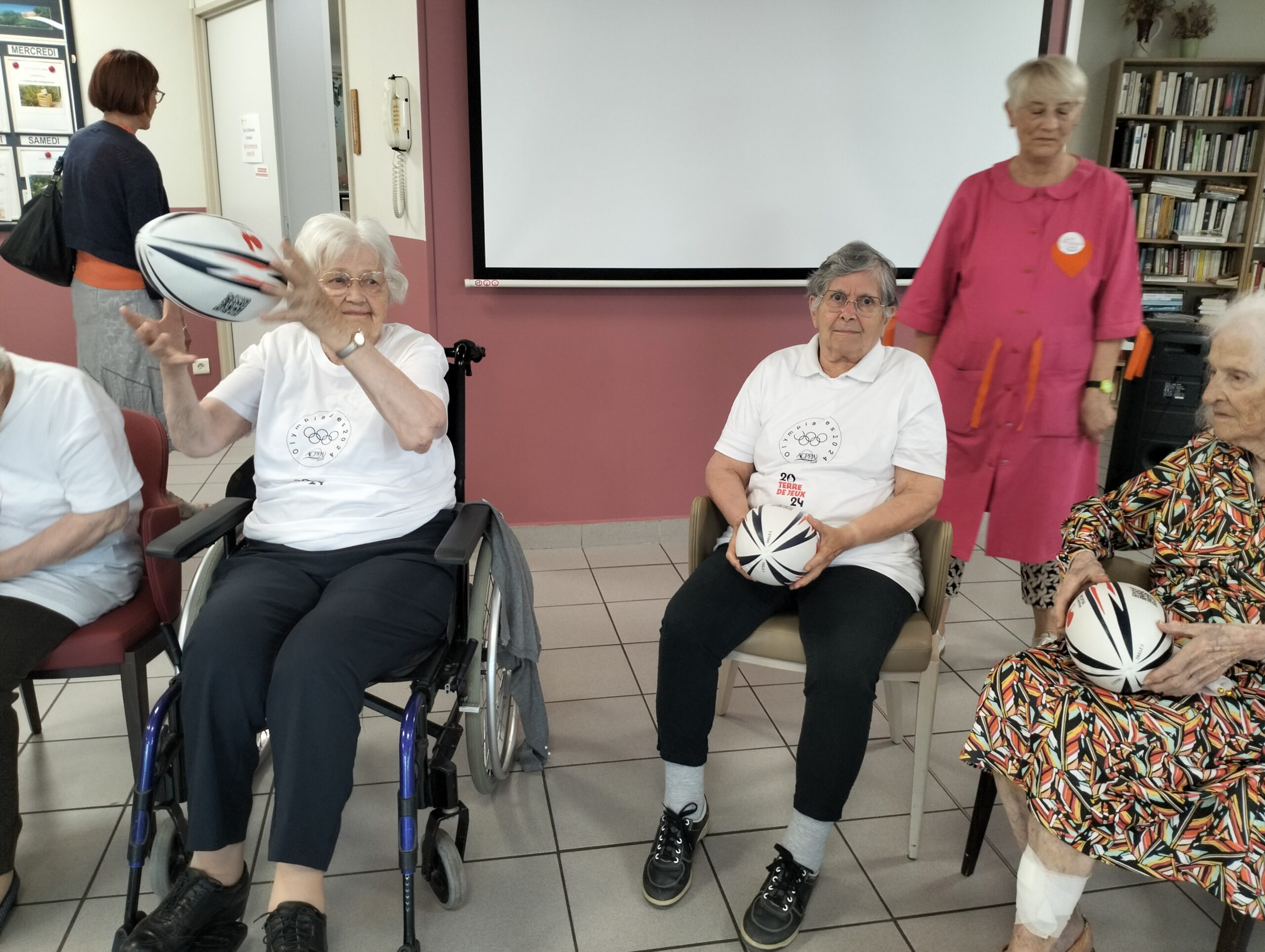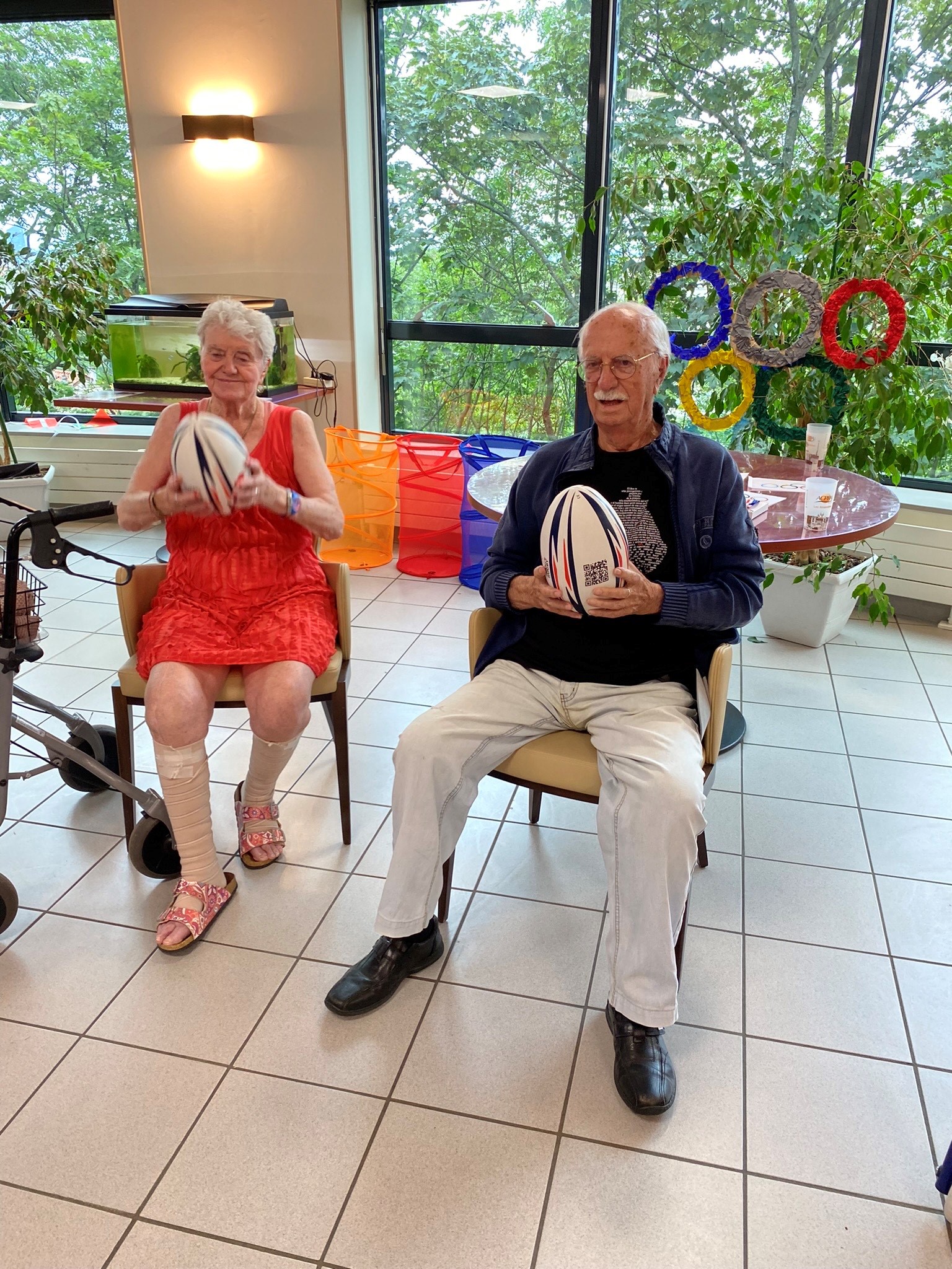 Avec les résidents de la Christinière à Taluyers, les résidents des Amandines se sont prêtés au jeu des olympiades. Au programme le mardi 2 juillet, rugby adapté avec OMNISPORT. Plus que la compétition, c’est la bonne humeur qui a dominé l’après-midi. Une ambiance amusante et conviviale sous les décorations et les supporters. Des médailles ont été données à des résidents qui ont été très heureux de les recevoir. Nous irons à la prochaine rencontre à la Christinière faire de la boxe !