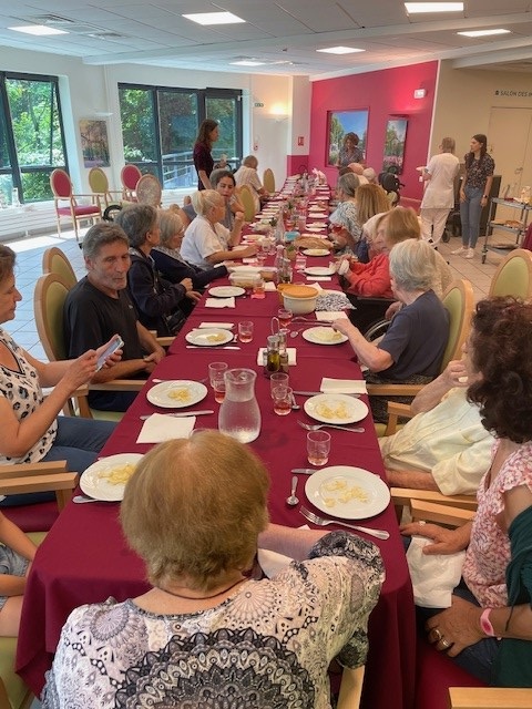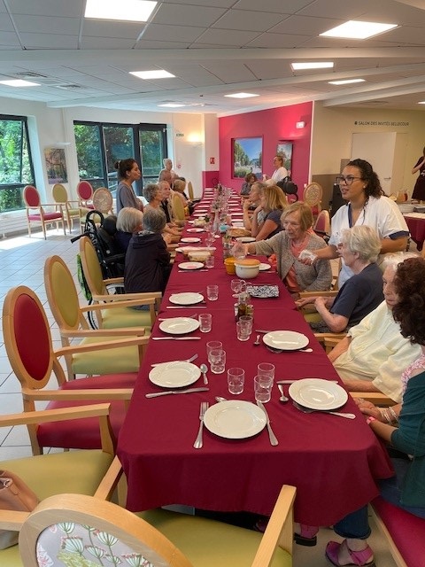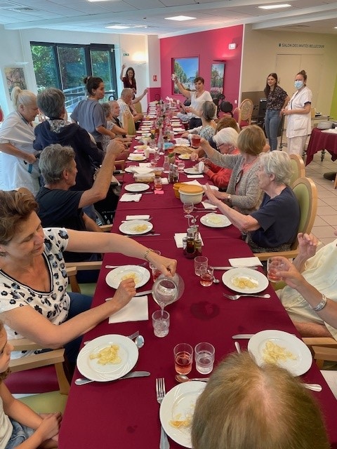 Le vendredi 12 juillet, nous avons organisé un pique-nique inter-aidants. Il s’agit d’un repas partagé avec les familles, les résidents et des salariés de la maison. Nous avons choisi de proposer ce repas à tous les proches qui ont un parent atteint de troubles cognitifs relativement importants avec quelques objectifs : changement du regard soignant/soigné et liens entre les familles concernées par la même problématique. Un moment très apprécié de tous.