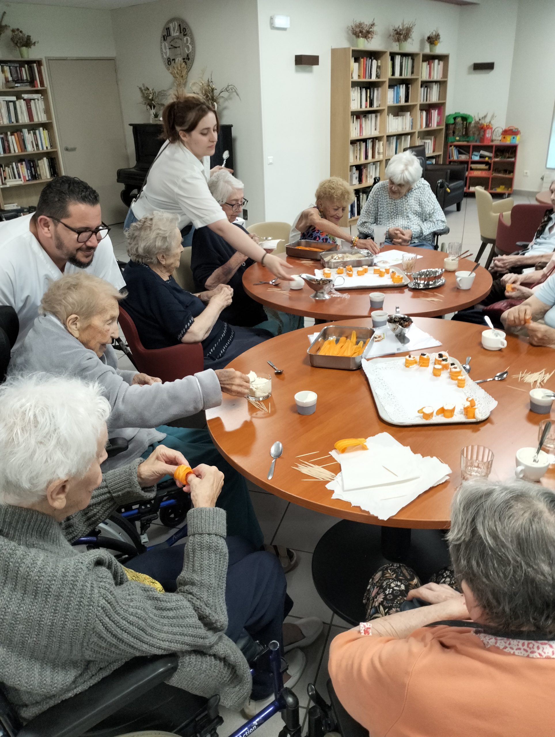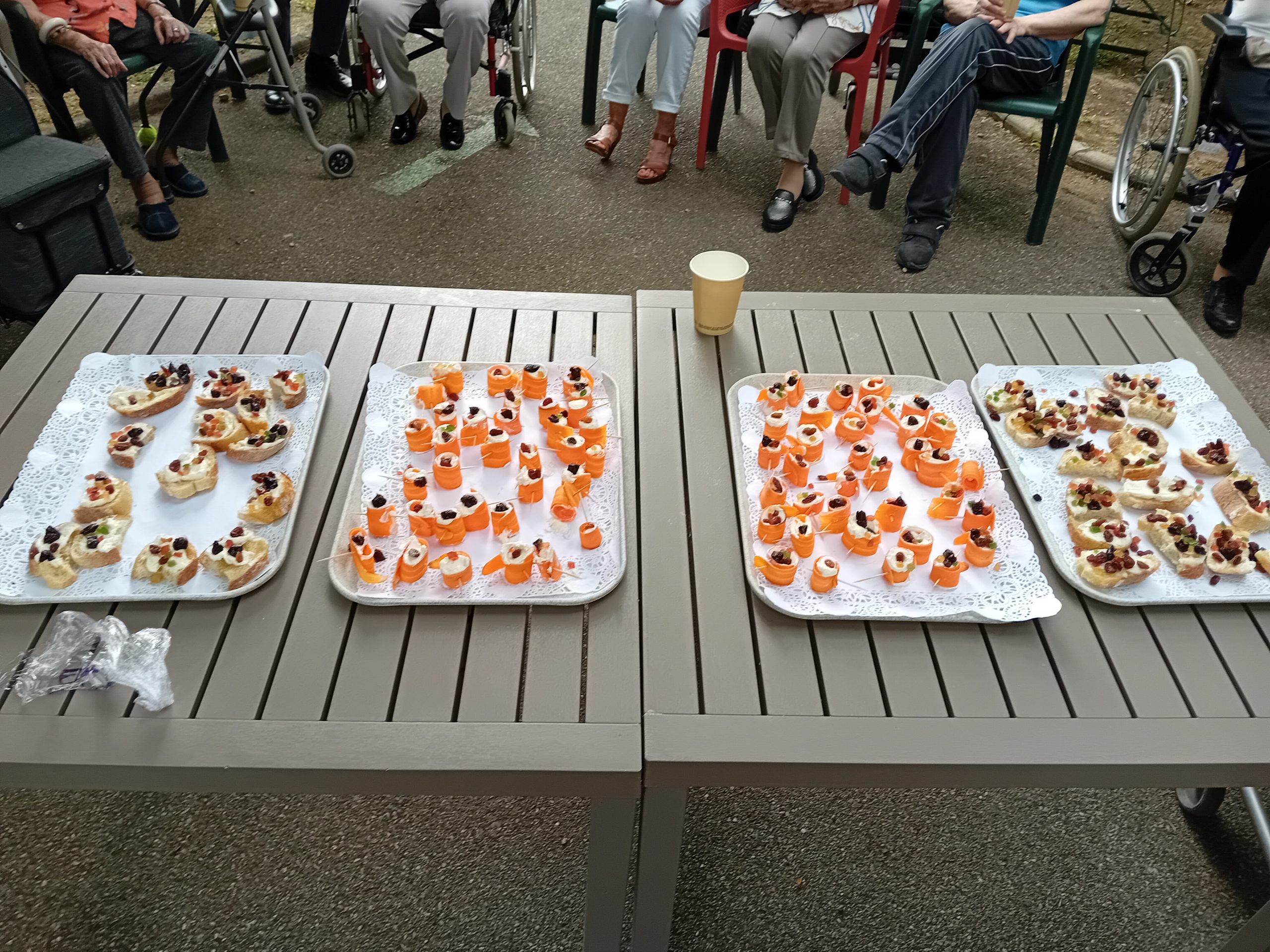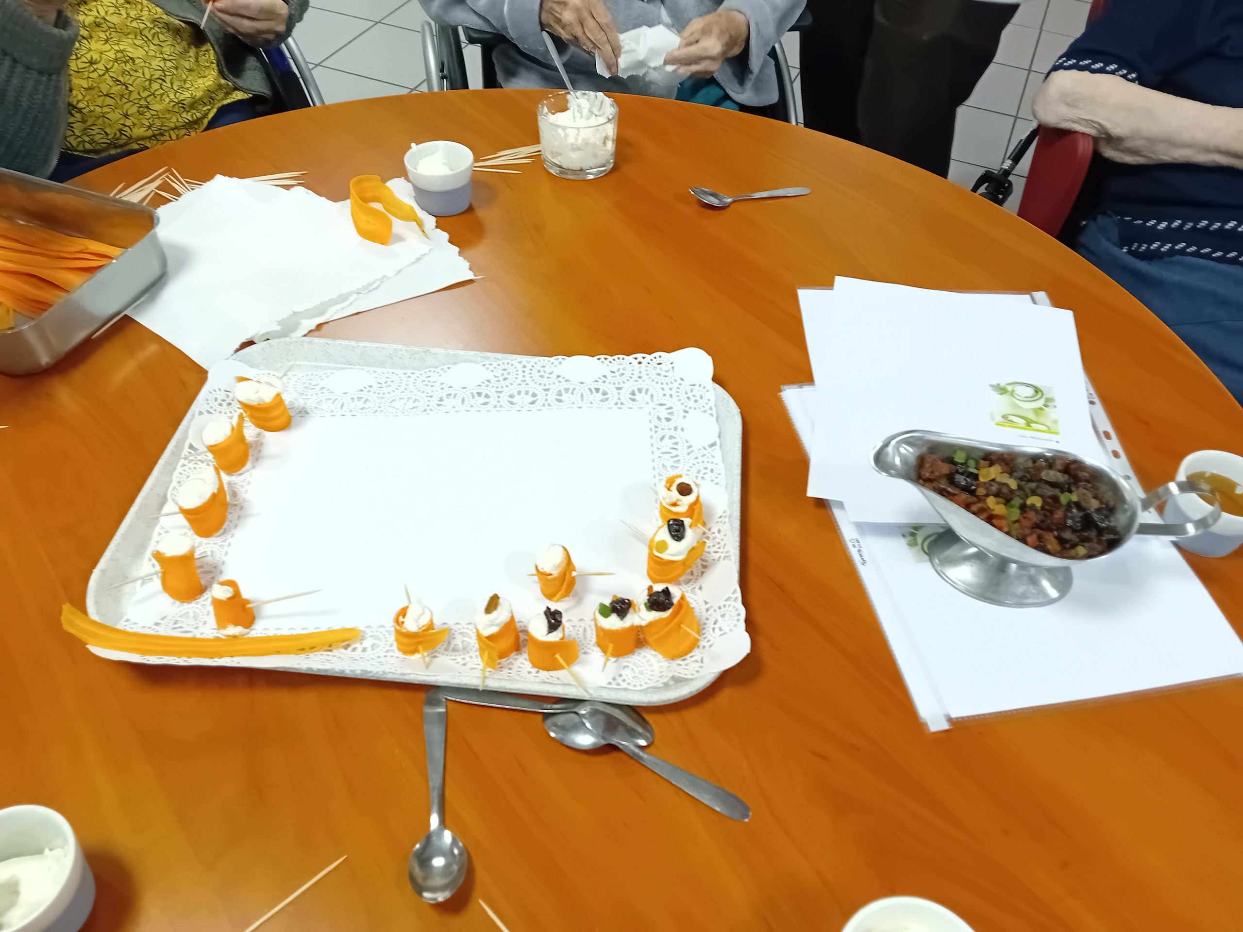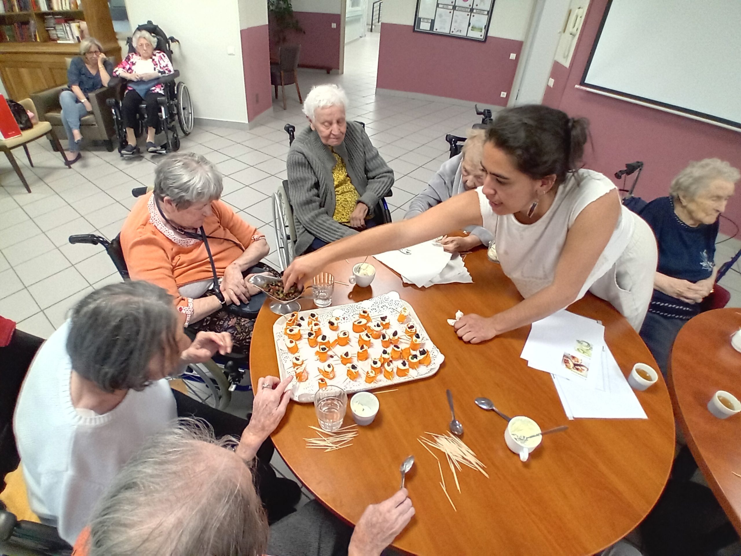 Pour le pot d’accueil des nouveaux résidents, Anissa la responsable hôtelière a préparé un atelier participatif. Les résidents ont donc dressé en atelier cuisine l’apéritif de la fin de journée. Au menu, roulés de carottes aux fromages frais et tartines sucré/salé, miel, fromage et raisins secs, tout cela accompagné bien sûr par un kir cassis.