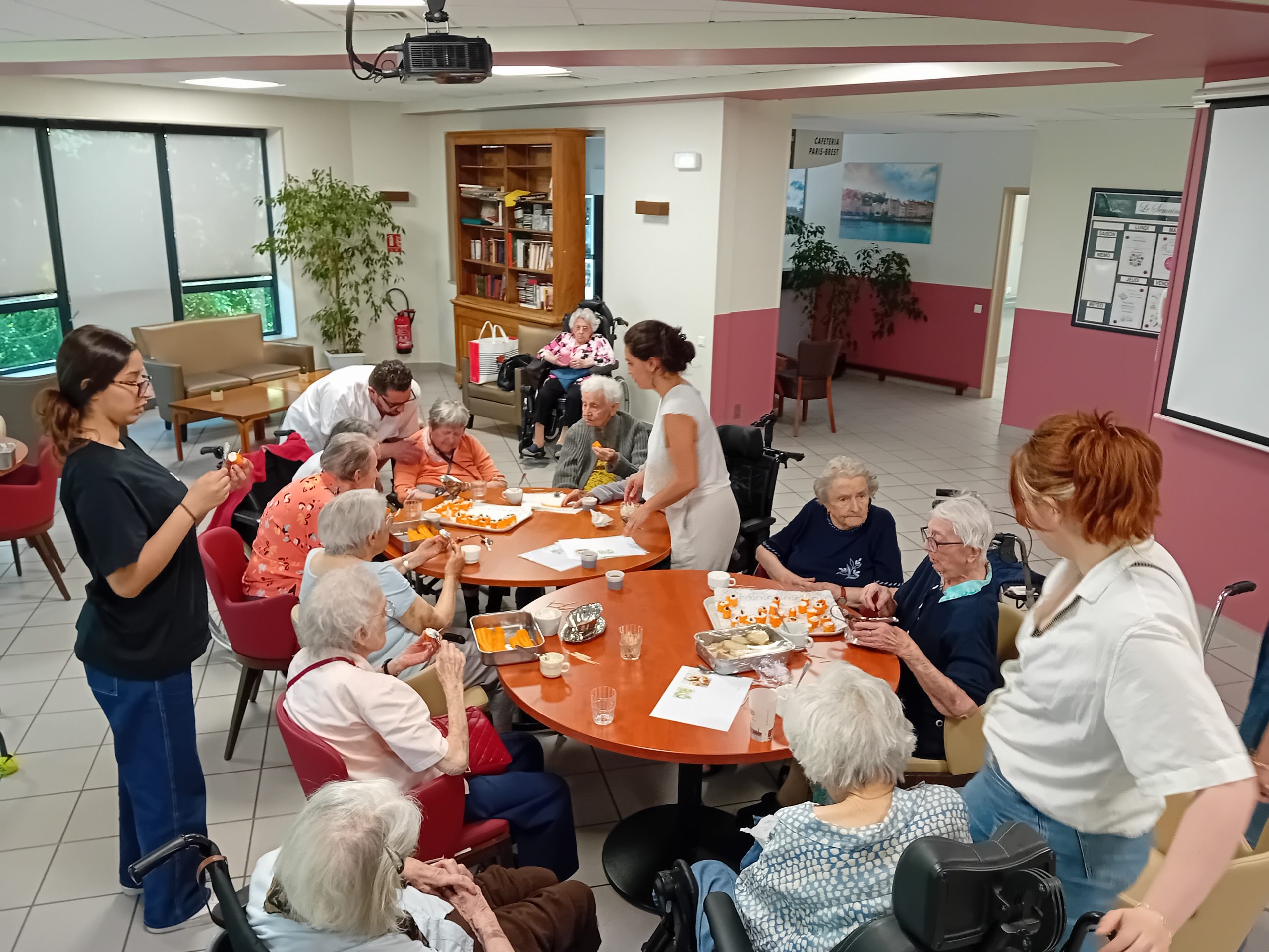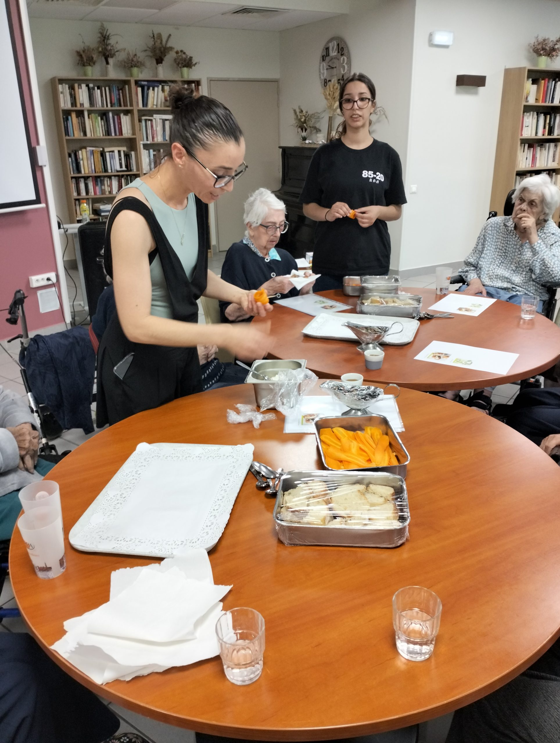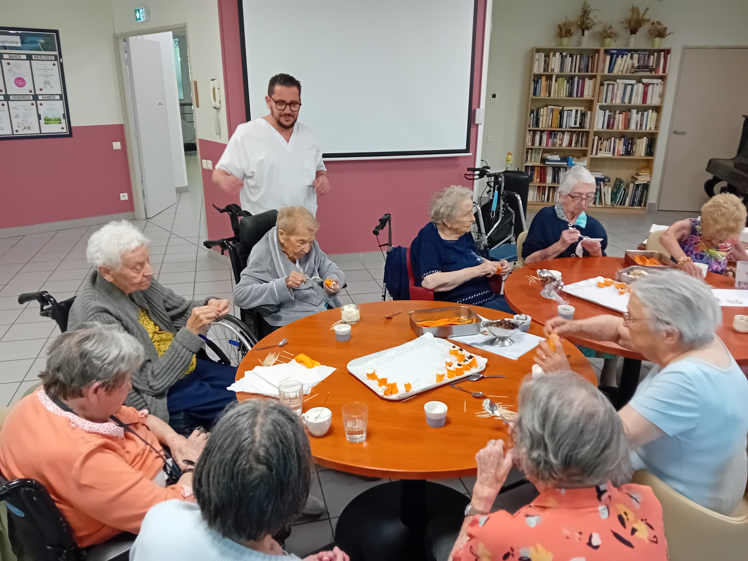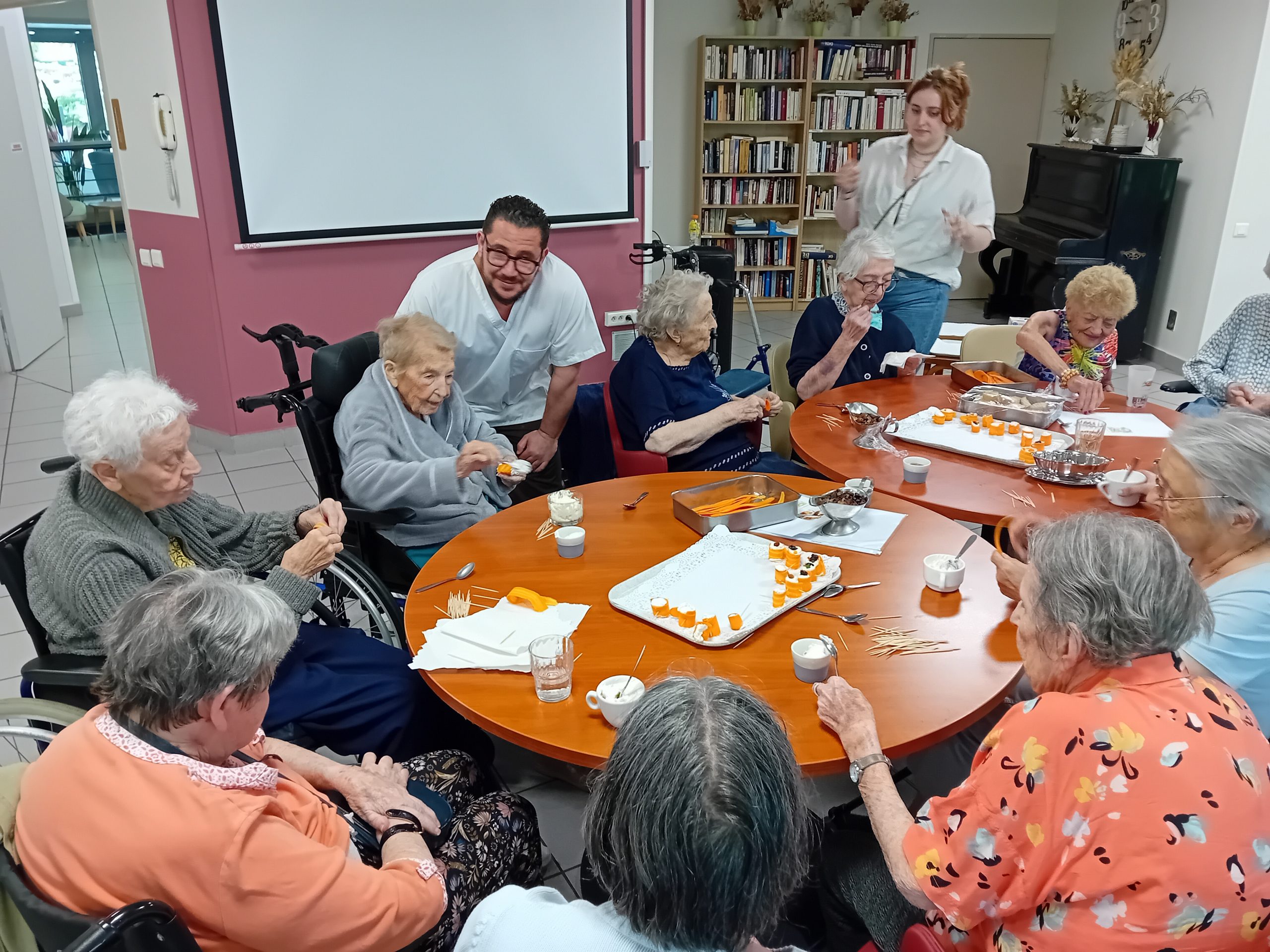 Pour le pot d’accueil des nouveaux résidents, Anissa la responsable hôtelière a préparé un atelier participatif. Les résidents ont donc dressé en atelier cuisine l’apéritif de la fin de journée. Au menu, roulés de carottes aux fromages frais et tartines sucré/salé, miel, fromage et raisins secs, tout cela accompagné bien sûr par un kir cassis.
