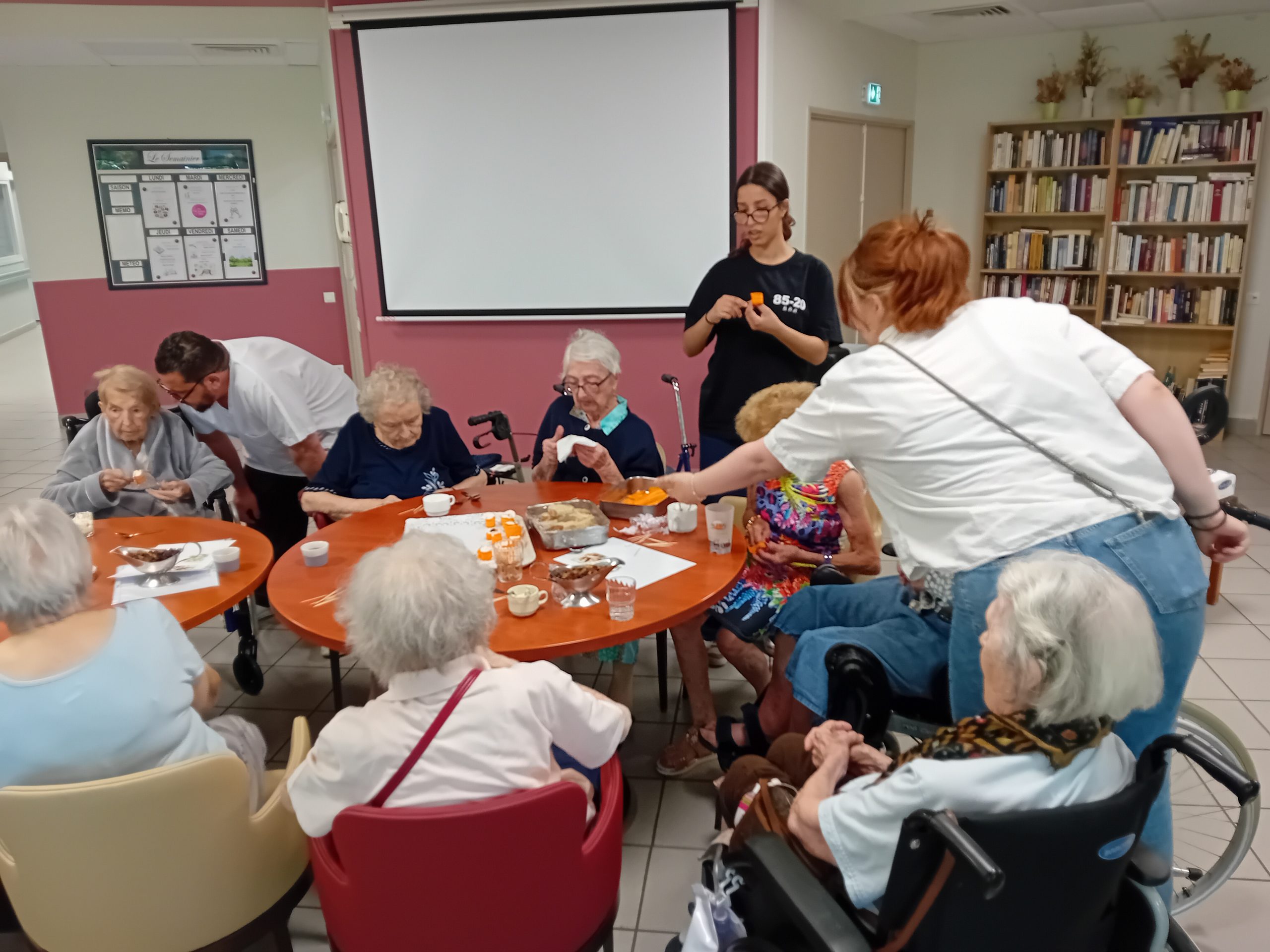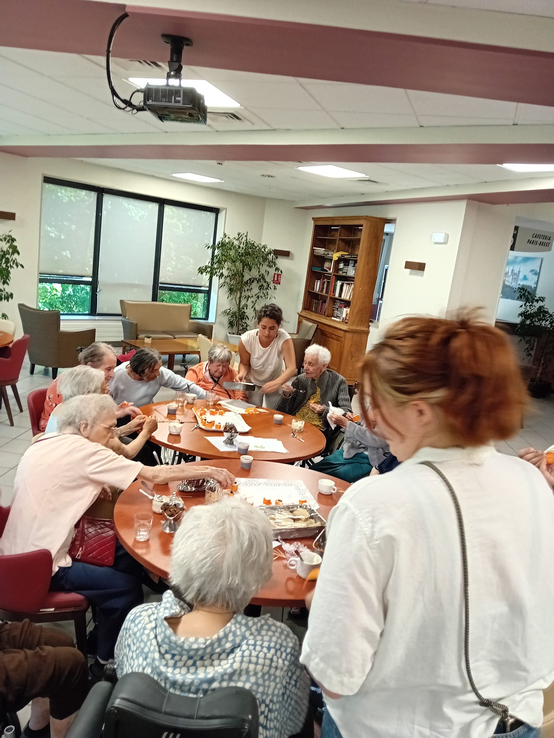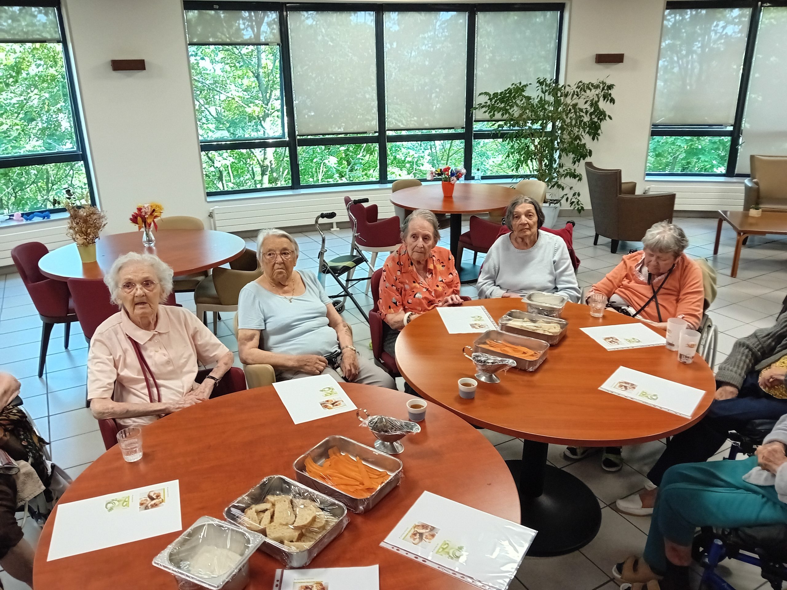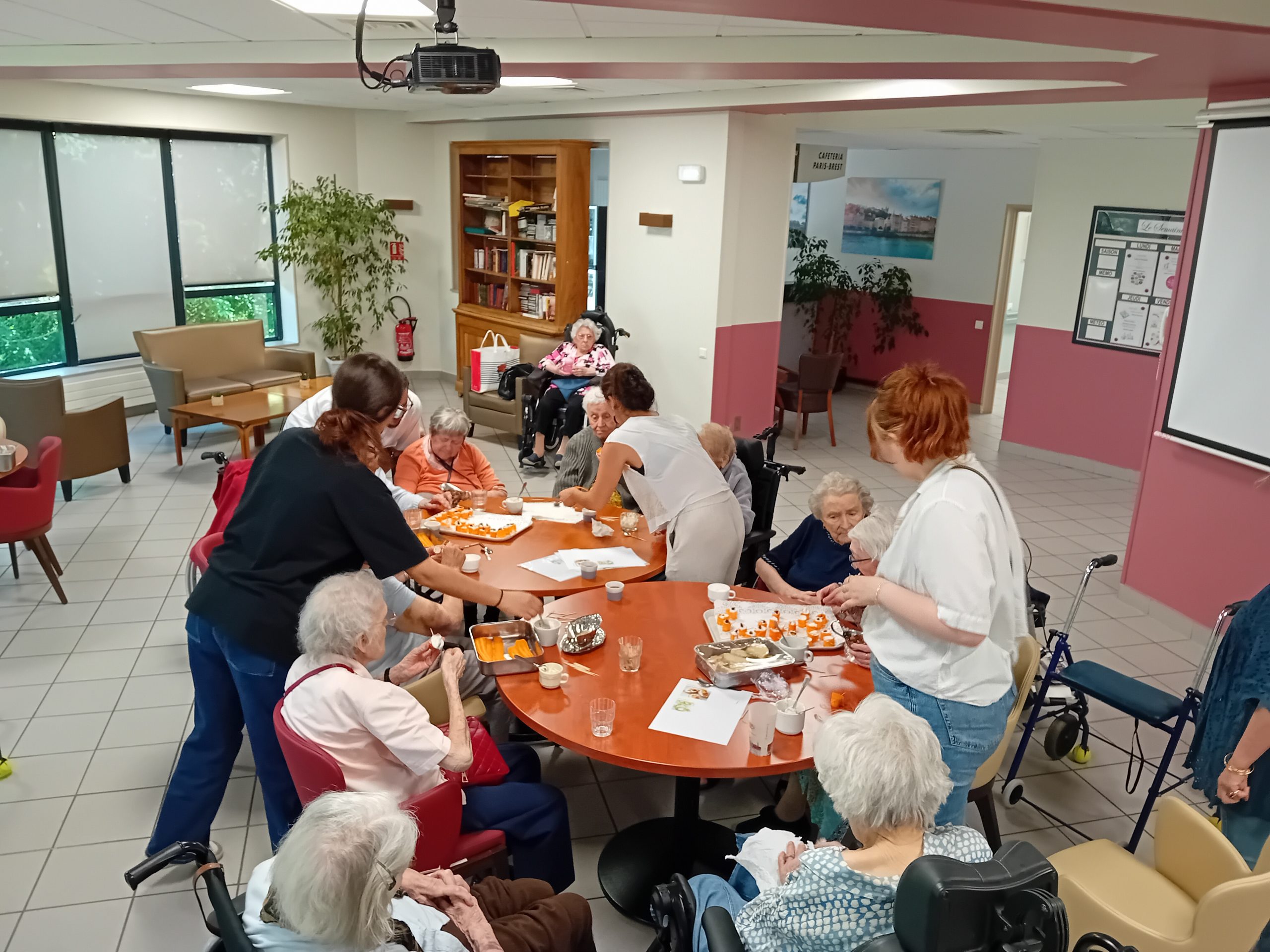 Pour le pot d’accueil des nouveaux résidents, Anissa la responsable hôtelière a préparé un atelier participatif. Les résidents ont donc dressé en atelier cuisine l’apéritif de la fin de journée. Au menu, roulés de carottes aux fromages frais et tartines sucré/salé, miel, fromage et raisins secs, tout cela accompagné bien sûr par un kir cassis.