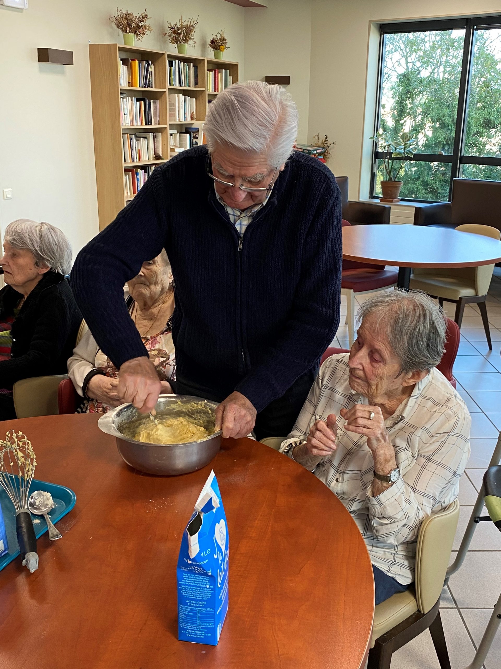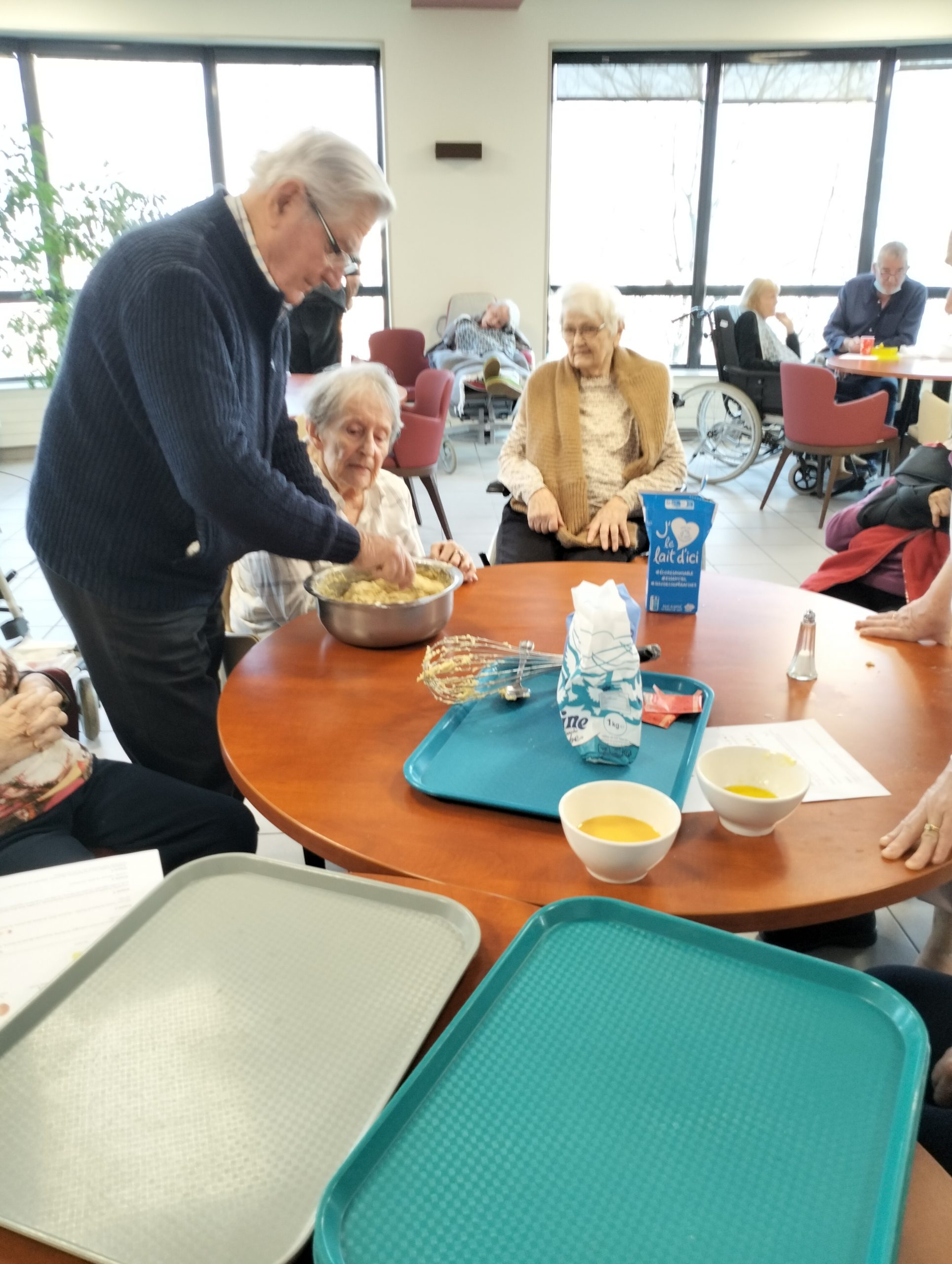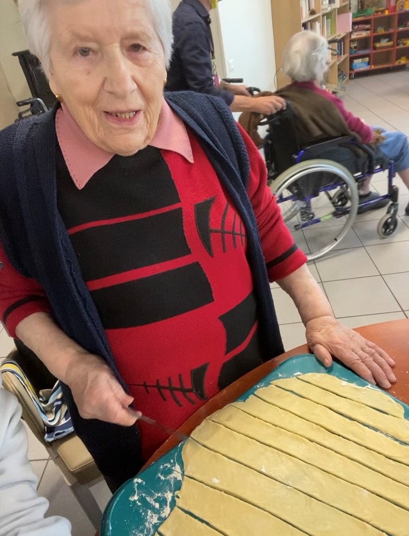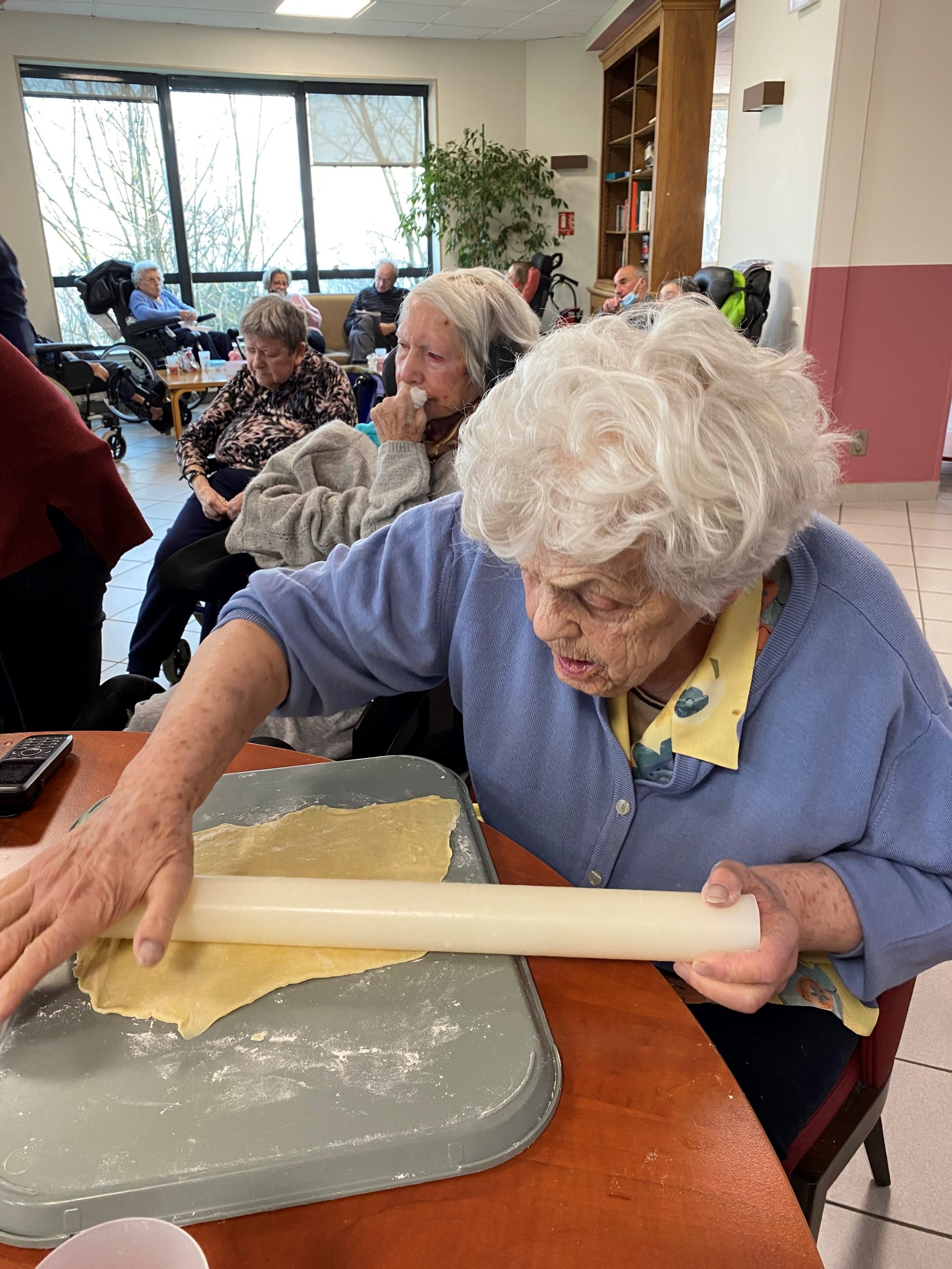 Pour préparer le carnaval, les résidents ont préparé 130 bugnes. Clara a finalisé la cuisson juste avant la venue des enfants aux Amandines. Merci aux résidents qui ont étalé, coupé et mis en forme nos très bonnes bugnes.