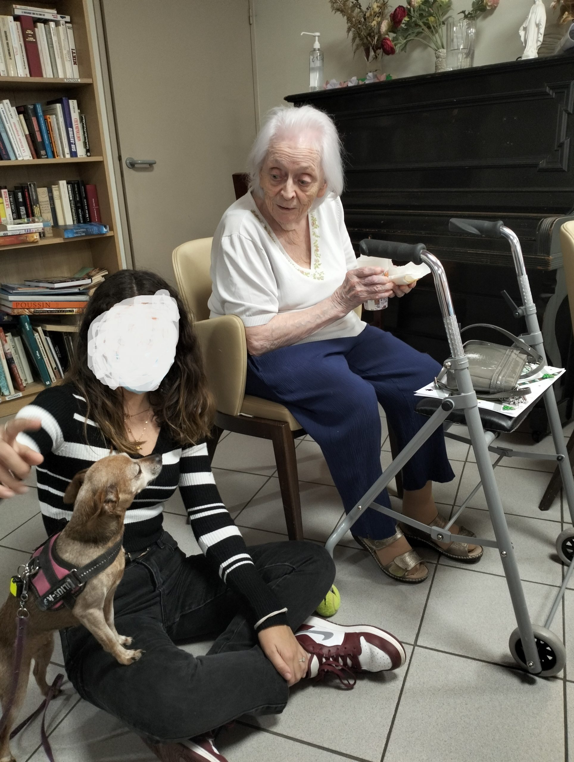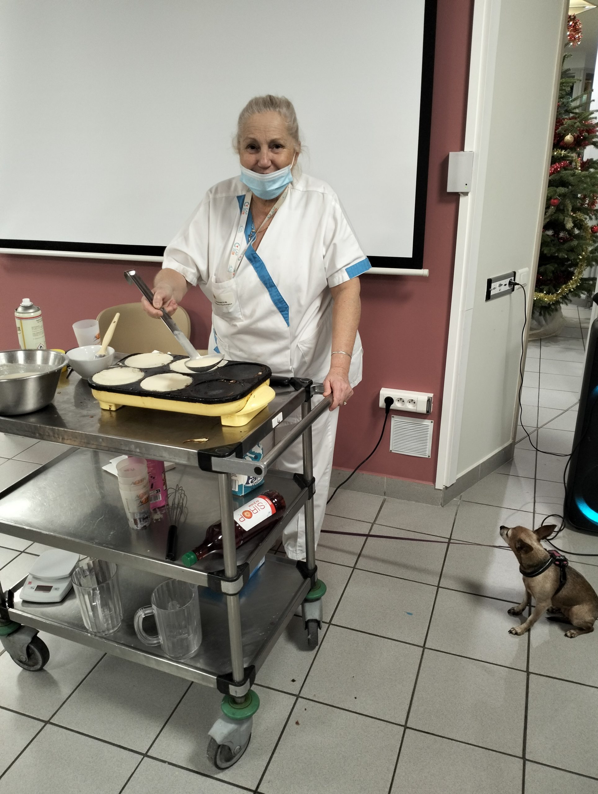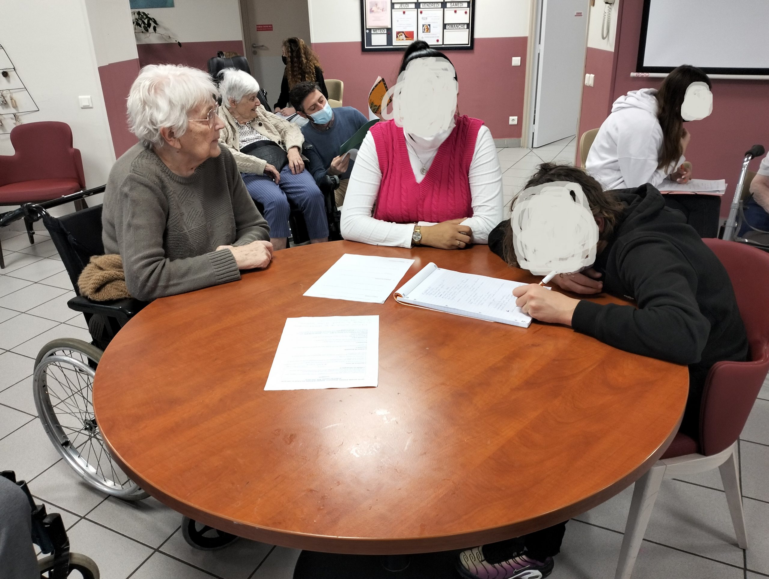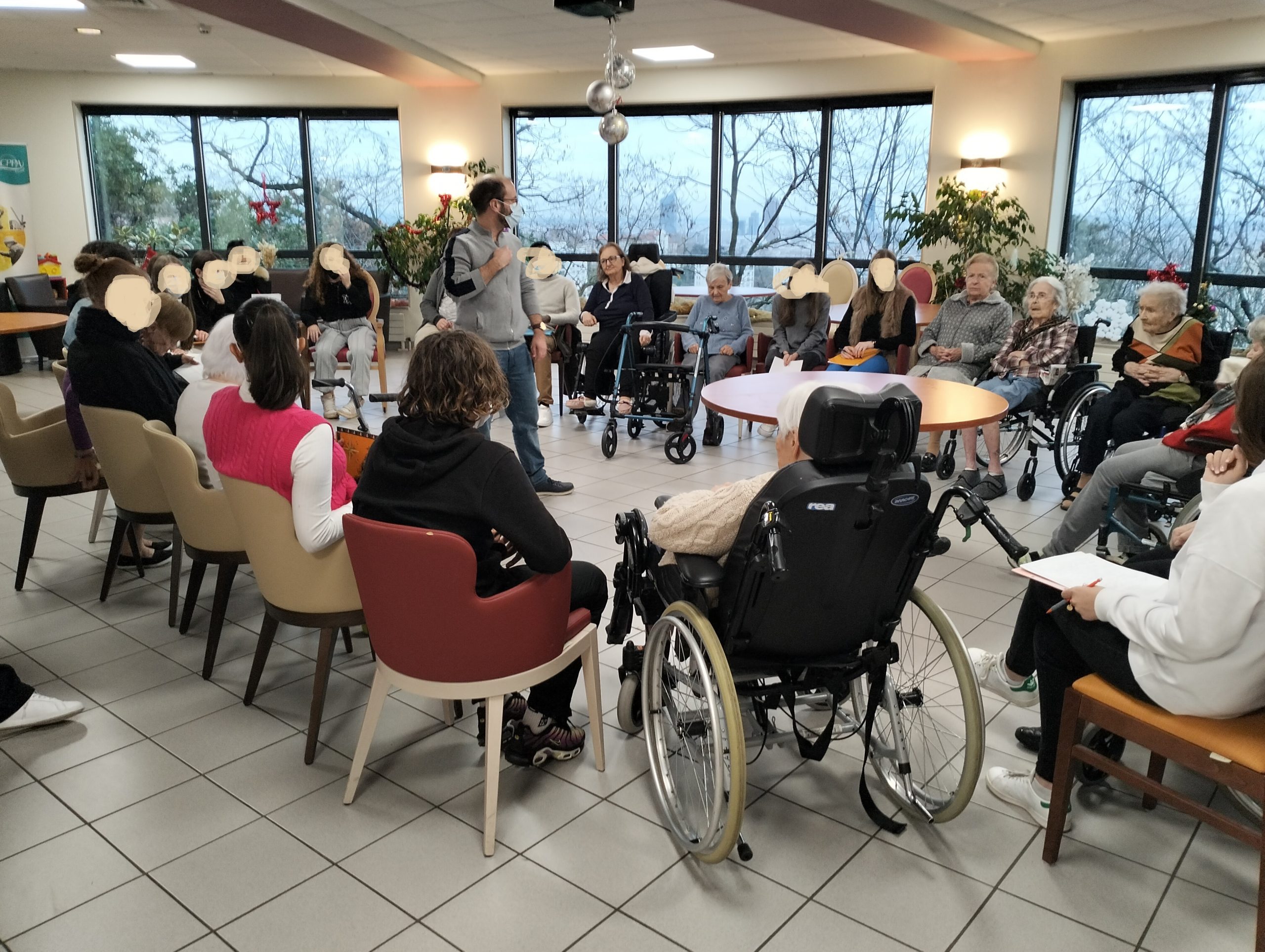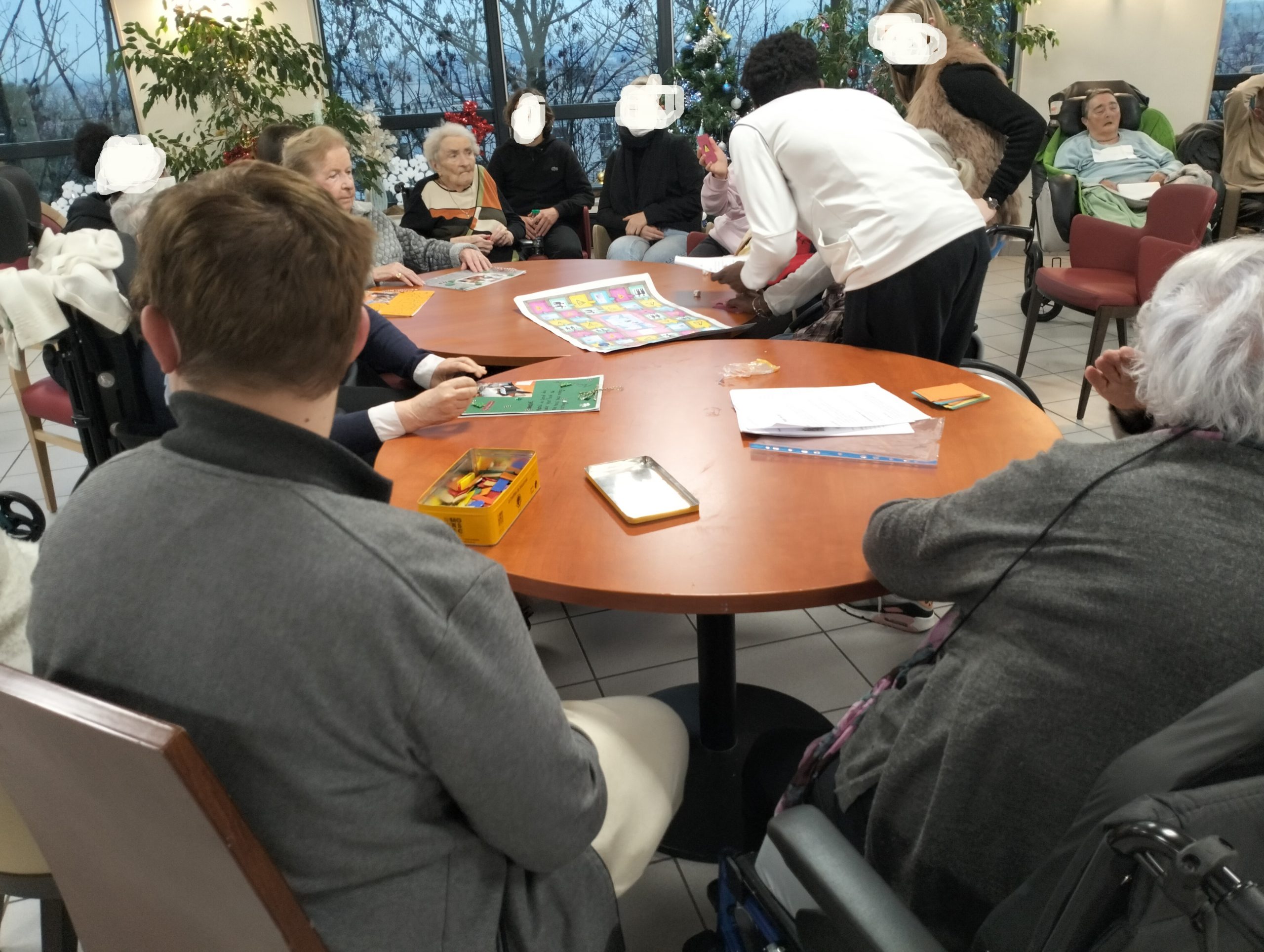 Le jeudi 21 décembre, des lycéens sont venus nous rendre visite pour un temps d’échanges. Au programme, discussions sur les souvenirs des résidents en binômes puis des jeux collectifs préparés par les jeunes : jeux sur la prévention des chutes, jeux de questions de culture générale et blind test musical. Un après-midi bien chargé qui s’est fini en beauté par un goûter avec des crêpes préparées par Elisabeth.